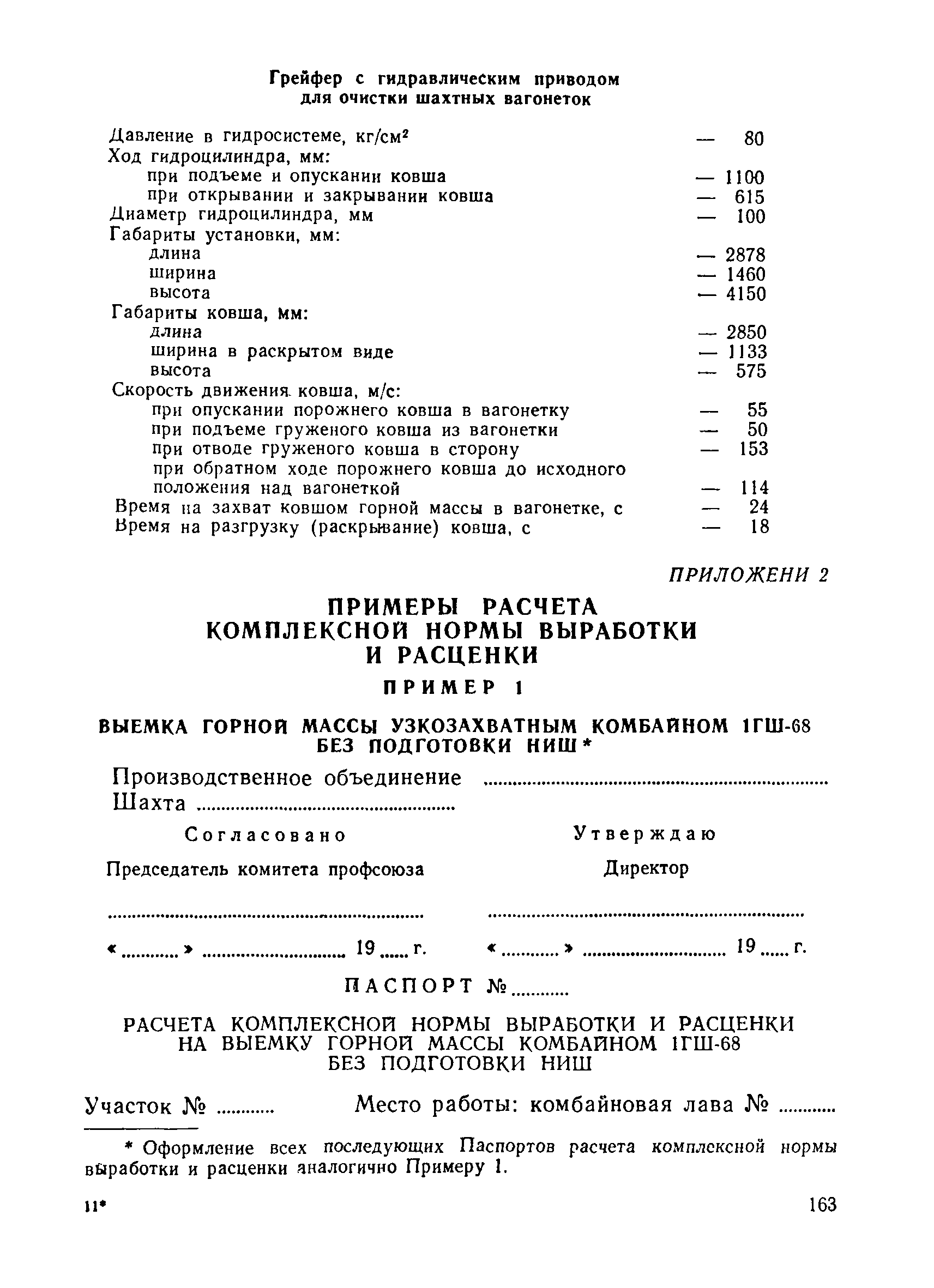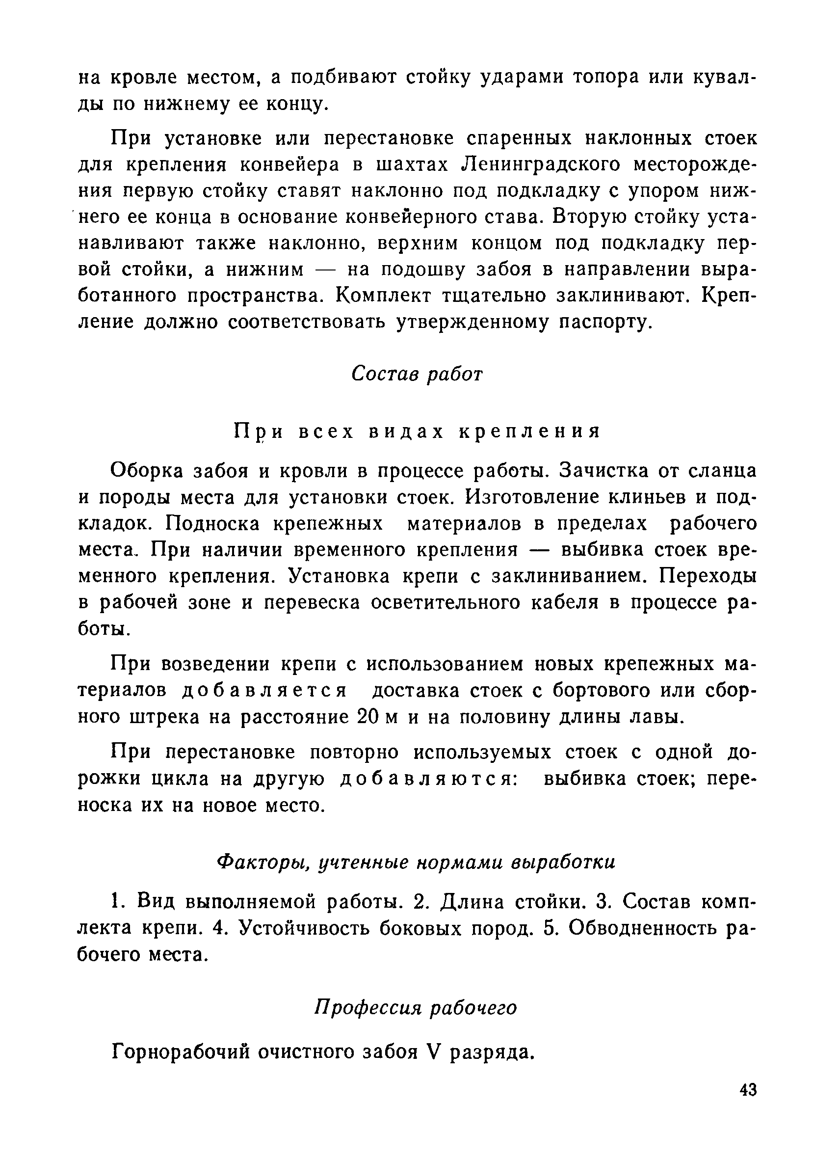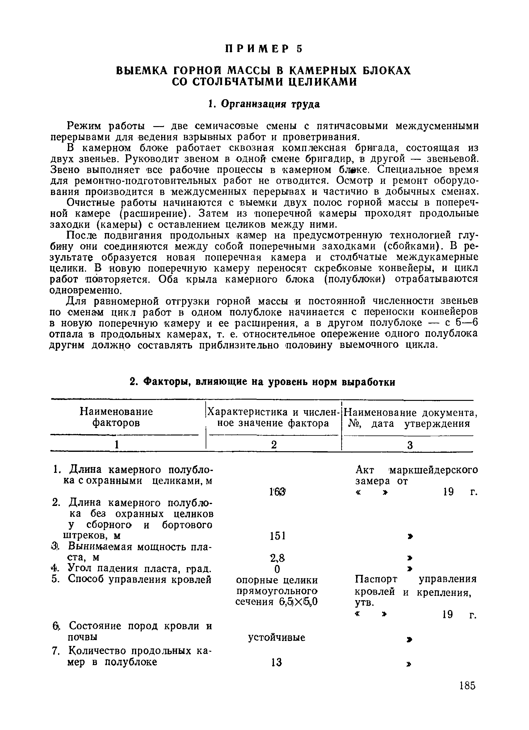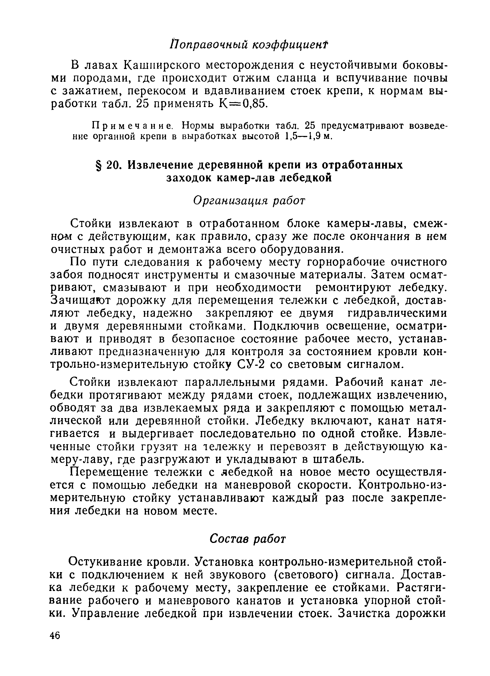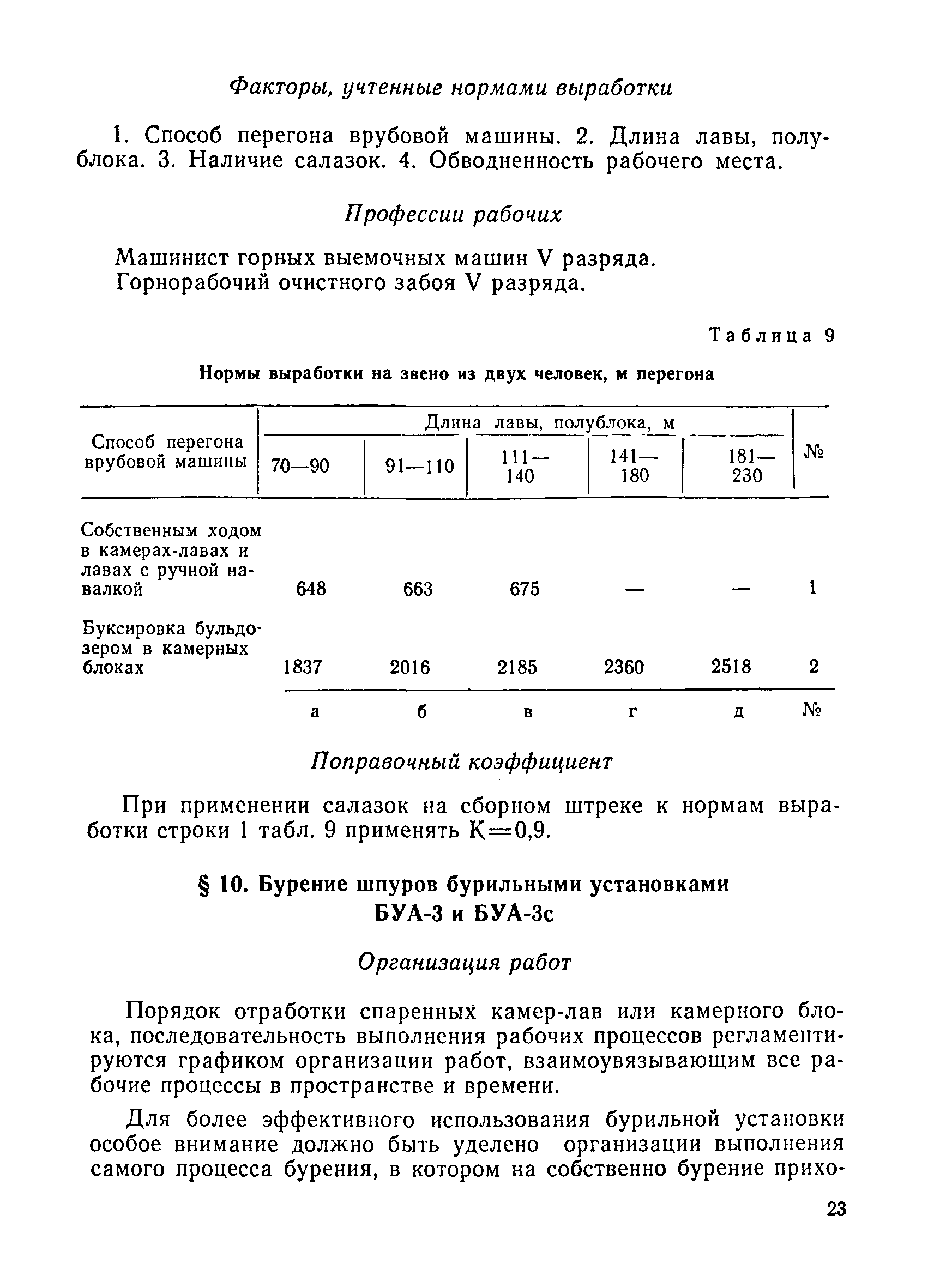 При внедрении нового оборудования, прогрессивной технологии ведения горных работ и более совершенных форм организации труда, не предусмотренных настоящим сборником, нормы должны устанавливаться с учетом технических возможностей оборудования в этих условиях. | | Оглавление: | Общая часть Нормативная часть I Очистные работы Техническая часть Нормативная часть § 1 Выемка горной массы комбайном ГШ-68 и подготовка к выемке следующей полосы § 2 Передвижка гидрофицированной посадочной крепи "Спутник" и забойного скребкового конвейера § 3 Перестановка гидравлических стоек § 4 Осевая передвижка скребкового конвейера-перегружателя на сборном штреке комбайновой лавы § 5 Выемка горной массы комбайнами 1К-101, 2К-101 и подготовка к выемке следующей полосы § 6 Оформление забоя после выемки горной массы комбайнами К-101, 2К-101 § 7 Выемка горной массы из ниш лавы, оборудованной комбайном 1К-101 или 2К-101 § 8 Зарубка сланца врубовой машиной "Урал-33" § 9 Перегон врубовой машины "Урал-33" § 10 Бурение шпуров бурильными установками БУА-3 и БУА-3с § 11 Перегон бурильных установок БУА-3 и БУА-3с § 12 Бурение шпуров ручным электросверлом § 13 Погрузка горной массы погрузочной машиной 1ПНБ-2 § 14 Навалоотбойка сланца в лавах с выкладкой бутовых полос § 15 Перестановка клиновых металлических стоек в лавах § 16 Крепление очистных забоев металлической анкерной крепью § 17 Проверка состояния и повторная затяжка гаек металлической анкерной крепи § 18 Крепление забоя деревянной крепью § 19 Возведение деревянной органной крепи § 20 Извлечение деревянной крепи из отработанных заходок камер-лав лебедкой § 21 Крепление сопряжений лав с примыкающими выработками § 22 Передвижка забойного скребкового конвейера на новую дорожку без разборки конвейерного става § 23 Передвижка забойного скребкового конвейера в новую нарезку с частичной разборкой на секции § 24 Переноска забойного скребкового конвейера из отработанного блока камеры лавы в новую разрезку § 25 Переноска забойного скребкового конвейера СП-63 с полной разборкой в лавах без машинной зарубки § 26 Разработка почвы под приводную головку забойного конвейера § 27 Уборка упавшей с кровли породы (вывалов) вручную II. Горно-подготовительные работы § 28 Проведение подготовительных горных выработок комбайнами ПК-3М, ПК-3Р § 29 Бурение шпуров ручными электросверлами в сланце и породе при буровзрывном способе прохождения выработок § 30 Погрузка горной массы погрузочной машиной 1ПНБ-2 § 31 Погрузка породы погрузочной машиной 1ПНБ-2 при проведении полевых водоотливных штреков (туннелей), кроссингов и при опускании кровли § 32 Ручная погрузка, перекидка и откатка горной массы и породы § 33 Проведение, углубка и очистка водоотливных канавок врубовой машиной "Урал-33" § 34 Уборка породы экскаватором "Беларусь" при проведении водосборников § 35 Уборка породы вручную при проведении водосборников § 36 Крепление горных выработок металлической анкерной крепью § 37 Проверка состояния и повторная затяжка гаек металлической анкерной крепи § 38 Извлечение временной металлической анкерной крепи в подготовительных горных выработках § 39 Крепление горных выработок в период эксплуатации металлическими штангами с заполнением шпура бетонной смесью § 40 Крепление горных выработок металлической трапециевидной крепью вразбежку § 41 Крепление горных выработок деревян