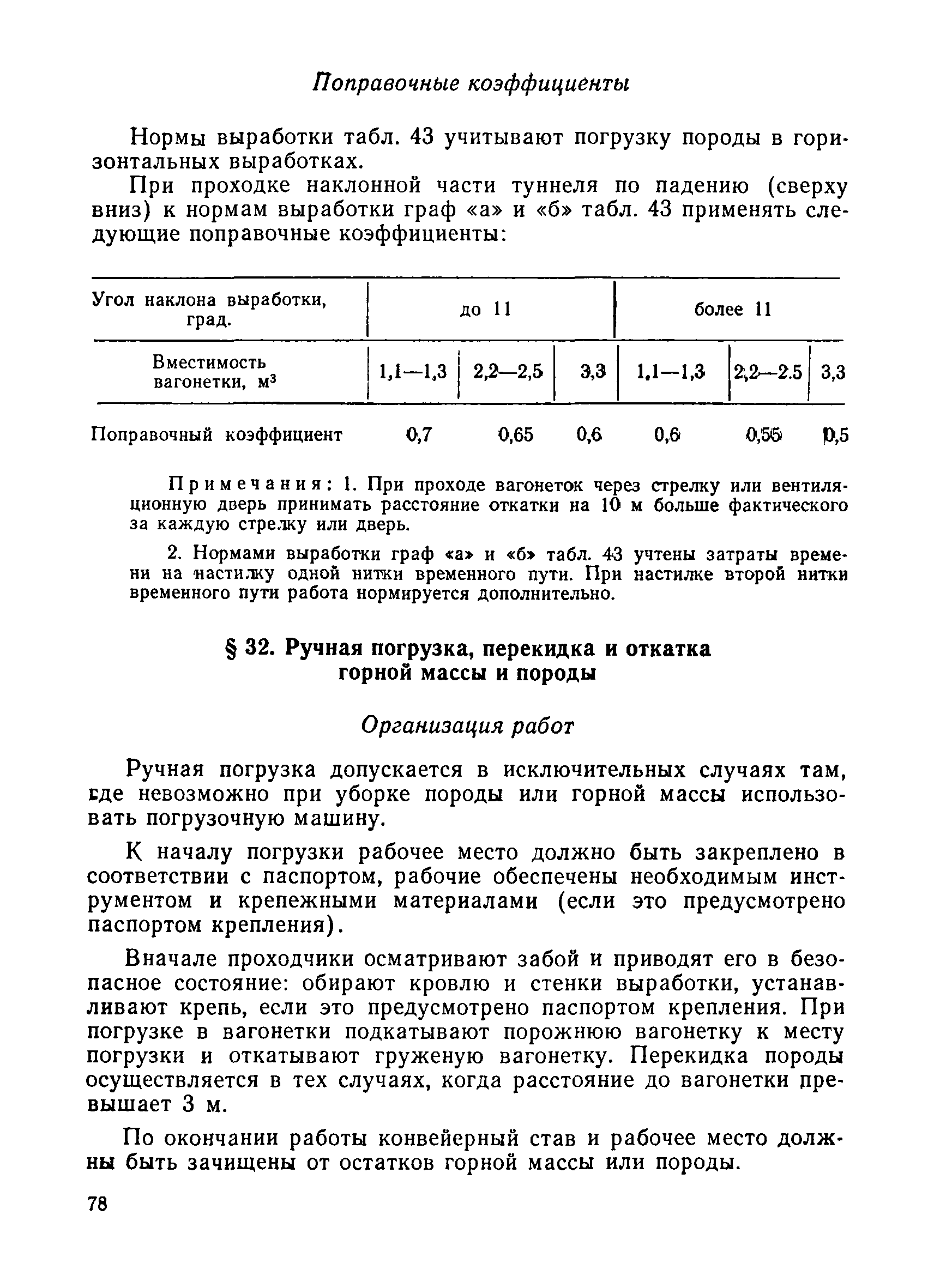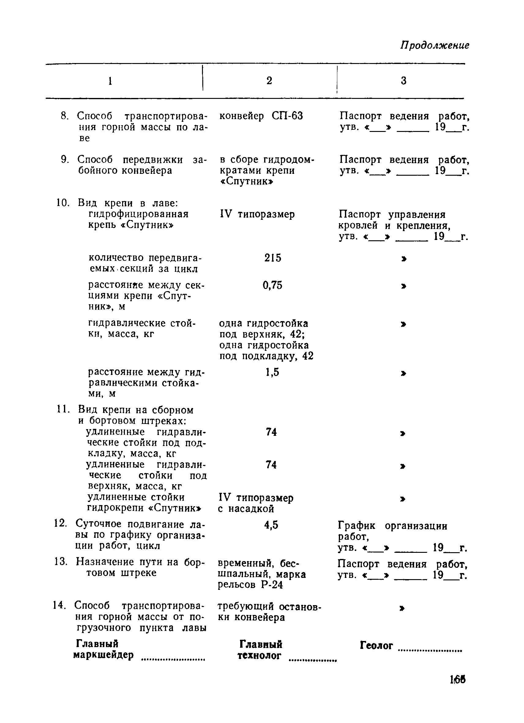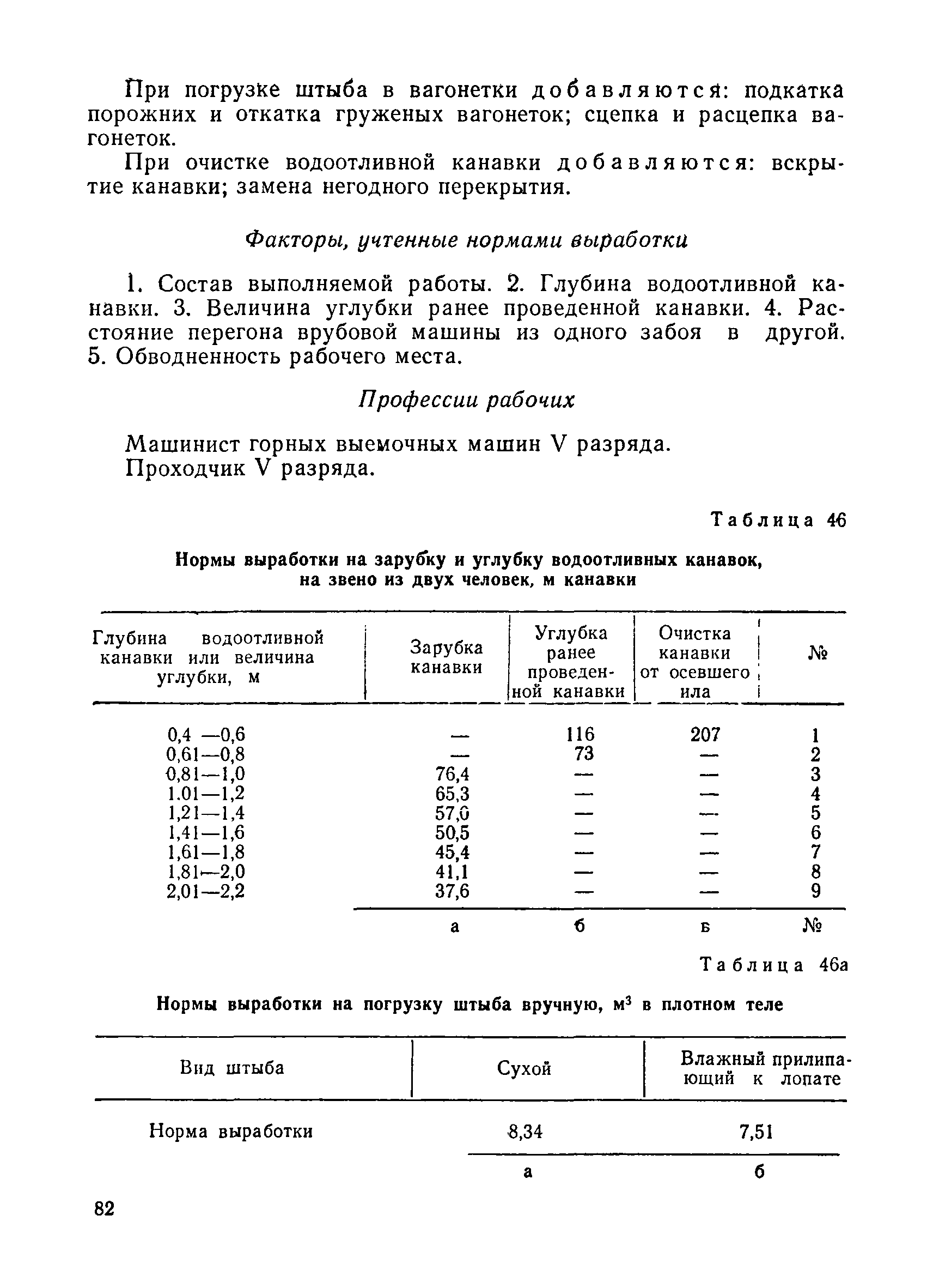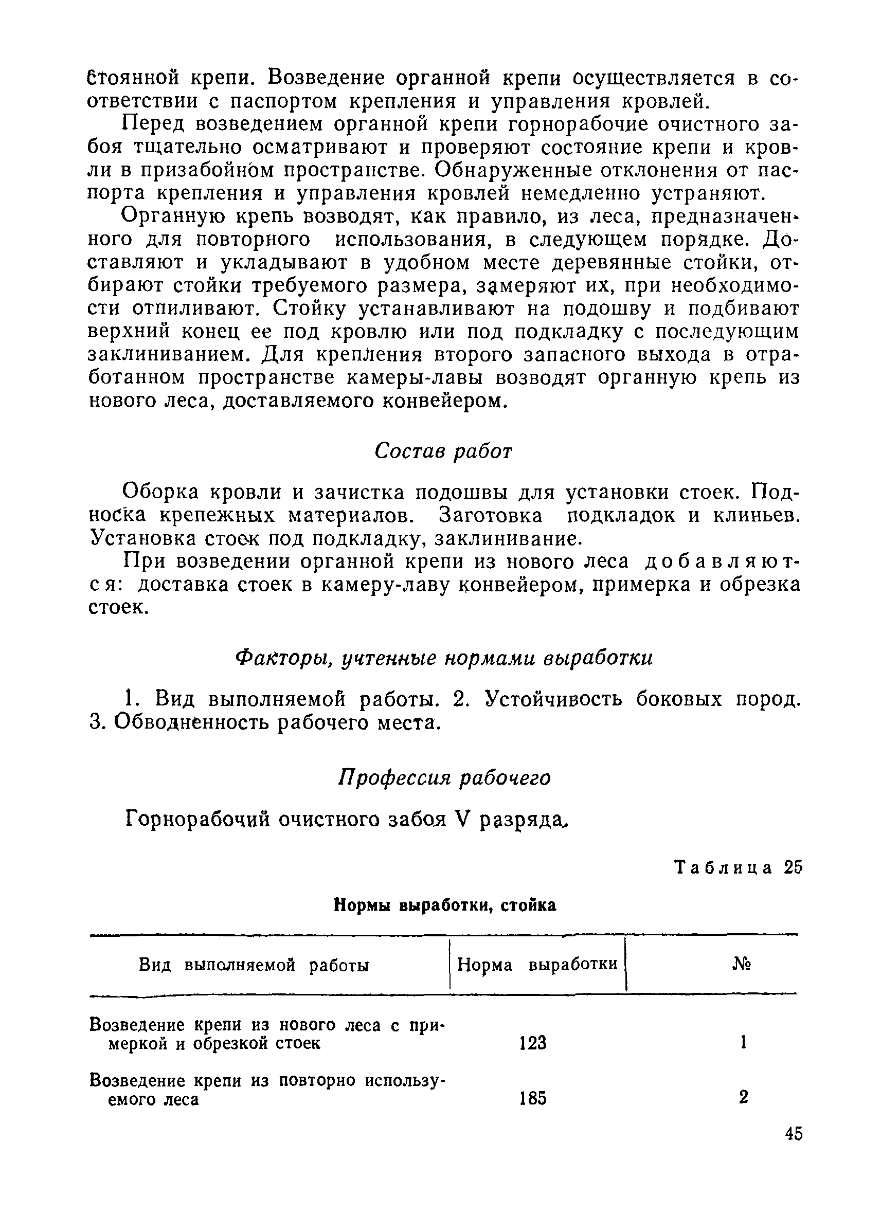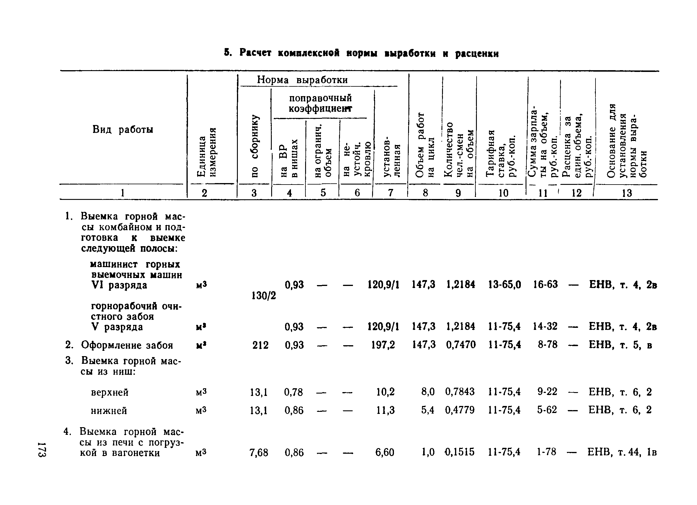 При внедрении нового оборудования, прогрессивной технологии ведения горных работ и более совершенных форм организации труда, не предусмотренных настоящим сборником, нормы должны устанавливаться с учетом технических возможностей оборудования в этих условиях. | | Оглавление: | Общая часть Нормативная часть I Очистные работы Техническая часть Нормативная часть § 1 Выемка горной массы комбайном ГШ-68 и подготовка к выемке следующей полосы § 2 Передвижка гидрофицированной посадочной крепи "Спутник" и забойного скребкового конвейера § 3 Перестановка гидравлических стоек § 4 Осевая передвижка скребкового конвейера-перегружателя на сборном штреке комбайновой лавы § 5 Выемка горной массы комбайнами 1К-101, 2К-101 и подготовка к выемке следующей полосы § 6 Оформление забоя после выемки горной массы комбайнами К-101, 2К-101 § 7 Выемка горной массы из ниш лавы, оборудованной комбайном 1К-101 или 2К-101 § 8 Зарубка сланца врубовой машиной "Урал-33" § 9 Перегон врубовой машины "Урал-33" § 10 Бурение шпуров бурильными установками БУА-3 и БУА-3с § 11 Перегон бурильных установок БУА-3 и БУА-3с § 12 Бурение шпуров ручным электросверлом § 13 Погрузка горной массы погрузочной машиной 1ПНБ-2 § 14 Навалоотбойка сланца в лавах с выкладкой бутовых полос § 15 Перестановка клиновых металлических стоек в лавах § 16 Крепление очистных забоев металлической анкерной крепью § 17 Проверка состояния и повторная затяжка гаек металлической анкерной крепи § 18 Крепление забоя деревянной крепью § 19 Возведение деревянной органной крепи § 20 Извлечение деревянной крепи из отработанных заходок камер-лав лебедкой § 21 Крепление сопряжений лав с примыкающими выработками § 22 Передвижка забойного скребкового конвейера на новую дорожку без разборки конвейерного става § 23 Передвижка забойного скребкового конвейера в новую нарезку с частичной разборкой на секции § 24 Переноска забойного скребкового конвейера из отработанного блока камеры лавы в новую разрезку § 25 Переноска забойного скребкового конвейера СП-63 с полной разборкой в лавах без машинной зарубки § 26 Разработка почвы под приводную головку забойного конвейера § 27 Уборка упавшей с кровли породы (вывалов) вручную II. Горно-подготовительные работы § 28 Проведение подготовительных горных выработок комбайнами ПК-3М, ПК-3Р § 29 Бурение шпуров ручными электросверлами в сланце и породе при буровзрывном способе прохождения выработок § 30 Погрузка горной массы погрузочной машиной 1ПНБ-2 § 31 Погрузка породы погрузочной машиной 1ПНБ-2 при проведении полевых водоотливных штреков (туннелей), кроссингов и при опускании кровли § 32 Ручная погрузка, перекидка и откатка горной массы и породы § 33 Проведение, углубка и очистка водоотливных канавок врубовой машиной "Урал-33" § 34 Уборка породы экскаватором "Беларусь" при проведении водосборников § 35 Уборка породы вручную при проведении водосборников § 36 Крепление горных выработок металлической анкерной крепью § 37 Проверка состояния и повторная затяжка гаек металлической анкерной крепи § 38 Извлечение временной металлической анкерной крепи в подготовительных горных выработках § 39 Крепление горных выработок в период эксплуатации металлическими штангами с заполнением шпура бетонной смесью § 40 Крепление горных выработок металлической трапециевидной крепью вразбежку § 41 Крепление горных выработок деревян