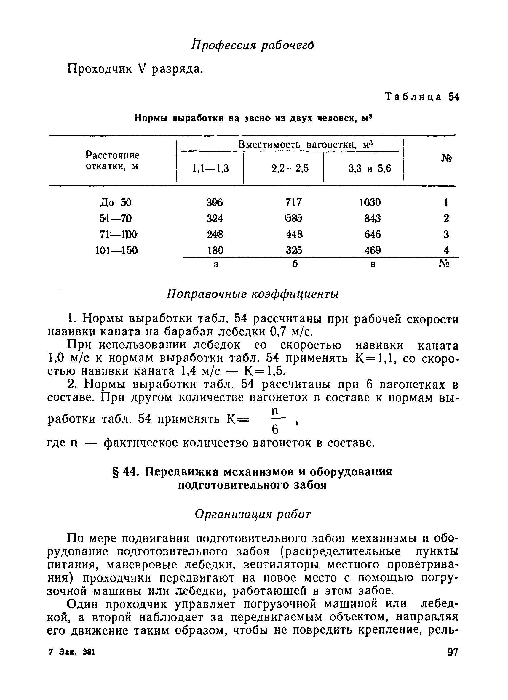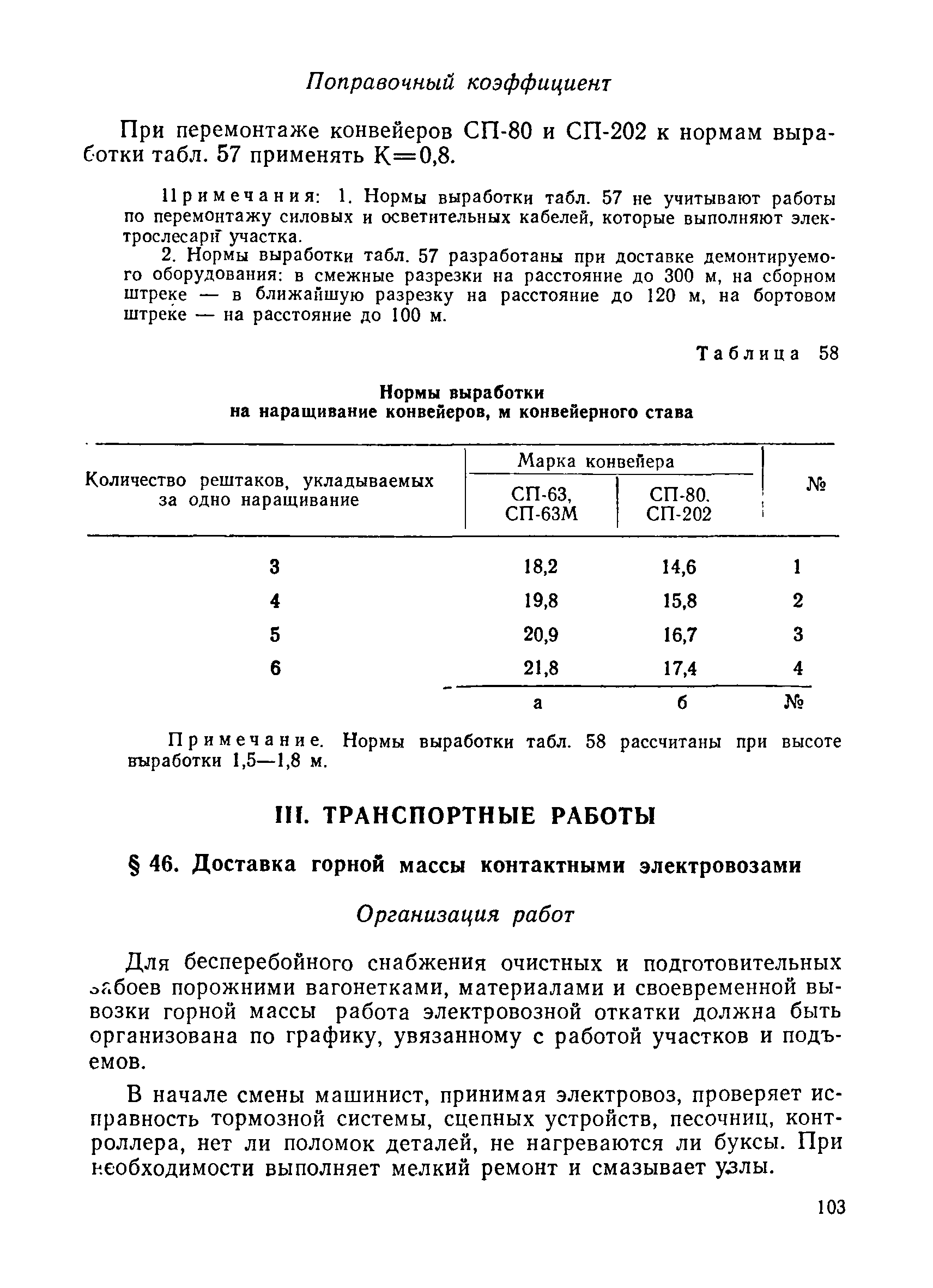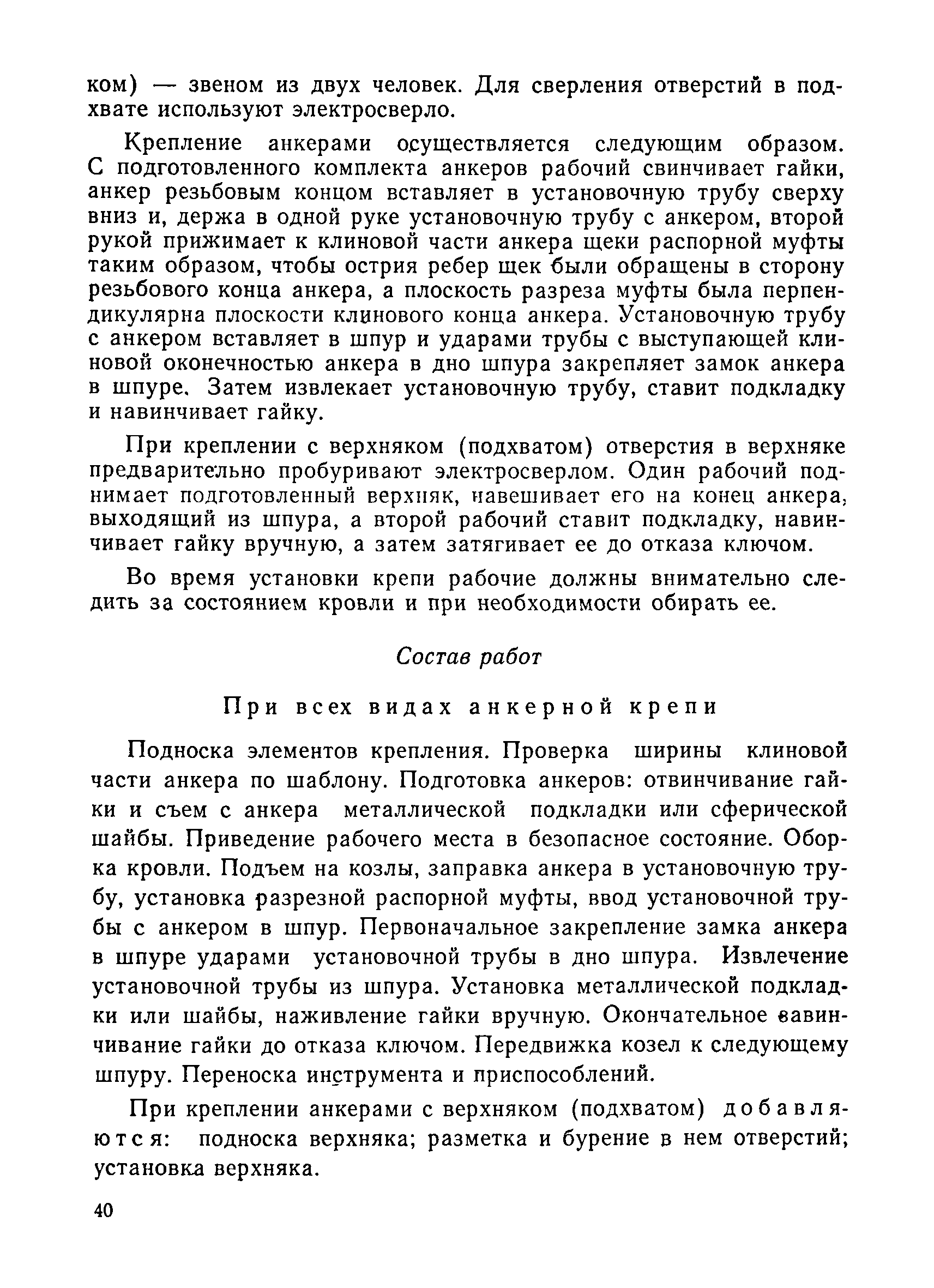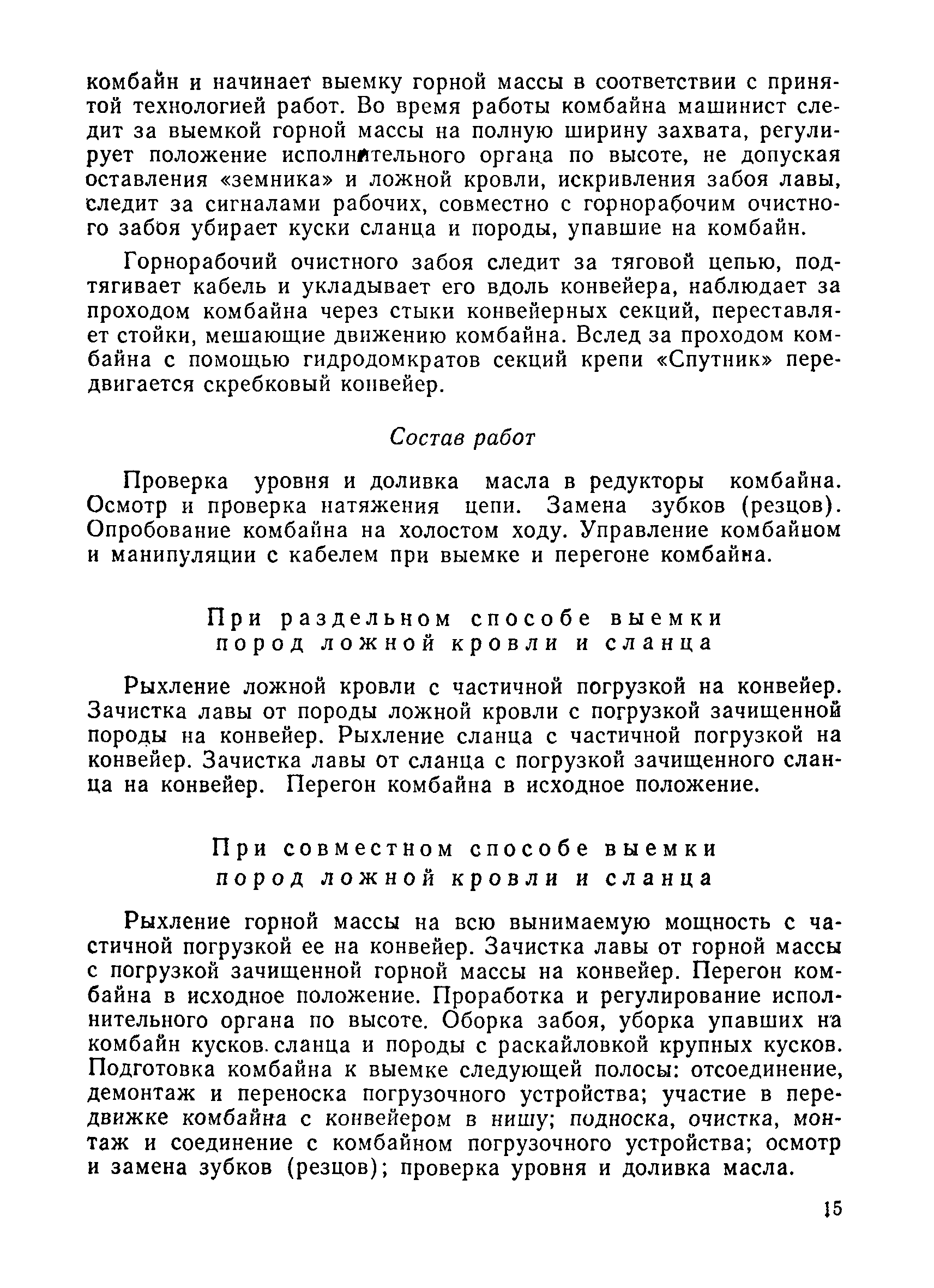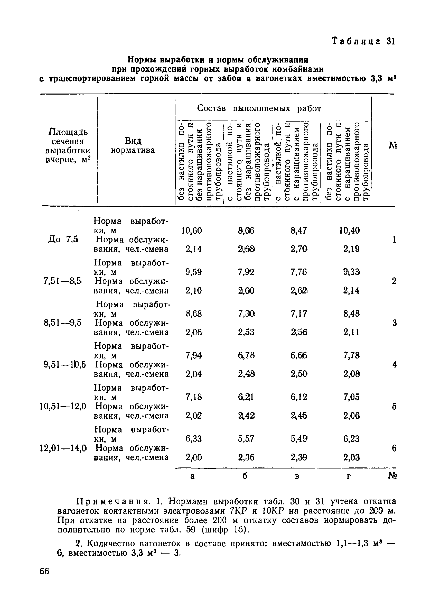При внедрении нового оборудования, прогрессивной технологии ведения горных работ и более совершенных форм организации труда, не предусмотренных настоящим сборником, нормы должны устанавливаться с учетом технических возможностей оборудования в этих условиях. | | Оглавление: | Общая часть Нормативная часть I Очистные работы Техническая часть Нормативная часть § 1 Выемка горной массы комбайном ГШ-68 и подготовка к выемке следующей полосы § 2 Передвижка гидрофицированной посадочной крепи "Спутник" и забойного скребкового конвейера § 3 Перестановка гидравлических стоек § 4 Осевая передвижка скребкового конвейера-перегружателя на сборном штреке комбайновой лавы § 5 Выемка горной массы комбайнами 1К-101, 2К-101 и подготовка к выемке следующей полосы § 6 Оформление забоя после выемки горной массы комбайнами К-101, 2К-101 § 7 Выемка горной массы из ниш лавы, оборудованной комбайном 1К-101 или 2К-101 § 8 Зарубка сланца врубовой машиной "Урал-33" § 9 Перегон врубовой машины "Урал-33" § 10 Бурение шпуров бурильными установками БУА-3 и БУА-3с § 11 Перегон бурильных установок БУА-3 и БУА-3с § 12 Бурение шпуров ручным электросверлом § 13 Погрузка горной массы погрузочной машиной 1ПНБ-2 § 14 Навалоотбойка сланца в лавах с выкладкой бутовых полос § 15 Перестановка клиновых металлических стоек в лавах § 16 Крепление очистных забоев металлической анкерной крепью § 17 Проверка состояния и повторная затяжка гаек металлической анкерной крепи § 18 Крепление забоя деревянной крепью § 19 Возведение деревянной органной крепи § 20 Извлечение деревянной крепи из отработанных заходок камер-лав лебедкой § 21 Крепление сопряжений лав с примыкающими выработками § 22 Передвижка забойного скребкового конвейера на новую дорожку без разборки конвейерного става § 23 Передвижка забойного скребкового конвейера в новую нарезку с частичной разборкой на секции § 24 Переноска забойного скребкового конвейера из отработанного блока камеры лавы в новую разрезку § 25 Переноска забойного скребкового конвейера СП-63 с полной разборкой в лавах без машинной зарубки § 26 Разработка почвы под приводную головку забойного конвейера § 27 Уборка упавшей с кровли породы (вывалов) вручную II. Горно-подготовительные работы § 28 Проведение подготовительных горных выработок комбайнами ПК-3М, ПК-3Р § 29 Бурение шпуров ручными электросверлами в сланце и породе при буровзрывном способе прохождения выработок § 30 Погрузка горной массы погрузочной машиной 1ПНБ-2 § 31 Погрузка породы погрузочной машиной 1ПНБ-2 при проведении полевых водоотливных штреков (туннелей), кроссингов и при опускании кровли § 32 Ручная погрузка, перекидка и откатка горной массы и породы § 33 Проведение, углубка и очистка водоотливных канавок врубовой машиной "Урал-33" § 34 Уборка породы экскаватором "Беларусь" при проведении водосборников § 35 Уборка породы вручную при проведении водосборников § 36 Крепление горных выработок металлической анкерной крепью § 37 Проверка состояния и повторная затяжка гаек металлической анкерной крепи § 38 Извлечение временной металлической анкерной крепи в подготовительных горных выработках § 39 Крепление горных выработок в период эксплуатации металлическими штангами с заполнением шпура бетонной смесью § 40 Крепление горных выработок металлической трапециевидной крепью вразбежку § 41 Крепление горных выработок деревян
