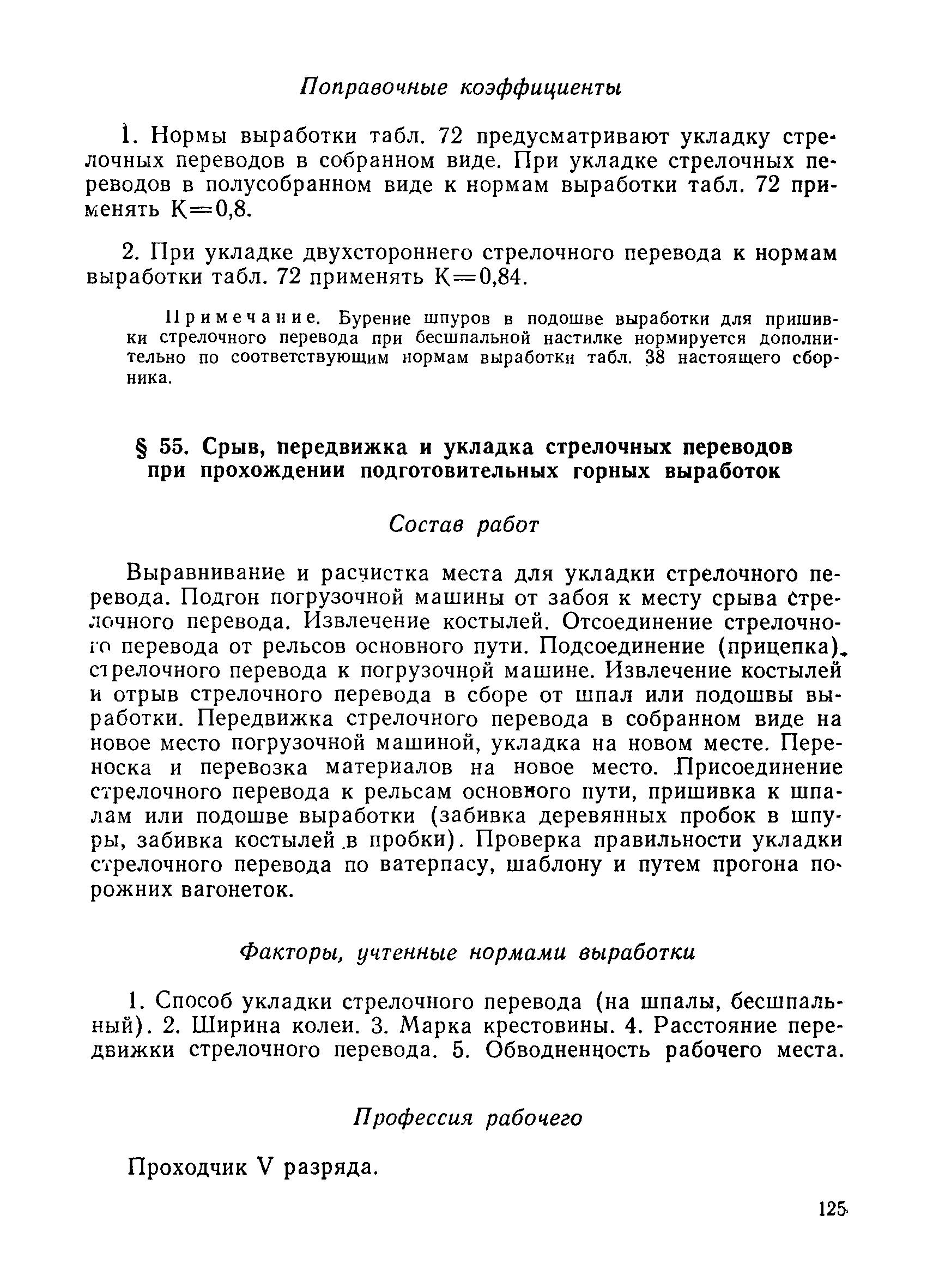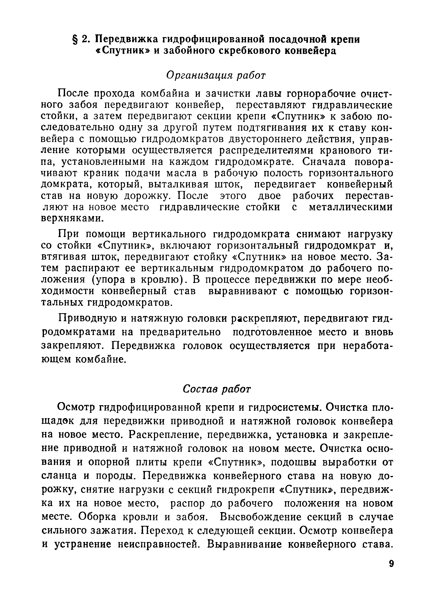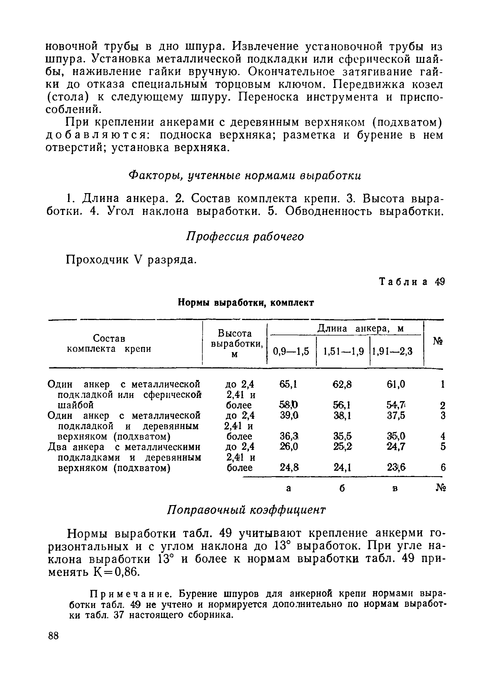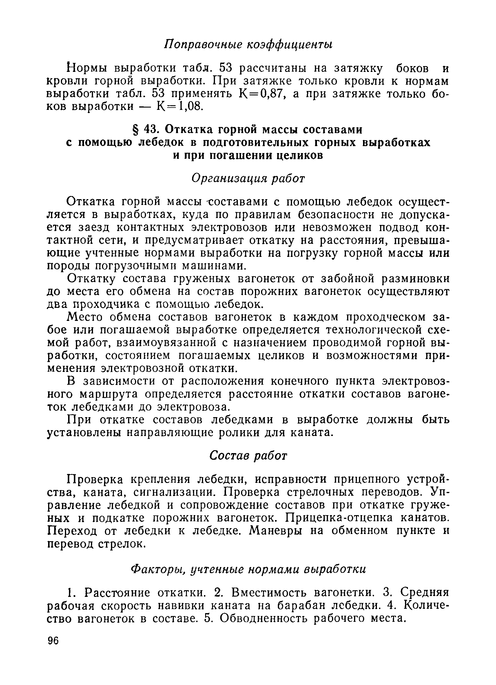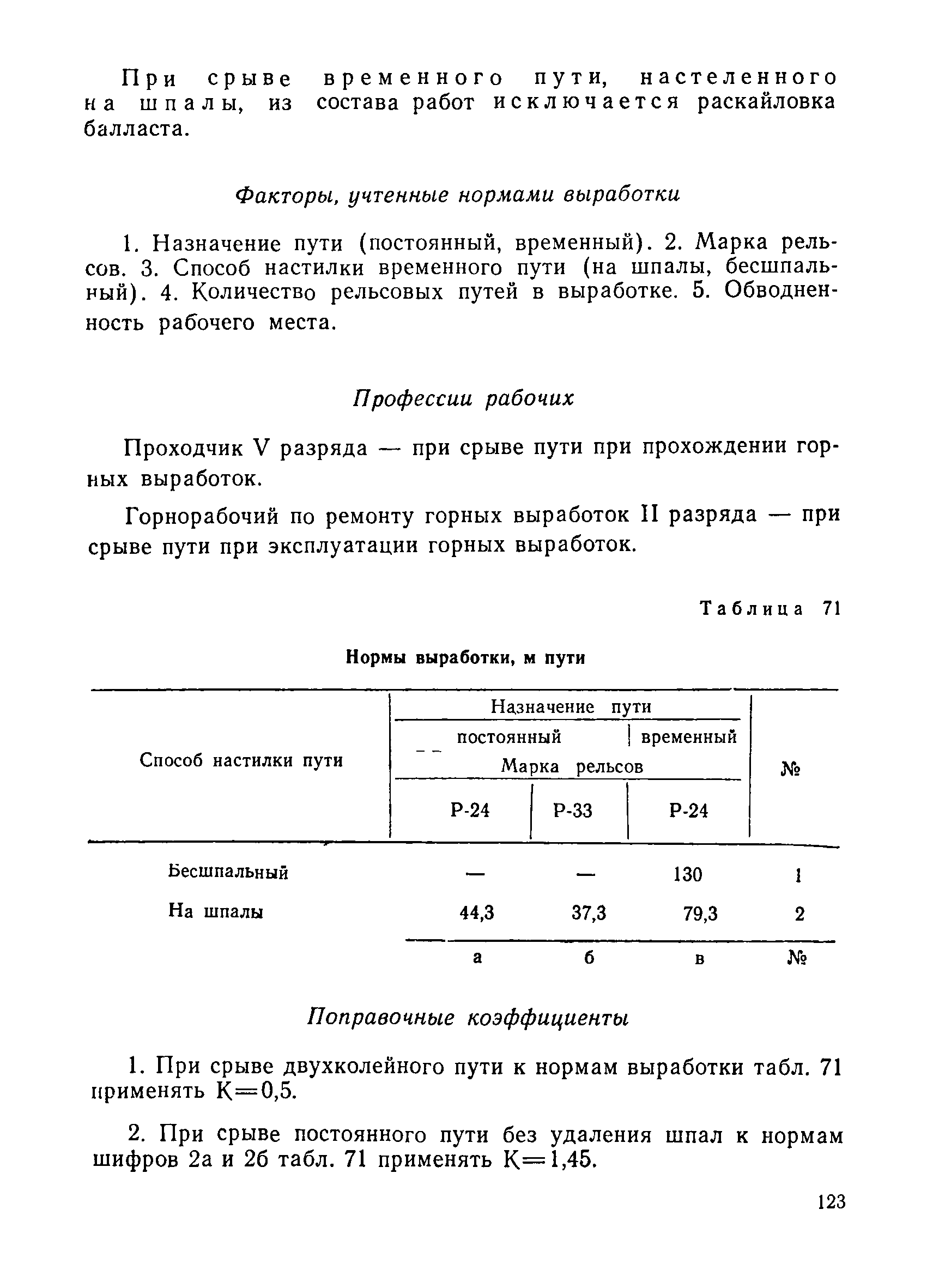 При внедрении нового оборудования, прогрессивной технологии ведения горных работ и более совершенных форм организации труда, не предусмотренных настоящим сборником, нормы должны устанавливаться с учетом технических возможностей оборудования в этих условиях. | | Оглавление: | Общая часть Нормативная часть I Очистные работы Техническая часть Нормативная часть § 1 Выемка горной массы комбайном ГШ-68 и подготовка к выемке следующей полосы § 2 Передвижка гидрофицированной посадочной крепи "Спутник" и забойного скребкового конвейера § 3 Перестановка гидравлических стоек § 4 Осевая передвижка скребкового конвейера-перегружателя на сборном штреке комбайновой лавы § 5 Выемка горной массы комбайнами 1К-101, 2К-101 и подготовка к выемке следующей полосы § 6 Оформление забоя после выемки горной массы комбайнами К-101, 2К-101 § 7 Выемка горной массы из ниш лавы, оборудованной комбайном 1К-101 или 2К-101 § 8 Зарубка сланца врубовой машиной "Урал-33" § 9 Перегон врубовой машины "Урал-33" § 10 Бурение шпуров бурильными установками БУА-3 и БУА-3с § 11 Перегон бурильных установок БУА-3 и БУА-3с § 12 Бурение шпуров ручным электросверлом § 13 Погрузка горной массы погрузочной машиной 1ПНБ-2 § 14 Навалоотбойка сланца в лавах с выкладкой бутовых полос § 15 Перестановка клиновых металлических стоек в лавах § 16 Крепление очистных забоев металлической анкерной крепью § 17 Проверка состояния и повторная затяжка гаек металлической анкерной крепи § 18 Крепление забоя деревянной крепью § 19 Возведение деревянной органной крепи § 20 Извлечение деревянной крепи из отработанных заходок камер-лав лебедкой § 21 Крепление сопряжений лав с примыкающими выработками § 22 Передвижка забойного скребкового конвейера на новую дорожку без разборки конвейерного става § 23 Передвижка забойного скребкового конвейера в новую нарезку с частичной разборкой на секции § 24 Переноска забойного скребкового конвейера из отработанного блока камеры лавы в новую разрезку § 25 Переноска забойного скребкового конвейера СП-63 с полной разборкой в лавах без машинной зарубки § 26 Разработка почвы под приводную головку забойного конвейера § 27 Уборка упавшей с кровли породы (вывалов) вручную II. Горно-подготовительные работы § 28 Проведение подготовительных горных выработок комбайнами ПК-3М, ПК-3Р § 29 Бурение шпуров ручными электросверлами в сланце и породе при буровзрывном способе прохождения выработок § 30 Погрузка горной массы погрузочной машиной 1ПНБ-2 § 31 Погрузка породы погрузочной машиной 1ПНБ-2 при проведении полевых водоотливных штреков (туннелей), кроссингов и при опускании кровли § 32 Ручная погрузка, перекидка и откатка горной массы и породы § 33 Проведение, углубка и очистка водоотливных канавок врубовой машиной "Урал-33" § 34 Уборка породы экскаватором "Беларусь" при проведении водосборников § 35 Уборка породы вручную при проведении водосборников § 36 Крепление горных выработок металлической анкерной крепью § 37 Проверка состояния и повторная затяжка гаек металлической анкерной крепи § 38 Извлечение временной металлической анкерной крепи в подготовительных горных выработках § 39 Крепление горных выработок в период эксплуатации металлическими штангами с заполнением шпура бетонной смесью § 40 Крепление горных выработок металлической трапециевидной крепью вразбежку § 41 Крепление горных выработок деревян
