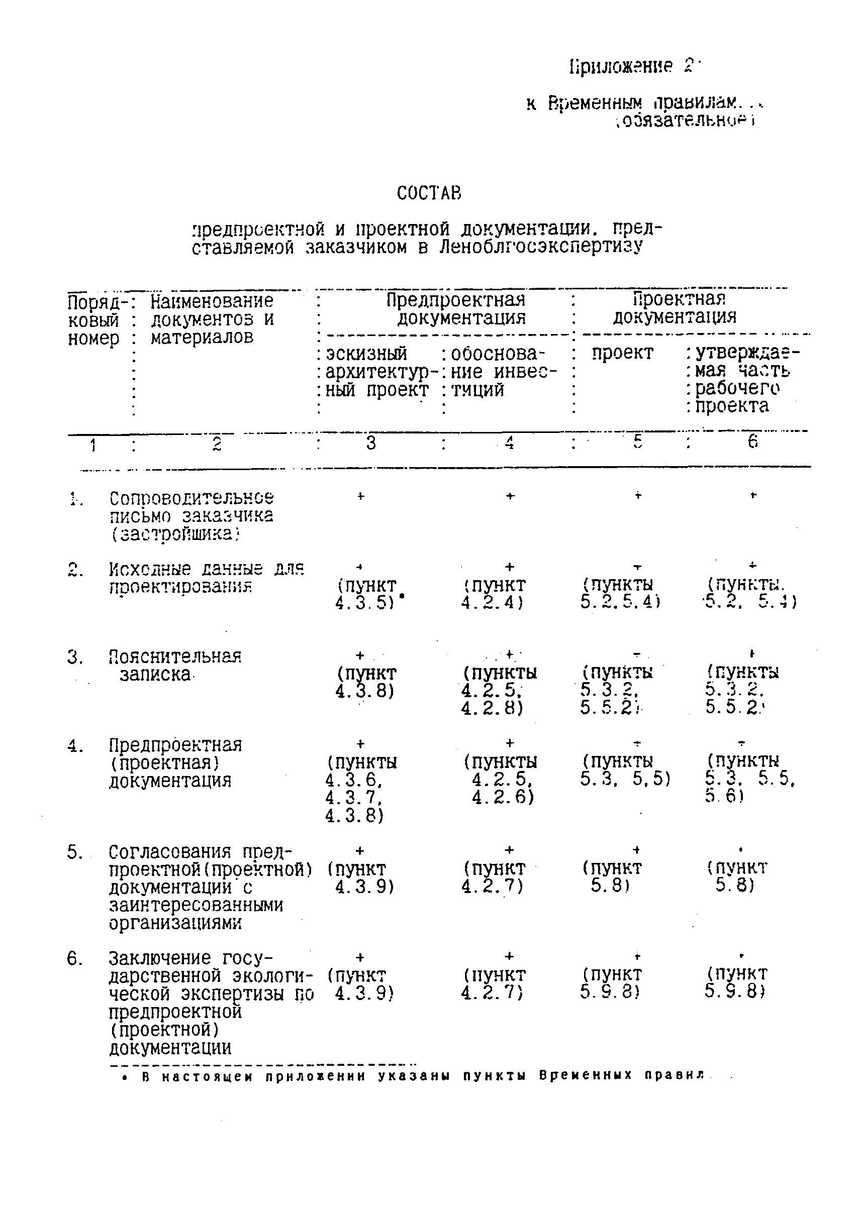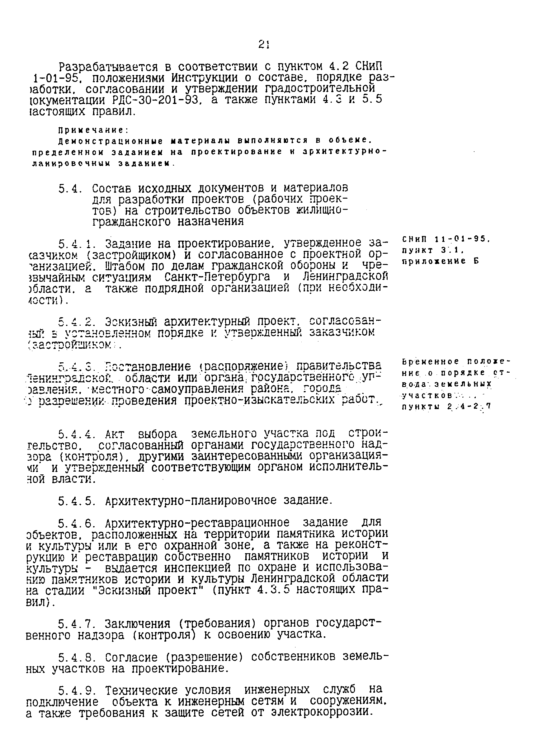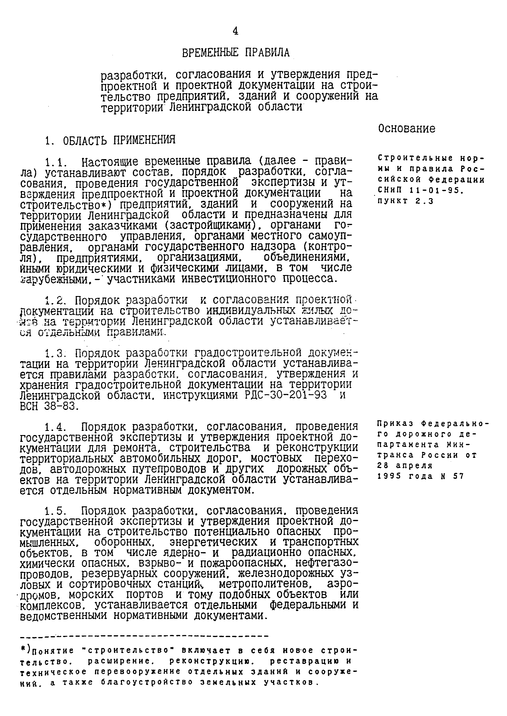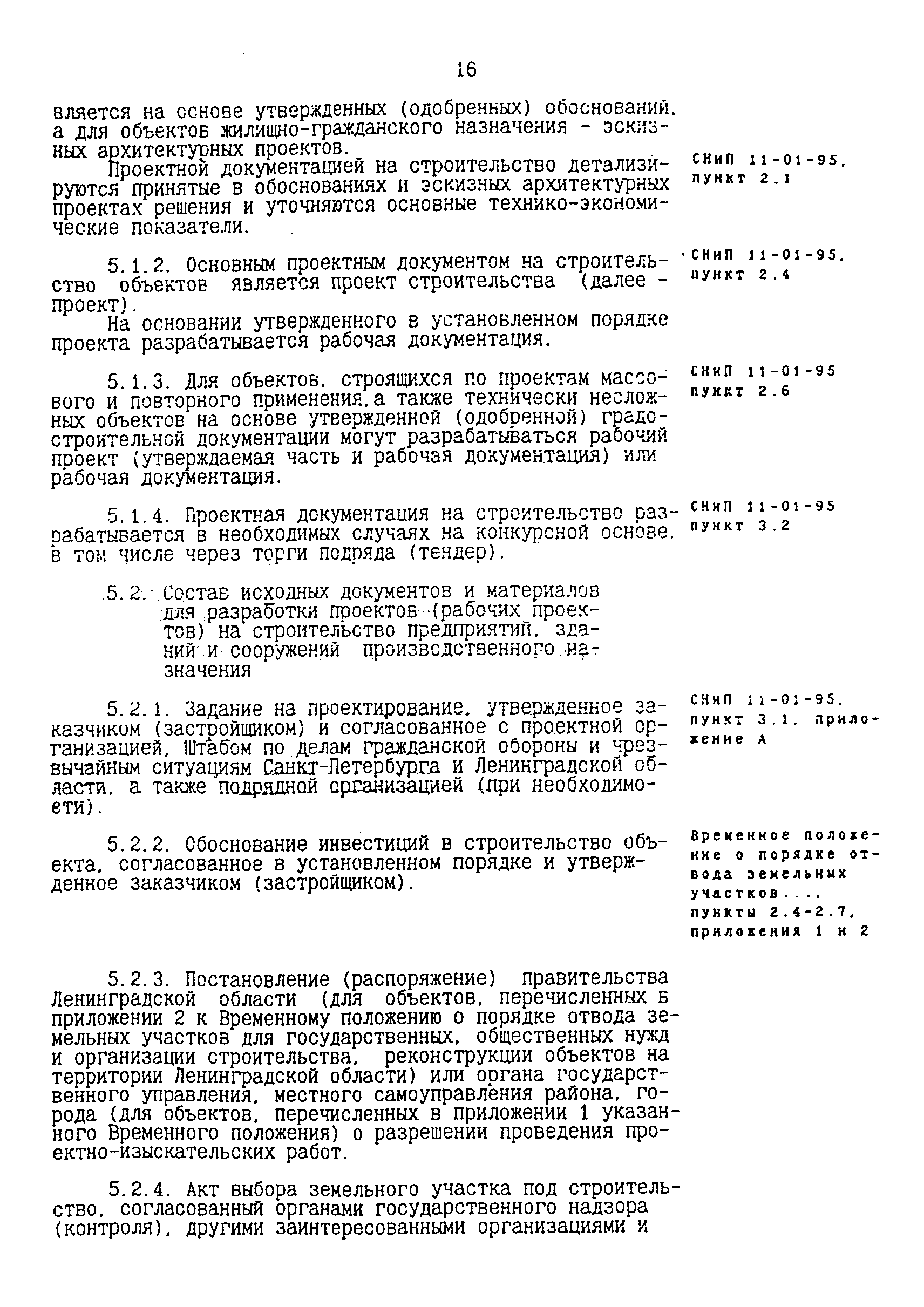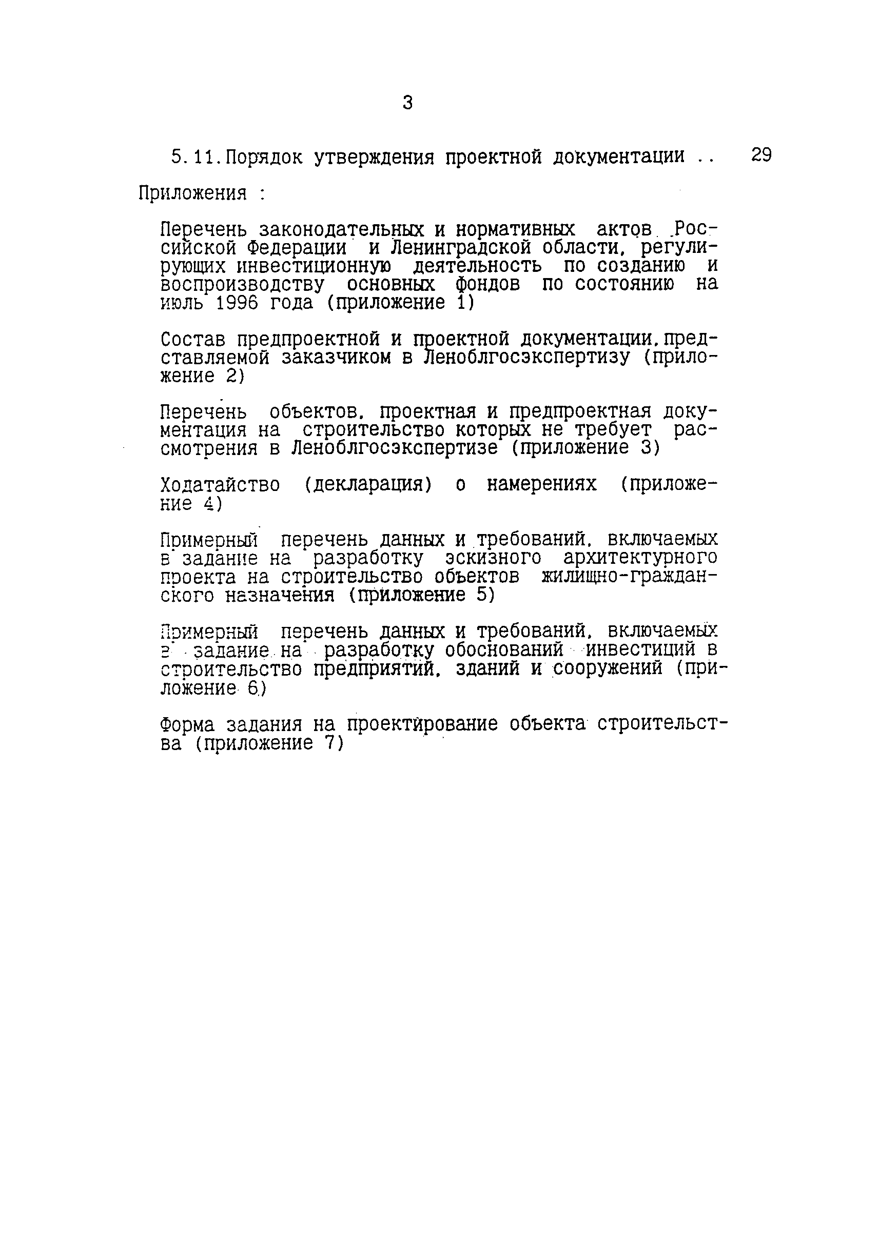 | Оглавление: | 1. Область применения 2. Общие положения 3. Ходатайство (декларация) о намерениях. Прядок составления и рассмотрения 4. Предпроектные исследования. Разработка, согласование, экспертиза и утверждение 4.1. Виды предпроектных исследований 4.2. Обоснования инвестиций в строительство предприятий, зданий и сооружений производственного назначения 4.3. Эскизный архитектурный проект на строительство объектов жилищно-гражданского назначения 5. Проектная документация. Разработка, согласование, экспертиза и утверждение 5.1. Общие требования 5.2. Состав исходных документов и материалов для разработки проектов (рабочих проектов) на строительство предприятий, зданий и сооружений производственного назначения 5.3. Состав и содержание проекта на строительство предприятий, зданий и сооружений производственного назначения 5.4. Состав исходных документов и материалов для разработки проектов (рабочих проектов) на строительство объектов жилищно-гражданского назначения 5.5. Состав и содержание проекта на строительство объектов жилищно-гражданского назначения 5.6. Состав и содержание рабочего проекта 5.7. Состав рабочей документации 5.8. Порядок согласования проектной документации 5.9. Порядок проведения государственной экспертизы проектной документации 5.10. Порядок проведения государственной экспертизы проектной документации в области защиты населения и территорий от чрезвычайных ситуаций 5.11. Порядок утверждения проектной документации Приложение 1. Перечень законодательных и нормативных актов Российской Федерации и Ленинградской области, регулирующих инвестиционную деятельность по созданию и воспроизводству основных фондов по состоянию на июль 1996 г. Приложение 2. Состав предпроектной и проектной документации, представляемой заказчиком в Леноблгосэкспертизу Приложение 3. Перечень объектов, проектная и предпроектная документация на строительство которых не требует рассмотрения в Леноблгосэкспертизе Приложение 4. Ходатайство (декларация) о намерениях Приложение 5. Примерный перечень данных и требований, включаемых в задание на разработку эскизного архитектурного проекта на строительство объектов жилищно-гражданского назначения Приложение 6. Примерный перечень данных и требований, включаемых в задание на разработку обоснований инвестиций в строительство предприятий, зданий и сооружений Приложение 7. Форма задания на проектирование объекта строительства |