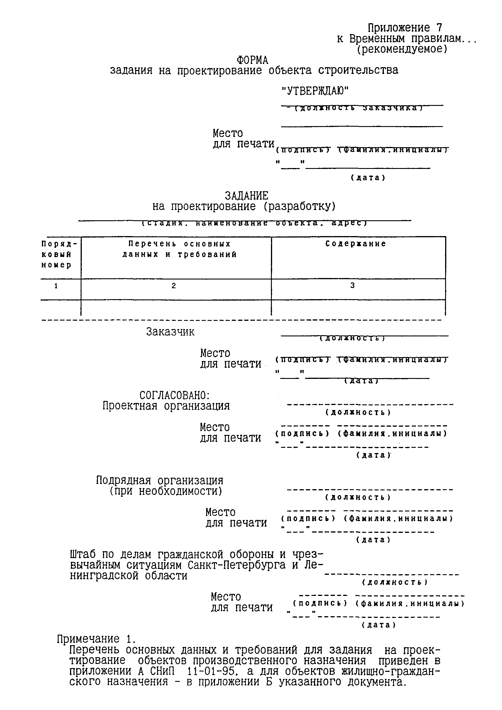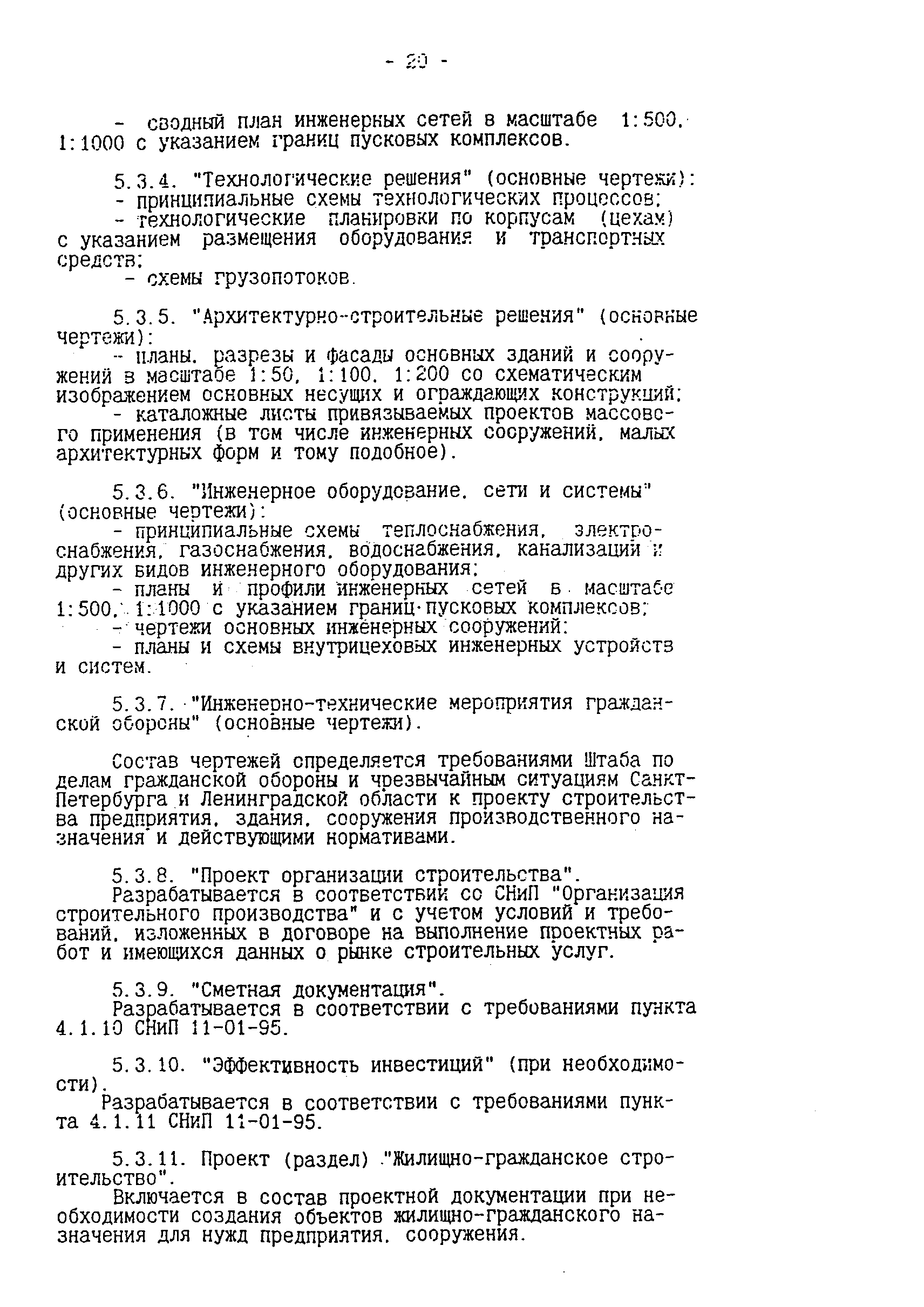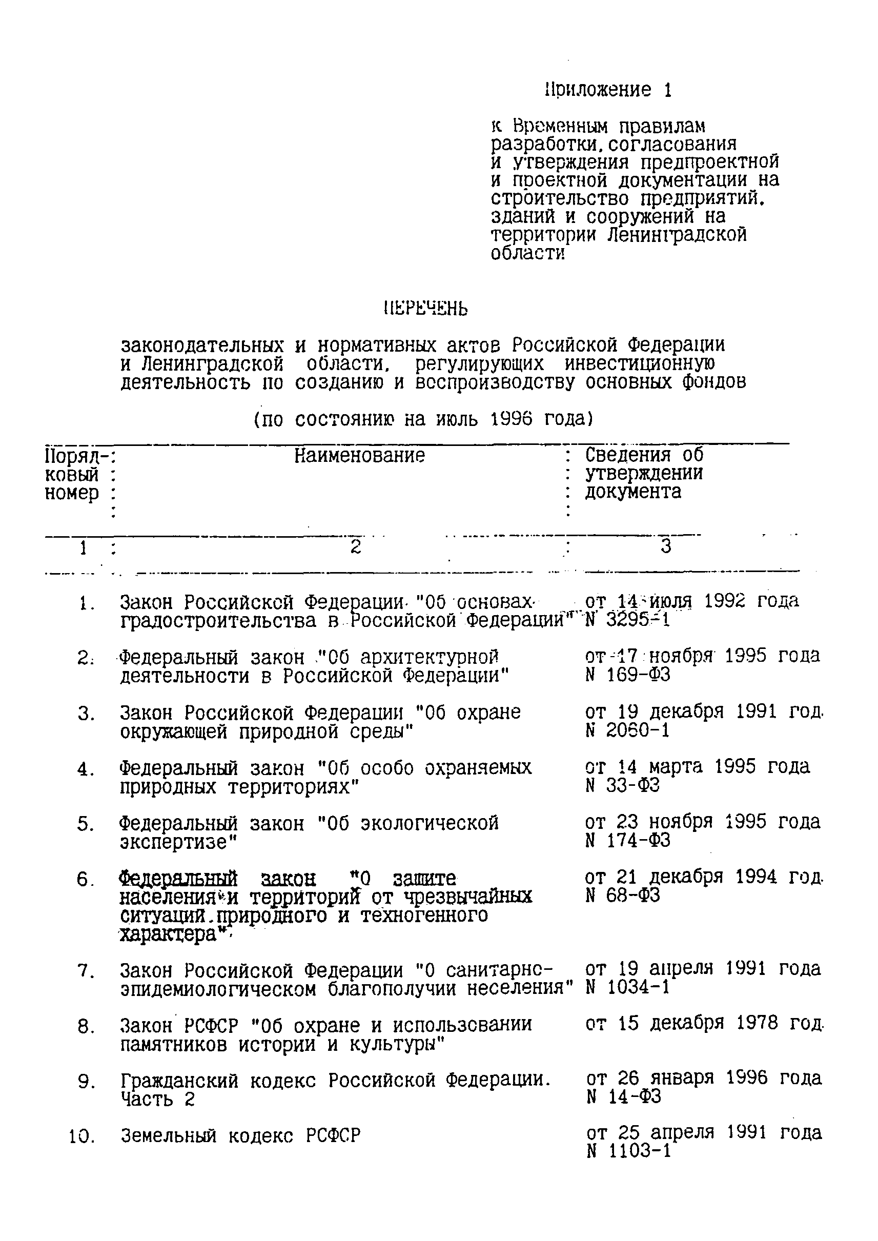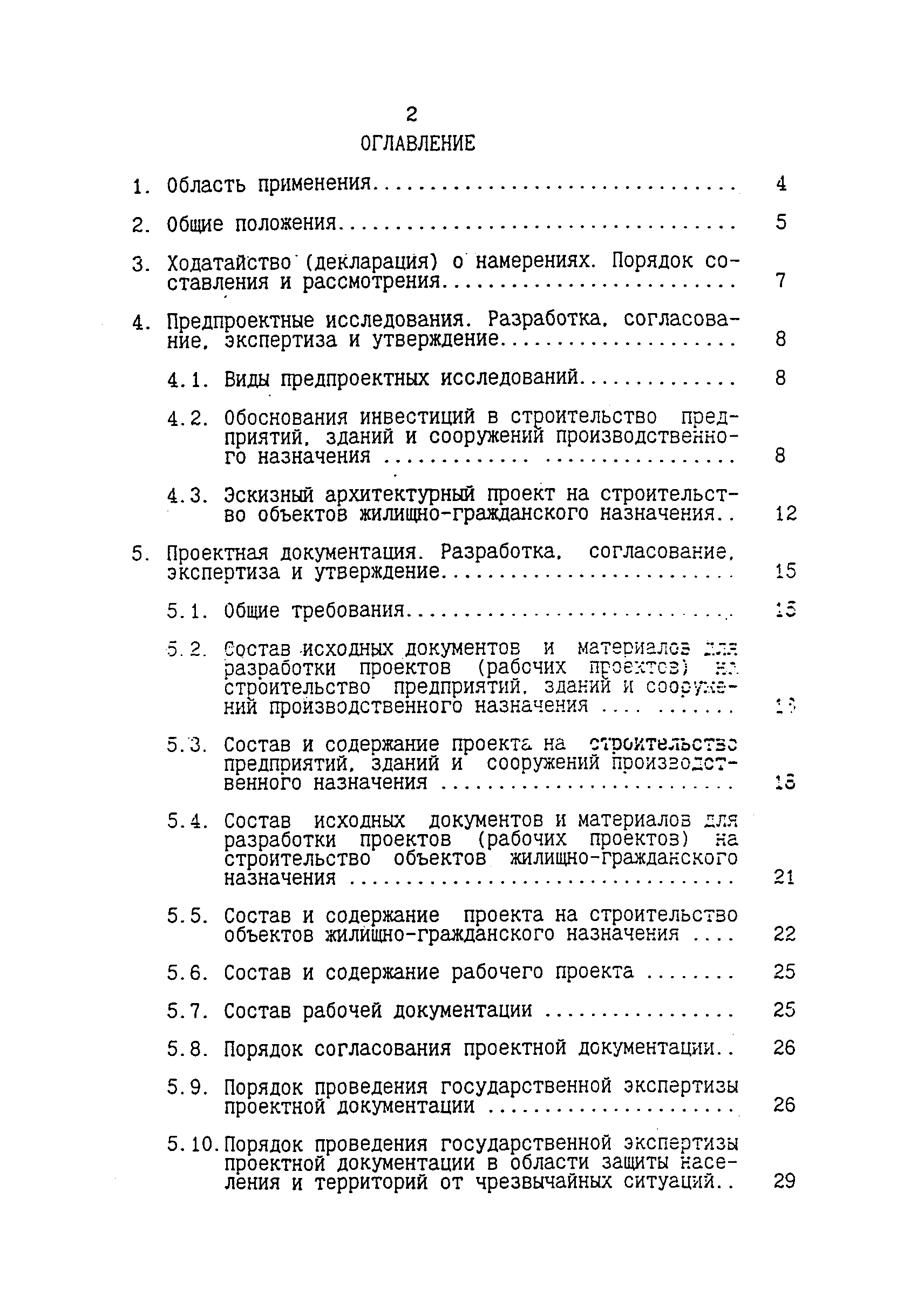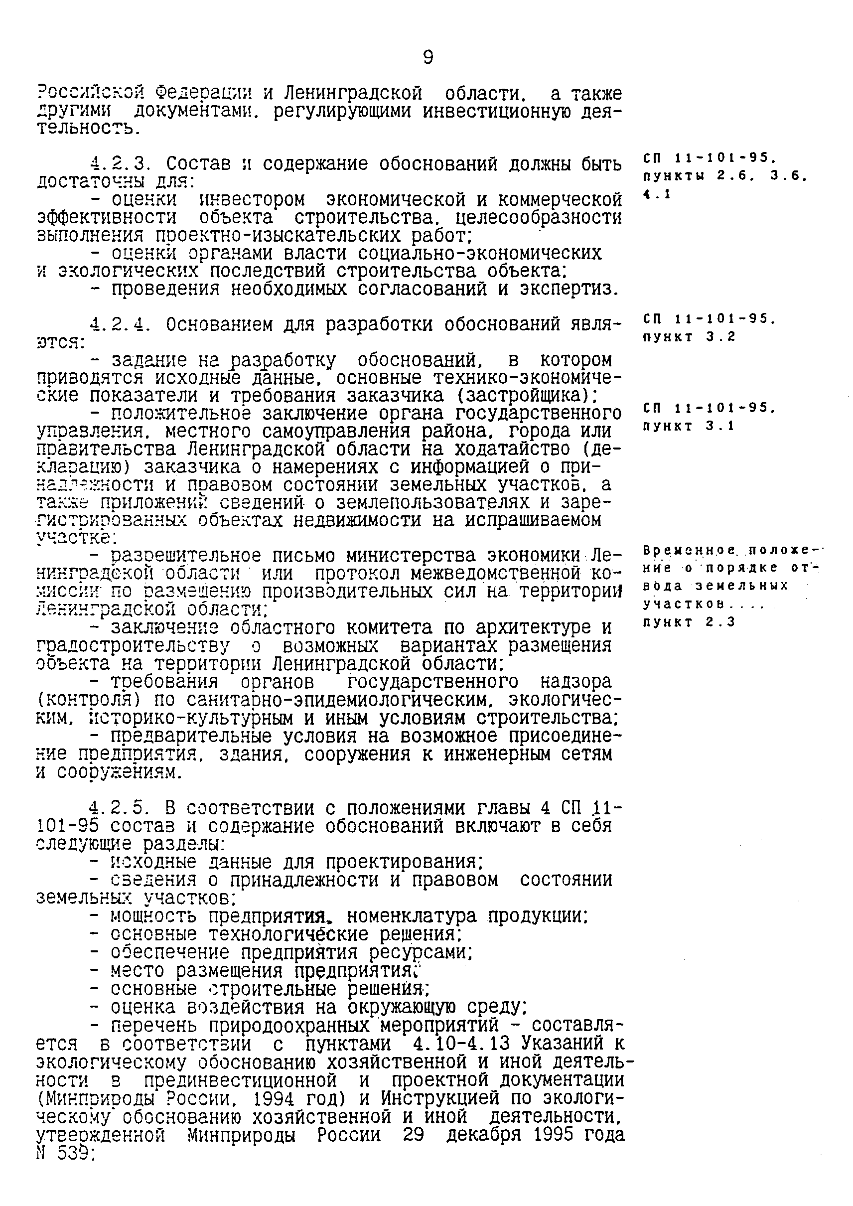 | Оглавление: | 1. Область применения 2. Общие положения 3. Ходатайство (декларация) о намерениях. Прядок составления и рассмотрения 4. Предпроектные исследования. Разработка, согласование, экспертиза и утверждение 4.1. Виды предпроектных исследований 4.2. Обоснования инвестиций в строительство предприятий, зданий и сооружений производственного назначения 4.3. Эскизный архитектурный проект на строительство объектов жилищно-гражданского назначения 5. Проектная документация. Разработка, согласование, экспертиза и утверждение 5.1. Общие требования 5.2. Состав исходных документов и материалов для разработки проектов (рабочих проектов) на строительство предприятий, зданий и сооружений производственного назначения 5.3. Состав и содержание проекта на строительство предприятий, зданий и сооружений производственного назначения 5.4. Состав исходных документов и материалов для разработки проектов (рабочих проектов) на строительство объектов жилищно-гражданского назначения 5.5. Состав и содержание проекта на строительство объектов жилищно-гражданского назначения 5.6. Состав и содержание рабочего проекта 5.7. Состав рабочей документации 5.8. Порядок согласования проектной документации 5.9. Порядок проведения государственной экспертизы проектной документации 5.10. Порядок проведения государственной экспертизы проектной документации в области защиты населения и территорий от чрезвычайных ситуаций 5.11. Порядок утверждения проектной документации Приложение 1. Перечень законодательных и нормативных актов Российской Федерации и Ленинградской области, регулирующих инвестиционную деятельность по созданию и воспроизводству основных фондов по состоянию на июль 1996 г. Приложение 2. Состав предпроектной и проектной документации, представляемой заказчиком в Леноблгосэкспертизу Приложение 3. Перечень объектов, проектная и предпроектная документация на строительство которых не требует рассмотрения в Леноблгосэкспертизе Приложение 4. Ходатайство (декларация) о намерениях Приложение 5. Примерный перечень данных и требований, включаемых в задание на разработку эскизного архитектурного проекта на строительство объектов жилищно-гражданского назначения Приложение 6. Примерный перечень данных и требований, включаемых в задание на разработку обоснований инвестиций в строительство предприятий, зданий и сооружений Приложение 7. Форма задания на проектирование объекта строительства |