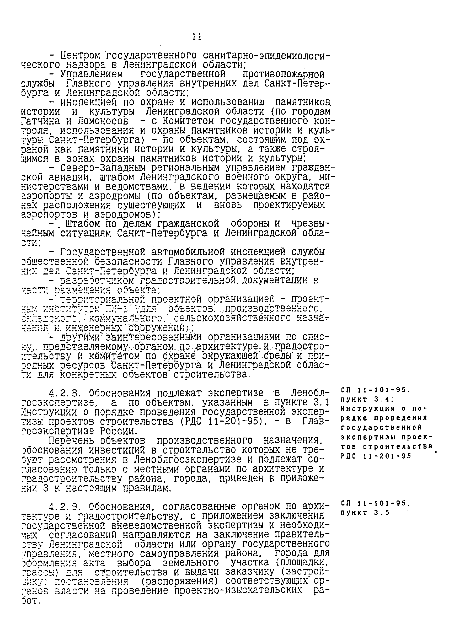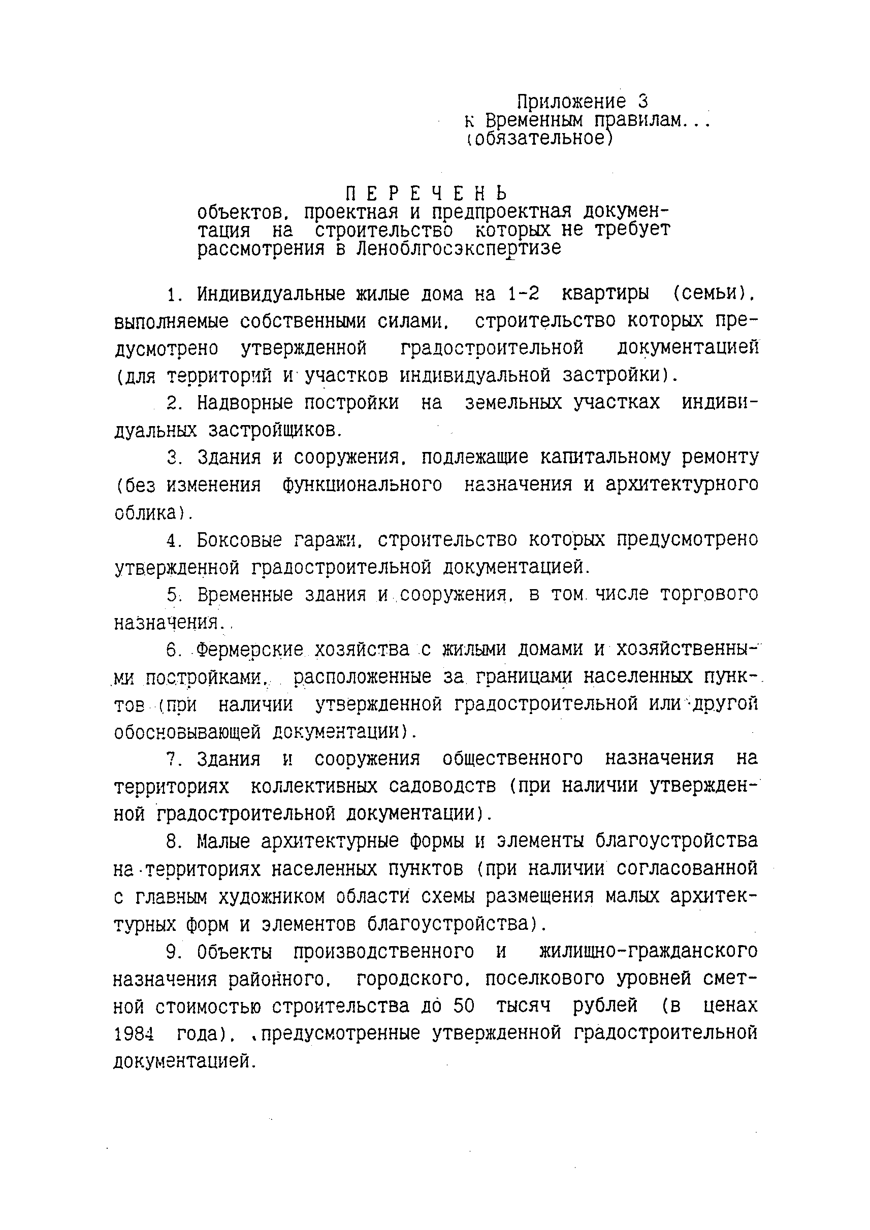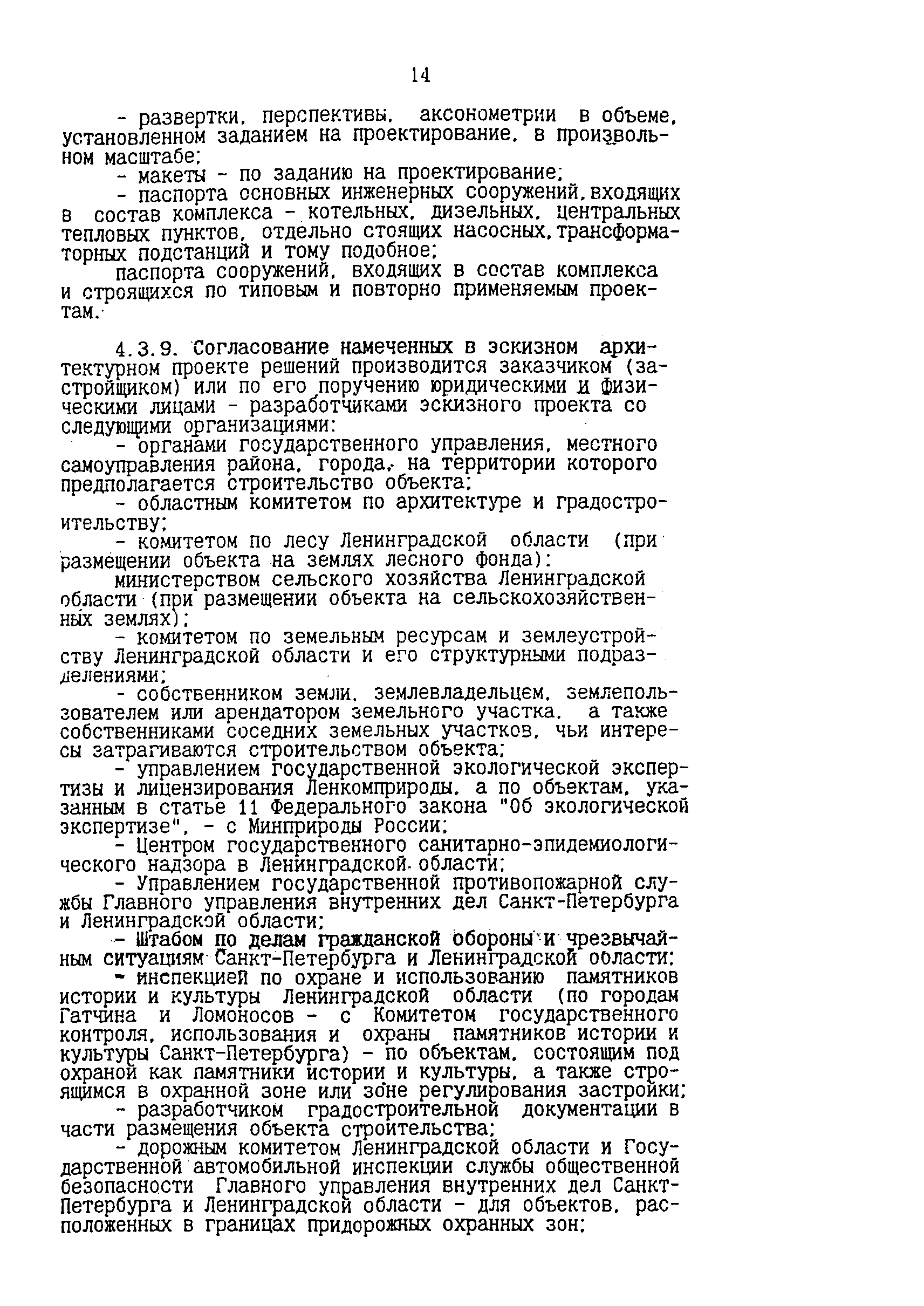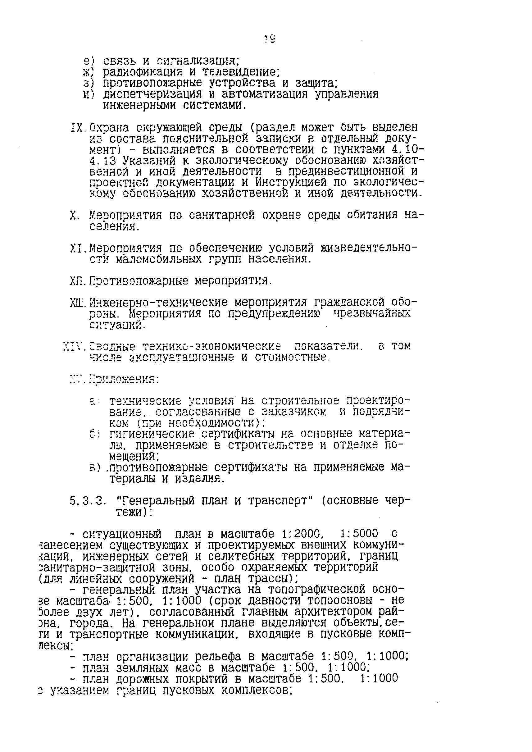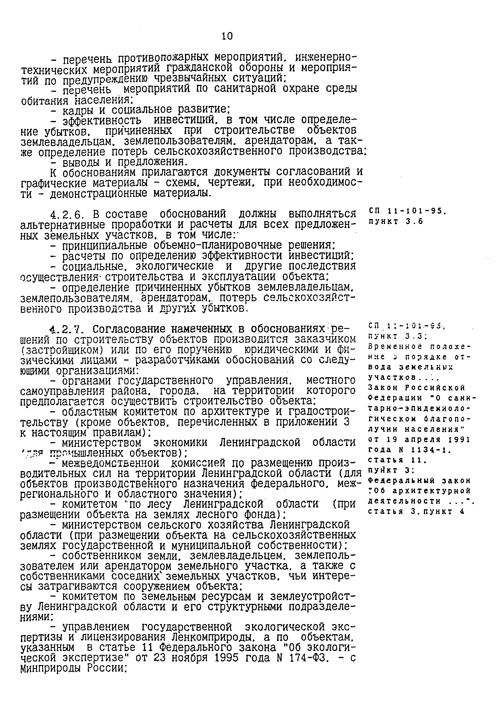 | Оглавление: | 1. Область применения 2. Общие положения 3. Ходатайство (декларация) о намерениях. Прядок составления и рассмотрения 4. Предпроектные исследования. Разработка, согласование, экспертиза и утверждение 4.1. Виды предпроектных исследований 4.2. Обоснования инвестиций в строительство предприятий, зданий и сооружений производственного назначения 4.3. Эскизный архитектурный проект на строительство объектов жилищно-гражданского назначения 5. Проектная документация. Разработка, согласование, экспертиза и утверждение 5.1. Общие требования 5.2. Состав исходных документов и материалов для разработки проектов (рабочих проектов) на строительство предприятий, зданий и сооружений производственного назначения 5.3. Состав и содержание проекта на строительство предприятий, зданий и сооружений производственного назначения 5.4. Состав исходных документов и материалов для разработки проектов (рабочих проектов) на строительство объектов жилищно-гражданского назначения 5.5. Состав и содержание проекта на строительство объектов жилищно-гражданского назначения 5.6. Состав и содержание рабочего проекта 5.7. Состав рабочей документации 5.8. Порядок согласования проектной документации 5.9. Порядок проведения государственной экспертизы проектной документации 5.10. Порядок проведения государственной экспертизы проектной документации в области защиты населения и территорий от чрезвычайных ситуаций 5.11. Порядок утверждения проектной документации Приложение 1. Перечень законодательных и нормативных актов Российской Федерации и Ленинградской области, регулирующих инвестиционную деятельность по созданию и воспроизводству основных фондов по состоянию на июль 1996 г. Приложение 2. Состав предпроектной и проектной документации, представляемой заказчиком в Леноблгосэкспертизу Приложение 3. Перечень объектов, проектная и предпроектная документация на строительство которых не требует рассмотрения в Леноблгосэкспертизе Приложение 4. Ходатайство (декларация) о намерениях Приложение 5. Примерный перечень данных и требований, включаемых в задание на разработку эскизного архитектурного проекта на строительство объектов жилищно-гражданского назначения Приложение 6. Примерный перечень данных и требований, включаемых в задание на разработку обоснований инвестиций в строительство предприятий, зданий и сооружений Приложение 7. Форма задания на проектирование объекта строительства |