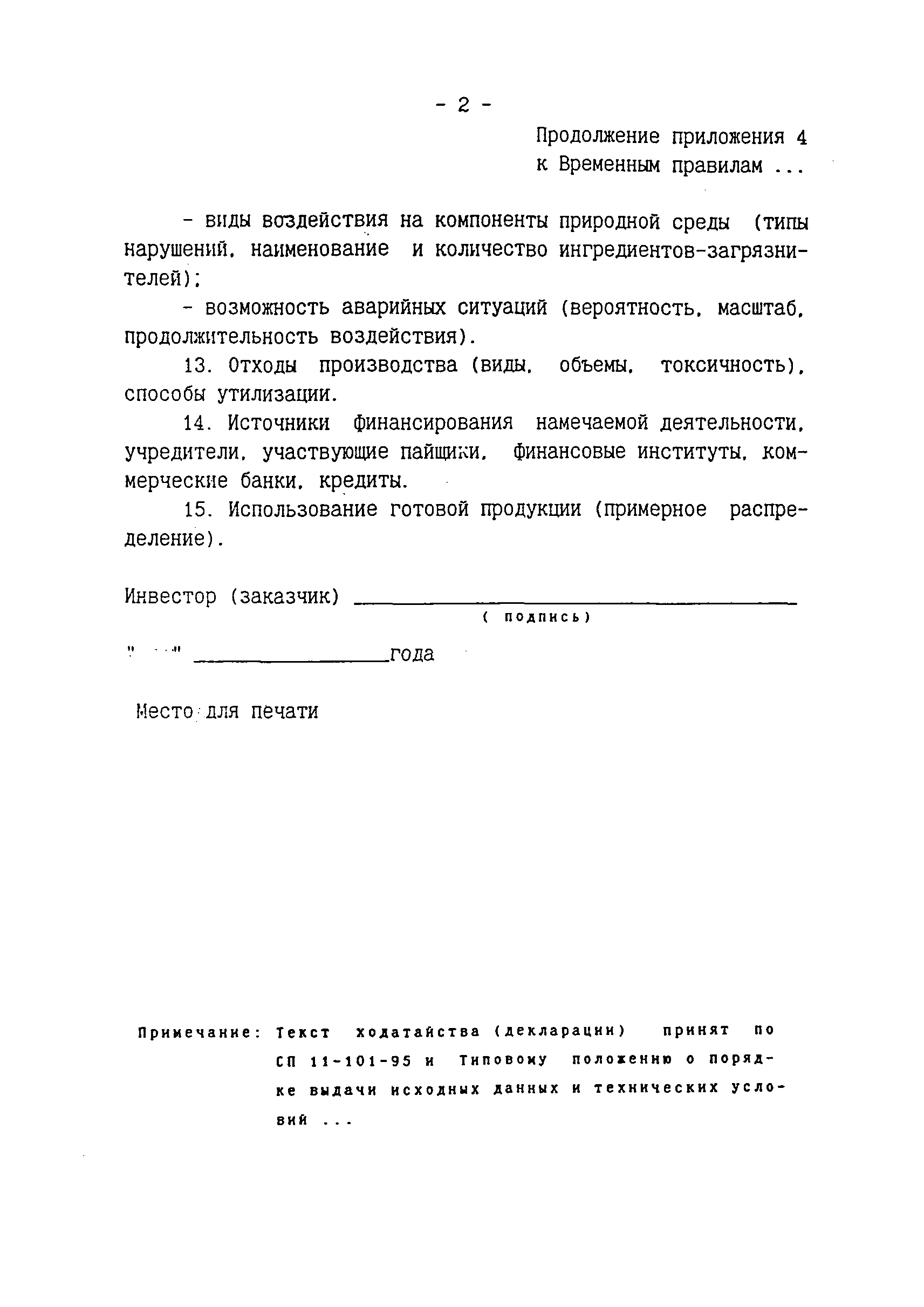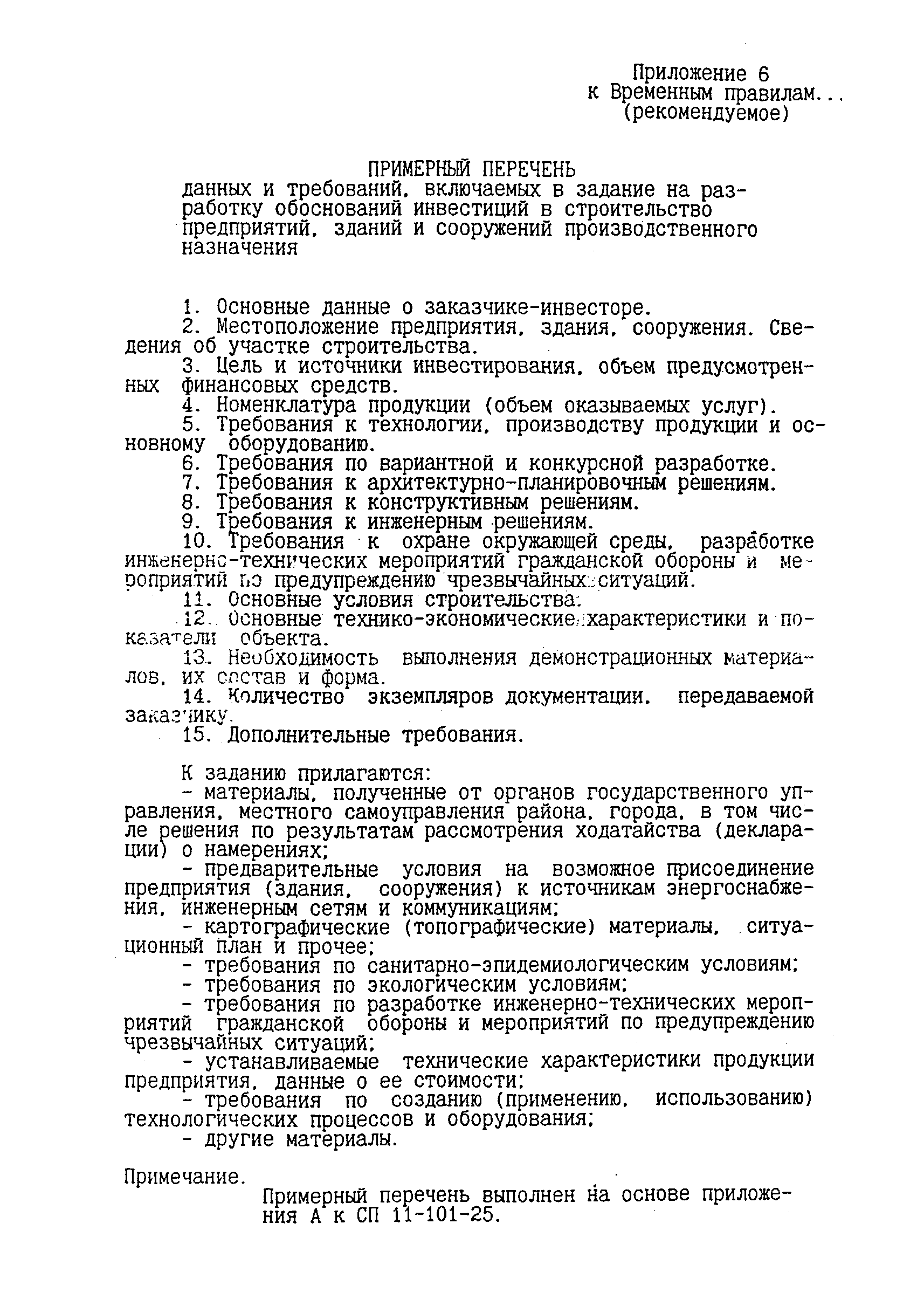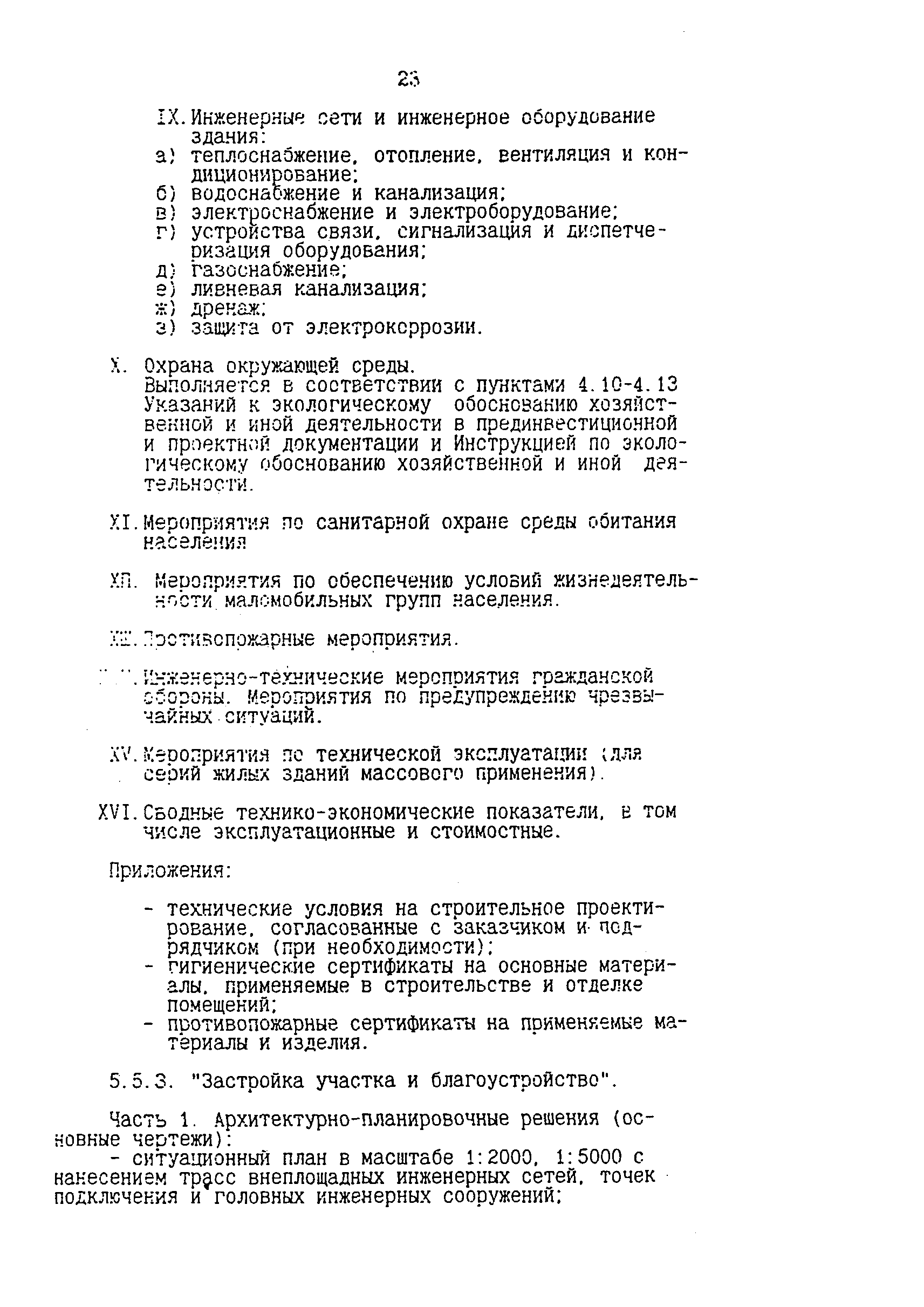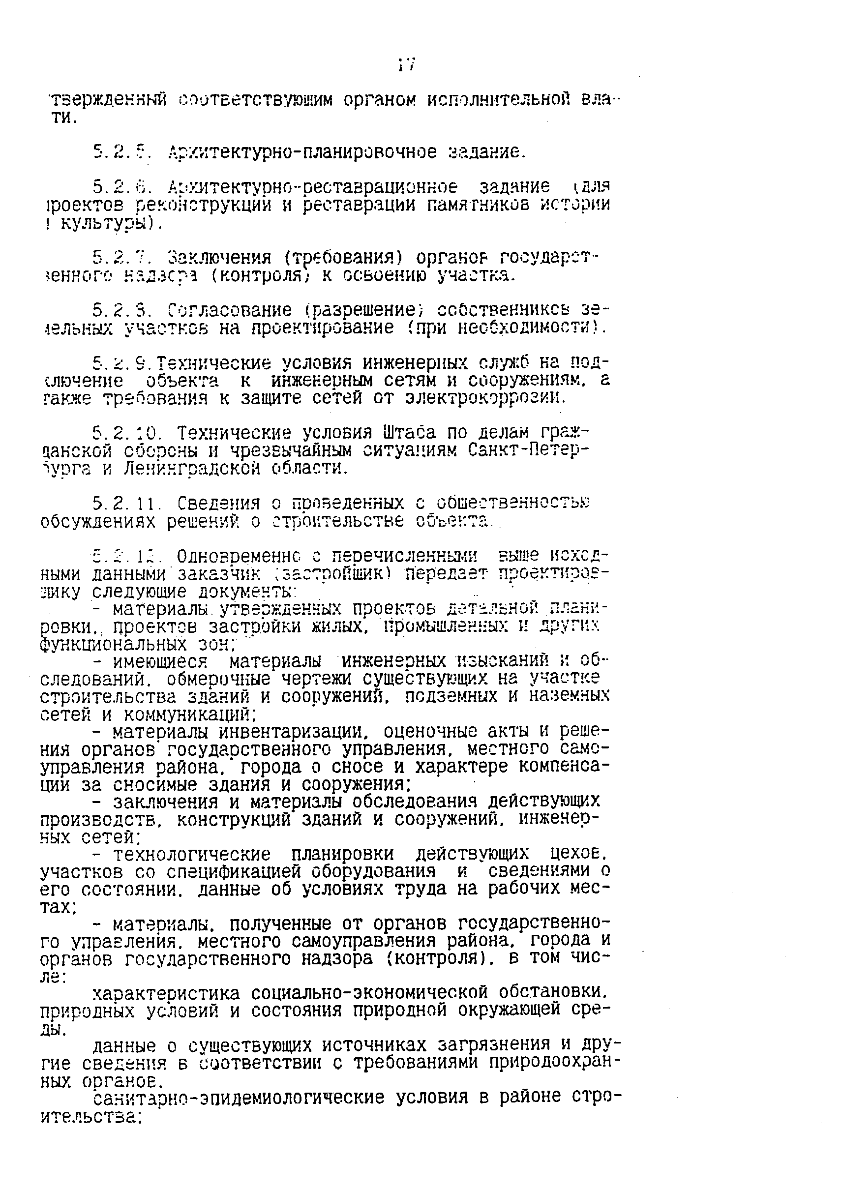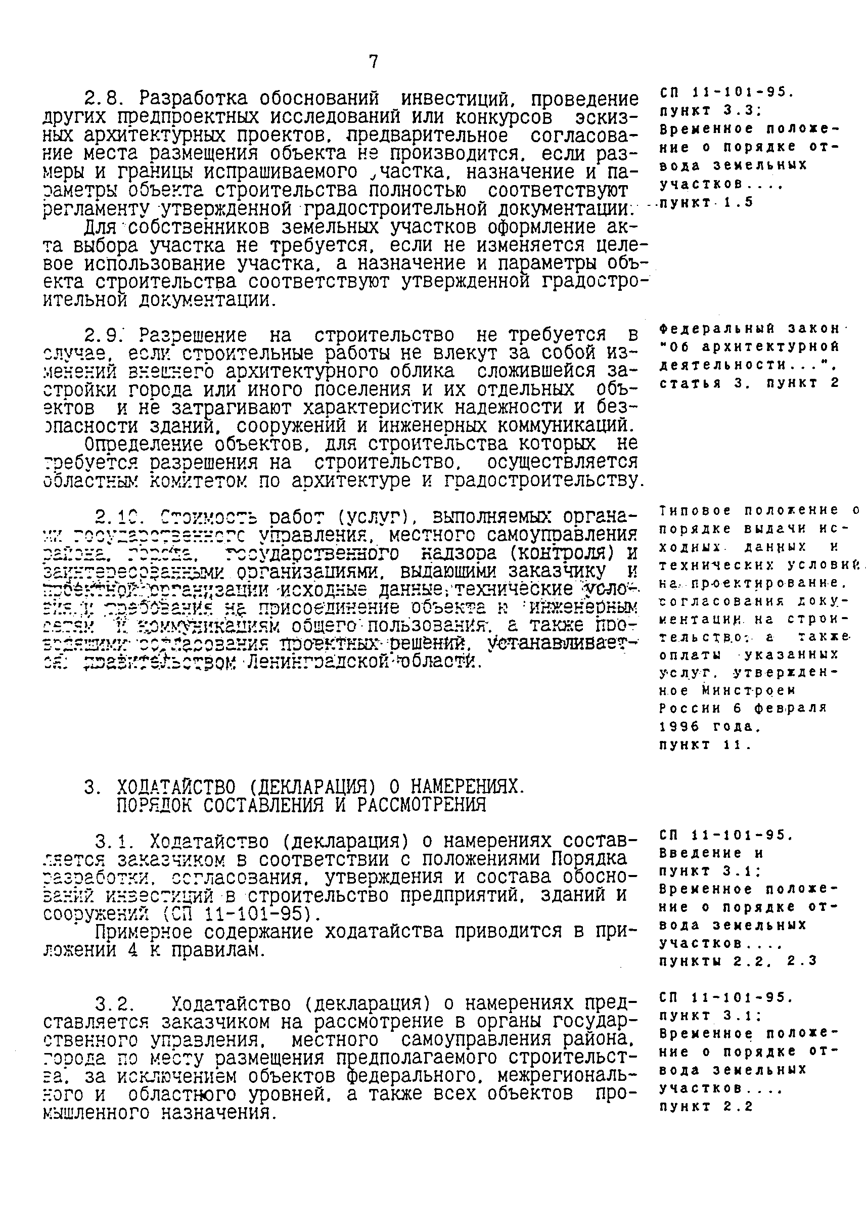 | Оглавление: | 1. Область применения 2. Общие положения 3. Ходатайство (декларация) о намерениях. Прядок составления и рассмотрения 4. Предпроектные исследования. Разработка, согласование, экспертиза и утверждение 4.1. Виды предпроектных исследований 4.2. Обоснования инвестиций в строительство предприятий, зданий и сооружений производственного назначения 4.3. Эскизный архитектурный проект на строительство объектов жилищно-гражданского назначения 5. Проектная документация. Разработка, согласование, экспертиза и утверждение 5.1. Общие требования 5.2. Состав исходных документов и материалов для разработки проектов (рабочих проектов) на строительство предприятий, зданий и сооружений производственного назначения 5.3. Состав и содержание проекта на строительство предприятий, зданий и сооружений производственного назначения 5.4. Состав исходных документов и материалов для разработки проектов (рабочих проектов) на строительство объектов жилищно-гражданского назначения 5.5. Состав и содержание проекта на строительство объектов жилищно-гражданского назначения 5.6. Состав и содержание рабочего проекта 5.7. Состав рабочей документации 5.8. Порядок согласования проектной документации 5.9. Порядок проведения государственной экспертизы проектной документации 5.10. Порядок проведения государственной экспертизы проектной документации в области защиты населения и территорий от чрезвычайных ситуаций 5.11. Порядок утверждения проектной документации Приложение 1. Перечень законодательных и нормативных актов Российской Федерации и Ленинградской области, регулирующих инвестиционную деятельность по созданию и воспроизводству основных фондов по состоянию на июль 1996 г. Приложение 2. Состав предпроектной и проектной документации, представляемой заказчиком в Леноблгосэкспертизу Приложение 3. Перечень объектов, проектная и предпроектная документация на строительство которых не требует рассмотрения в Леноблгосэкспертизе Приложение 4. Ходатайство (декларация) о намерениях Приложение 5. Примерный перечень данных и требований, включаемых в задание на разработку эскизного архитектурного проекта на строительство объектов жилищно-гражданского назначения Приложение 6. Примерный перечень данных и требований, включаемых в задание на разработку обоснований инвестиций в строительство предприятий, зданий и сооружений Приложение 7. Форма задания на проектирование объекта строительства |