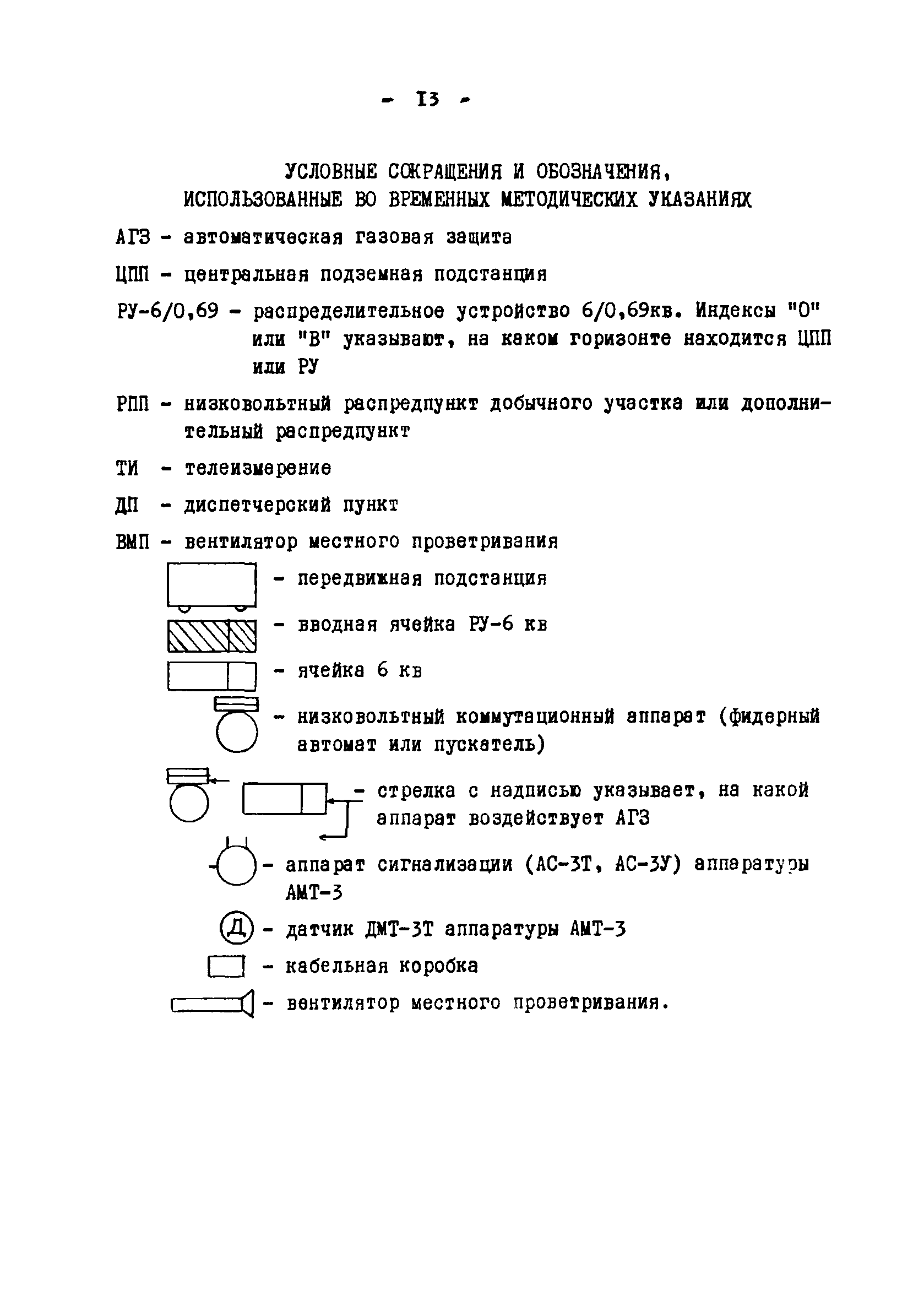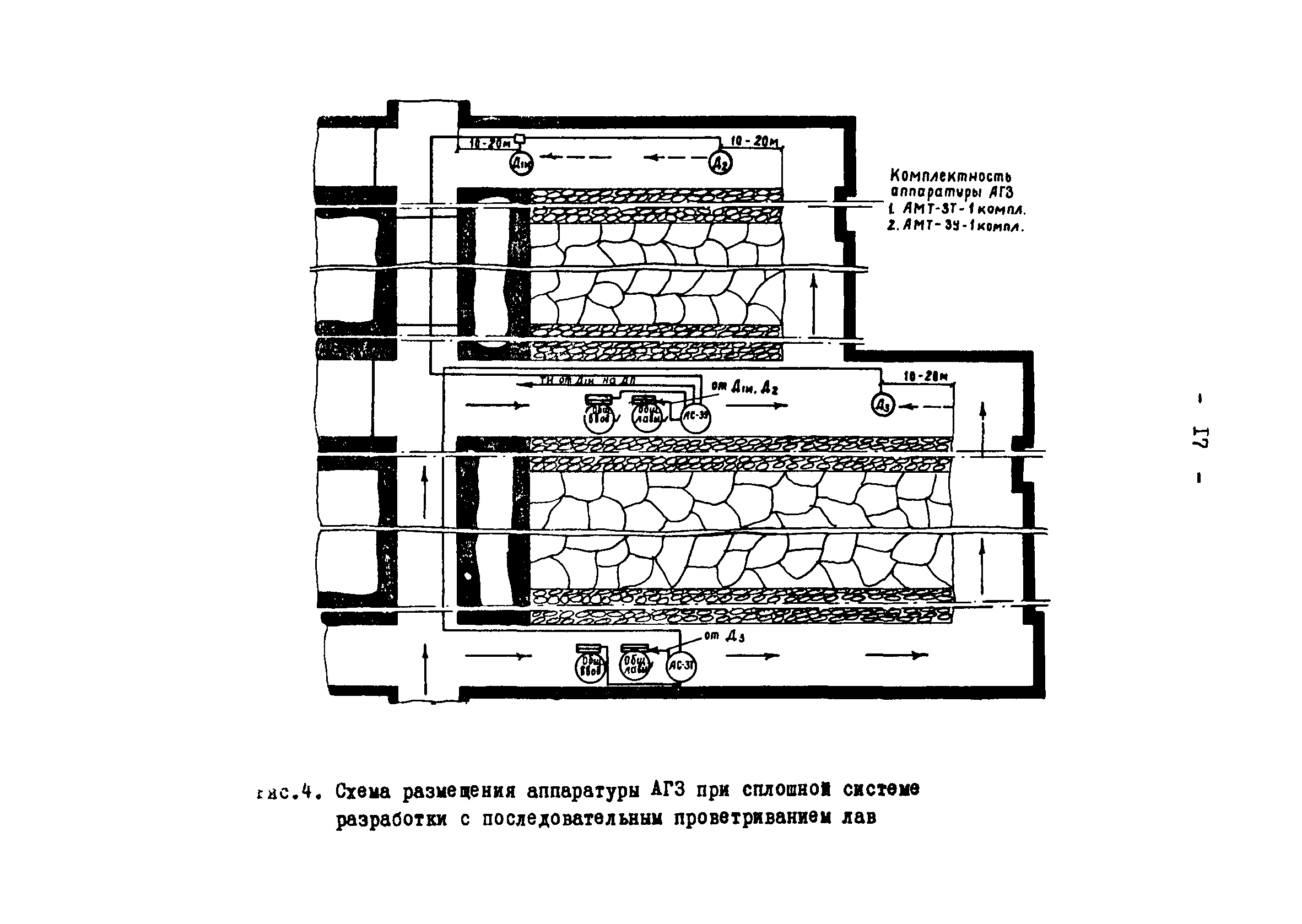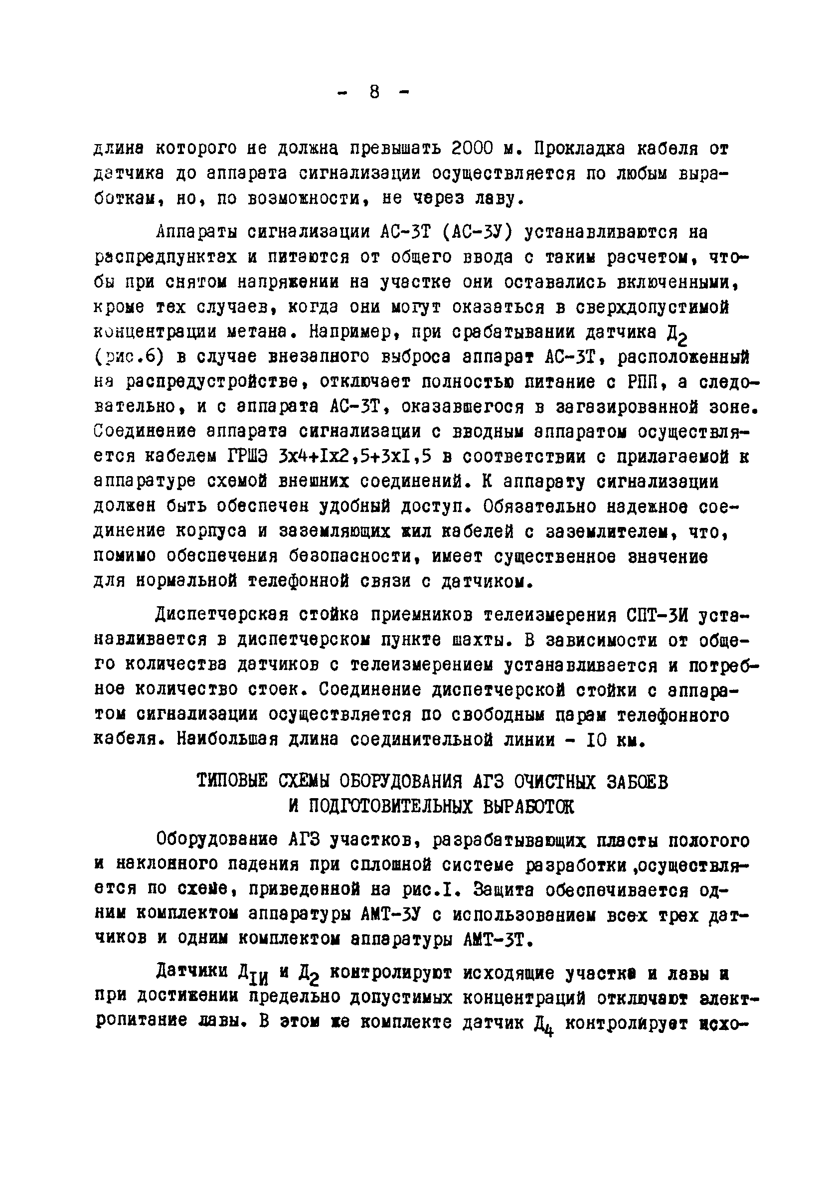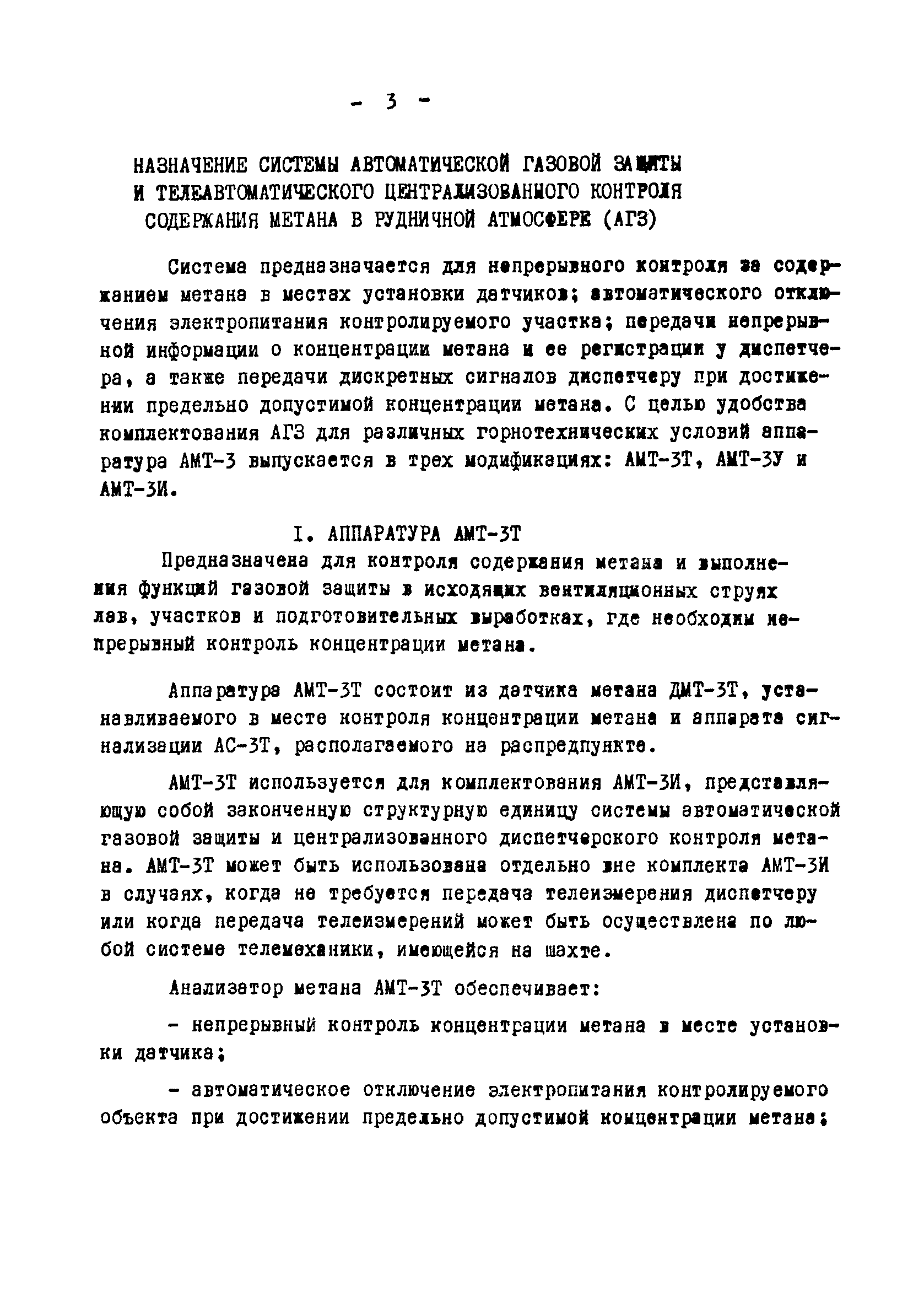 | Оглавление: | Назначение системы автоматической газовой защиты и телеавтоматического централизованного контроля содержания метана в рудничной атмосфере (АГЗ) 1 Аппаратура АМТ-3Т 2 Аппаратура АМТ-3У 3 Комплект аппаратуры АМТ-3И Область применения аппаратуры АГЗ Основные правила размещения и монтажа аппаратуры АГЗ Типовые схемы оборудования АГЗ очистных забоев и подготовительных выработок Условные сокращения и обозначения, использованные во временных методических указаниях Схемы размещения аппаратуры АГЗ |