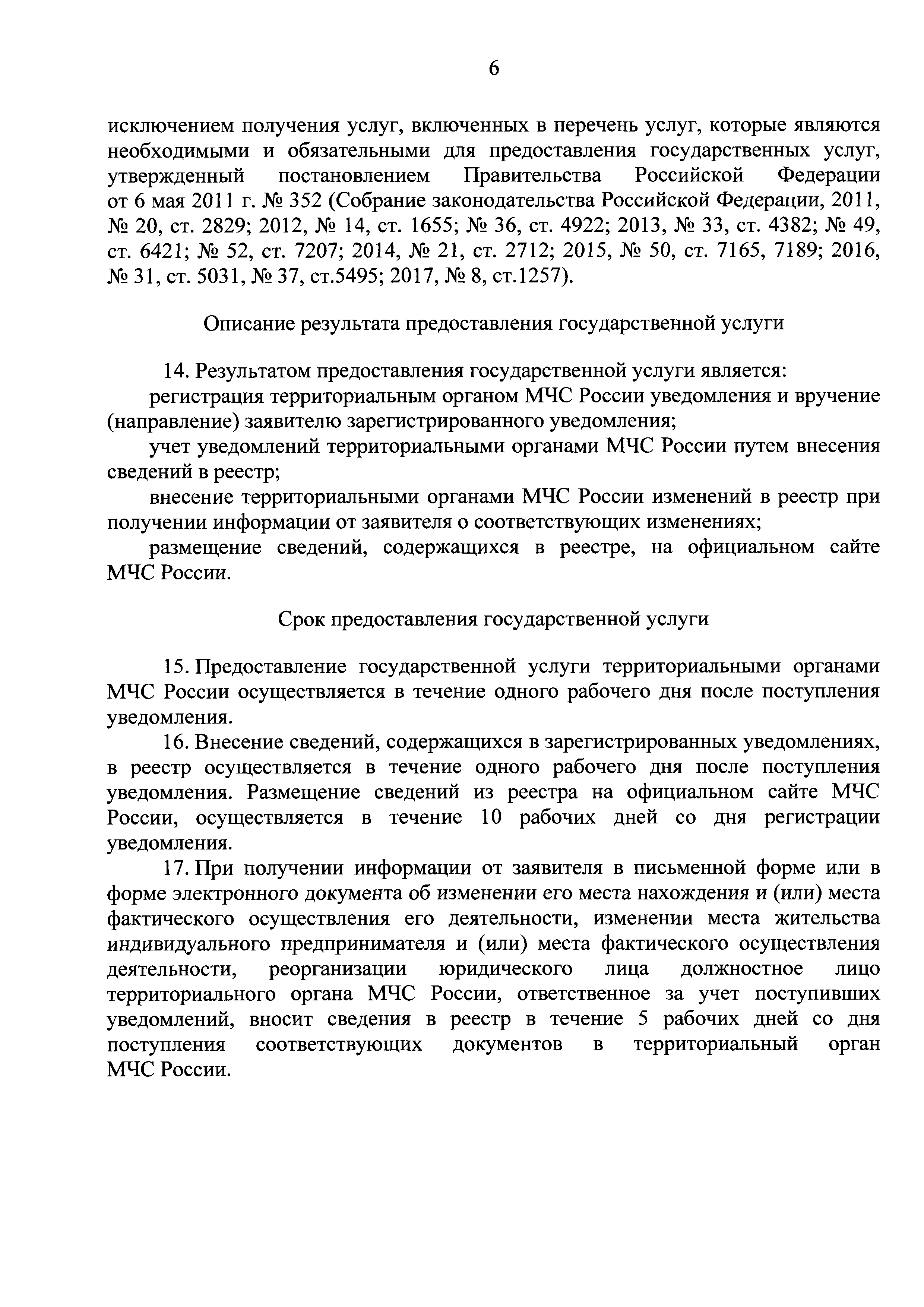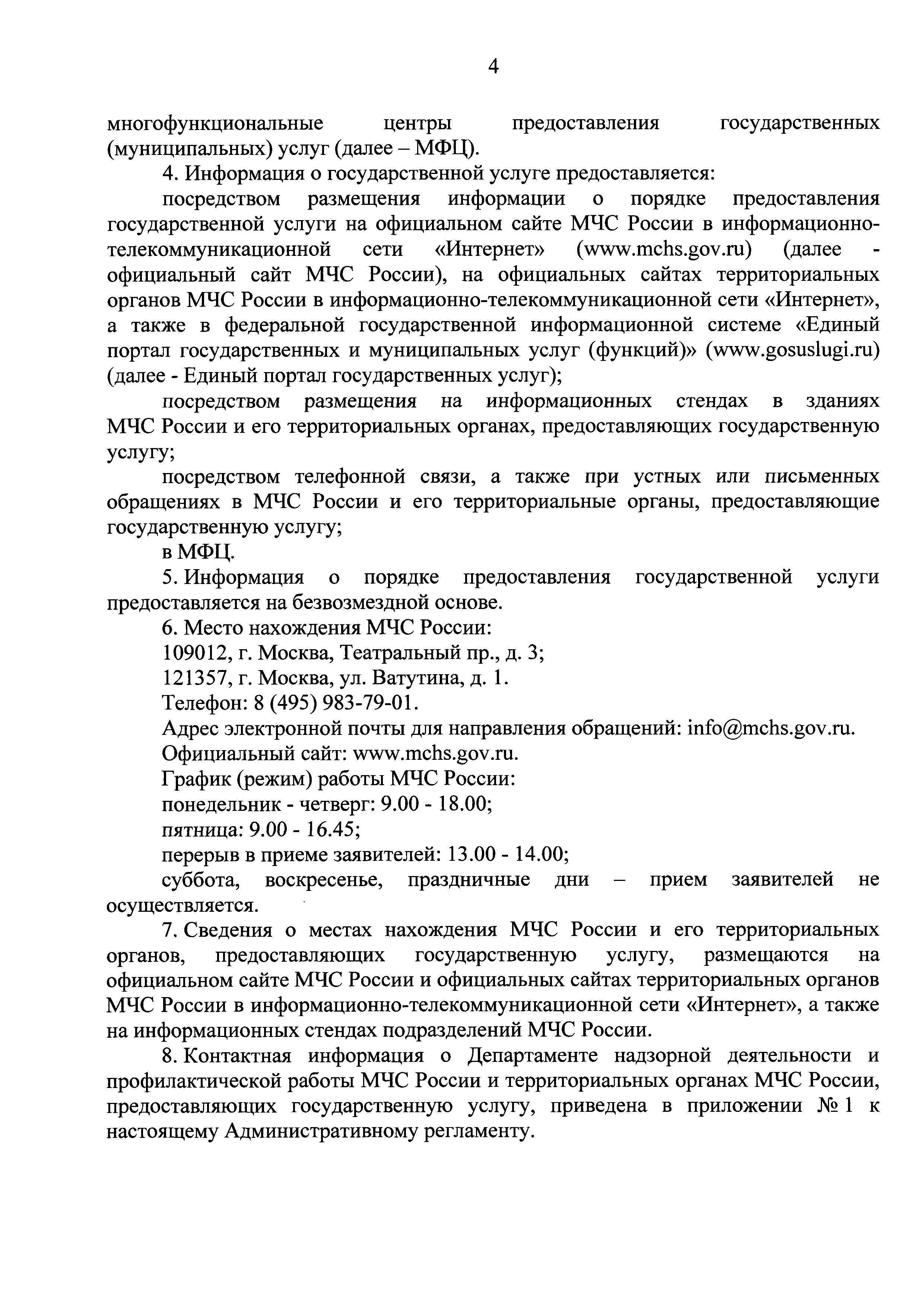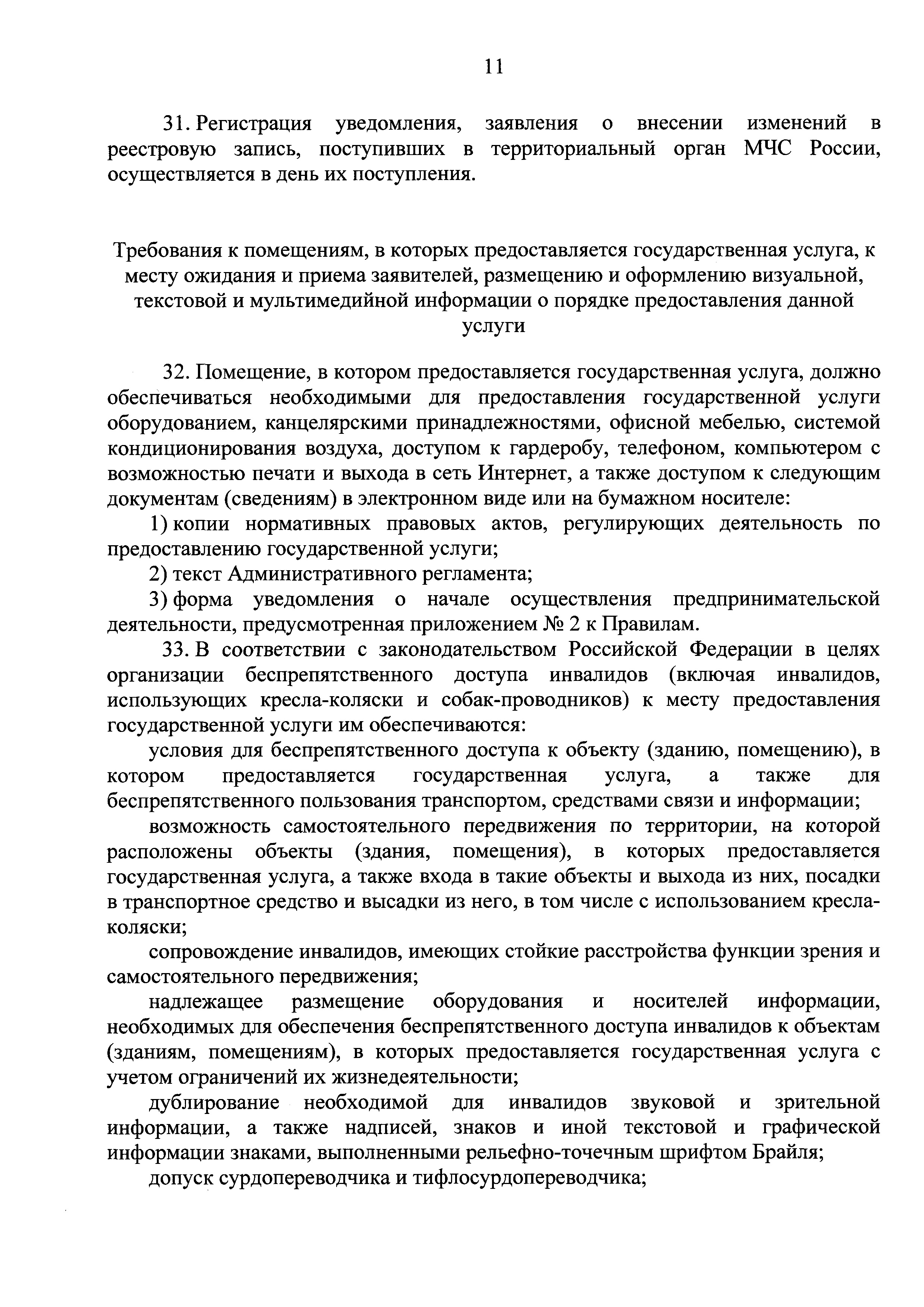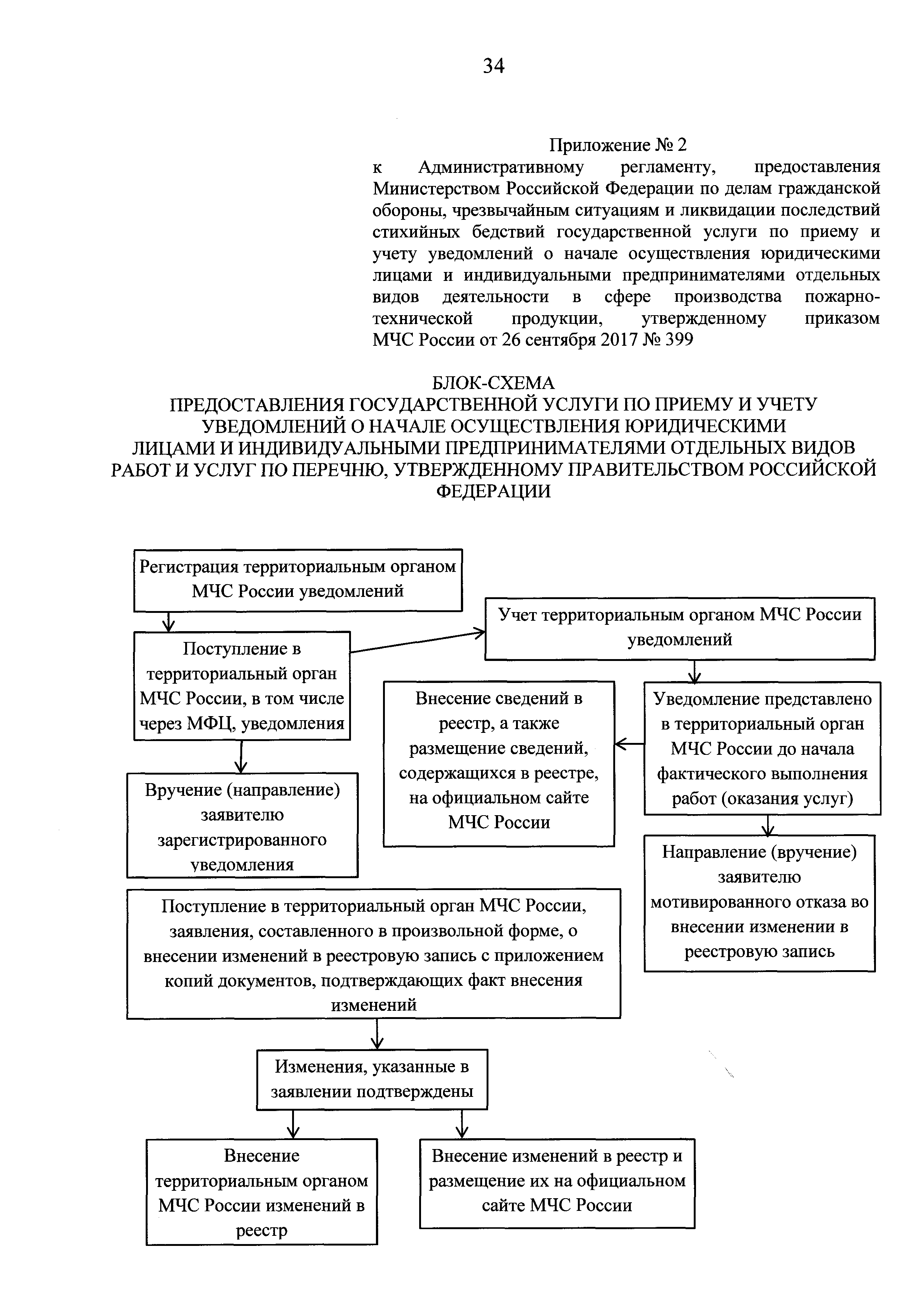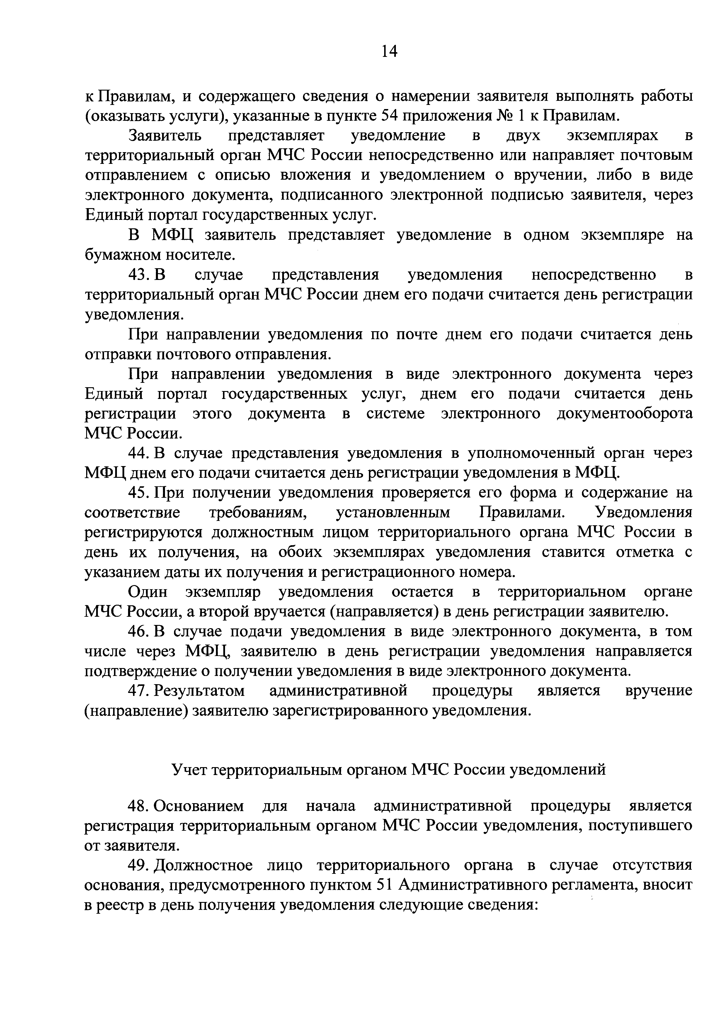 Административный регламент предоставления Министерством Российской Федерации по делам гражданской обороны, чрезвычайным ситуациям и ликвидации последствий стихийных бедствий государственной услуги по приему и учету уведомлений о начале осуществления юридическими лицами и индивидуальными предпринимателями отдельных видов деятельности в сфере производства пожарно-технической продукции| Статус: | действует | | Название рус.: | Административный регламент предоставления Министерством Российской Федерации по делам гражданской обороны, чрезвычайным ситуациям и ликвидации последствий стихийных бедствий государственной услуги по приему и учету уведомлений о начале осуществления юридическими лицами и индивидуальными предпринимателями отдельных видов деятельности в сфере производства пожарно-технической продукции | | Дата добавления в базу: | 01.01.2018 | | Дата актуализации: | 01.01.2021 | | Дата введения: | 31.10.2017 | | Оглавление: | I. Общие положения II. Стандарт предоставления государственной услуги III. Состав, последовательность и сроки выполнения административных процедур (действий), требования к порядку их выполнения, в том числе особенности выполнения административных процедур (действий) в электронной форме IV. Формы контроля за предоставлением государственной услуги V. Досудебный (внесудебный) порядок обжалования решений и действий (бездействия) МЧС России, должностных лиц МЧС России Приложение № 1. Контактная информация подразделений МЧС России, предоставляющих государственную услугу Приложение № 2. Блок-схема предоставления государственной услуги по приему и учету уведомлений о начале осуществления юридическими лицами и индивидуальными предпринимателями отдельных видов работ и услуг по перечню, утвержденному Правительством Российской Федерации | | Утверждён: | 26.09.2017 МЧС России (Russian Federation MChS 399)
