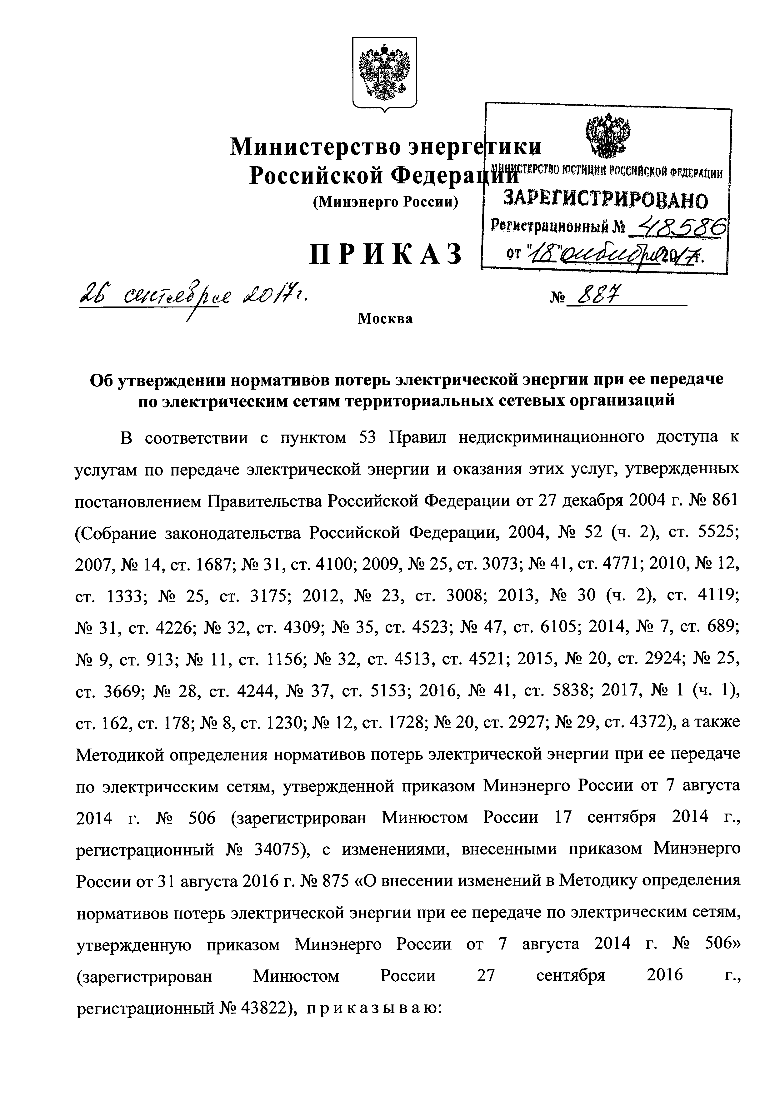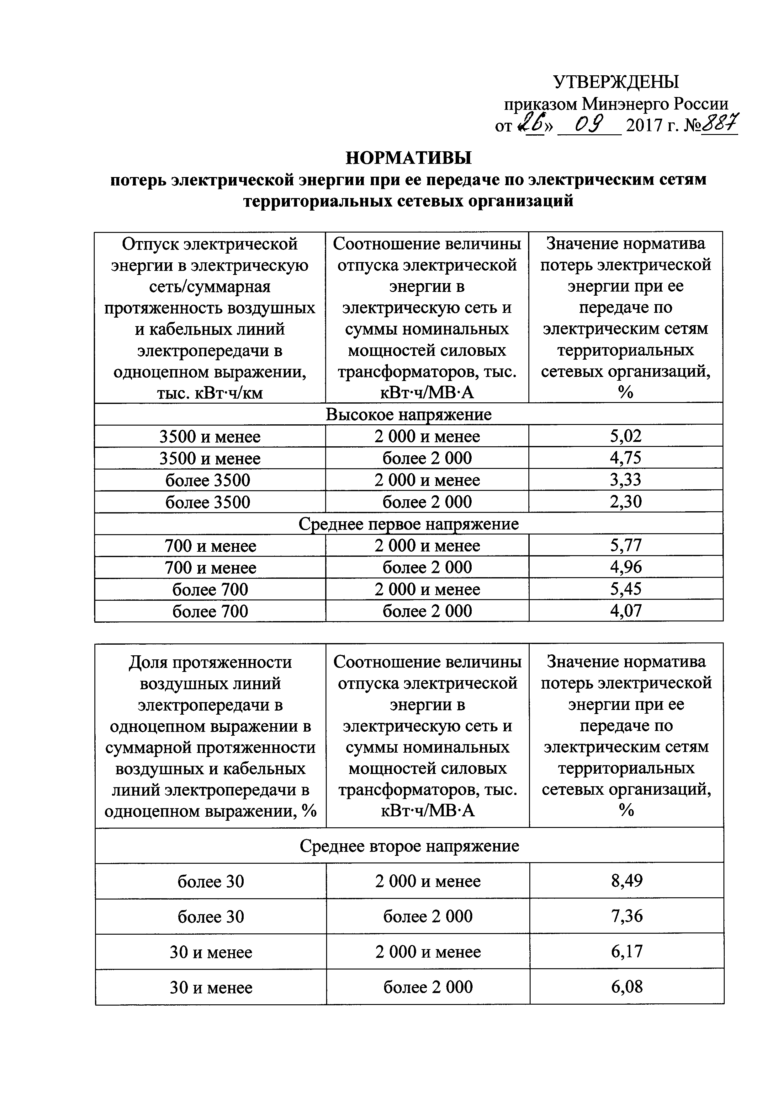 Нормативы потерь электрической энергии при ее передаче по электрическим сетям территориальных сетевых организаций| Статус: | действует | | Название рус.: | Нормативы потерь электрической энергии при ее передаче по электрическим сетям территориальных сетевых организаций | | Дата добавления в базу: | 01.01.2018 | | Дата актуализации: | 01.01.2021 | | Дата введения: | 01.04.2018 | | Утверждён: | 26.09.2017 Министерство энергетики РФ (Russian Federation Ministry of Energy 887)