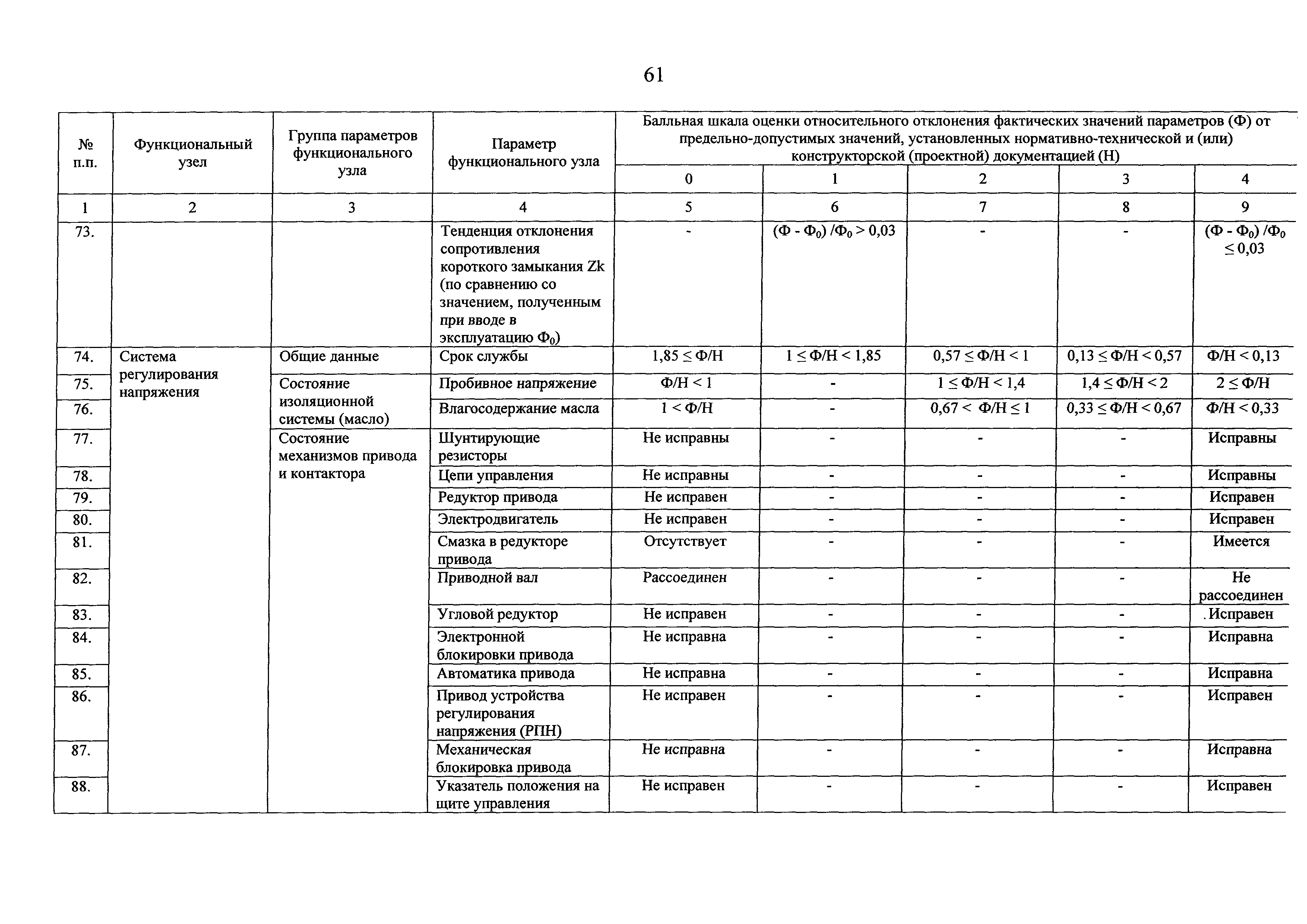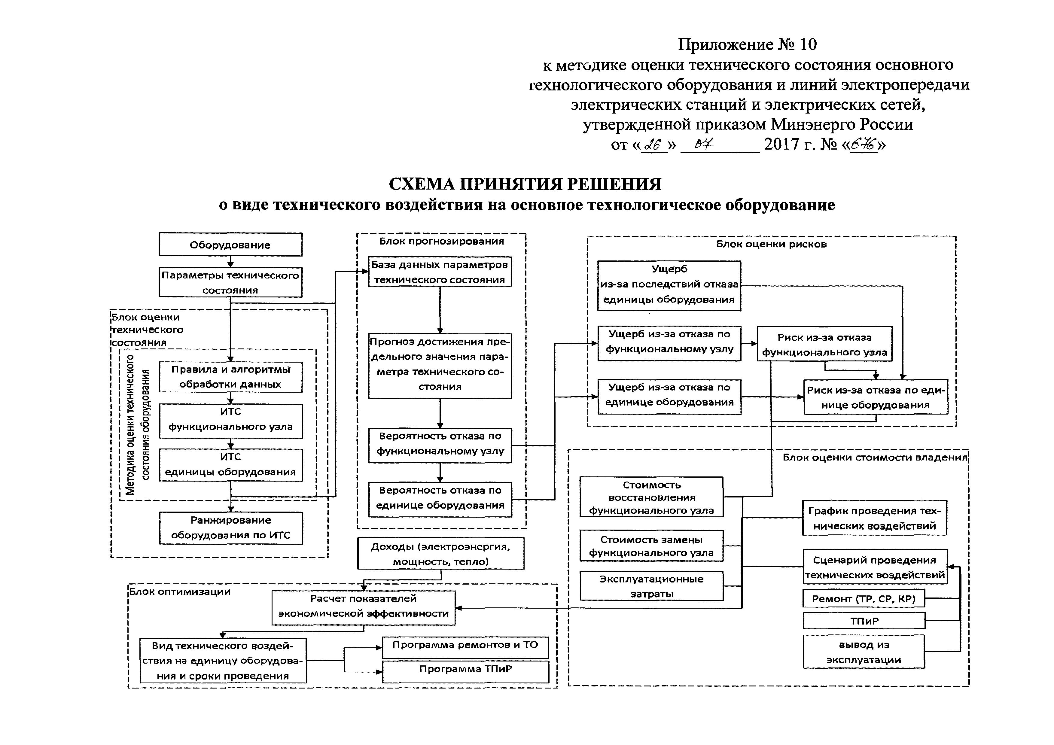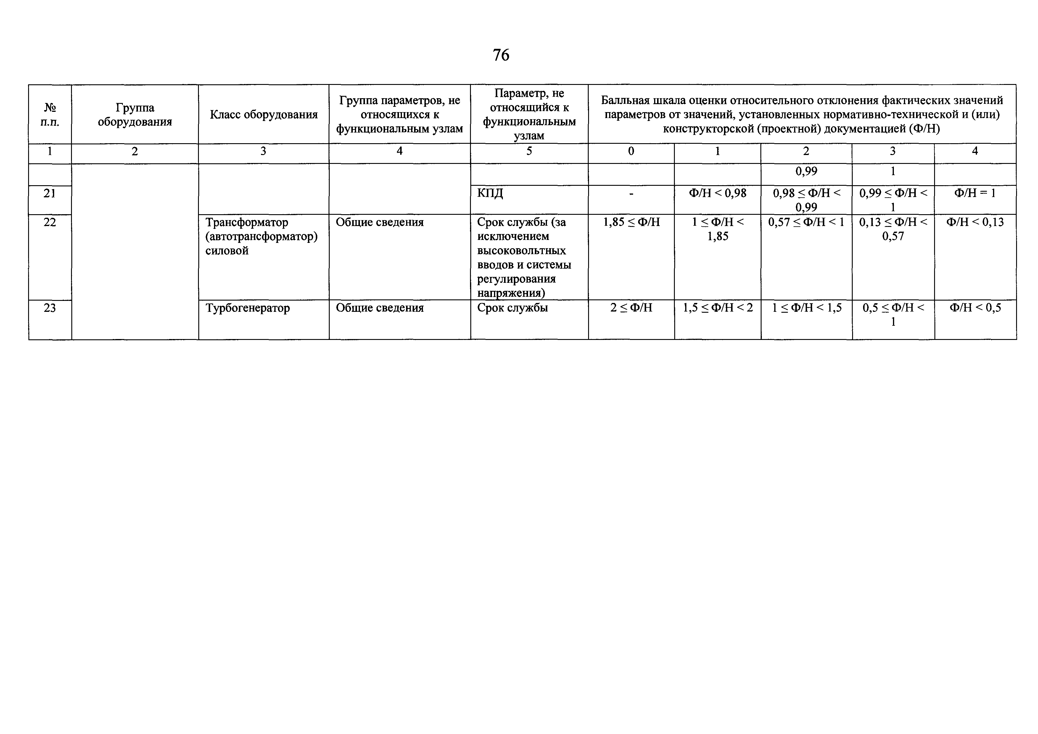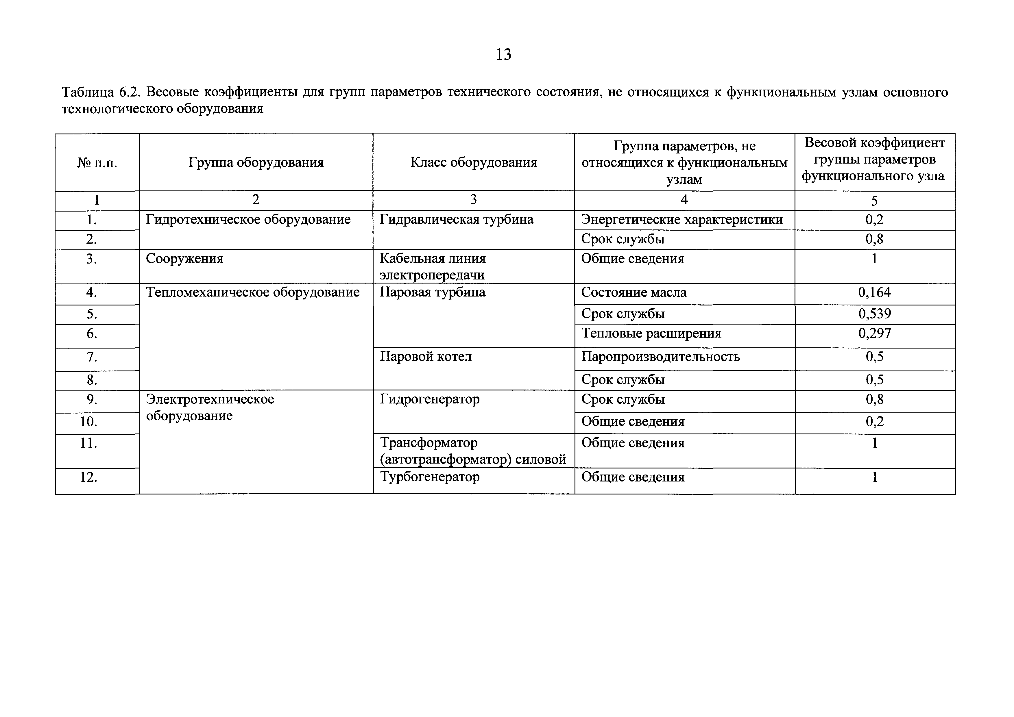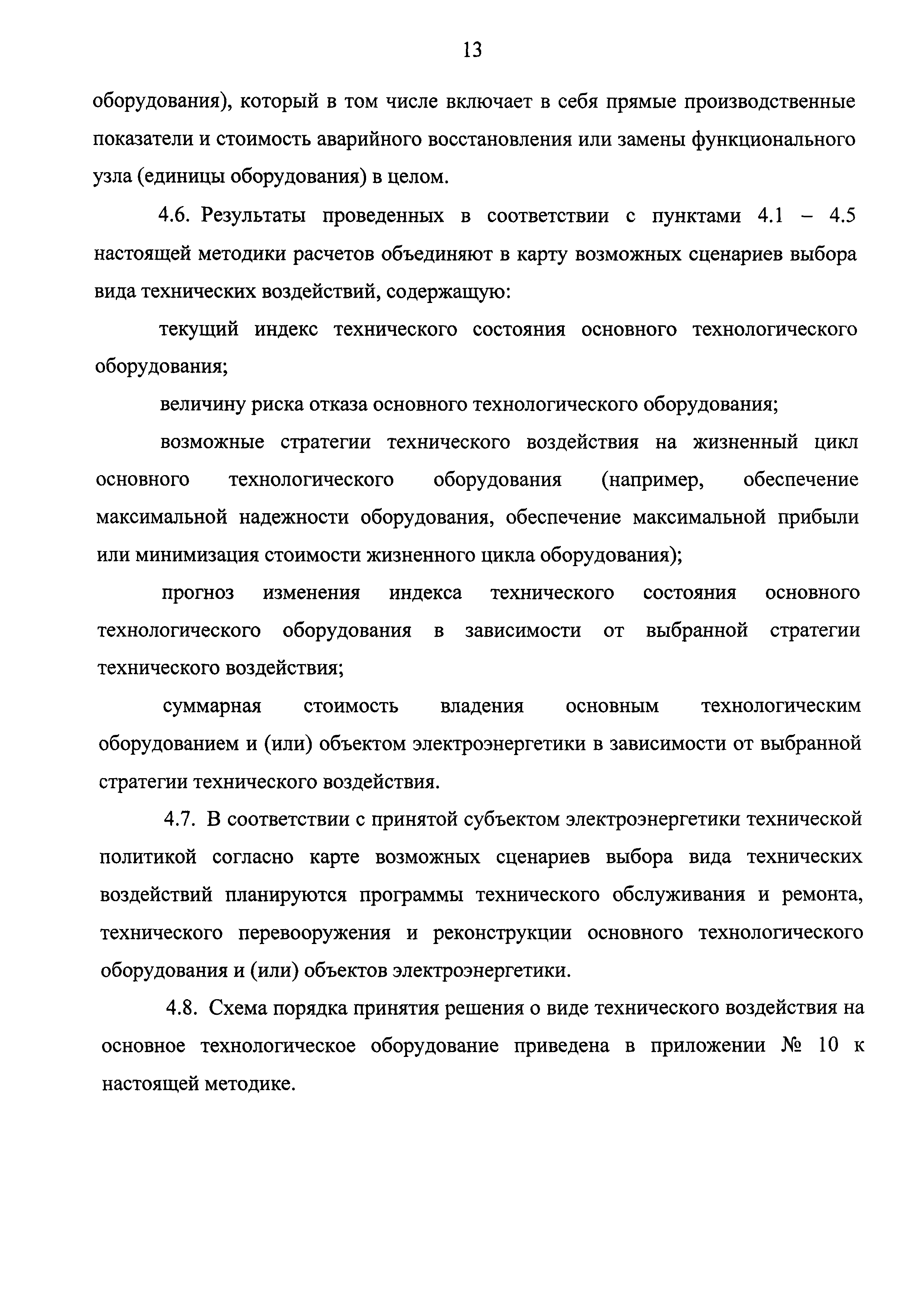 | Оглавление: | I Общие положения II Правила оценки технического состояния основного технологического оборудования III Порядок оценки технического состояния основного технологического оборудования IV Определение оптимального вида, состава и стоимости технического воздействия на оборудование Приложение 1. Термины и определения, употребляемые в методике оценки технического состояния основного технологического оборудования и линий электропередачи электрических станций и электрических сетей Приложение 2. Состав групп оборудования и сооружений объектов электроэнергетики с детализацией функциональных узлов и параметров Приложение 3. Схема порядка оценки технического состояния оборудования Приложение 4. Единицы измерения и возможные фактические значения параметров технического состояния функциональных узлов и общих параметров технического состояния, не относящихся к функциональным узлам основного технологического оборудования Приложение 5. Балльная шкала оценки параметров технического состояния функциональных узлов и общих параметров технического состояния, не относящихся к функциональным узлам основного технологического оборудования Приложение 6. Весовые коэффициенты для групп параметров технического состояния функциональных узлов и групп параметров технического состояния, не относящихся к функциональным узлам основного технологического оборудования Приложение 7. Перечень функциональных узлов основного технологического оборудования и их параметров, влияющих на снижение индекса технического состояния основного технологического оборудования Приложение 8. Весовые коэффициенты для функциональных узлов основного технологического оборудования и обобщенного узла, содержащего общие параметры технического состояния, не относящиеся к функциональным узлам основного технологического оборудования Приложение 9. Определение приведенной мощности объектов электроэнергетики Приложение 10. Схема принятия решения о виде технического воздействия на основное технологическое оборудование |