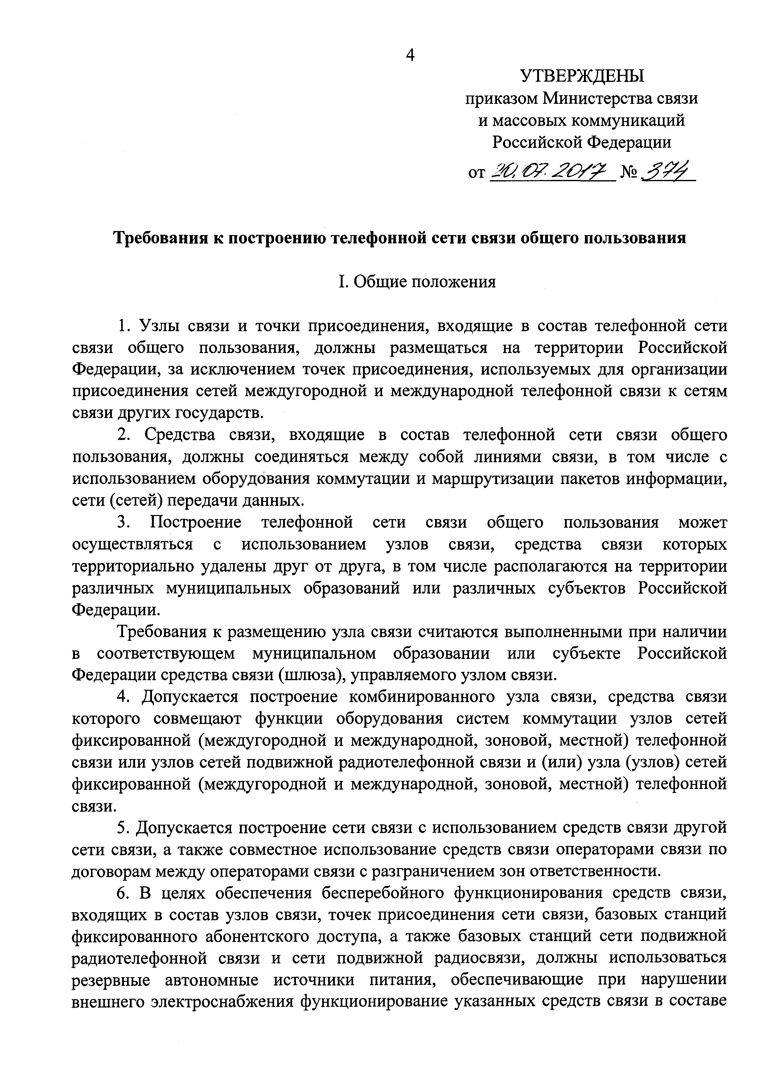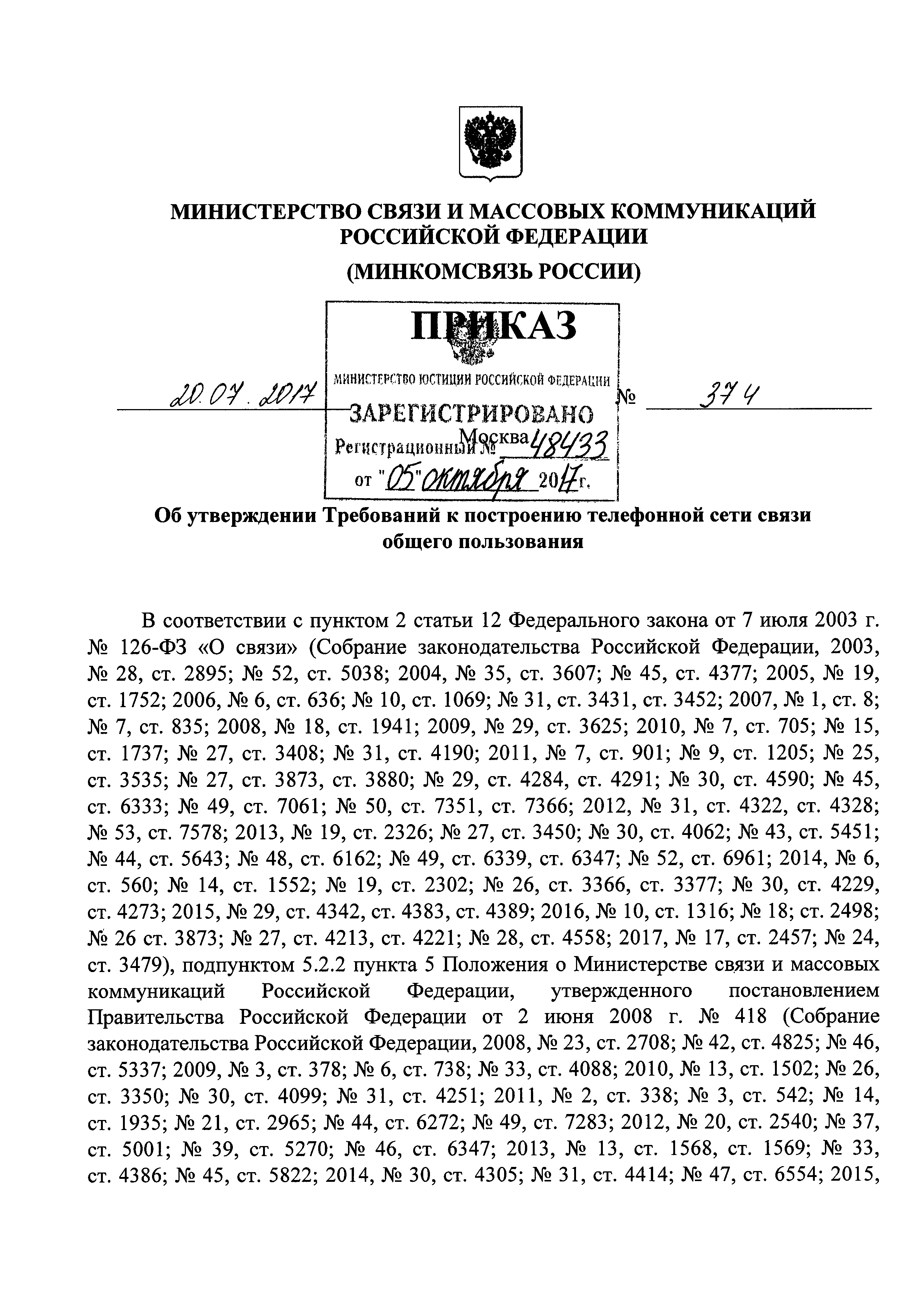 | Утверждён: | 20.07.2017 Министерство связи и массовых коммуникаций РФ (374)