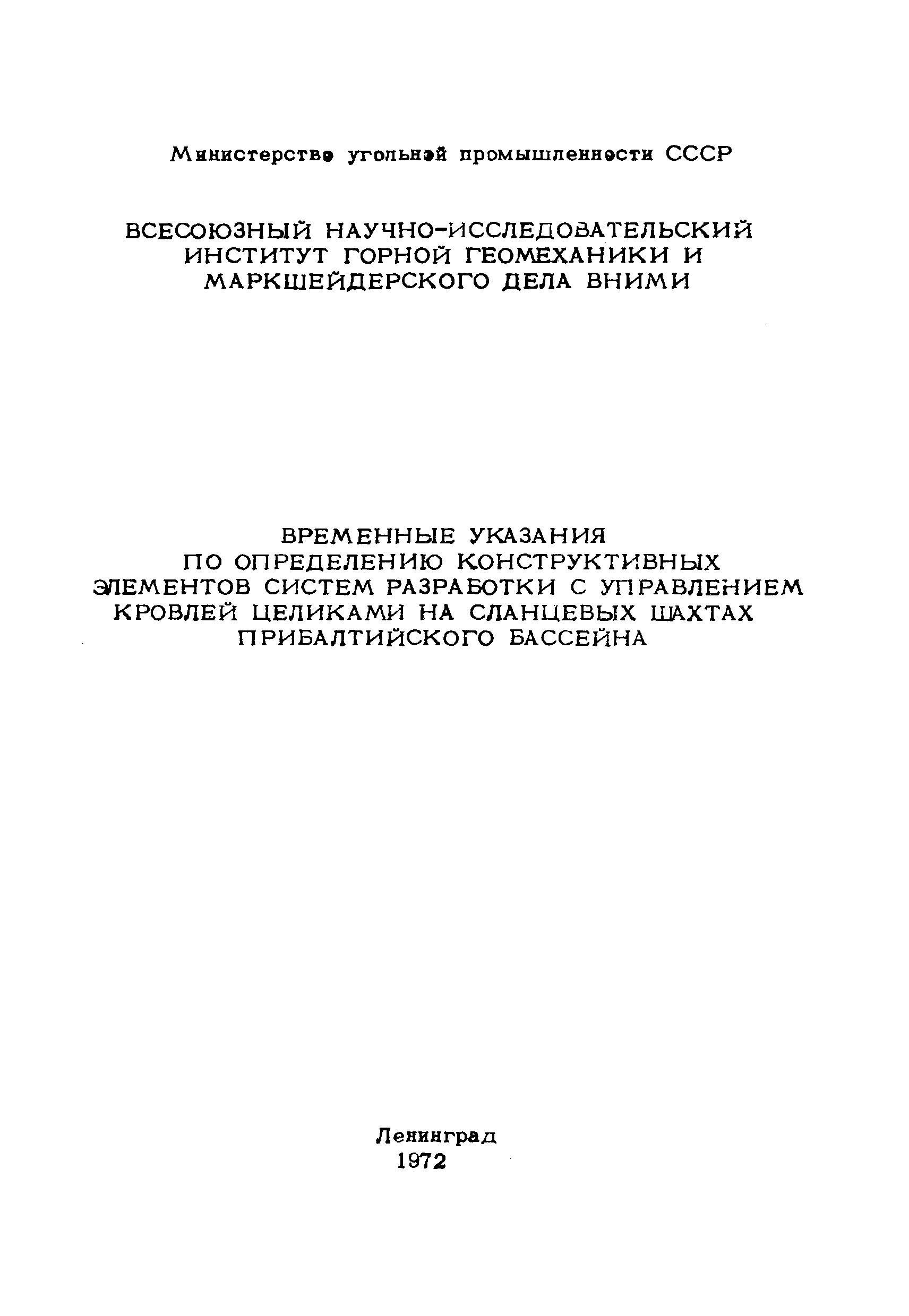 | Название рус.: | Временные указания по определению конструктивных элементов систем разработки с управлением кровлей целиками на сланцевых шахтах Прибалтийского бассейна |