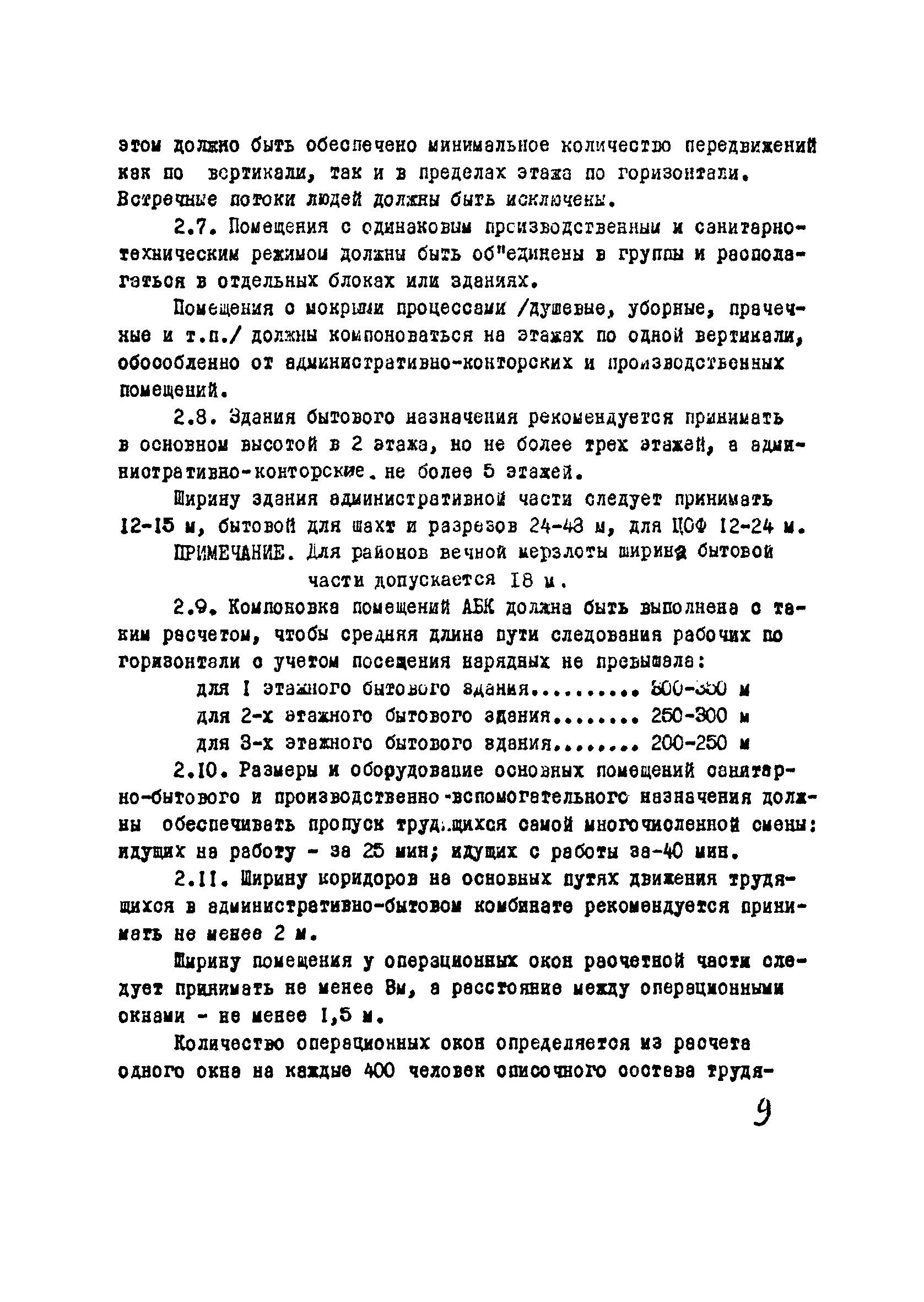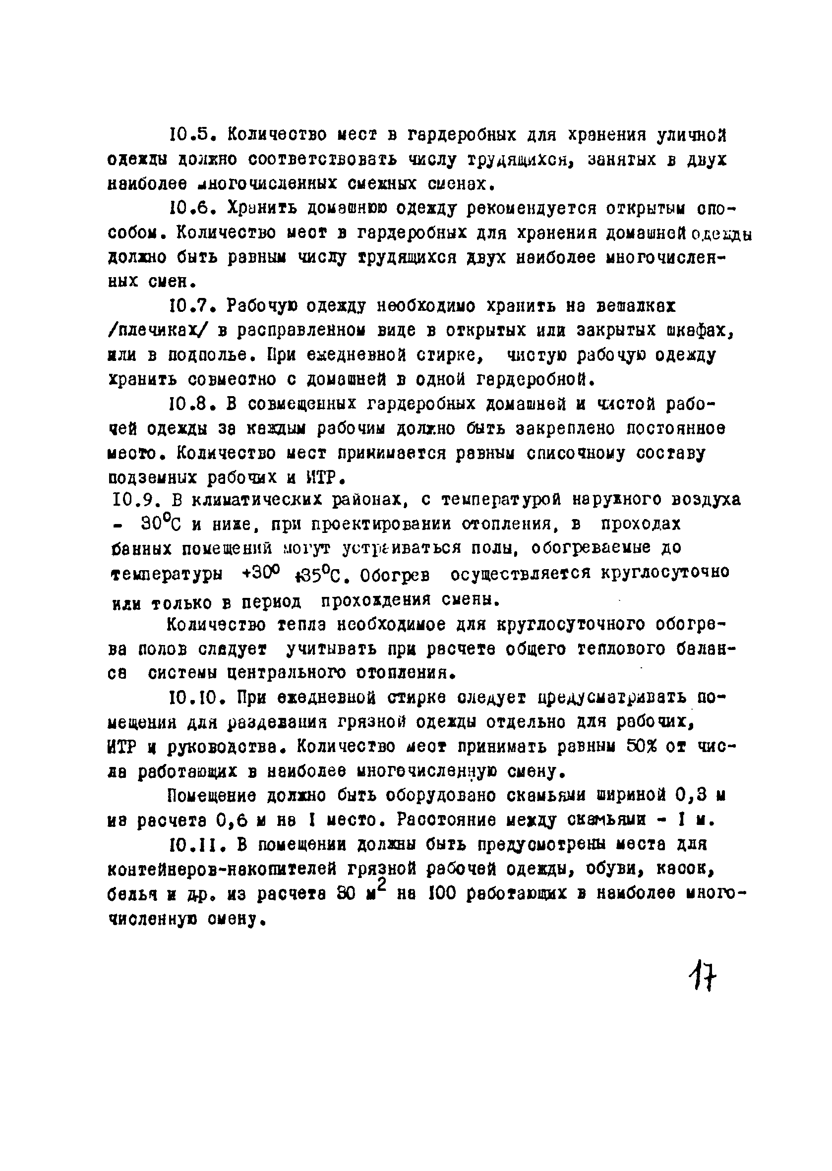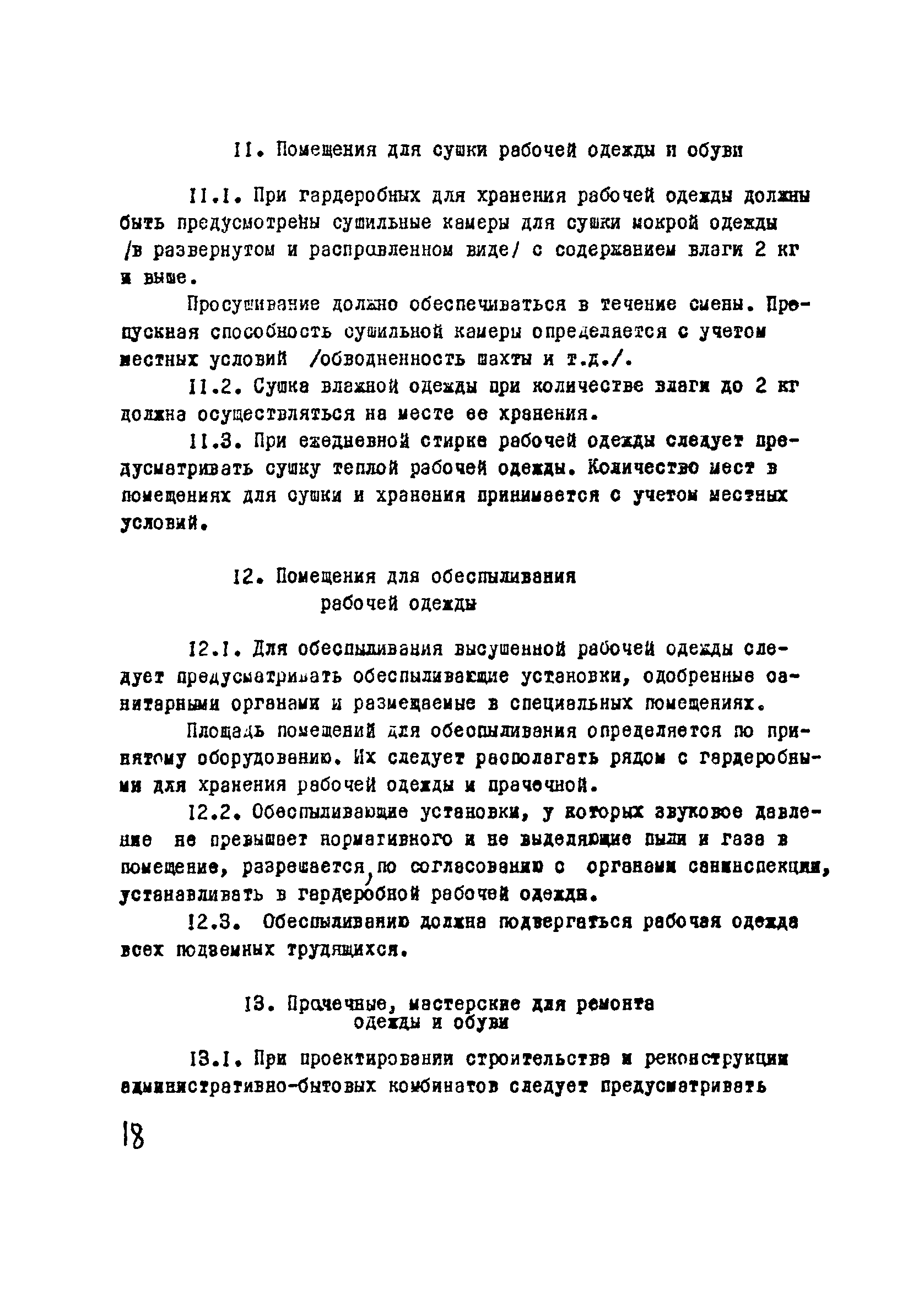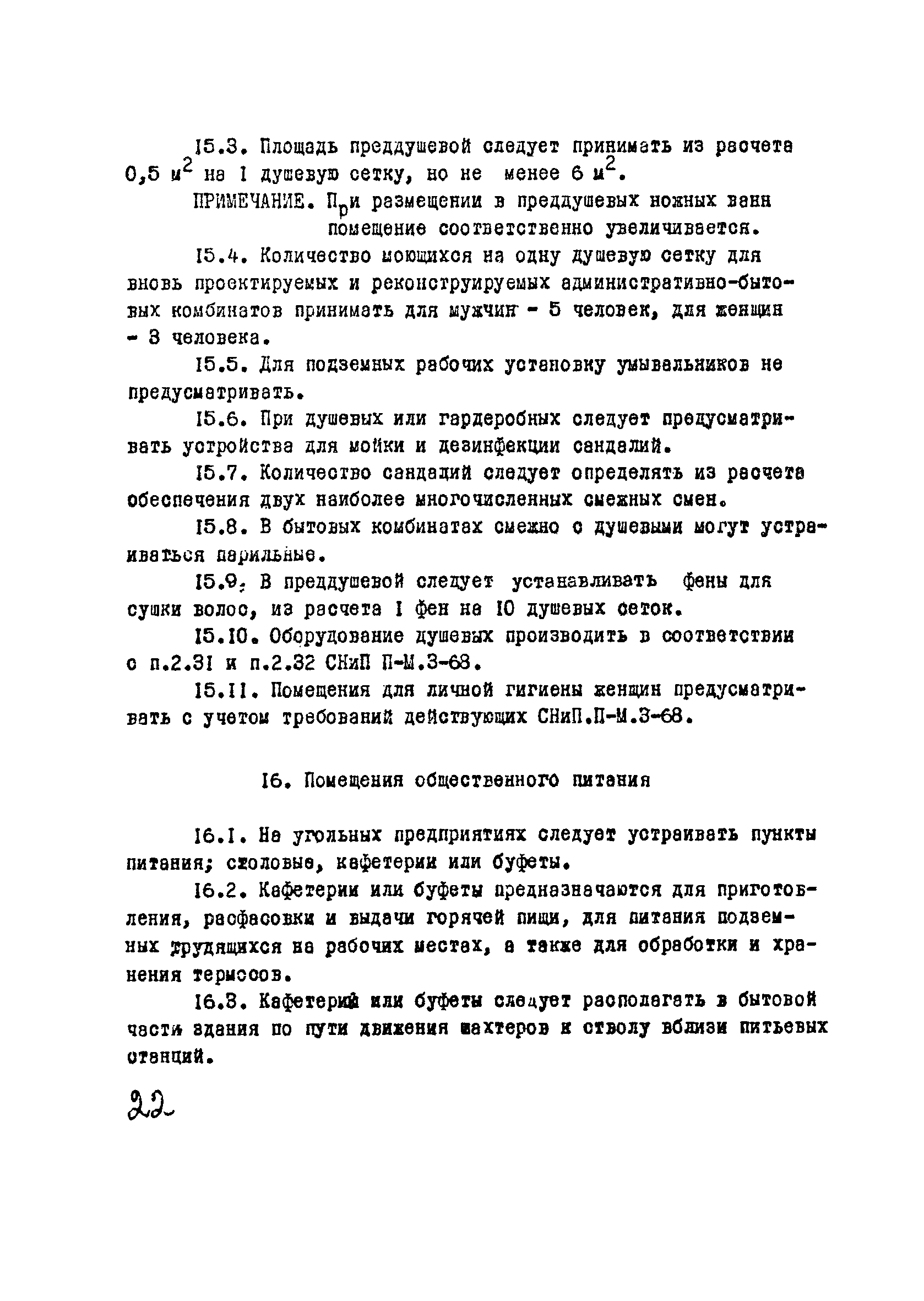 | Оглавление: | I Область применения II Общие требования, предъявляемые к административно-бытовым зданиям и помещениям 1 Назначение 2 Основные принципы объемно-планировочной компоновки 3 Пропускная способность 4 Состав помещений III Административно-конторские помещения 5 Нарядные 6 Залы для собраний 7 Конторы 8 Помещения для работы общественных организаций 9 Учебные пункты IV Помещения санитарно-бытового обслуживания 10 Гардеробные для хранения уличной, домашней и рабочей одежды 11 Помещения для сушки рабочей одежды и обуви 12 Помещения для обеспыливания рабочей одежды 13 Прачечные, мастерские для ремонта одежды и обуви 14 Чистка и мойка обуви 15 Душевые и умывальные 16 Помещения общественного питания 17 Питьевые станции 18 Парикмахерские 19 Курительные 20 Помещения для обогревания работающих V Производственно-вспомогательные помещения 21 Ламповые 22 Респираторные 23 Отделение контрольно—измерительной аппаратуры 24 Службы вспомогательной горноспасательной команды /ВГК/ 25 Телефонные станции 26 Диспетчерские пункты VI Помещения санитарно-медицинского обслуживания 27 Здравпункты 28 Ингалятории 29 Фотарии VII Помещения вспомогательного обслуживания 30 Кладовые для хозяйственного инвентаря 31 Технические помещения 32 Уборка помещений VIII Помещения и устройства для культурного обслуживания 33 Кабинеты политического просвещения 34 Площадки для спортивных игр и гимнастических упражнений IX Санитарно-техническая часть Приложение 1. Вес основных вещей, поступающих в прачечную Приложение 2. Режим ежедневной стирки одежды, загрязненной антрацитовой пылью Приложение 3. Режим ежедневной стирки рабочей одежды, загрязненной каменноугольной пылью Приложение 4. Режим стирки белья Приложение 5. Расчет потребности количества оборудования прачечных Приложение 6. Расчет потребного количества ингаляторных установок Приложение 7. Расчет потребного количества фотариев |