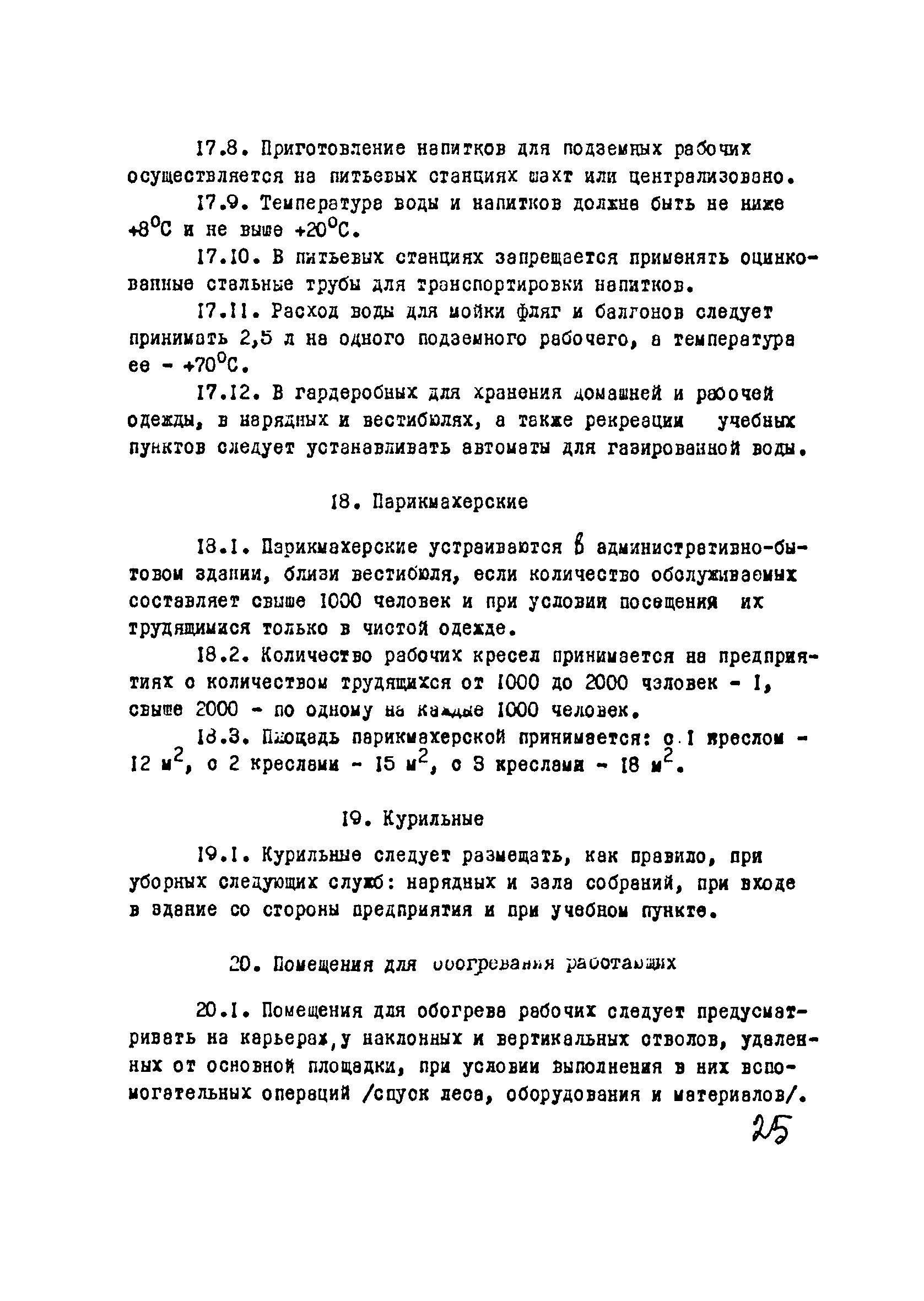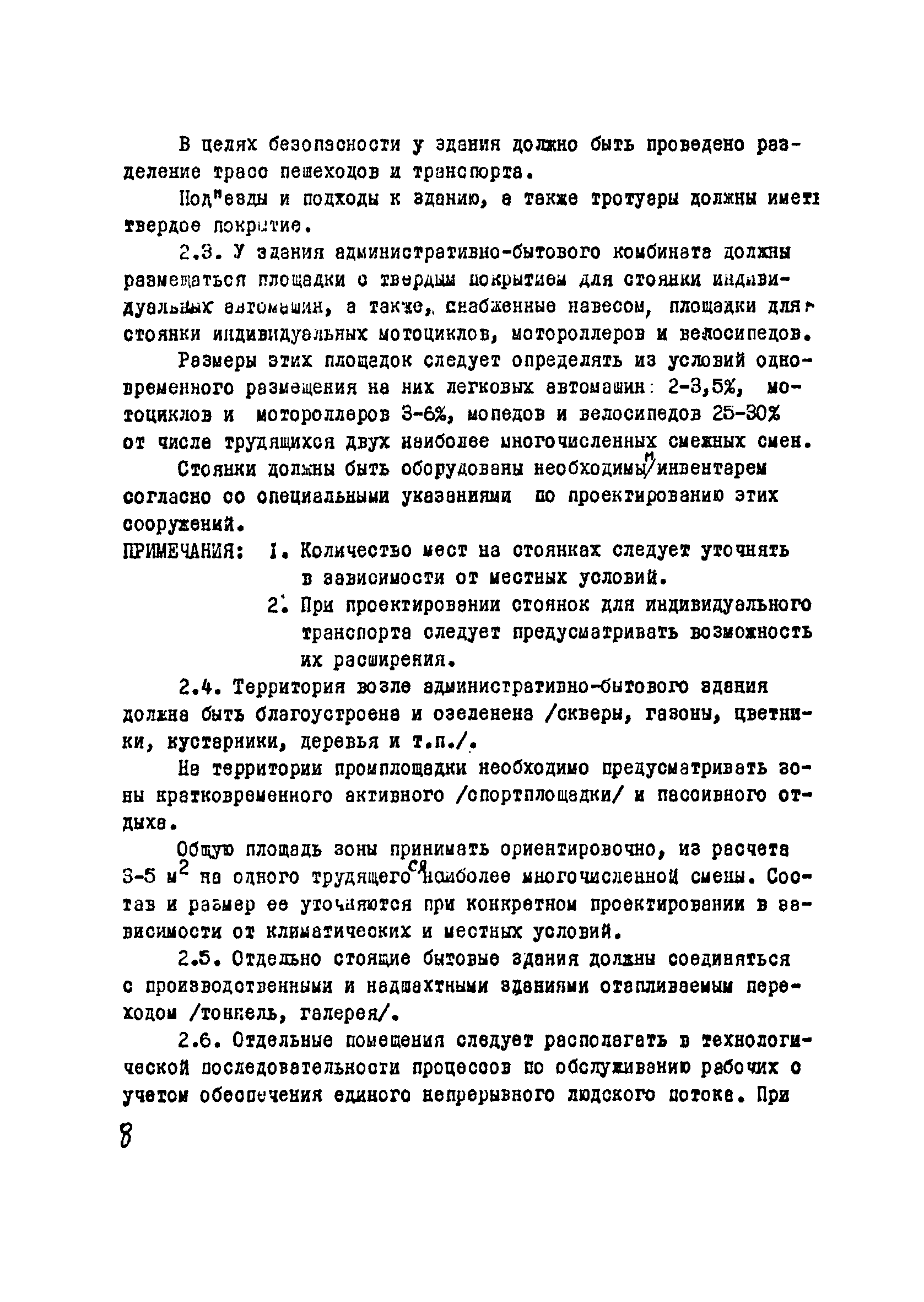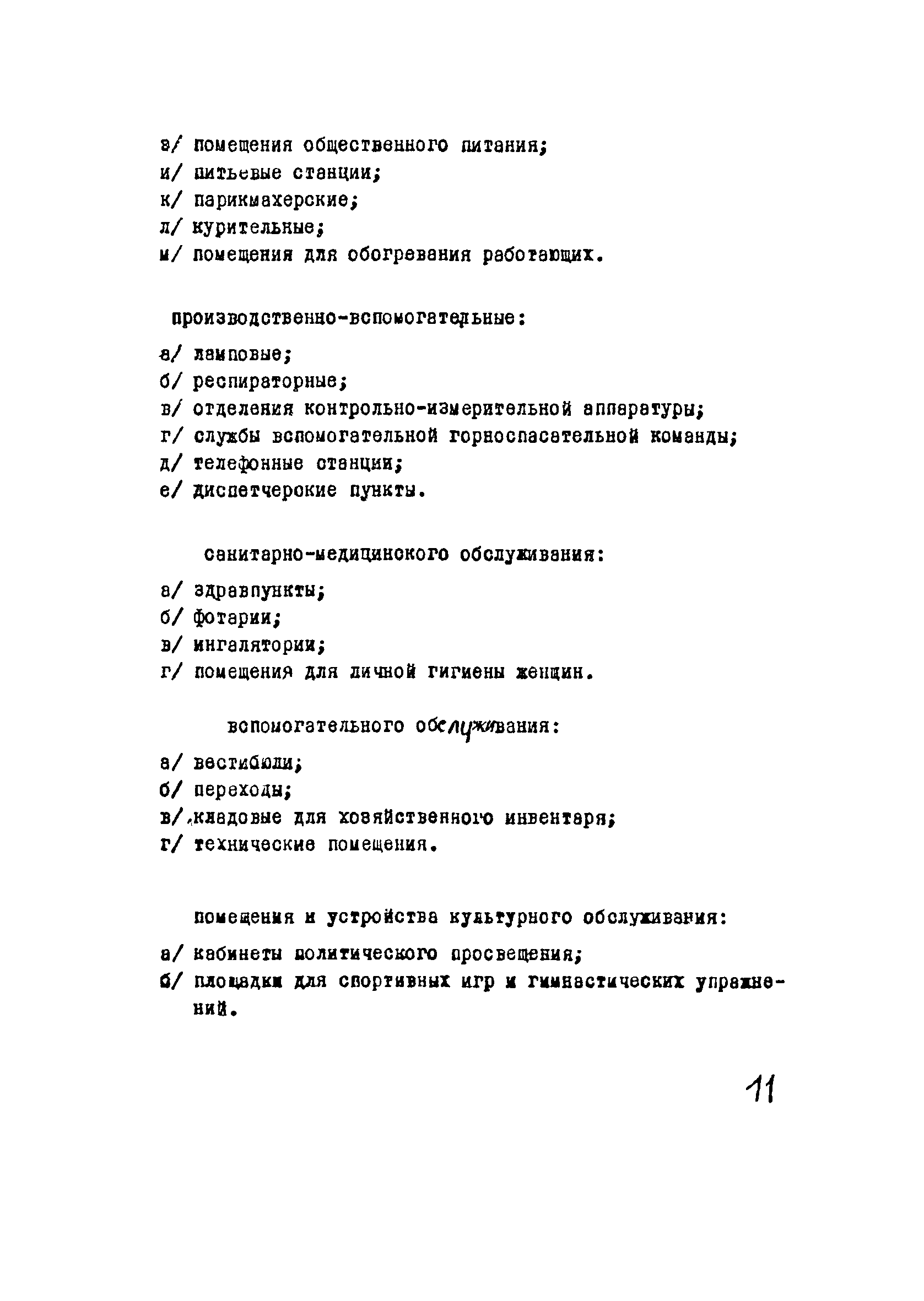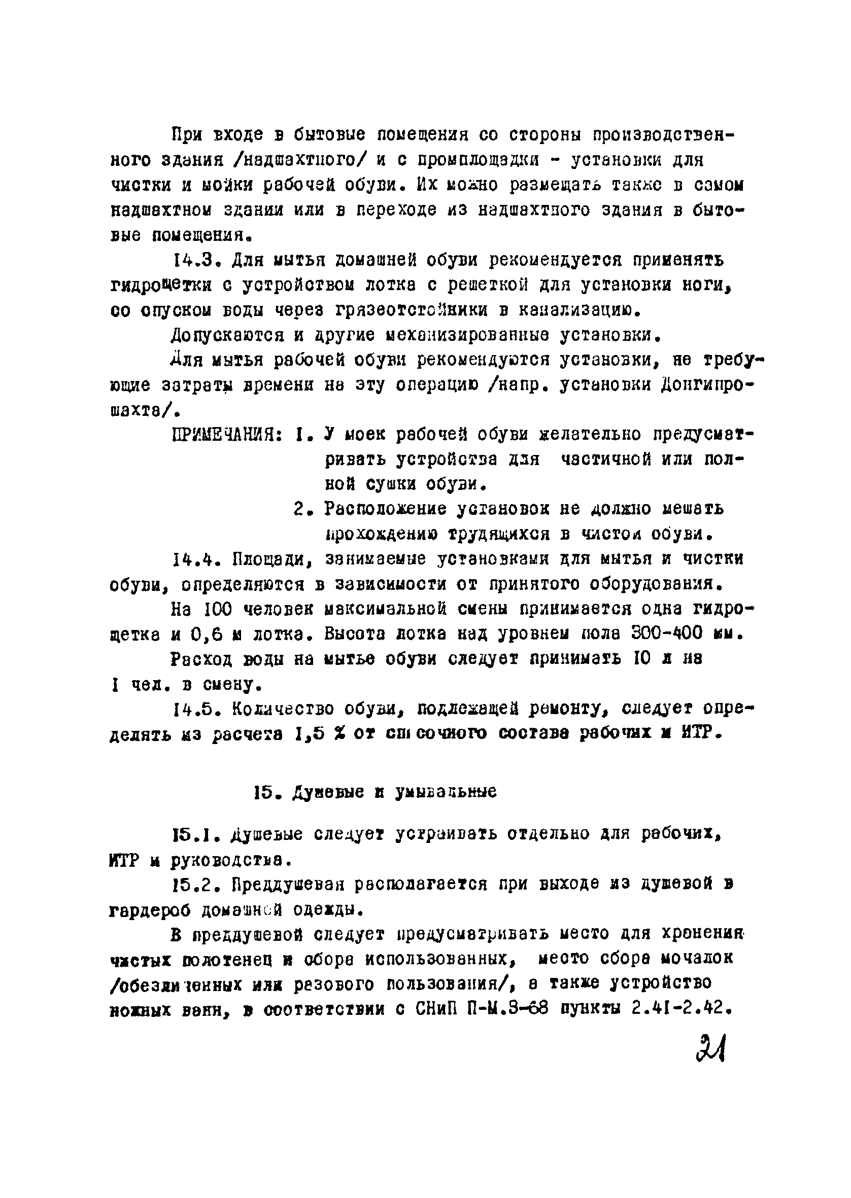 | Оглавление: | I Область применения II Общие требования, предъявляемые к административно-бытовым зданиям и помещениям 1 Назначение 2 Основные принципы объемно-планировочной компоновки 3 Пропускная способность 4 Состав помещений III Административно-конторские помещения 5 Нарядные 6 Залы для собраний 7 Конторы 8 Помещения для работы общественных организаций 9 Учебные пункты IV Помещения санитарно-бытового обслуживания 10 Гардеробные для хранения уличной, домашней и рабочей одежды 11 Помещения для сушки рабочей одежды и обуви 12 Помещения для обеспыливания рабочей одежды 13 Прачечные, мастерские для ремонта одежды и обуви 14 Чистка и мойка обуви 15 Душевые и умывальные 16 Помещения общественного питания 17 Питьевые станции 18 Парикмахерские 19 Курительные 20 Помещения для обогревания работающих V Производственно-вспомогательные помещения 21 Ламповые 22 Респираторные 23 Отделение контрольно—измерительной аппаратуры 24 Службы вспомогательной горноспасательной команды /ВГК/ 25 Телефонные станции 26 Диспетчерские пункты VI Помещения санитарно-медицинского обслуживания 27 Здравпункты 28 Ингалятории 29 Фотарии VII Помещения вспомогательного обслуживания 30 Кладовые для хозяйственного инвентаря 31 Технические помещения 32 Уборка помещений VIII Помещения и устройства для культурного обслуживания 33 Кабинеты политического просвещения 34 Площадки для спортивных игр и гимнастических упражнений IX Санитарно-техническая часть Приложение 1. Вес основных вещей, поступающих в прачечную Приложение 2. Режим ежедневной стирки одежды, загрязненной антрацитовой пылью Приложение 3. Режим ежедневной стирки рабочей одежды, загрязненной каменноугольной пылью Приложение 4. Режим стирки белья Приложение 5. Расчет потребности количества оборудования прачечных Приложение 6. Расчет потребного количества ингаляторных установок Приложение 7. Расчет потребного количества фотариев |