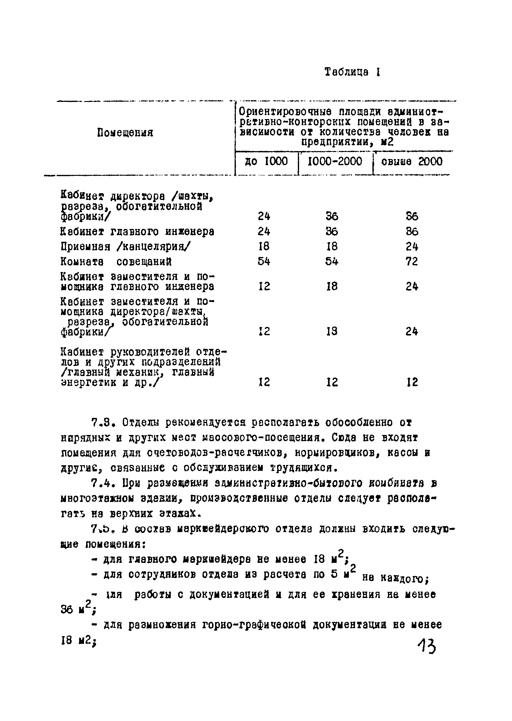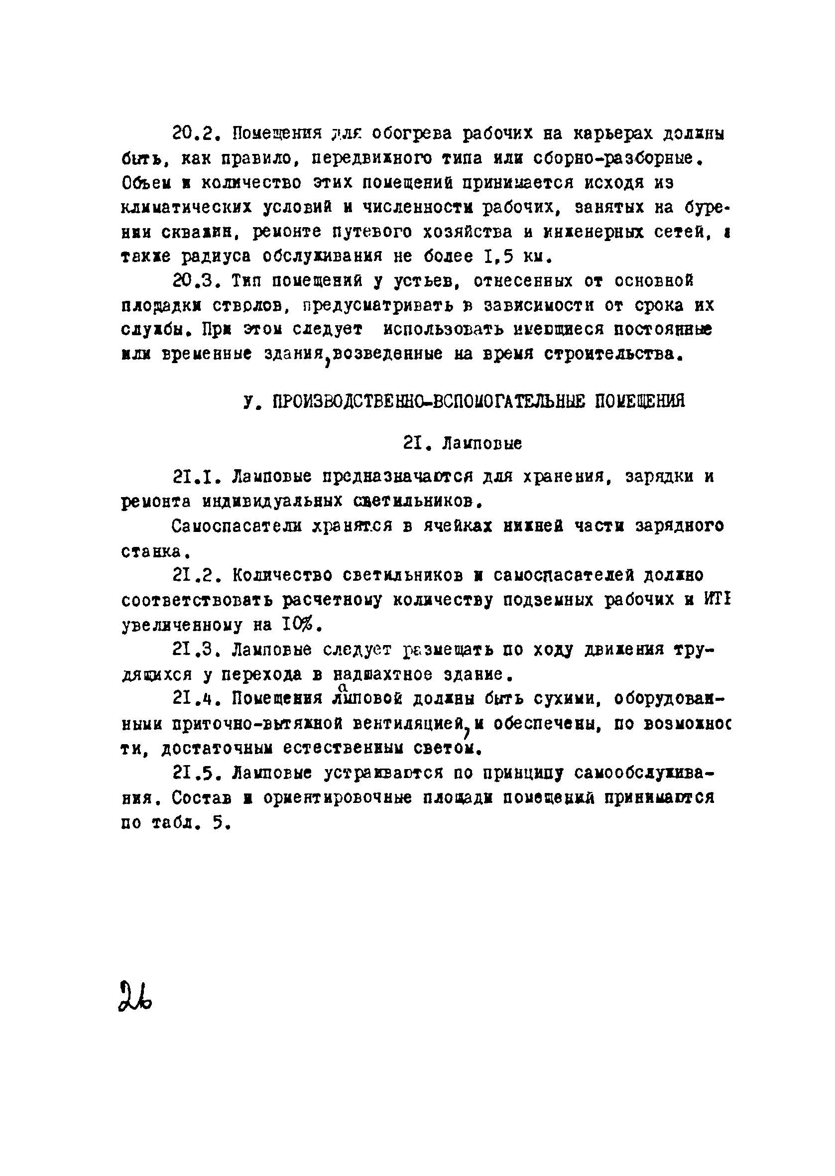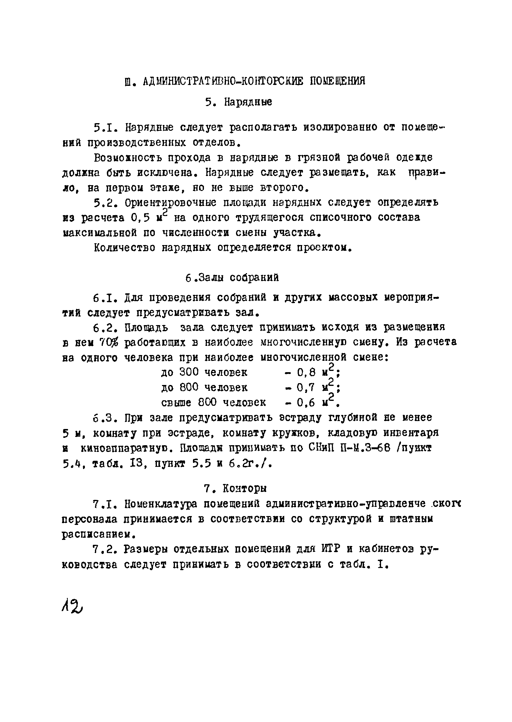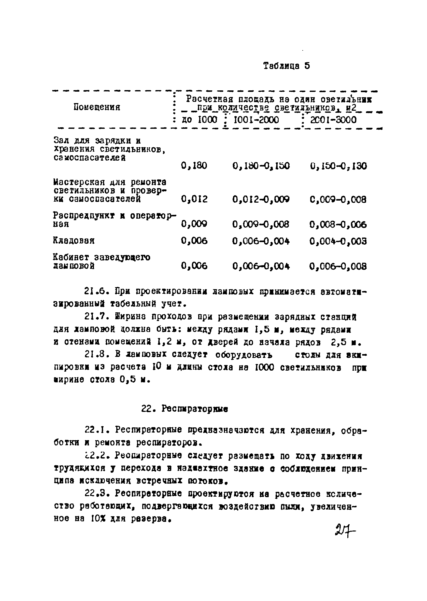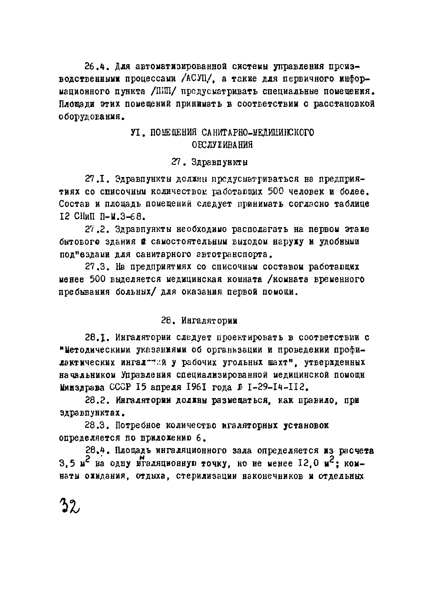 | Оглавление: | I Область применения II Общие требования, предъявляемые к административно-бытовым зданиям и помещениям 1 Назначение 2 Основные принципы объемно-планировочной компоновки 3 Пропускная способность 4 Состав помещений III Административно-конторские помещения 5 Нарядные 6 Залы для собраний 7 Конторы 8 Помещения для работы общественных организаций 9 Учебные пункты IV Помещения санитарно-бытового обслуживания 10 Гардеробные для хранения уличной, домашней и рабочей одежды 11 Помещения для сушки рабочей одежды и обуви 12 Помещения для обеспыливания рабочей одежды 13 Прачечные, мастерские для ремонта одежды и обуви 14 Чистка и мойка обуви 15 Душевые и умывальные 16 Помещения общественного питания 17 Питьевые станции 18 Парикмахерские 19 Курительные 20 Помещения для обогревания работающих V Производственно-вспомогательные помещения 21 Ламповые 22 Респираторные 23 Отделение контрольно—измерительной аппаратуры 24 Службы вспомогательной горноспасательной команды /ВГК/ 25 Телефонные станции 26 Диспетчерские пункты VI Помещения санитарно-медицинского обслуживания 27 Здравпункты 28 Ингалятории 29 Фотарии VII Помещения вспомогательного обслуживания 30 Кладовые для хозяйственного инвентаря 31 Технические помещения 32 Уборка помещений VIII Помещения и устройства для культурного обслуживания 33 Кабинеты политического просвещения 34 Площадки для спортивных игр и гимнастических упражнений IX Санитарно-техническая часть Приложение 1. Вес основных вещей, поступающих в прачечную Приложение 2. Режим ежедневной стирки одежды, загрязненной антрацитовой пылью Приложение 3. Режим ежедневной стирки рабочей одежды, загрязненной каменноугольной пылью Приложение 4. Режим стирки белья Приложение 5. Расчет потребности количества оборудования прачечных Приложение 6. Расчет потребного количества ингаляторных установок Приложение 7. Расчет потребного количества фотариев |