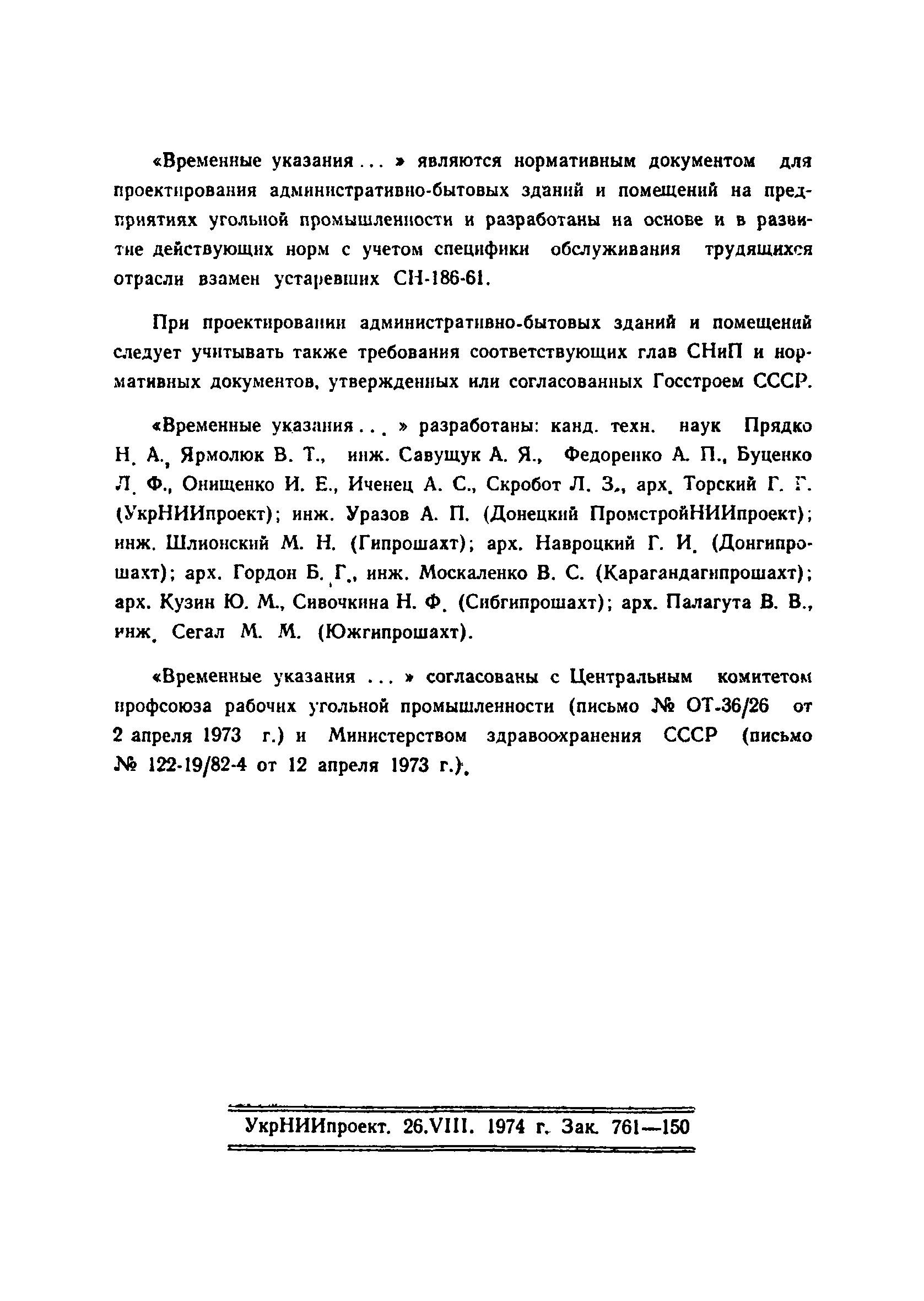 | Принят: | 12.04.1973 Министерство здравоохранения СССР (USSR Ministry of Health Care 122-19/82/4) 02.04.1973 ЦК профсоюза рабочих угольной промышленности СССР (ОТ-36/26) 04.04.1974 Госстрой СССР (АБ-1413-20/3)