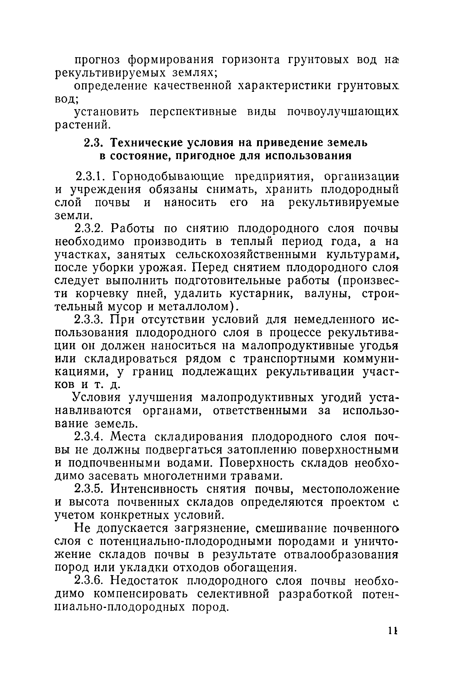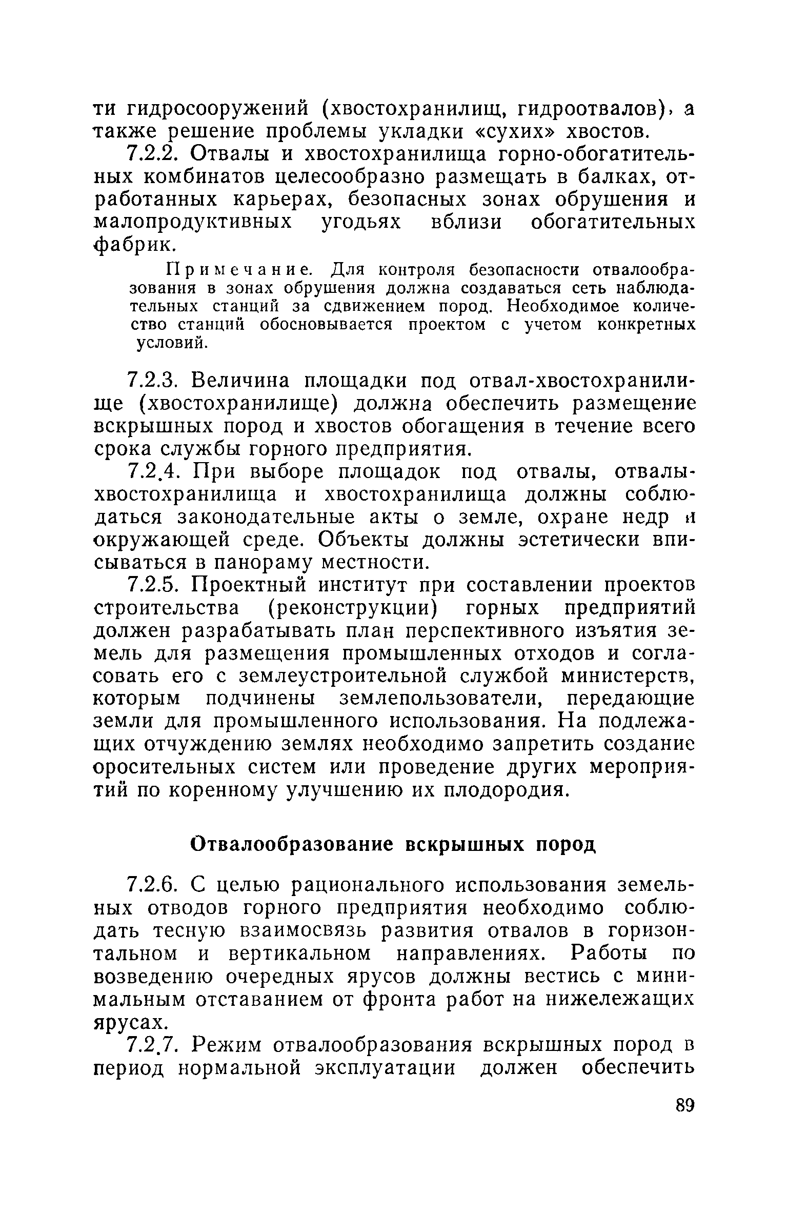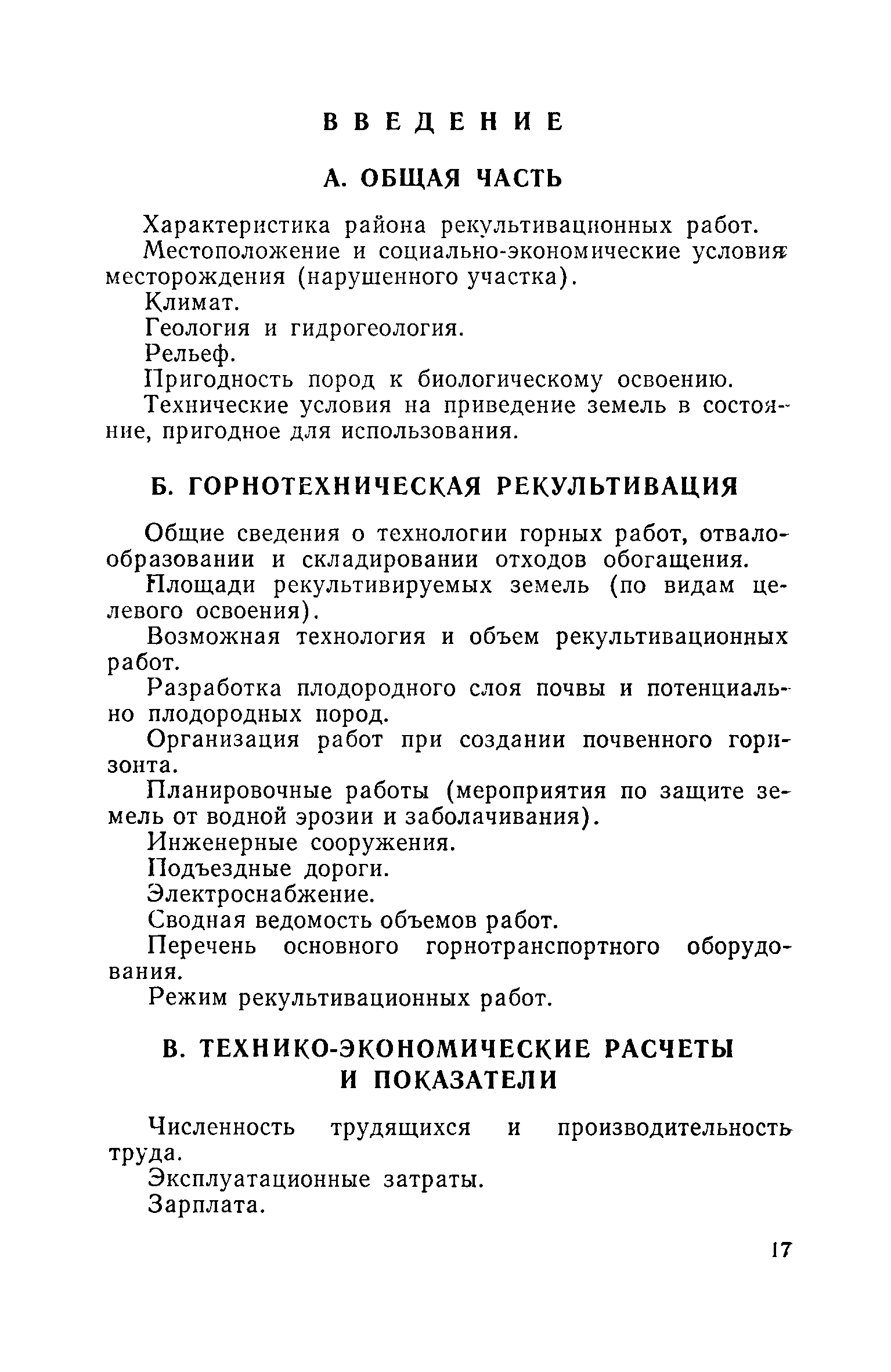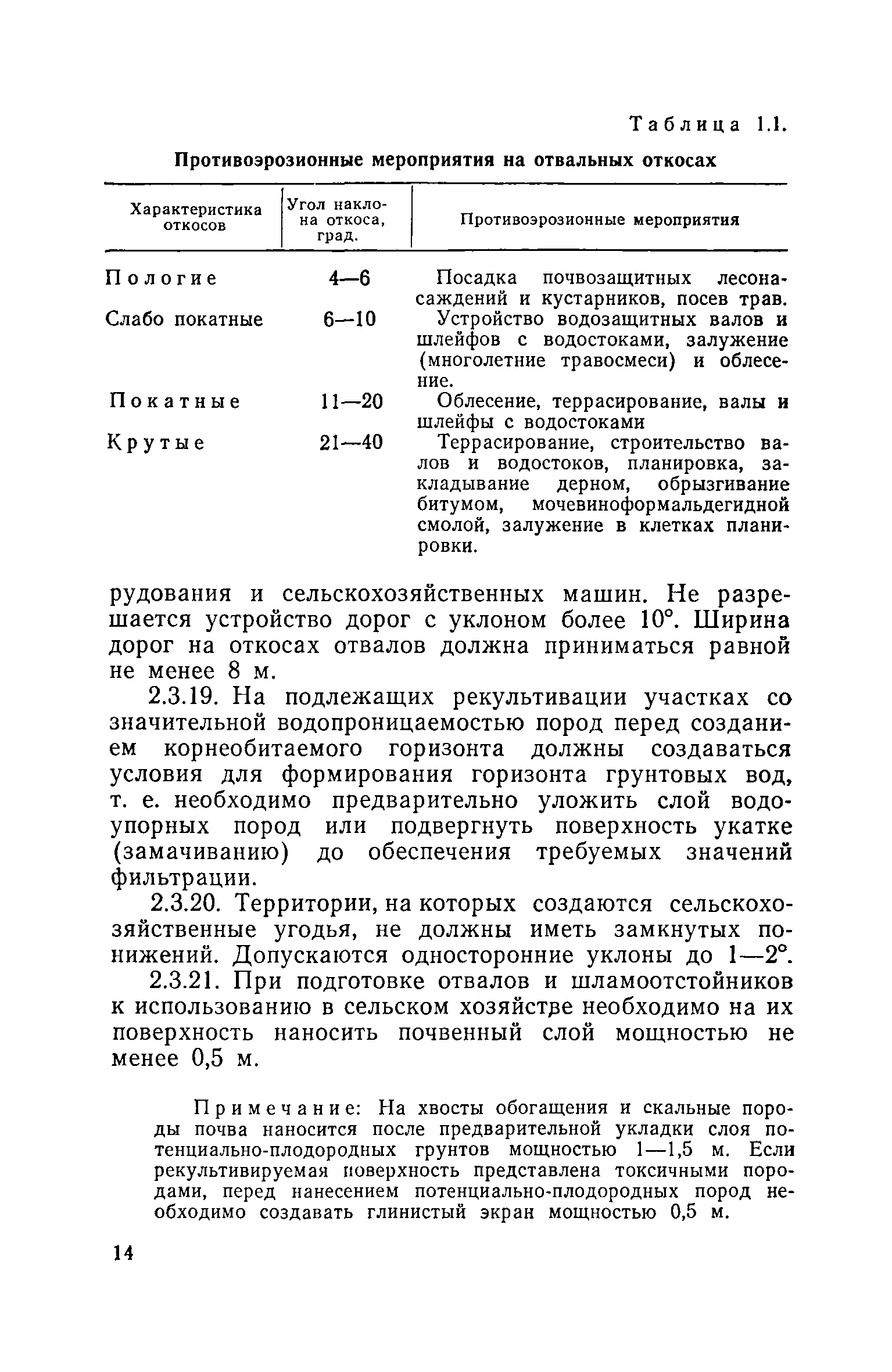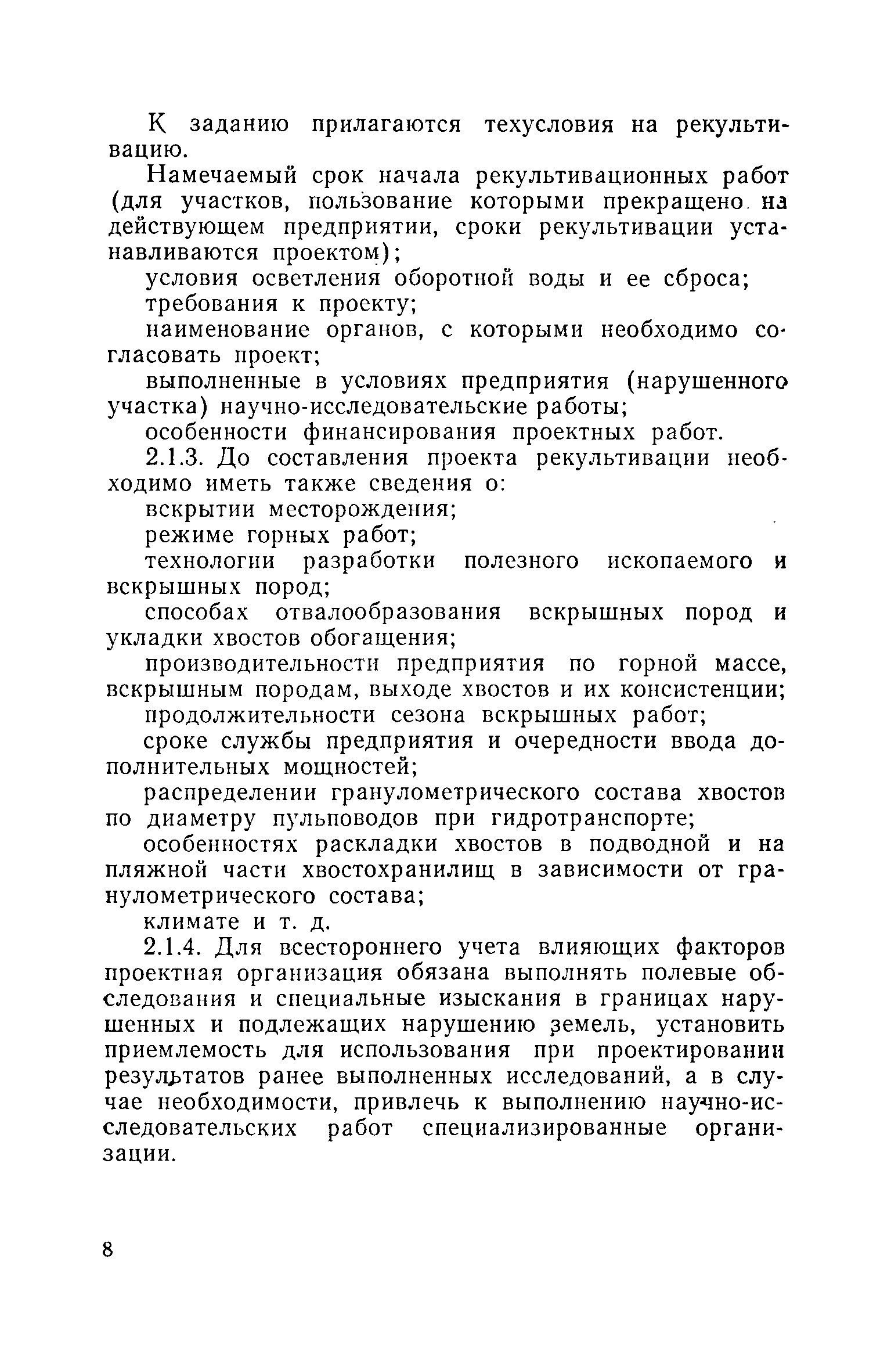 Временные указания по проектированию горнотехнической рекультивации земель, нарушенных открытыми разработками в Украинской ССР| Статус: | не действует | | Название рус.: | Временные указания по проектированию горнотехнической рекультивации земель, нарушенных открытыми разработками в Украинской ССР | | Дата добавления в базу: | 01.01.2018 | | Дата актуализации: | 01.01.2021 | | Область применения: | В документе изложены методические указания, рекомендации и нормативы по проектированию горнотехнической рекультивации нарушенных земель, технические условия на выполнение рекультивационных работ, технологические схемы рекультивации отвалов и хвостохранилищ, методика выбора эффективных вариантов рекультивации, а также направления интенсификации рационального использования земельных ресурсов при разработке месторождений открытым способом. | | Оглавление: | 1. Общие положения 1.1. Область применения методических указаний 1.2. Краткие сведения о рекультивации, ее выполнении и финансировании рекультивационных работ 2. Состав проекта рекультивационных работ 2.1. Исходные данные для проектирования 2.2. Объем изысканий 2.3. Технические условия на приведение земель в состояние, пригодное для использования 2.4. Состав и объем проекта 3. Рекультивация нарушенных земель с использованием почвенного слоя 3.1. Оборудование для подготовки и проведения горнотехнической рекультивации 3.2. Технологические схемы разработки почвенного слоя скреперами 3.3. Разработка и перемещение почвенного слоя железнодорожным транспортом 3.4. Схемы разработки почвенного слоя при конвейерном транспорте 3.5. Разработка почвенного слоя бульдозерами 3.6. Схемы разработки почвенного слоя экскаваторами 3.7. Перспективные схемы разработки почвенного слоя 4. Селективное формирование отвалов при различных системах разработки 4.1. Определение мощности потенциально-плодородных пород 4.2. Формирование отвалов при бестранспортной системе разработки 4.3. Формирование отвалов при транспортно-отвальной системе разработки 4.4. Формирование отвалов при транспортной системе 5. Планировочные работы при горнотехнической рекультивации 5.1. Механизация планировочных работ 5.2. Объемы планировочных работ 5.3. Расчет основных параметров вертикальной планировки 5.4. Определение допустимой величины осадки отвалов 5.5. Влияние осадки отвальной поверхности на организацию планировочных работ 6. Обоснование и технико-экономические показатели рекультивации 6.1. Объемы и технико-экономические показатели рекультивации 6.2. Выбор рациональной технологии рекультивации 6.3. Оценка эффективности рекультивации нарушенных земель 7. Интенсификация процесса рационального использования земельных ресурсов 7.1. Показатели использования земельных отводов 7.2. Рекомендации по использованию земельных отводов при создании отвалов и хвостохранилищ 7.3. Рекультивация хвостохранилищ с использованием гидротранспорта грунтов Нормативно-технологические показатели для сметной документации и характеристики вскрышных пород | | Разработан: | Минчермет УССР НИГРИ