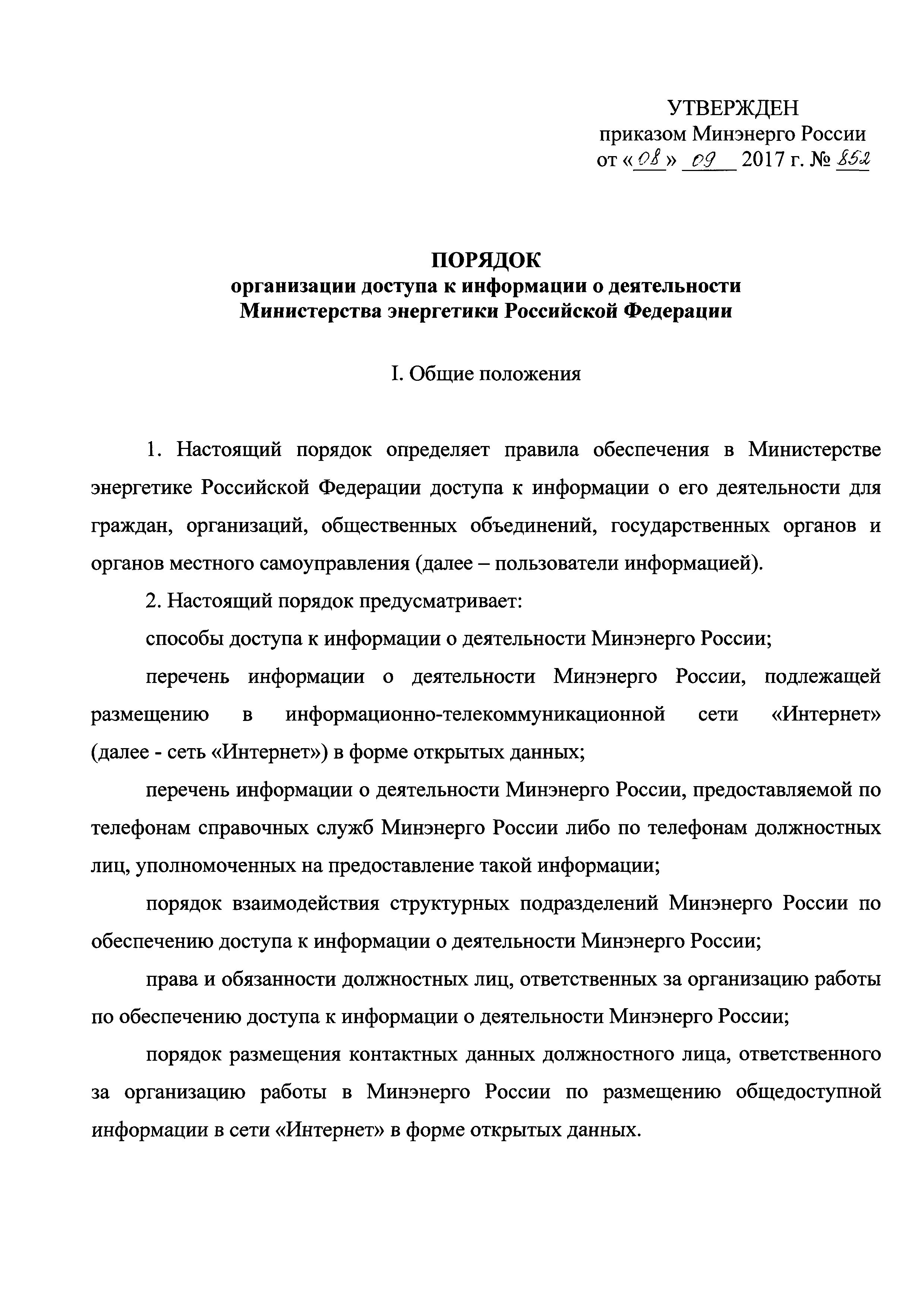 | Название рус.: | Порядок организации доступа к информации о деятельности Министерства энергетики Российской Федерации |