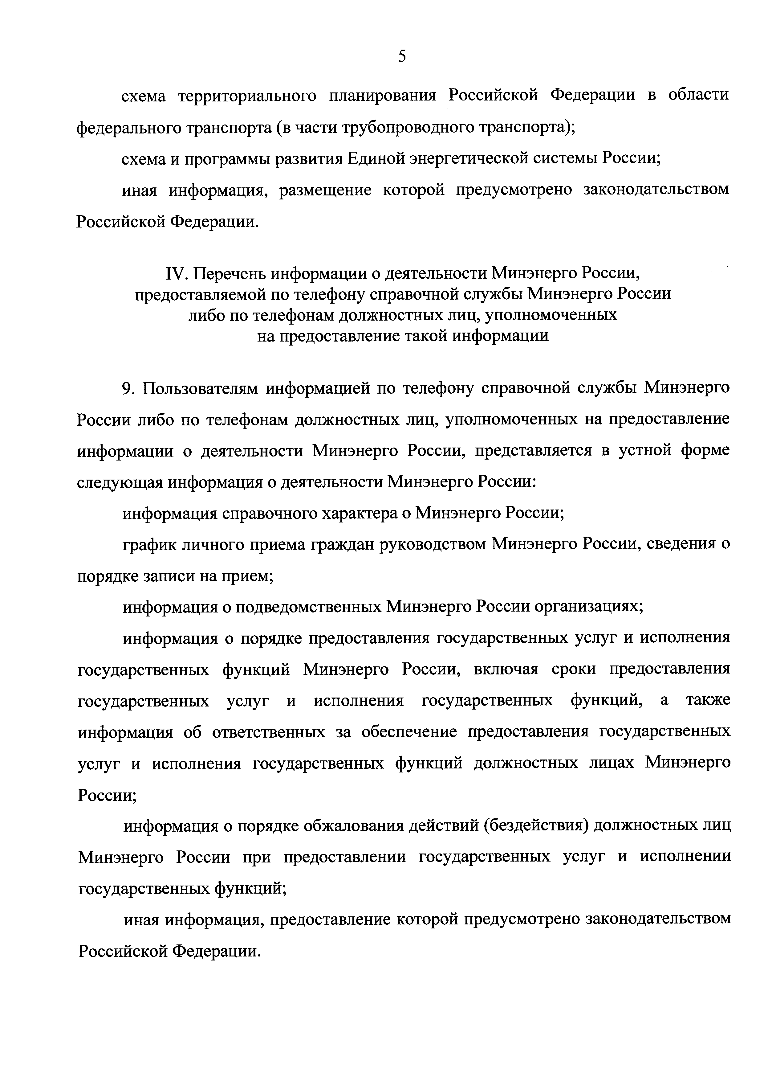 | Оглавление: | I. Общие положения II. Способы доступа к информации о деятельности Минэнерго России III. Перечень информации о деятельности Минэнерго России, подлежащей размещению в сети "Интернет" в форме открытых данных IV. Перечень информации о деятельности Минэнерго России, предоставляемой по телефону справочной службы Минэнерго России либо по телефонам должностных лиц, уполномоченных на предоставление такой информации V. Порядок взаимодействия структурных подразделений Минэнерго России по обеспечению доступа к информации о деятельности Минэнерго России VI. Права и обязанности должностных лиц, ответственных за организацию работы по обеспечению доступа информации о деятельности Минэнерго России |