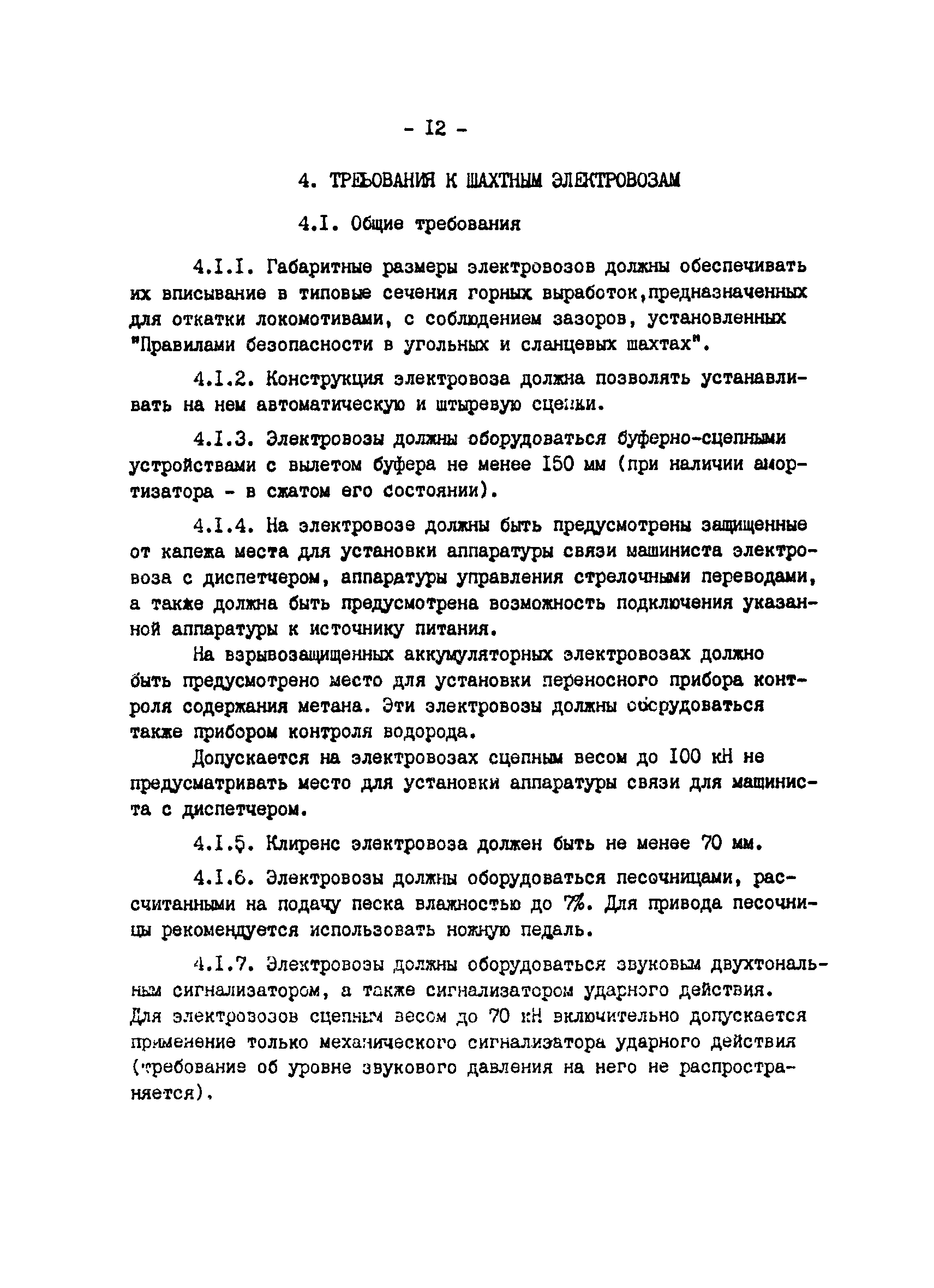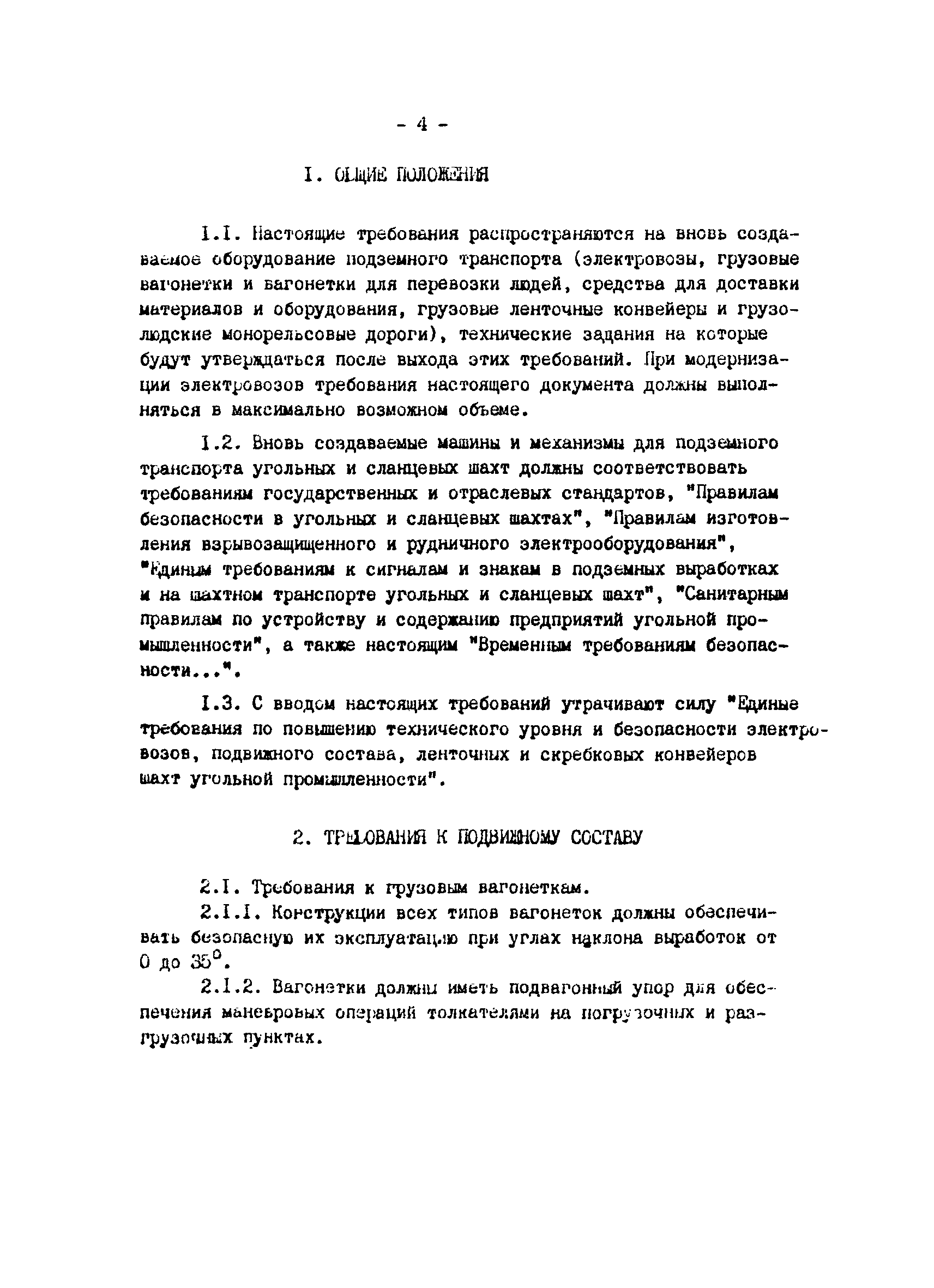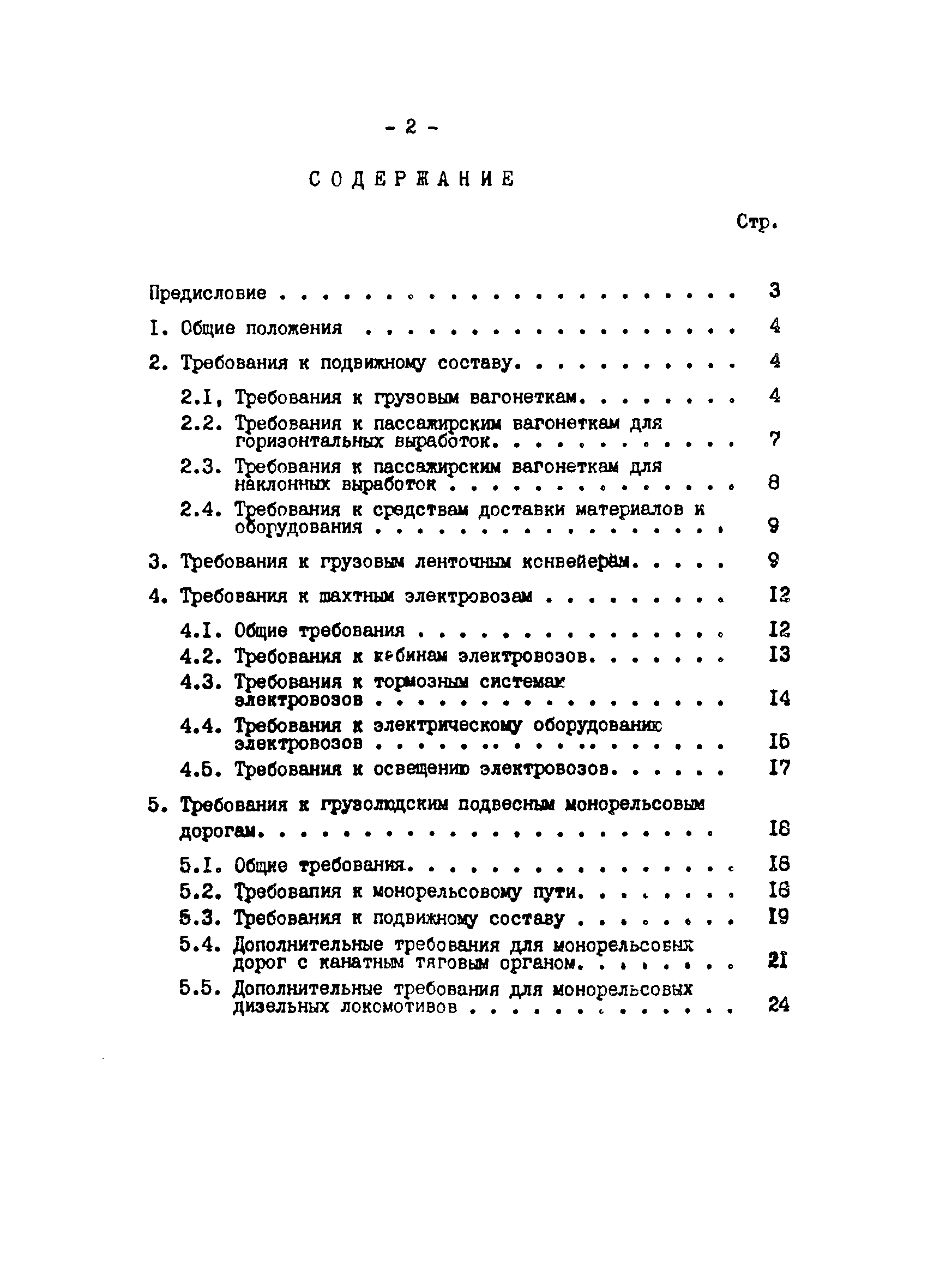 | Оглавление: | Предисловие 1 Общие положения 2 Требования к подвижному составу 2.1 Требования к грузовым вагонеткам 2.2 Требования к пассажирским вагонеткам для горизонтальных выработок 2.3 Требования к пассажирским вагонеткам для наклонных выработок 2.4 Требования к средствам доставки материалов и оборудования 3 Требования к грузовым ленточным конвейерам 4 Требования к шахтным электровозам 4.1 Общие требования 4.2 Требования к кабинам электровозов 4.3 Требования к тормозным системам электровозов 4.4 Требования х электрическому оборудованию электровозов 4.5 Требования к освещению электровозов 5 Требования к грузолюдским подвесным монорельсовым дорогам 5.1 Общие требования 5.2 Требования к монорельсовому пути 5.3 Требования к подвижному составу 5.4 Дополнительные требования для монорельсовых дорог с канатным тяговым органом 5.5 Дополнительные требования для монорельсовых дизельных локомотивов |