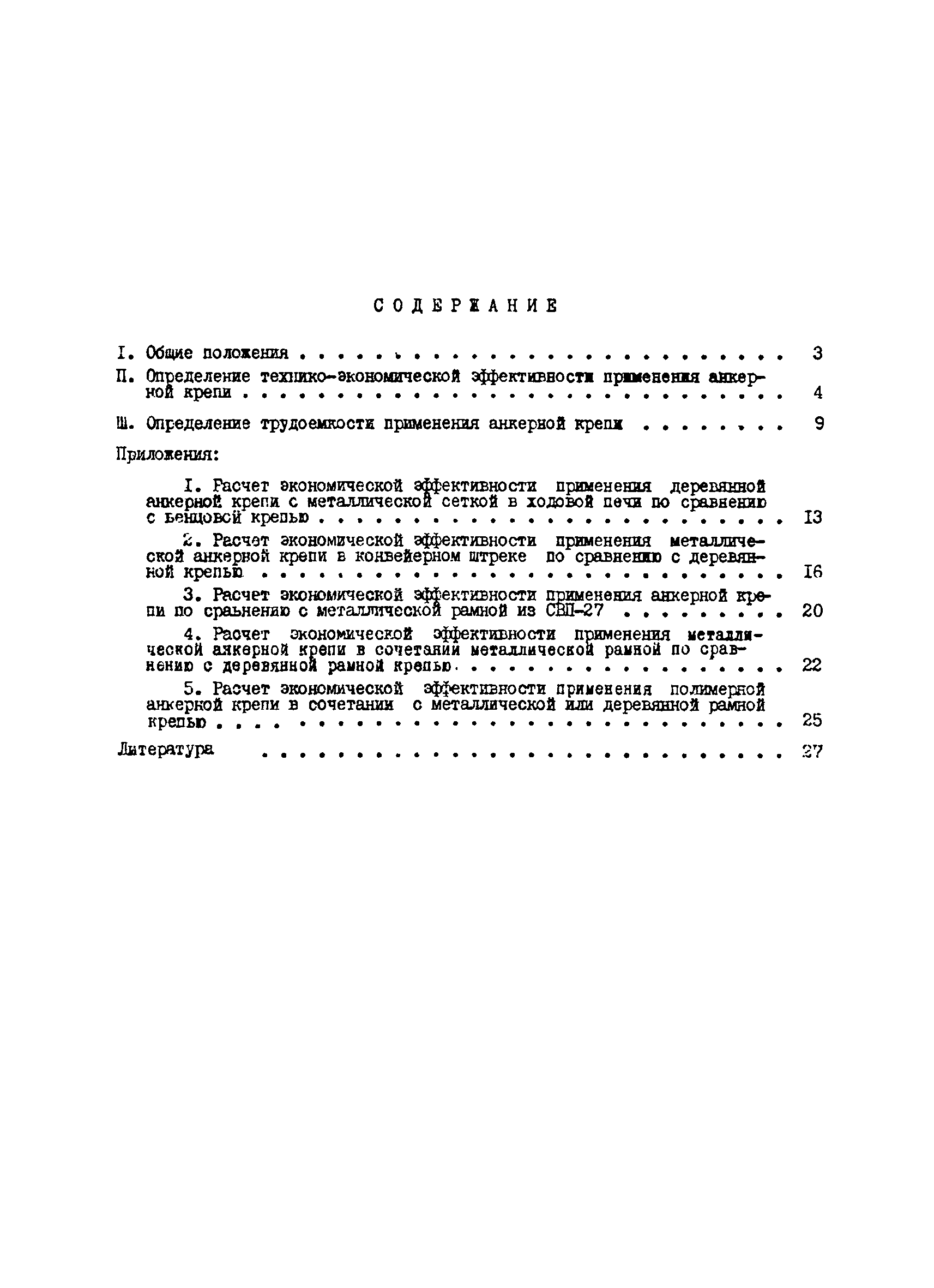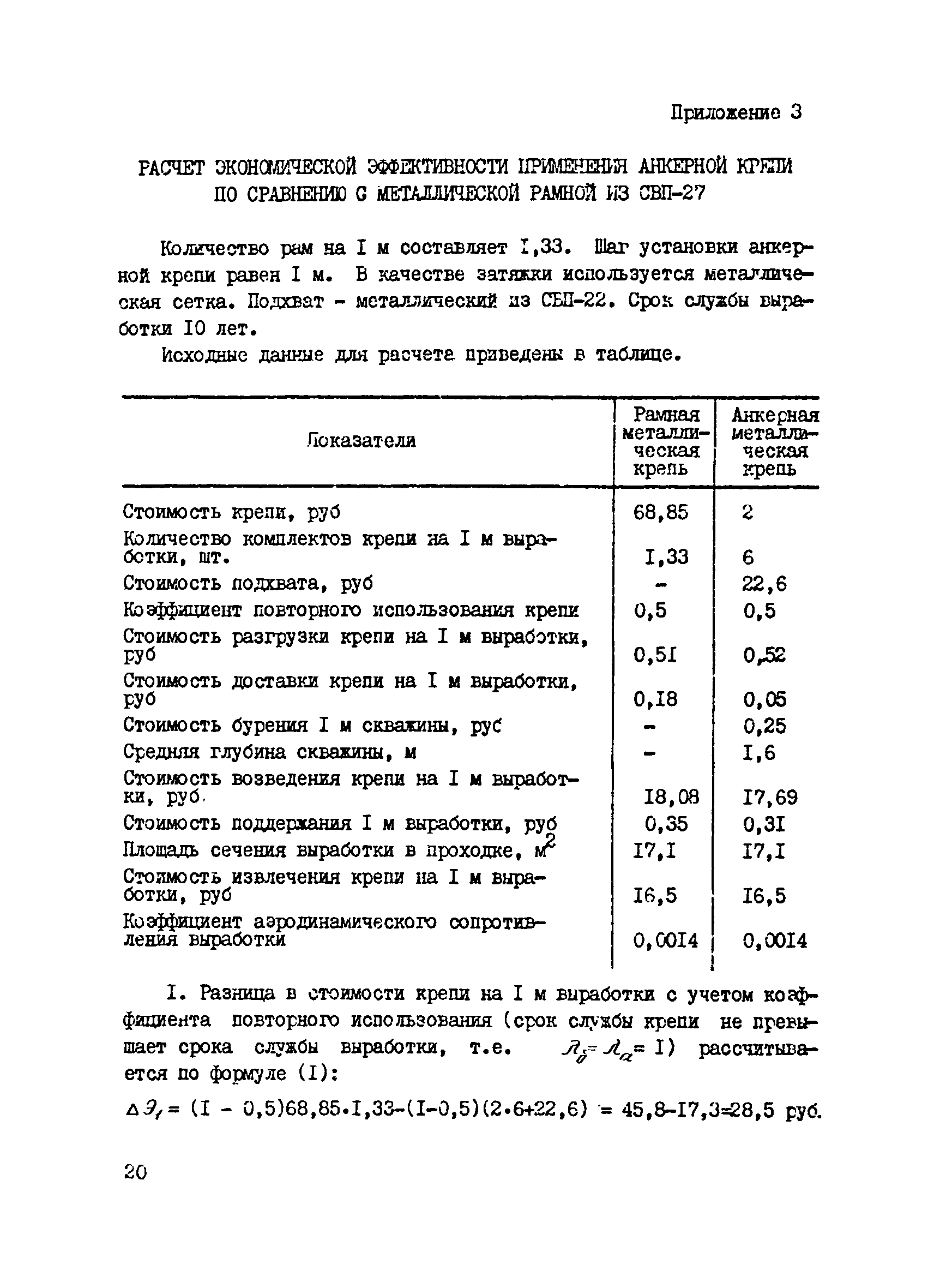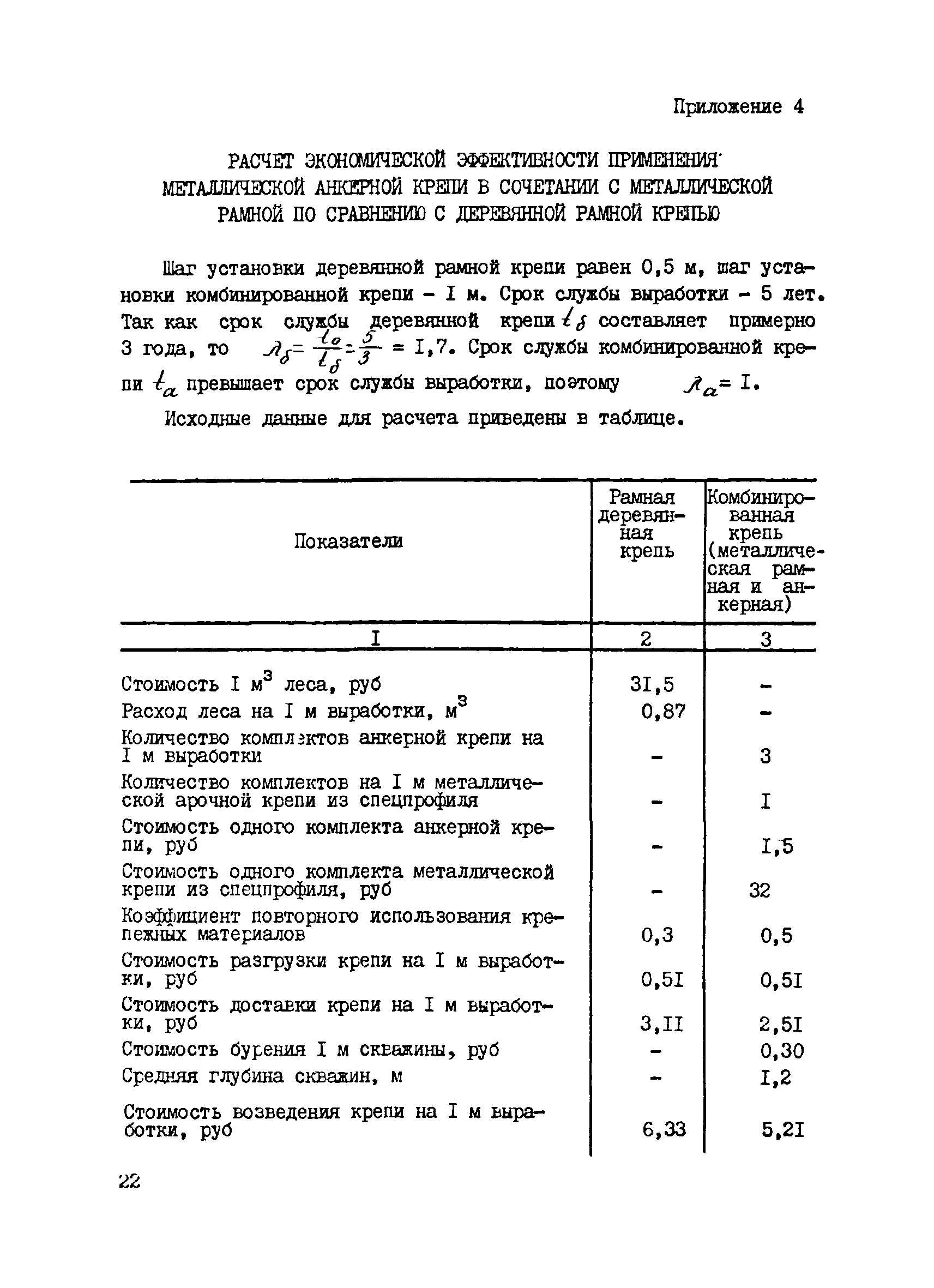| Оглавление: | I Общие положения II Определение технико—экономической эффективности применения анкерной крепи III Определение трудоемкости применения анкерной крепи Приложение 1. Расчет экономической эффективности применения деревянной анкерной крепи с металлической сеткой в ходовой печи по сравнению с бенцовой крепью Приложение 2. Расчет экономической эффективности применения металлической анкерной крепи в конвейерном штреке по сравнению с деревянной крепью Приложение 3. Расчет экономической эффективности применения анкерной крепи по сравнению с металлической рамной из СВП—27 Приложение 4. Расчет экономической эффективности применения металлической анкерной крепи в сочетании металлической рамкой по сравнению с деревянной рамной крепью Приложение 5. Расчет экономической эффективности применения полимерной анкерной крепи в сочетании с металлической или деревянной рамной крепью Литература |