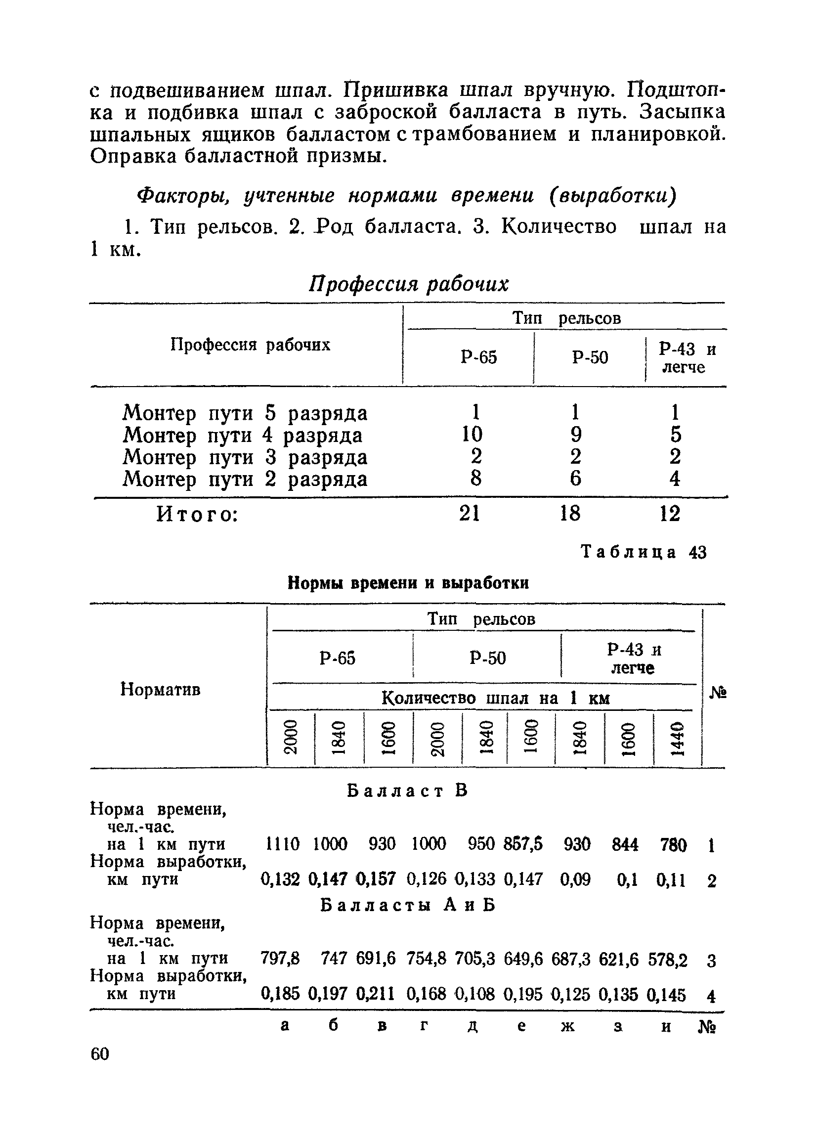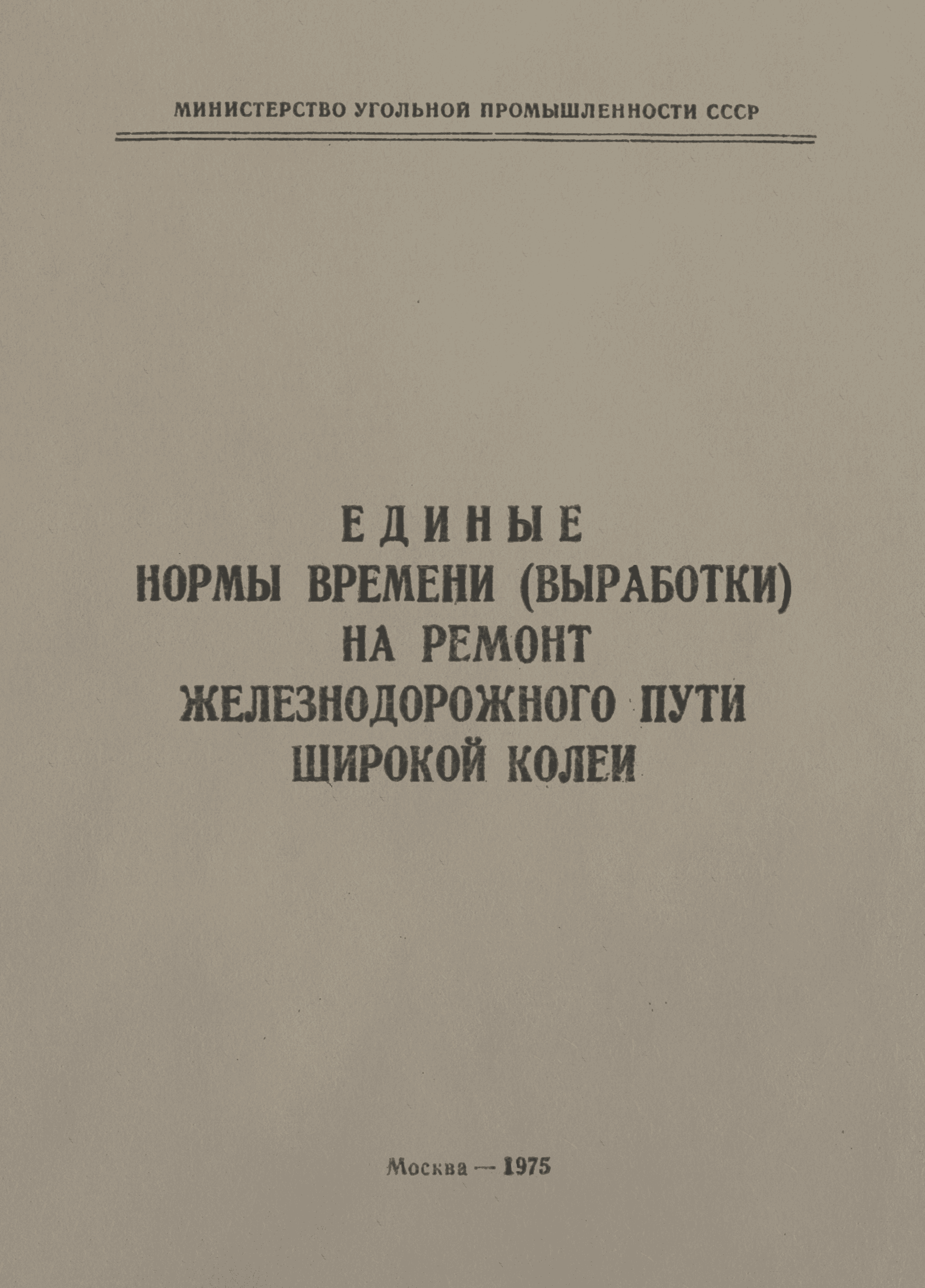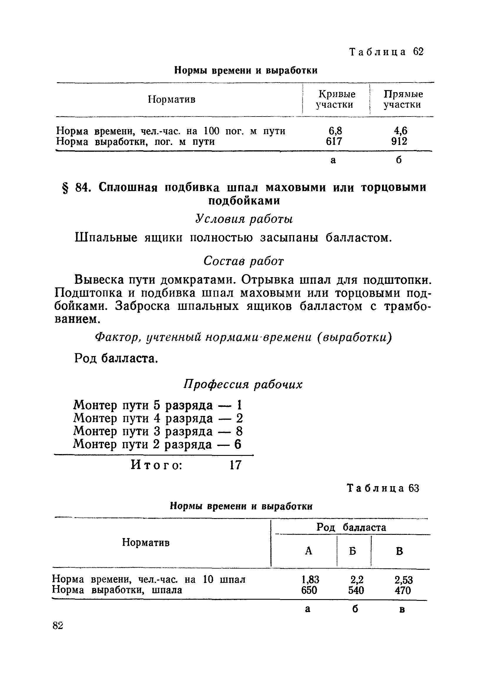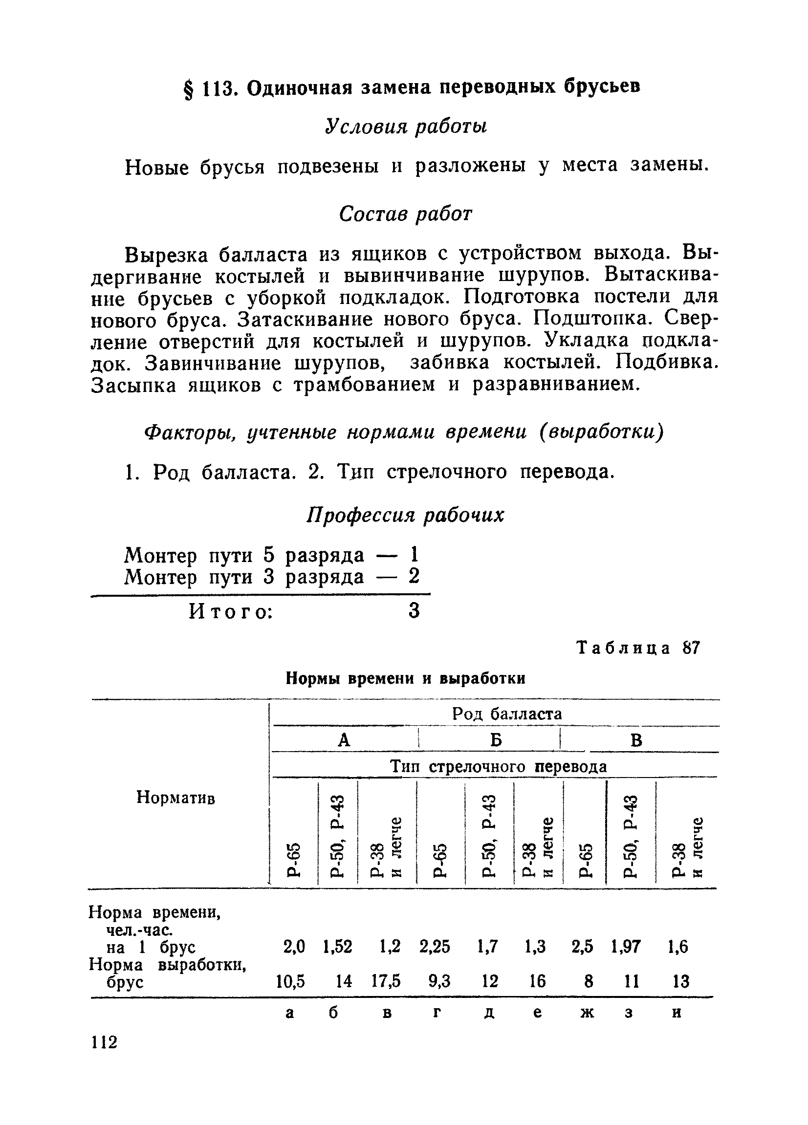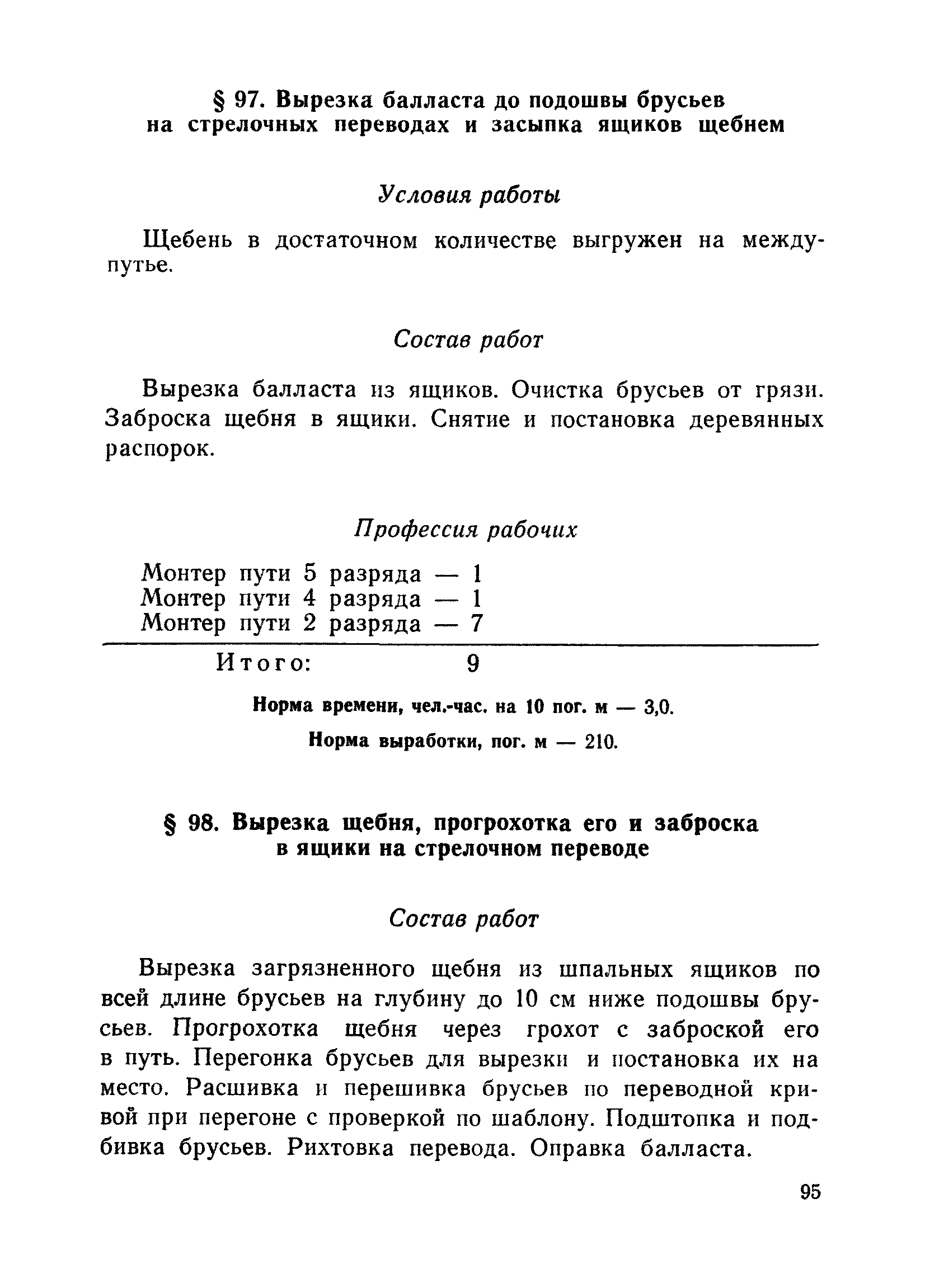 Единые нормы времени (выработки) на ремонт железнодорожного пути широкой колеи| Статус: | не действует | | Название рус.: | Единые нормы времени (выработки) на ремонт железнодорожного пути широкой колеи | | Дата добавления в базу: | 01.01.2018 | | Дата актуализации: | 01.01.2021 | | Область применения: | Единые нормы времени (выработки) были обязательны для применения во всех погрузочно-транспортных управлениях (объединениях) и других организациях Минуглепрома СССР, имеющих постоянные железнодорожные пути широкой колеи | | Оглавление: | Общая часть Техническая часть Нормативная часть Раздел I. Работы по земляному полотну § 1. Очистка кюветов вручную § 2. Уборка загрязненного балласта или грунта § 3. Работы, выполняемые путевым стругом § 4. Ручная срезка и планировка обочин § 5. Устройство и ремонт деревянного лотка § 6. Очистка нагорных канав Раздел II. Подготовительные работы на перегоне § 7. Срезка загрязненной корки балласта § 8. Вырезка балласта на глубину до нижней постели шпал § 9. Замена загрязненного балласта до нижней постели шпал § 10. Визирование пути § 11. Вырезка, прогрохотка и заброска в путь щебеночного балласта § 12. Выправка продольного профиля вручную с подрезкой загрязненного балласта ниже подошвы шпал § 13. Разборка вручную деревянного переездного настила § 14. Разборка вручную железобетонного переездного настила § 15. Разборка постоянного переездного настила кранами § 16. Снятие малых и больших путевых знаков § 17. Смазка стыковых болтов в пути Раздел III. Работы на звеносборочной базе § 18. Выгрузка деревянных шпал из полувагонов кранами § 19. Выгрузка деревянных шпал вручную § 20. Выгрузка железобетонных шпал из полувагонов кранами § 21. Погрузка деревянных шпал в полувагоны кранами § 22. Раскладка пакетов деревянных шпал на пути-шаблоне дрезиной АГМу § 23. Раскладка пакетов деревянных шпал на пути-шаблоне кранами § 24. Раскладка вручную шпал на пути-шаблоне при сборке рельсовых звеньев § 25. Забивка П-образных скоб § 26. Сверление костыльных отверстии в шпалах § 27. Комплектование закладных и клеммных болтов § 28. Раскладка прокладок § 29. Раскладка скреплений § 30. Раскладка рельсов длиной 25 м на подкладки погрузочными кранами § 31. Разметка мест положения осей шпал на шейке рельса § 32. Прикрепление рельсов к шпалам по шаблону на маячных шпалах § 33. Прикрепление рельсов к шпалам костылями (при помощи пневматического молотка типа ОМСП-5 или электропневматического костылезабивщика типа ЭПК-2 или ЭПК-3) § 34. Прикрепление подкладок к деревянным шпалам шурупами (вручную) § 35. Прикрепление подкладок к деревянным шпалам шурупами (при помощи шуруповерта типа ШВ-1) § 36. Прикрепление рельсов к подкладкам клеммными болтами при раздельном скреплении (при помощи шуруповерта типа ШВ-1) § 37. Прикрепление рельсов к шпалам при скреплении Типа КБ (при помощи шуруповерта типа ШВ-1) § 38. Прикрепление рельсов к шпалам при скреплении типа ЖБ (при помощи шурупно-гаечного ключа типа ШГК) § 39. Пришивка рельсов к шпалам вручную § 40. Прикрепление рельсов к шпалам при скреплении типа ЖБ (при помощи шуруповерта типа ШВ-1) § 41. Постановка противоугонов § 42. Укладка звеньев в штабель кранами § 43. Клеймение шпал § 44. Обрезка длинных шпал § 45. Постановка рельсовых стыков на графитовую мазь § 46. Обвязка концов шпал § 47. Погрузка рельсовых звеньев погрузочным краном ПКД (рельсовые звенья длиной 25 м 