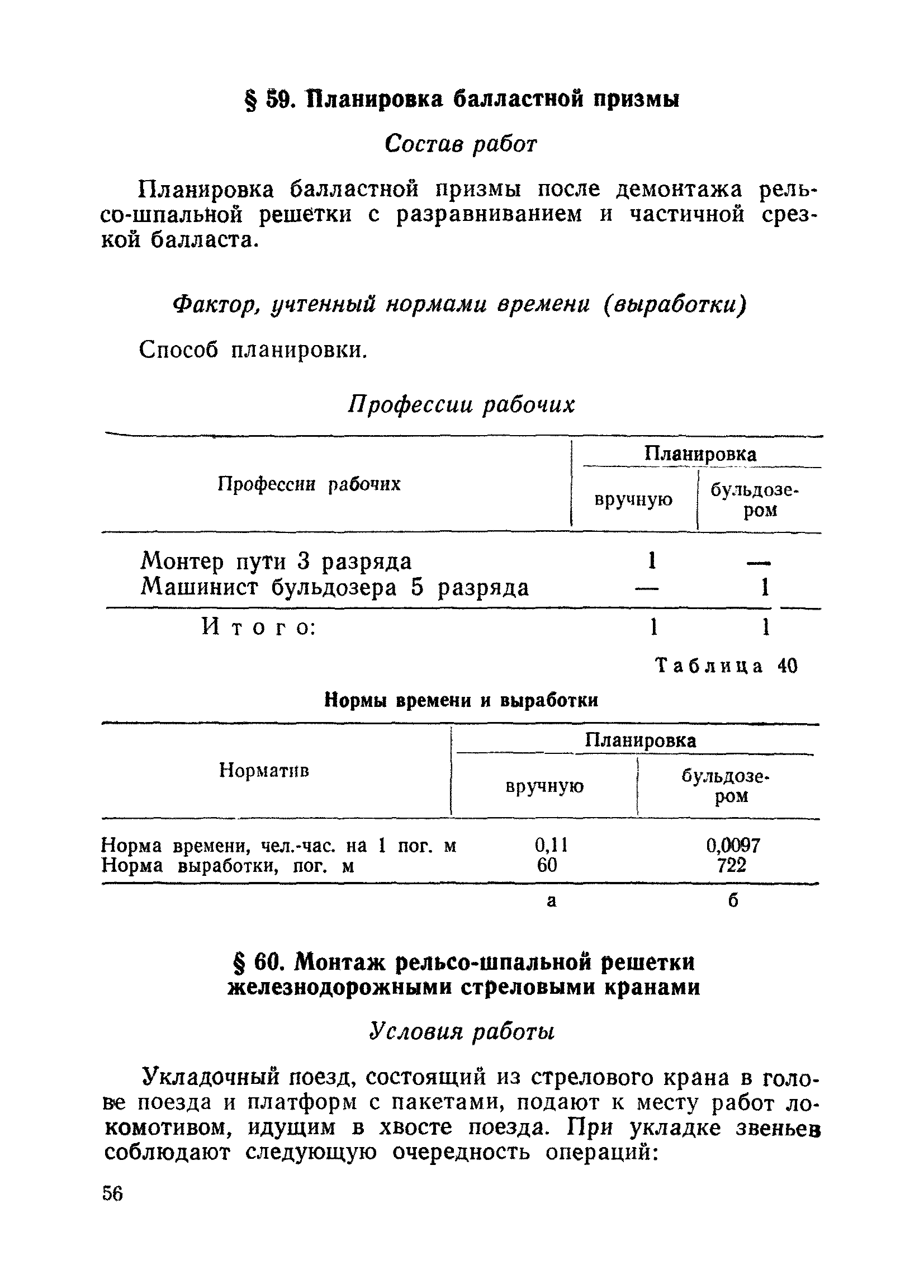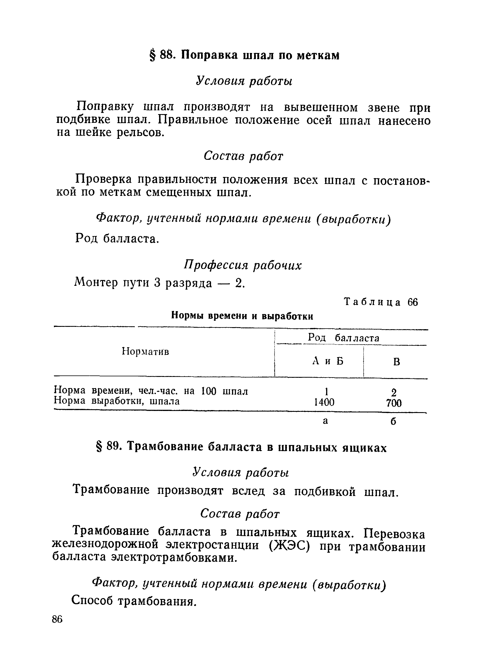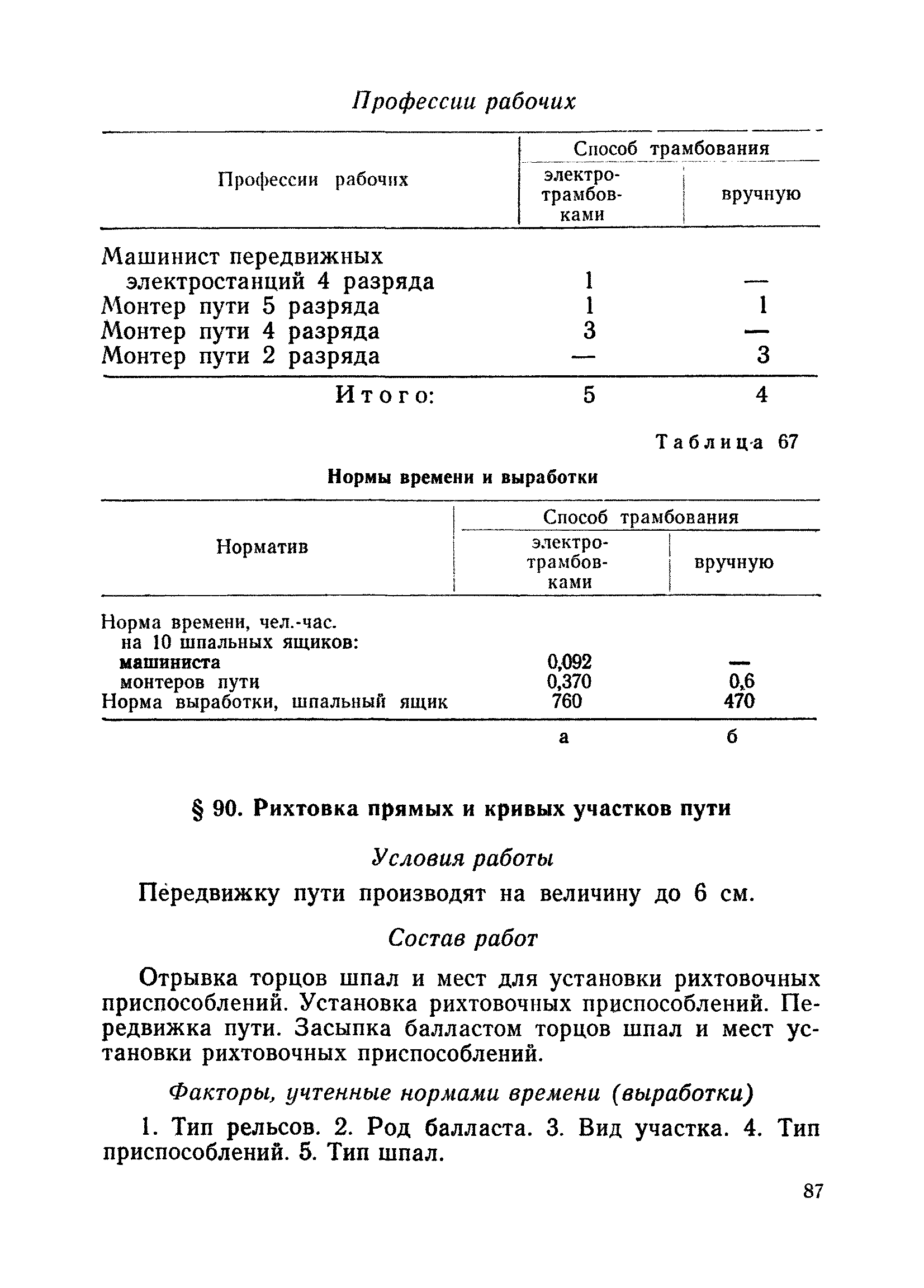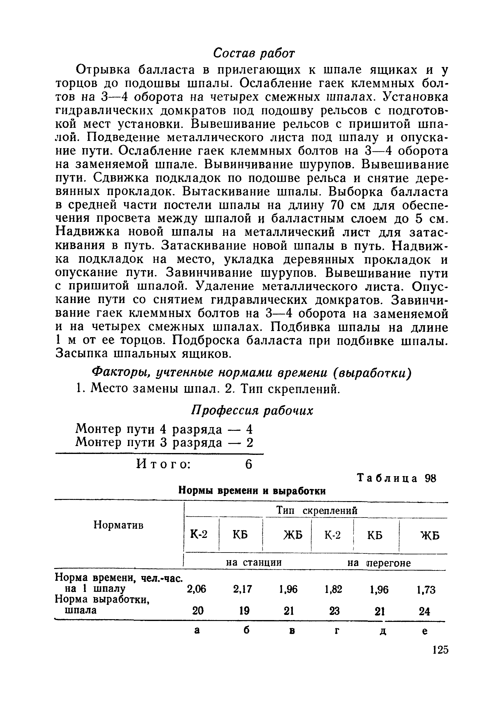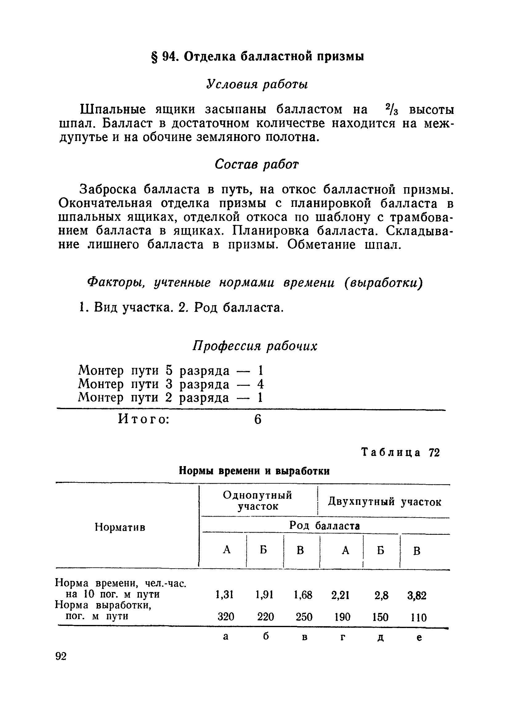 Единые нормы времени (выработки) на ремонт железнодорожного пути широкой колеи| Статус: | не действует | | Название рус.: | Единые нормы времени (выработки) на ремонт железнодорожного пути широкой колеи | | Дата добавления в базу: | 01.01.2018 | | Дата актуализации: | 01.01.2021 | | Область применения: | Единые нормы времени (выработки) были обязательны для применения во всех погрузочно-транспортных управлениях (объединениях) и других организациях Минуглепрома СССР, имеющих постоянные железнодорожные пути широкой колеи | | Оглавление: | Общая часть Техническая часть Нормативная часть Раздел I. Работы по земляному полотну § 1. Очистка кюветов вручную § 2. Уборка загрязненного балласта или грунта § 3. Работы, выполняемые путевым стругом § 4. Ручная срезка и планировка обочин § 5. Устройство и ремонт деревянного лотка § 6. Очистка нагорных канав Раздел II. Подготовительные работы на перегоне § 7. Срезка загрязненной корки балласта § 8. Вырезка балласта на глубину до нижней постели шпал § 9. Замена загрязненного балласта до нижней постели шпал § 10. Визирование пути § 11. Вырезка, прогрохотка и заброска в путь щебеночного балласта § 12. Выправка продольного профиля вручную с подрезкой загрязненного балласта ниже подошвы шпал § 13. Разборка вручную деревянного переездного настила § 14. Разборка вручную железобетонного переездного настила § 15. Разборка постоянного переездного настила кранами § 16. Снятие малых и больших путевых знаков § 17. Смазка стыковых болтов в пути Раздел III. Работы на звеносборочной базе § 18. Выгрузка деревянных шпал из полувагонов кранами § 19. Выгрузка деревянных шпал вручную § 20. Выгрузка железобетонных шпал из полувагонов кранами § 21. Погрузка деревянных шпал в полувагоны кранами § 22. Раскладка пакетов деревянных шпал на пути-шаблоне дрезиной АГМу § 23. Раскладка пакетов деревянных шпал на пути-шаблоне кранами § 24. Раскладка вручную шпал на пути-шаблоне при сборке рельсовых звеньев § 25. Забивка П-образных скоб § 26. Сверление костыльных отверстии в шпалах § 27. Комплектование закладных и клеммных болтов § 28. Раскладка прокладок § 29. Раскладка скреплений § 30. Раскладка рельсов длиной 25 м на подкладки погрузочными кранами § 31. Разметка мест положения осей шпал на шейке рельса § 32. Прикрепление рельсов к шпалам по шаблону на маячных шпалах § 33. Прикрепление рельсов к шпалам костылями (при помощи пневматического молотка типа ОМСП-5 или электропневматического костылезабивщика типа ЭПК-2 или ЭПК-3) § 34. Прикрепление подкладок к деревянным шпалам шурупами (вручную) § 35. Прикрепление подкладок к деревянным шпалам шурупами (при помощи шуруповерта типа ШВ-1) § 36. Прикрепление рельсов к подкладкам клеммными болтами при раздельном скреплении (при помощи шуруповерта типа ШВ-1) § 37. Прикрепление рельсов к шпалам при скреплении Типа КБ (при помощи шуруповерта типа ШВ-1) § 38. Прикрепление рельсов к шпалам при скреплении типа ЖБ (при помощи шурупно-гаечного ключа типа ШГК) § 39. Пришивка рельсов к шпалам вручную § 40. Прикрепление рельсов к шпалам при скреплении типа ЖБ (при помощи шуруповерта типа ШВ-1) § 41. Постановка противоугонов § 42. Укладка звеньев в штабель кранами § 43. Клеймение шпал § 44. Обрезка длинных шпал § 45. Постановка рельсовых стыков на графитовую мазь § 46. Обвязка концов шпал § 47. Погрузка рельсовых звеньев погрузочным краном ПКД (рельсовые звенья длиной 25 м 