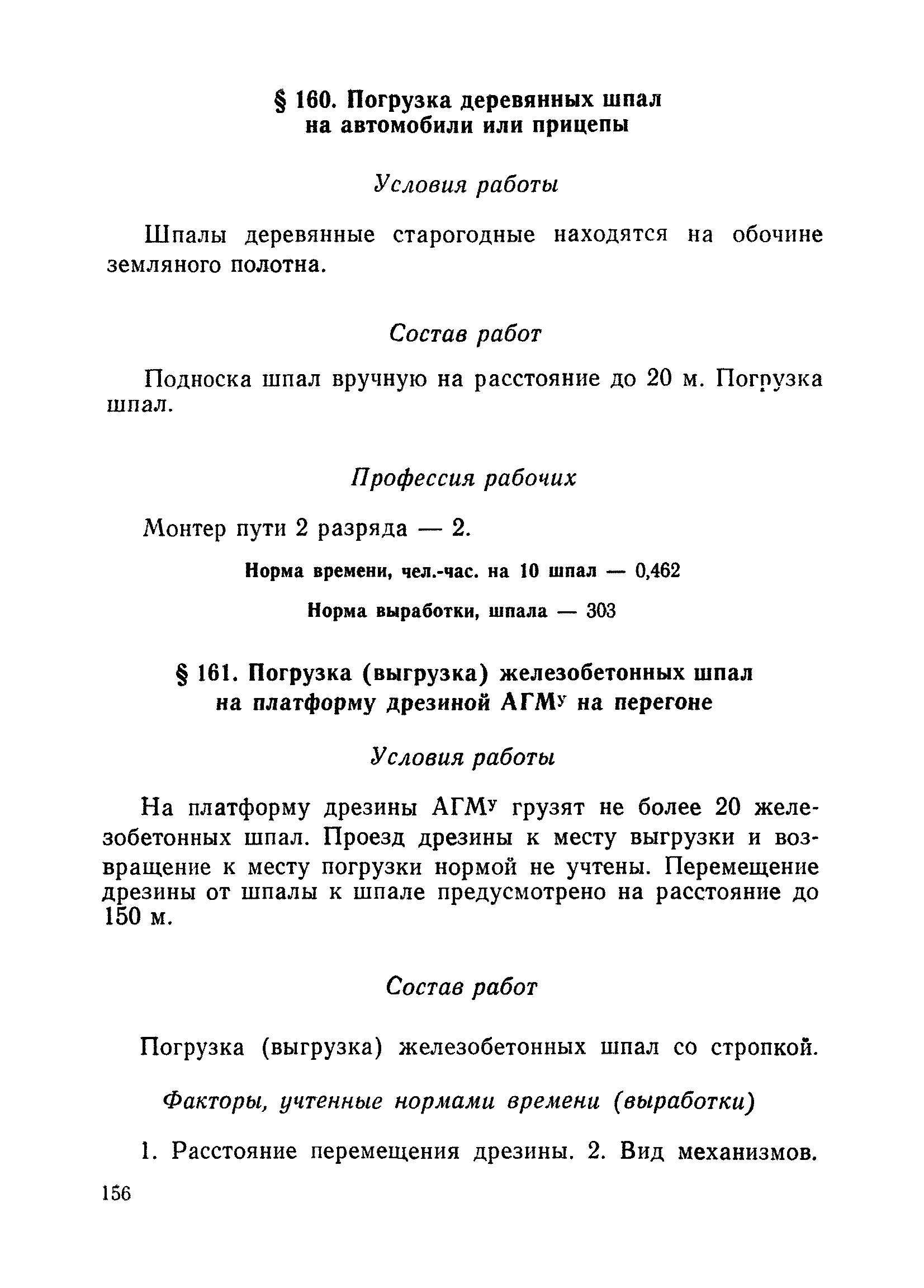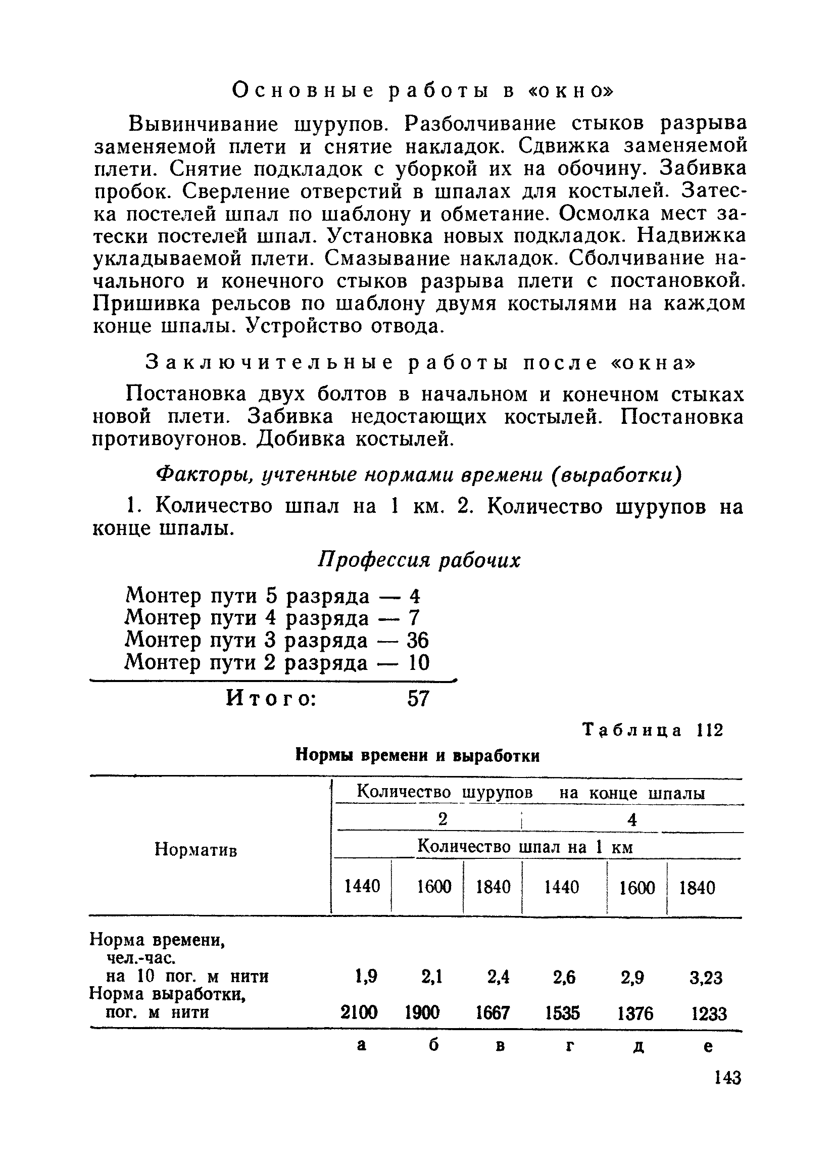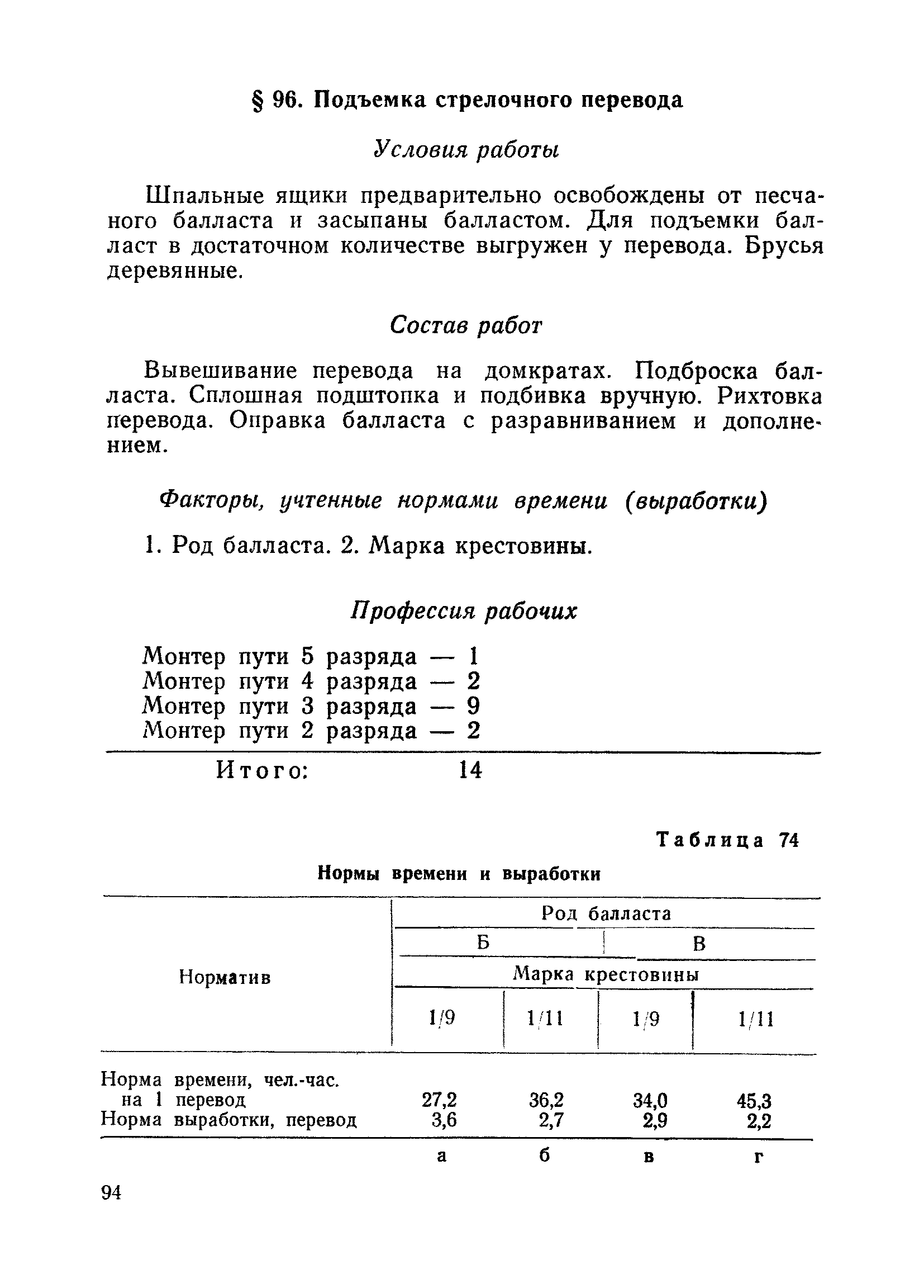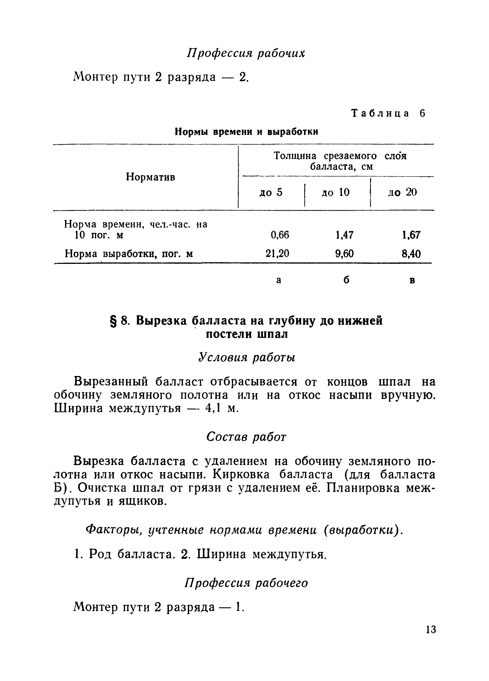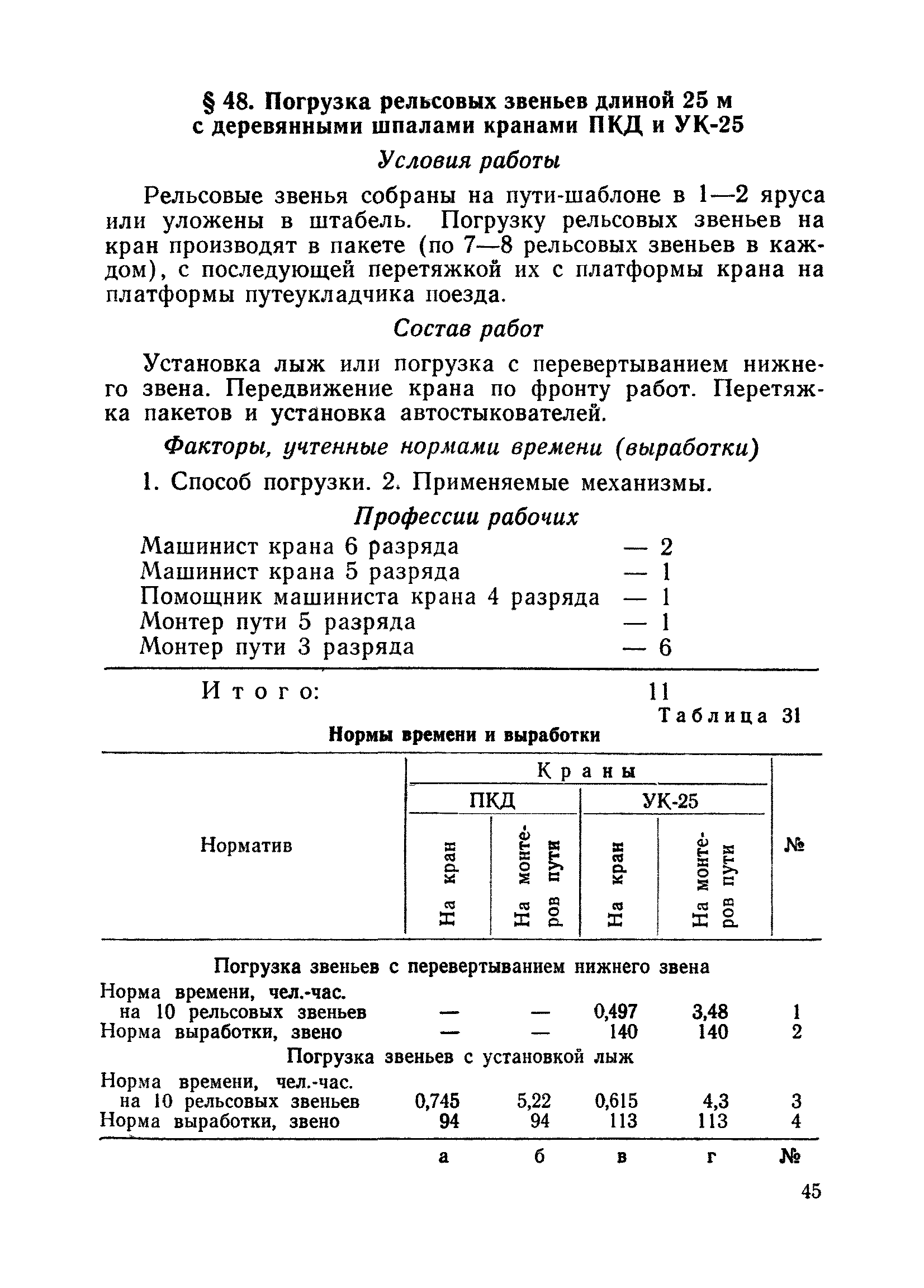 Единые нормы времени (выработки) на ремонт железнодорожного пути широкой колеи| Статус: | не действует | | Название рус.: | Единые нормы времени (выработки) на ремонт железнодорожного пути широкой колеи | | Дата добавления в базу: | 01.01.2018 | | Дата актуализации: | 01.01.2021 | | Область применения: | Единые нормы времени (выработки) были обязательны для применения во всех погрузочно-транспортных управлениях (объединениях) и других организациях Минуглепрома СССР, имеющих постоянные железнодорожные пути широкой колеи | | Оглавление: | Общая часть Техническая часть Нормативная часть Раздел I. Работы по земляному полотну § 1. Очистка кюветов вручную § 2. Уборка загрязненного балласта или грунта § 3. Работы, выполняемые путевым стругом § 4. Ручная срезка и планировка обочин § 5. Устройство и ремонт деревянного лотка § 6. Очистка нагорных канав Раздел II. Подготовительные работы на перегоне § 7. Срезка загрязненной корки балласта § 8. Вырезка балласта на глубину до нижней постели шпал § 9. Замена загрязненного балласта до нижней постели шпал § 10. Визирование пути § 11. Вырезка, прогрохотка и заброска в путь щебеночного балласта § 12. Выправка продольного профиля вручную с подрезкой загрязненного балласта ниже подошвы шпал § 13. Разборка вручную деревянного переездного настила § 14. Разборка вручную железобетонного переездного настила § 15. Разборка постоянного переездного настила кранами § 16. Снятие малых и больших путевых знаков § 17. Смазка стыковых болтов в пути Раздел III. Работы на звеносборочной базе § 18. Выгрузка деревянных шпал из полувагонов кранами § 19. Выгрузка деревянных шпал вручную § 20. Выгрузка железобетонных шпал из полувагонов кранами § 21. Погрузка деревянных шпал в полувагоны кранами § 22. Раскладка пакетов деревянных шпал на пути-шаблоне дрезиной АГМу § 23. Раскладка пакетов деревянных шпал на пути-шаблоне кранами § 24. Раскладка вручную шпал на пути-шаблоне при сборке рельсовых звеньев § 25. Забивка П-образных скоб § 26. Сверление костыльных отверстии в шпалах § 27. Комплектование закладных и клеммных болтов § 28. Раскладка прокладок § 29. Раскладка скреплений § 30. Раскладка рельсов длиной 25 м на подкладки погрузочными кранами § 31. Разметка мест положения осей шпал на шейке рельса § 32. Прикрепление рельсов к шпалам по шаблону на маячных шпалах § 33. Прикрепление рельсов к шпалам костылями (при помощи пневматического молотка типа ОМСП-5 или электропневматического костылезабивщика типа ЭПК-2 или ЭПК-3) § 34. Прикрепление подкладок к деревянным шпалам шурупами (вручную) § 35. Прикрепление подкладок к деревянным шпалам шурупами (при помощи шуруповерта типа ШВ-1) § 36. Прикрепление рельсов к подкладкам клеммными болтами при раздельном скреплении (при помощи шуруповерта типа ШВ-1) § 37. Прикрепление рельсов к шпалам при скреплении Типа КБ (при помощи шуруповерта типа ШВ-1) § 38. Прикрепление рельсов к шпалам при скреплении типа ЖБ (при помощи шурупно-гаечного ключа типа ШГК) § 39. Пришивка рельсов к шпалам вручную § 40. Прикрепление рельсов к шпалам при скреплении типа ЖБ (при помощи шуруповерта типа ШВ-1) § 41. Постановка противоугонов § 42. Укладка звеньев в штабель кранами § 43. Клеймение шпал § 44. Обрезка длинных шпал § 45. Постановка рельсовых стыков на графитовую мазь § 46. Обвязка концов шпал § 47. Погрузка рельсовых звеньев погрузочным краном ПКД (рельсовые звенья длиной 25 м 