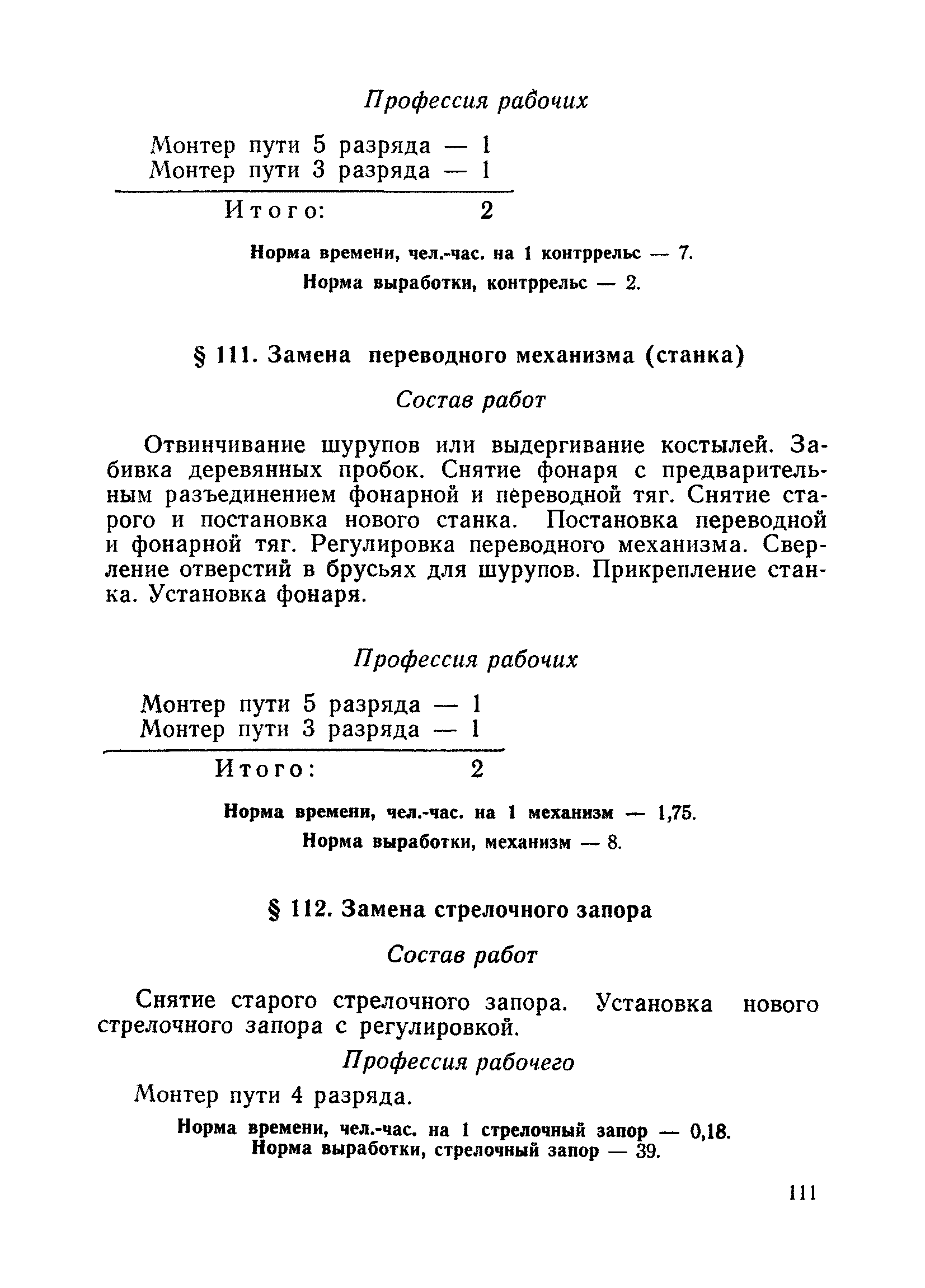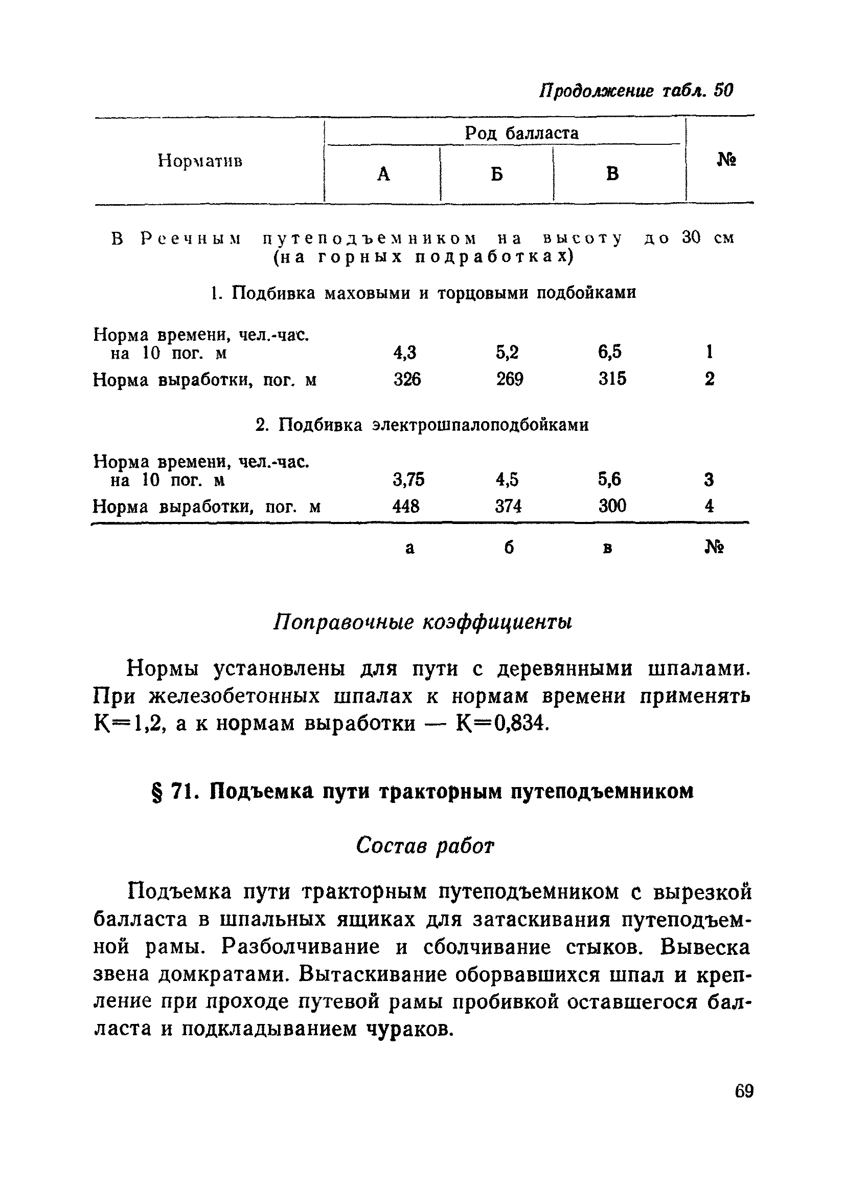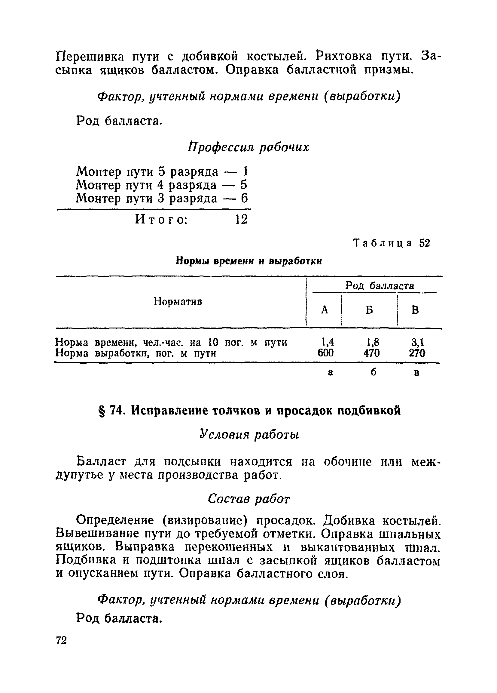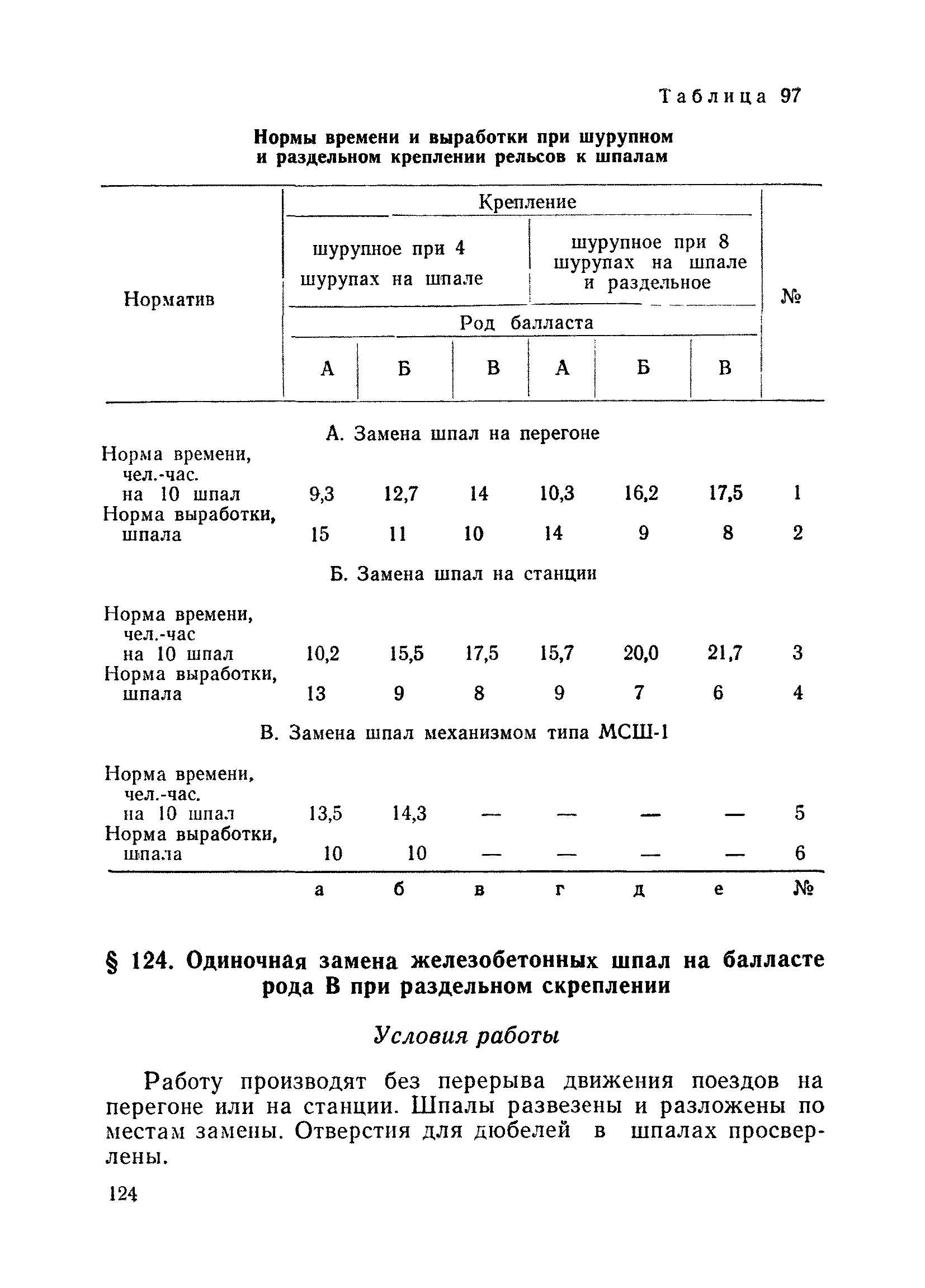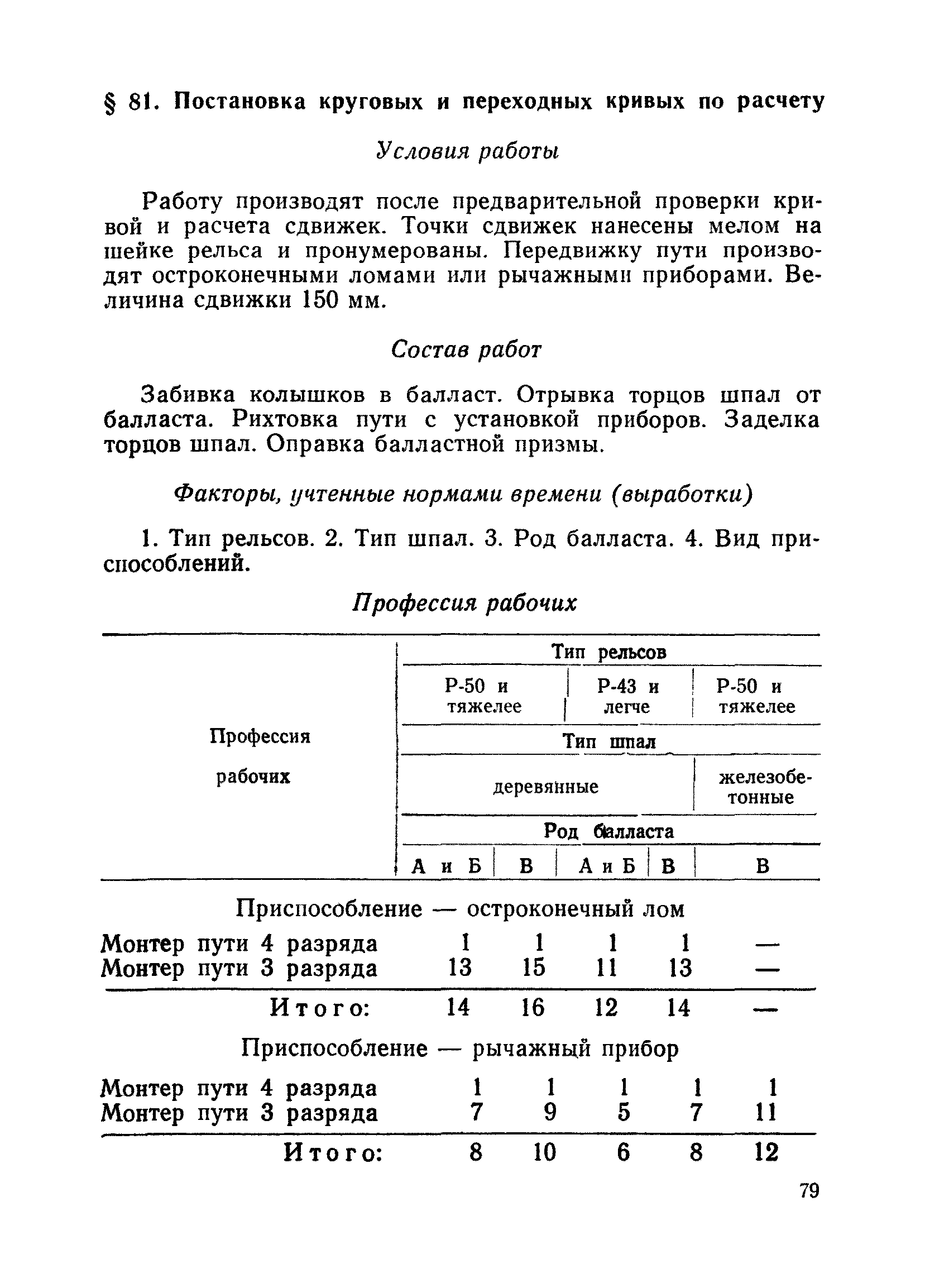 Единые нормы времени (выработки) на ремонт железнодорожного пути широкой колеи| Статус: | не действует | | Название рус.: | Единые нормы времени (выработки) на ремонт железнодорожного пути широкой колеи | | Дата добавления в базу: | 01.01.2018 | | Дата актуализации: | 01.01.2021 | | Область применения: | Единые нормы времени (выработки) были обязательны для применения во всех погрузочно-транспортных управлениях (объединениях) и других организациях Минуглепрома СССР, имеющих постоянные железнодорожные пути широкой колеи | | Оглавление: | Общая часть Техническая часть Нормативная часть Раздел I. Работы по земляному полотну § 1. Очистка кюветов вручную § 2. Уборка загрязненного балласта или грунта § 3. Работы, выполняемые путевым стругом § 4. Ручная срезка и планировка обочин § 5. Устройство и ремонт деревянного лотка § 6. Очистка нагорных канав Раздел II. Подготовительные работы на перегоне § 7. Срезка загрязненной корки балласта § 8. Вырезка балласта на глубину до нижней постели шпал § 9. Замена загрязненного балласта до нижней постели шпал § 10. Визирование пути § 11. Вырезка, прогрохотка и заброска в путь щебеночного балласта § 12. Выправка продольного профиля вручную с подрезкой загрязненного балласта ниже подошвы шпал § 13. Разборка вручную деревянного переездного настила § 14. Разборка вручную железобетонного переездного настила § 15. Разборка постоянного переездного настила кранами § 16. Снятие малых и больших путевых знаков § 17. Смазка стыковых болтов в пути Раздел III. Работы на звеносборочной базе § 18. Выгрузка деревянных шпал из полувагонов кранами § 19. Выгрузка деревянных шпал вручную § 20. Выгрузка железобетонных шпал из полувагонов кранами § 21. Погрузка деревянных шпал в полувагоны кранами § 22. Раскладка пакетов деревянных шпал на пути-шаблоне дрезиной АГМу § 23. Раскладка пакетов деревянных шпал на пути-шаблоне кранами § 24. Раскладка вручную шпал на пути-шаблоне при сборке рельсовых звеньев § 25. Забивка П-образных скоб § 26. Сверление костыльных отверстии в шпалах § 27. Комплектование закладных и клеммных болтов § 28. Раскладка прокладок § 29. Раскладка скреплений § 30. Раскладка рельсов длиной 25 м на подкладки погрузочными кранами § 31. Разметка мест положения осей шпал на шейке рельса § 32. Прикрепление рельсов к шпалам по шаблону на маячных шпалах § 33. Прикрепление рельсов к шпалам костылями (при помощи пневматического молотка типа ОМСП-5 или электропневматического костылезабивщика типа ЭПК-2 или ЭПК-3) § 34. Прикрепление подкладок к деревянным шпалам шурупами (вручную) § 35. Прикрепление подкладок к деревянным шпалам шурупами (при помощи шуруповерта типа ШВ-1) § 36. Прикрепление рельсов к подкладкам клеммными болтами при раздельном скреплении (при помощи шуруповерта типа ШВ-1) § 37. Прикрепление рельсов к шпалам при скреплении Типа КБ (при помощи шуруповерта типа ШВ-1) § 38. Прикрепление рельсов к шпалам при скреплении типа ЖБ (при помощи шурупно-гаечного ключа типа ШГК) § 39. Пришивка рельсов к шпалам вручную § 40. Прикрепление рельсов к шпалам при скреплении типа ЖБ (при помощи шуруповерта типа ШВ-1) § 41. Постановка противоугонов § 42. Укладка звеньев в штабель кранами § 43. Клеймение шпал § 44. Обрезка длинных шпал § 45. Постановка рельсовых стыков на графитовую мазь § 46. Обвязка концов шпал § 47. Погрузка рельсовых звеньев погрузочным краном ПКД (рельсовые звенья длиной 25 м 