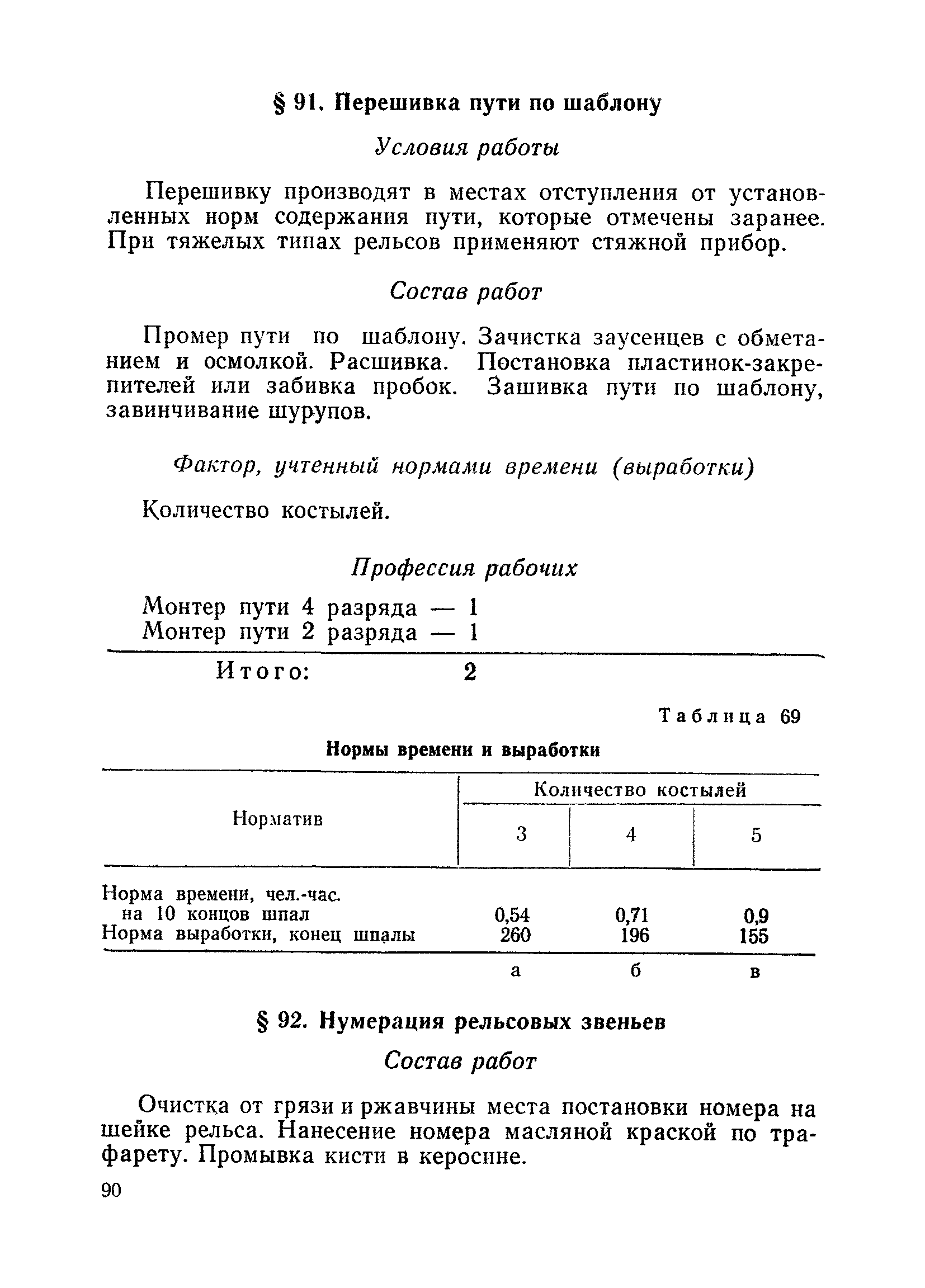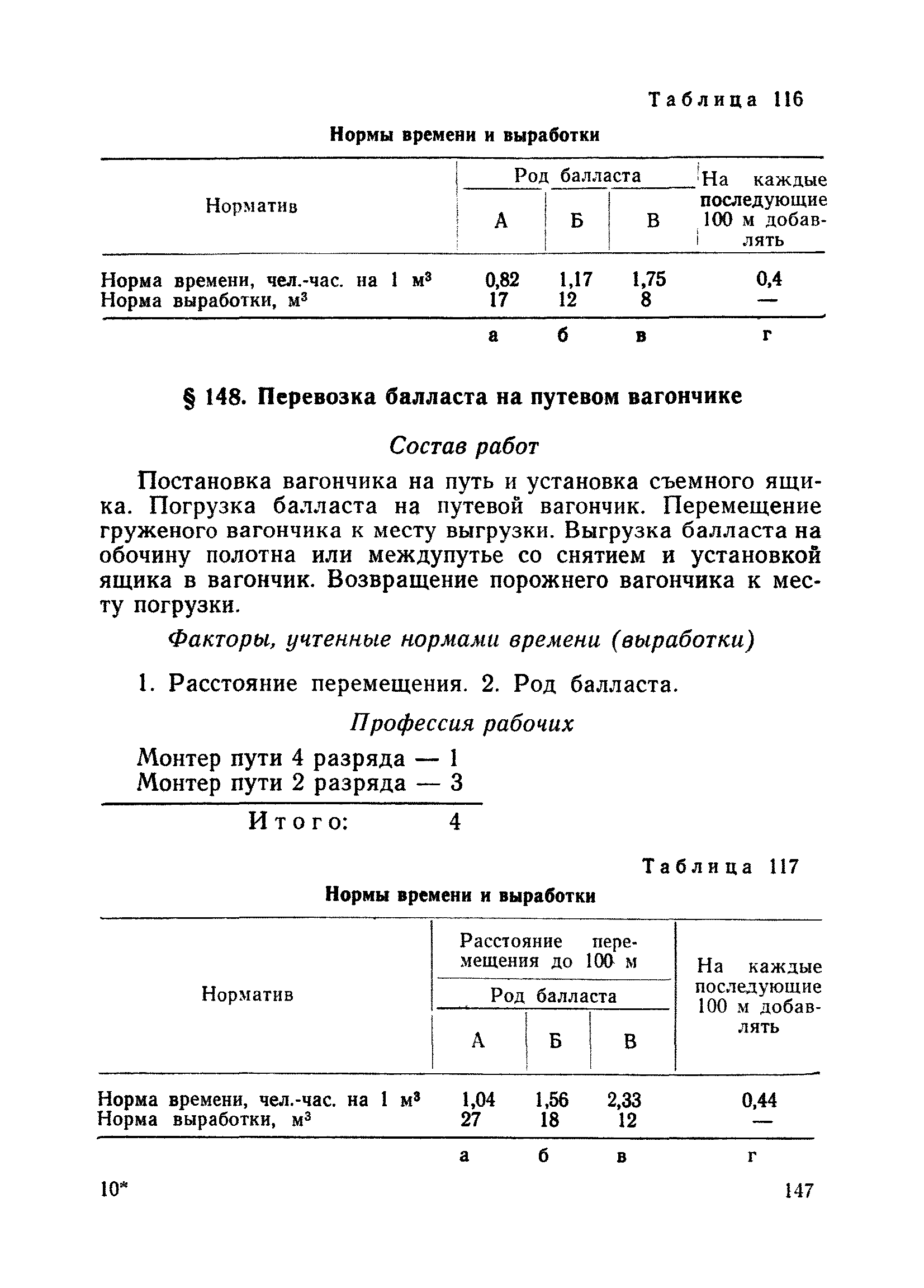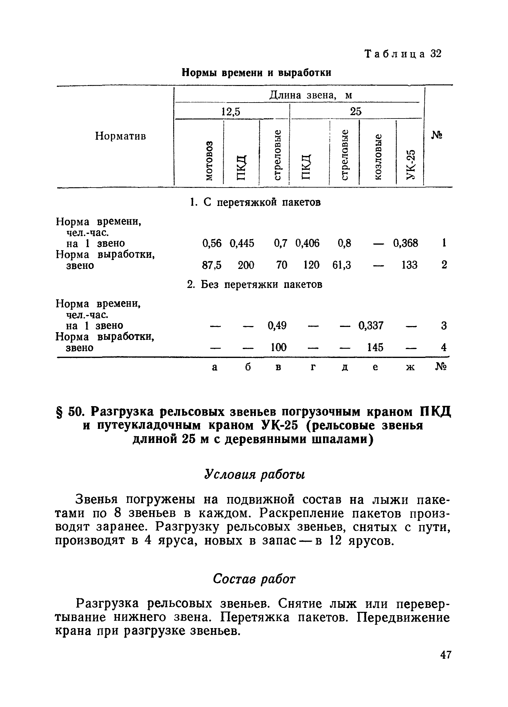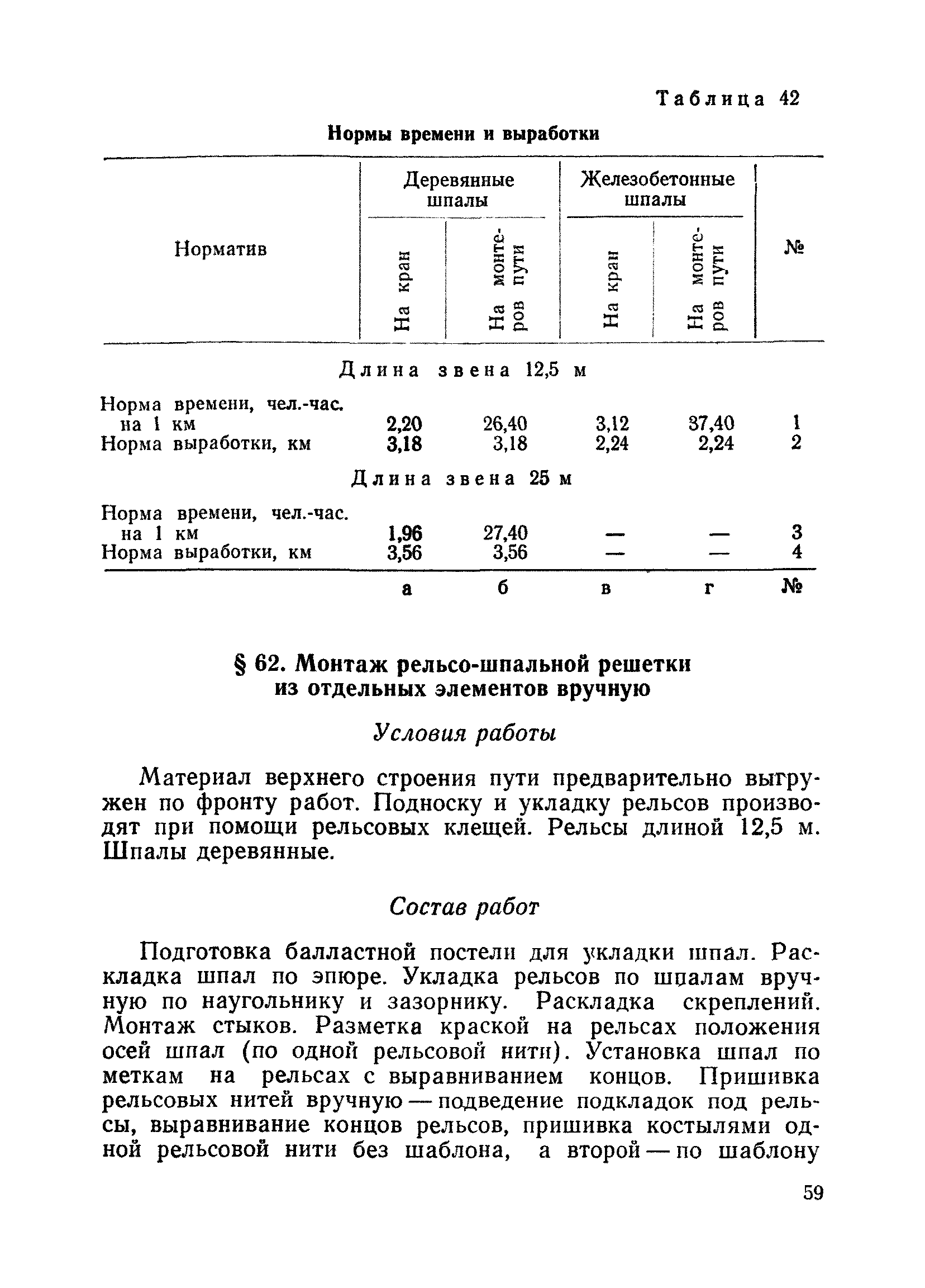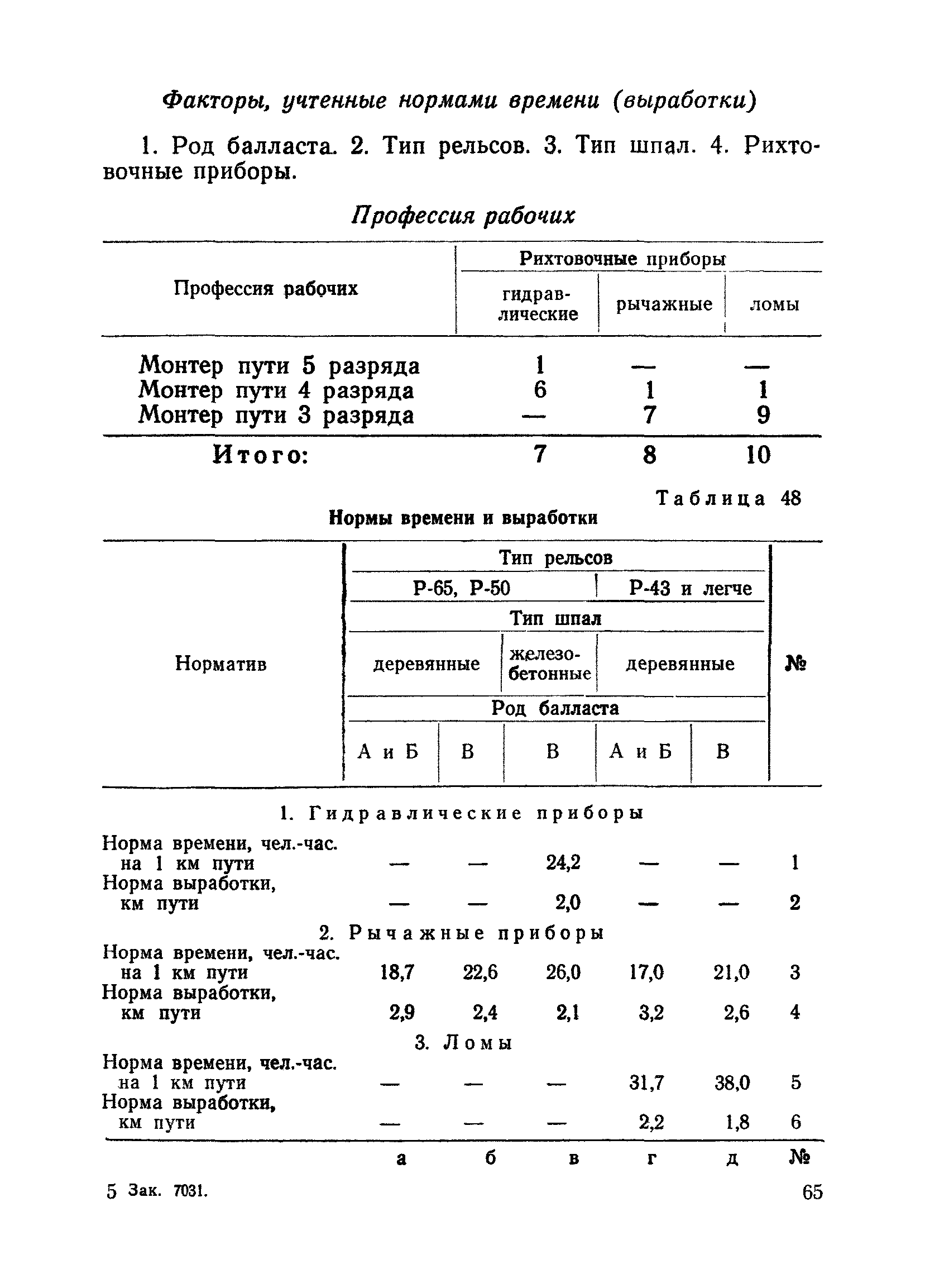 Единые нормы времени (выработки) на ремонт железнодорожного пути широкой колеи| Статус: | не действует | | Название рус.: | Единые нормы времени (выработки) на ремонт железнодорожного пути широкой колеи | | Дата добавления в базу: | 01.01.2018 | | Дата актуализации: | 01.01.2021 | | Область применения: | Единые нормы времени (выработки) были обязательны для применения во всех погрузочно-транспортных управлениях (объединениях) и других организациях Минуглепрома СССР, имеющих постоянные железнодорожные пути широкой колеи | | Оглавление: | Общая часть Техническая часть Нормативная часть Раздел I. Работы по земляному полотну § 1. Очистка кюветов вручную § 2. Уборка загрязненного балласта или грунта § 3. Работы, выполняемые путевым стругом § 4. Ручная срезка и планировка обочин § 5. Устройство и ремонт деревянного лотка § 6. Очистка нагорных канав Раздел II. Подготовительные работы на перегоне § 7. Срезка загрязненной корки балласта § 8. Вырезка балласта на глубину до нижней постели шпал § 9. Замена загрязненного балласта до нижней постели шпал § 10. Визирование пути § 11. Вырезка, прогрохотка и заброска в путь щебеночного балласта § 12. Выправка продольного профиля вручную с подрезкой загрязненного балласта ниже подошвы шпал § 13. Разборка вручную деревянного переездного настила § 14. Разборка вручную железобетонного переездного настила § 15. Разборка постоянного переездного настила кранами § 16. Снятие малых и больших путевых знаков § 17. Смазка стыковых болтов в пути Раздел III. Работы на звеносборочной базе § 18. Выгрузка деревянных шпал из полувагонов кранами § 19. Выгрузка деревянных шпал вручную § 20. Выгрузка железобетонных шпал из полувагонов кранами § 21. Погрузка деревянных шпал в полувагоны кранами § 22. Раскладка пакетов деревянных шпал на пути-шаблоне дрезиной АГМу § 23. Раскладка пакетов деревянных шпал на пути-шаблоне кранами § 24. Раскладка вручную шпал на пути-шаблоне при сборке рельсовых звеньев § 25. Забивка П-образных скоб § 26. Сверление костыльных отверстии в шпалах § 27. Комплектование закладных и клеммных болтов § 28. Раскладка прокладок § 29. Раскладка скреплений § 30. Раскладка рельсов длиной 25 м на подкладки погрузочными кранами § 31. Разметка мест положения осей шпал на шейке рельса § 32. Прикрепление рельсов к шпалам по шаблону на маячных шпалах § 33. Прикрепление рельсов к шпалам костылями (при помощи пневматического молотка типа ОМСП-5 или электропневматического костылезабивщика типа ЭПК-2 или ЭПК-3) § 34. Прикрепление подкладок к деревянным шпалам шурупами (вручную) § 35. Прикрепление подкладок к деревянным шпалам шурупами (при помощи шуруповерта типа ШВ-1) § 36. Прикрепление рельсов к подкладкам клеммными болтами при раздельном скреплении (при помощи шуруповерта типа ШВ-1) § 37. Прикрепление рельсов к шпалам при скреплении Типа КБ (при помощи шуруповерта типа ШВ-1) § 38. Прикрепление рельсов к шпалам при скреплении типа ЖБ (при помощи шурупно-гаечного ключа типа ШГК) § 39. Пришивка рельсов к шпалам вручную § 40. Прикрепление рельсов к шпалам при скреплении типа ЖБ (при помощи шуруповерта типа ШВ-1) § 41. Постановка противоугонов § 42. Укладка звеньев в штабель кранами § 43. Клеймение шпал § 44. Обрезка длинных шпал § 45. Постановка рельсовых стыков на графитовую мазь § 46. Обвязка концов шпал § 47. Погрузка рельсовых звеньев погрузочным краном ПКД (рельсовые звенья длиной 25 м 