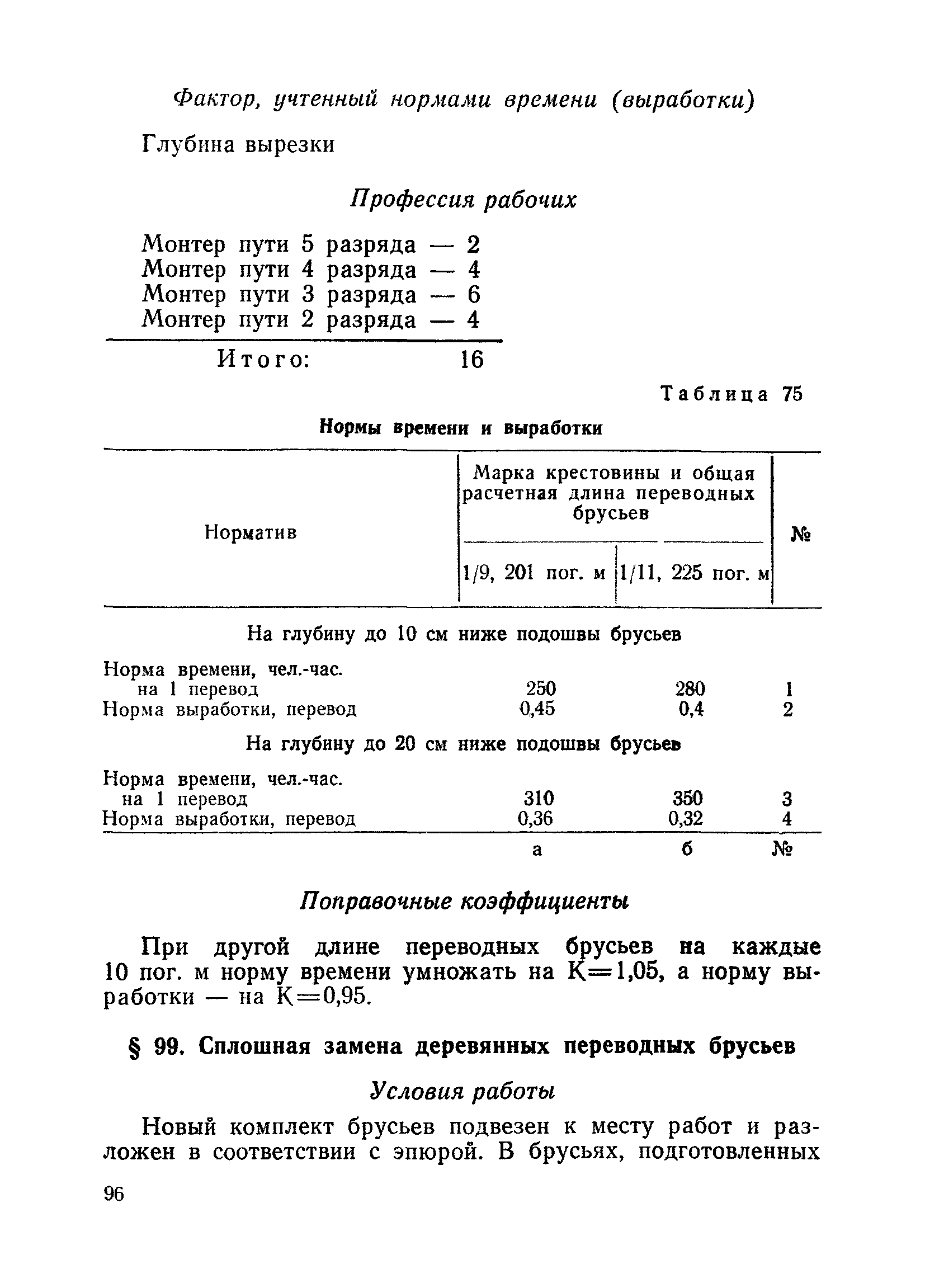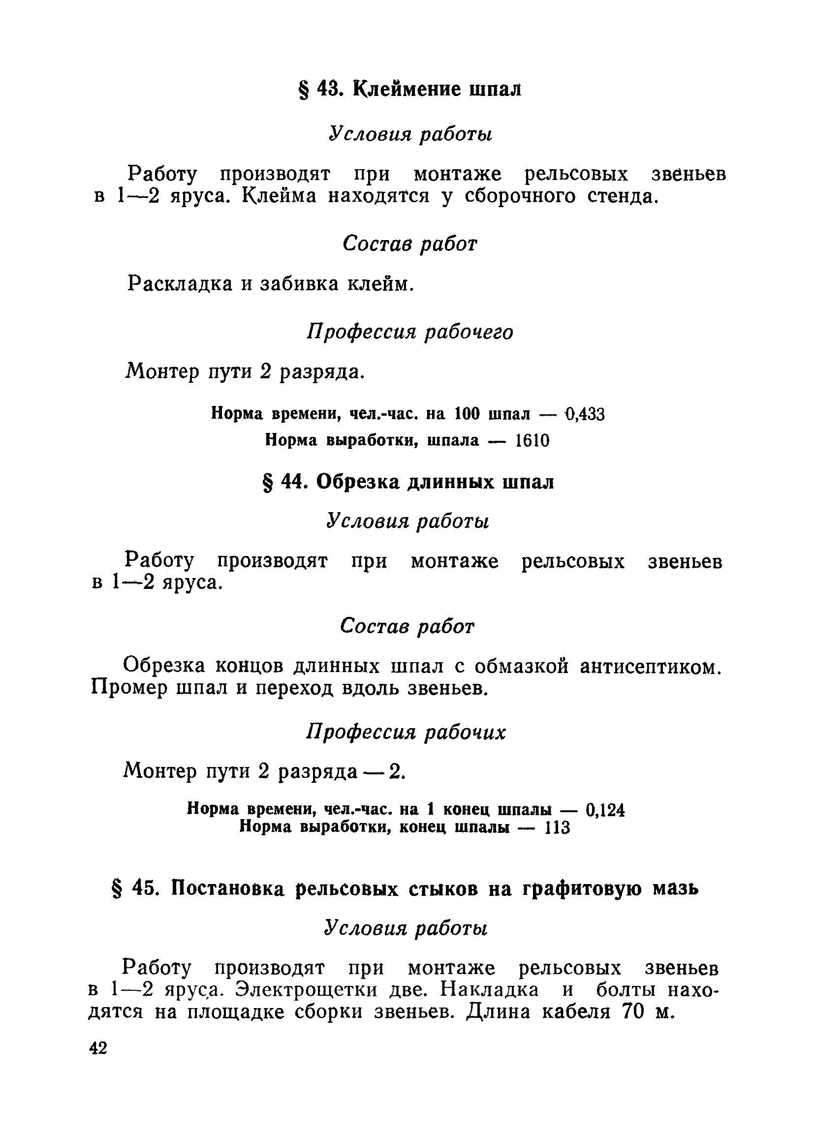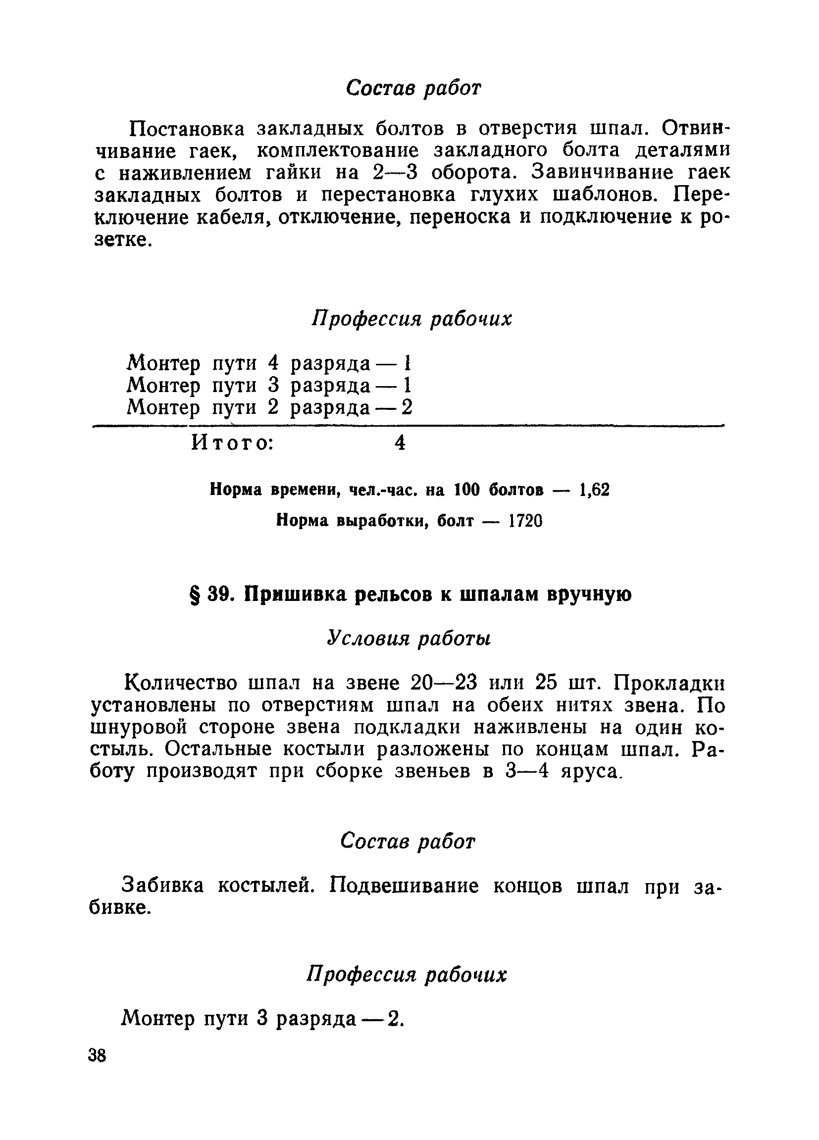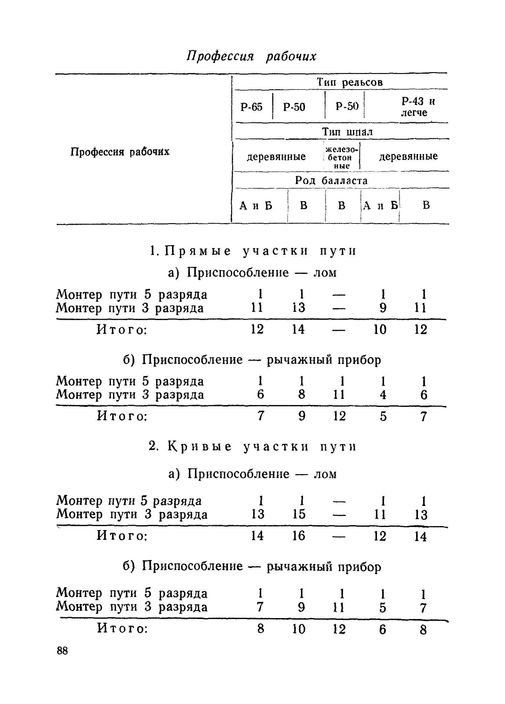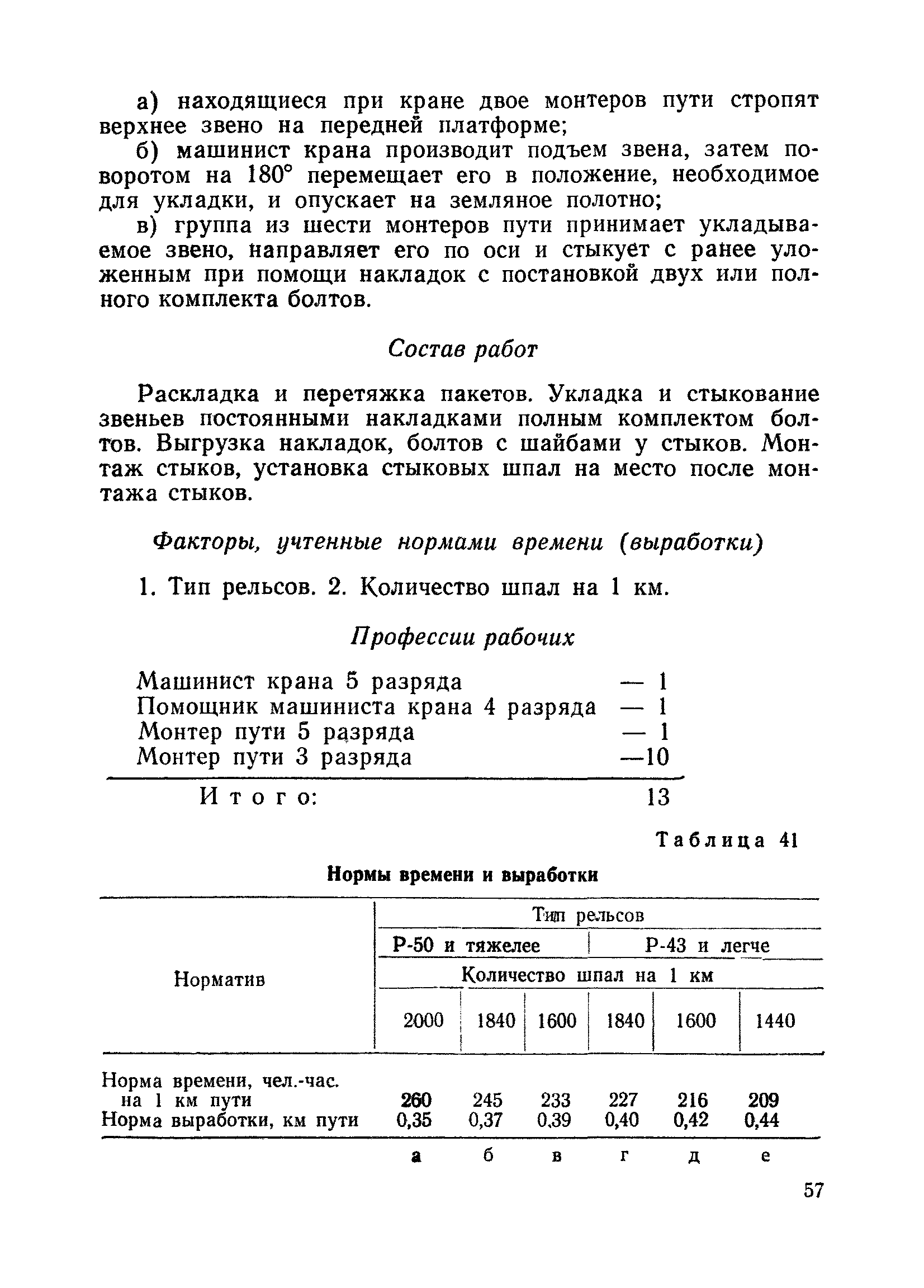 Единые нормы времени (выработки) на ремонт железнодорожного пути широкой колеи| Статус: | не действует | | Название рус.: | Единые нормы времени (выработки) на ремонт железнодорожного пути широкой колеи | | Дата добавления в базу: | 01.01.2018 | | Дата актуализации: | 01.01.2021 | | Область применения: | Единые нормы времени (выработки) были обязательны для применения во всех погрузочно-транспортных управлениях (объединениях) и других организациях Минуглепрома СССР, имеющих постоянные железнодорожные пути широкой колеи | | Оглавление: | Общая часть Техническая часть Нормативная часть Раздел I. Работы по земляному полотну § 1. Очистка кюветов вручную § 2. Уборка загрязненного балласта или грунта § 3. Работы, выполняемые путевым стругом § 4. Ручная срезка и планировка обочин § 5. Устройство и ремонт деревянного лотка § 6. Очистка нагорных канав Раздел II. Подготовительные работы на перегоне § 7. Срезка загрязненной корки балласта § 8. Вырезка балласта на глубину до нижней постели шпал § 9. Замена загрязненного балласта до нижней постели шпал § 10. Визирование пути § 11. Вырезка, прогрохотка и заброска в путь щебеночного балласта § 12. Выправка продольного профиля вручную с подрезкой загрязненного балласта ниже подошвы шпал § 13. Разборка вручную деревянного переездного настила § 14. Разборка вручную железобетонного переездного настила § 15. Разборка постоянного переездного настила кранами § 16. Снятие малых и больших путевых знаков § 17. Смазка стыковых болтов в пути Раздел III. Работы на звеносборочной базе § 18. Выгрузка деревянных шпал из полувагонов кранами § 19. Выгрузка деревянных шпал вручную § 20. Выгрузка железобетонных шпал из полувагонов кранами § 21. Погрузка деревянных шпал в полувагоны кранами § 22. Раскладка пакетов деревянных шпал на пути-шаблоне дрезиной АГМу § 23. Раскладка пакетов деревянных шпал на пути-шаблоне кранами § 24. Раскладка вручную шпал на пути-шаблоне при сборке рельсовых звеньев § 25. Забивка П-образных скоб § 26. Сверление костыльных отверстии в шпалах § 27. Комплектование закладных и клеммных болтов § 28. Раскладка прокладок § 29. Раскладка скреплений § 30. Раскладка рельсов длиной 25 м на подкладки погрузочными кранами § 31. Разметка мест положения осей шпал на шейке рельса § 32. Прикрепление рельсов к шпалам по шаблону на маячных шпалах § 33. Прикрепление рельсов к шпалам костылями (при помощи пневматического молотка типа ОМСП-5 или электропневматического костылезабивщика типа ЭПК-2 или ЭПК-3) § 34. Прикрепление подкладок к деревянным шпалам шурупами (вручную) § 35. Прикрепление подкладок к деревянным шпалам шурупами (при помощи шуруповерта типа ШВ-1) § 36. Прикрепление рельсов к подкладкам клеммными болтами при раздельном скреплении (при помощи шуруповерта типа ШВ-1) § 37. Прикрепление рельсов к шпалам при скреплении Типа КБ (при помощи шуруповерта типа ШВ-1) § 38. Прикрепление рельсов к шпалам при скреплении типа ЖБ (при помощи шурупно-гаечного ключа типа ШГК) § 39. Пришивка рельсов к шпалам вручную § 40. Прикрепление рельсов к шпалам при скреплении типа ЖБ (при помощи шуруповерта типа ШВ-1) § 41. Постановка противоугонов § 42. Укладка звеньев в штабель кранами § 43. Клеймение шпал § 44. Обрезка длинных шпал § 45. Постановка рельсовых стыков на графитовую мазь § 46. Обвязка концов шпал § 47. Погрузка рельсовых звеньев погрузочным краном ПКД (рельсовые звенья длиной 25 м 