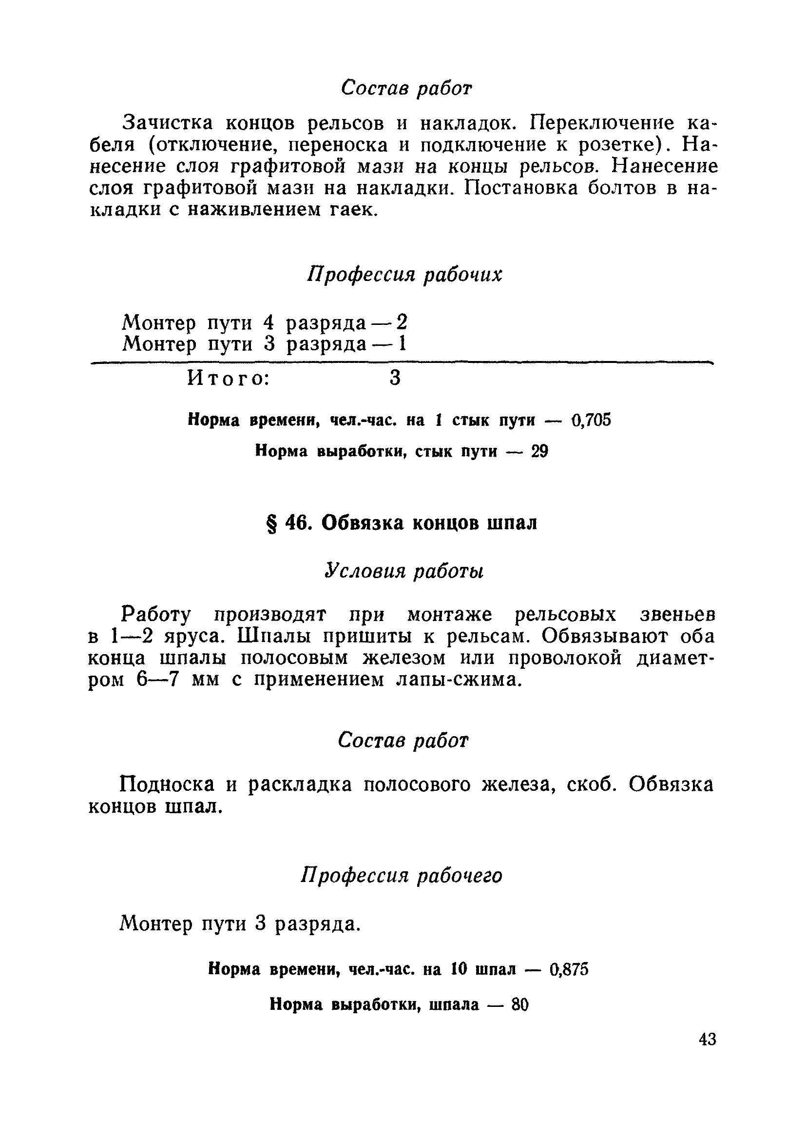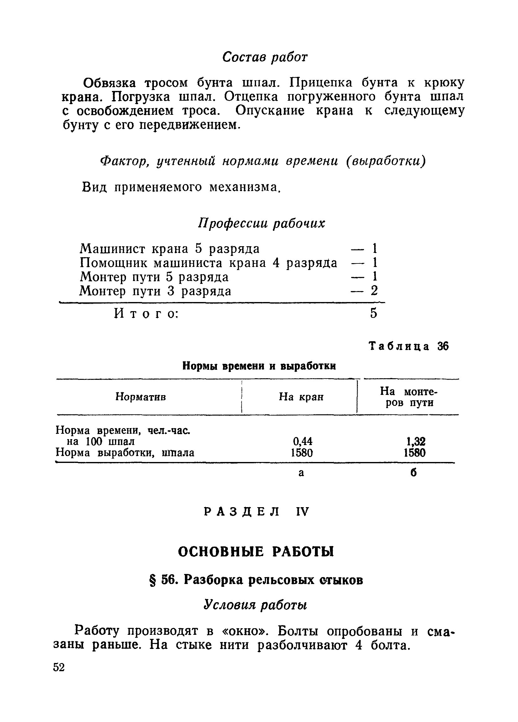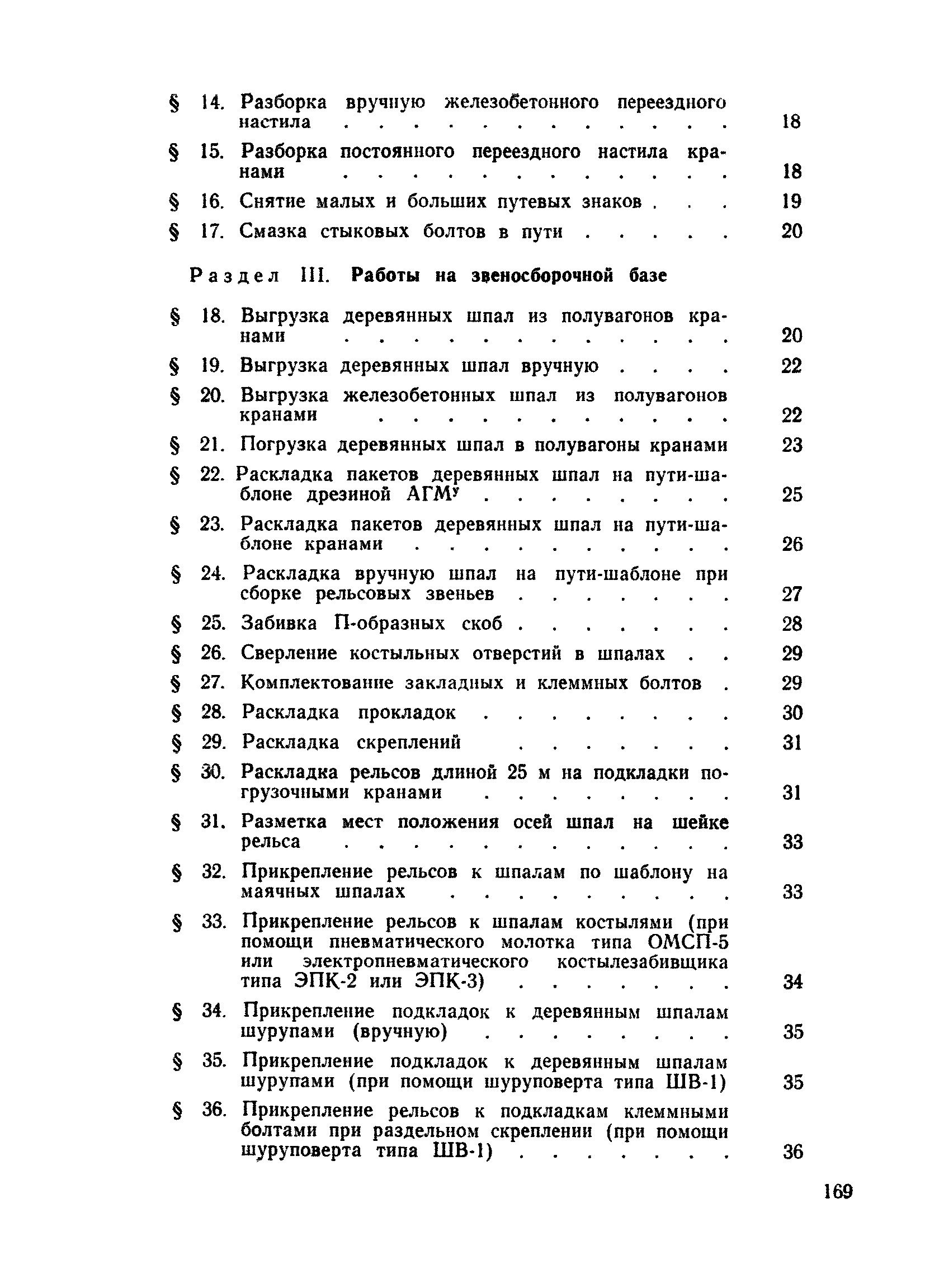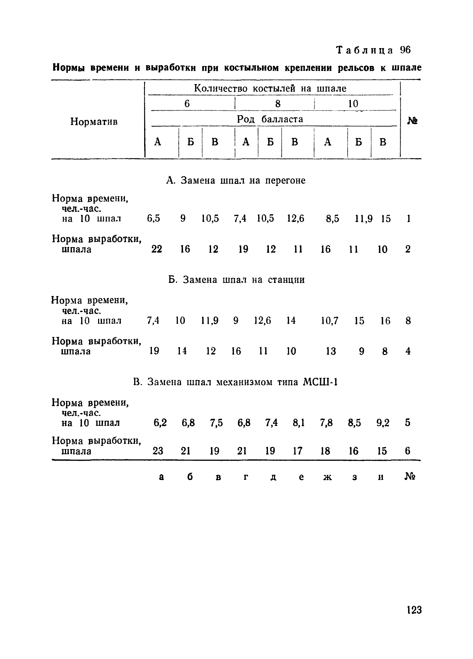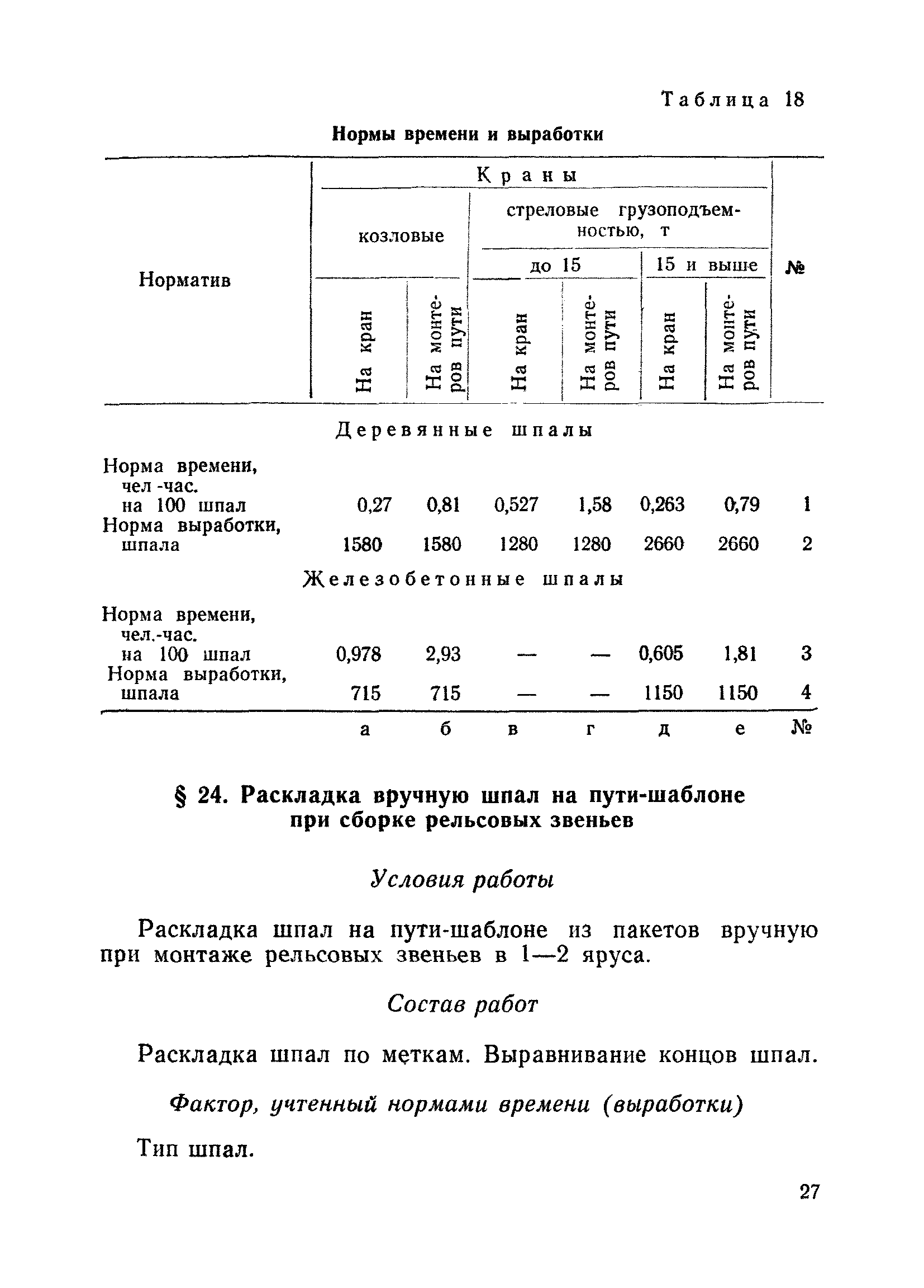 Единые нормы времени (выработки) на ремонт железнодорожного пути широкой колеи| Статус: | не действует | | Название рус.: | Единые нормы времени (выработки) на ремонт железнодорожного пути широкой колеи | | Дата добавления в базу: | 01.01.2018 | | Дата актуализации: | 01.01.2021 | | Область применения: | Единые нормы времени (выработки) были обязательны для применения во всех погрузочно-транспортных управлениях (объединениях) и других организациях Минуглепрома СССР, имеющих постоянные железнодорожные пути широкой колеи | | Оглавление: | Общая часть Техническая часть Нормативная часть Раздел I. Работы по земляному полотну § 1. Очистка кюветов вручную § 2. Уборка загрязненного балласта или грунта § 3. Работы, выполняемые путевым стругом § 4. Ручная срезка и планировка обочин § 5. Устройство и ремонт деревянного лотка § 6. Очистка нагорных канав Раздел II. Подготовительные работы на перегоне § 7. Срезка загрязненной корки балласта § 8. Вырезка балласта на глубину до нижней постели шпал § 9. Замена загрязненного балласта до нижней постели шпал § 10. Визирование пути § 11. Вырезка, прогрохотка и заброска в путь щебеночного балласта § 12. Выправка продольного профиля вручную с подрезкой загрязненного балласта ниже подошвы шпал § 13. Разборка вручную деревянного переездного настила § 14. Разборка вручную железобетонного переездного настила § 15. Разборка постоянного переездного настила кранами § 16. Снятие малых и больших путевых знаков § 17. Смазка стыковых болтов в пути Раздел III. Работы на звеносборочной базе § 18. Выгрузка деревянных шпал из полувагонов кранами § 19. Выгрузка деревянных шпал вручную § 20. Выгрузка железобетонных шпал из полувагонов кранами § 21. Погрузка деревянных шпал в полувагоны кранами § 22. Раскладка пакетов деревянных шпал на пути-шаблоне дрезиной АГМу § 23. Раскладка пакетов деревянных шпал на пути-шаблоне кранами § 24. Раскладка вручную шпал на пути-шаблоне при сборке рельсовых звеньев § 25. Забивка П-образных скоб § 26. Сверление костыльных отверстии в шпалах § 27. Комплектование закладных и клеммных болтов § 28. Раскладка прокладок § 29. Раскладка скреплений § 30. Раскладка рельсов длиной 25 м на подкладки погрузочными кранами § 31. Разметка мест положения осей шпал на шейке рельса § 32. Прикрепление рельсов к шпалам по шаблону на маячных шпалах § 33. Прикрепление рельсов к шпалам костылями (при помощи пневматического молотка типа ОМСП-5 или электропневматического костылезабивщика типа ЭПК-2 или ЭПК-3) § 34. Прикрепление подкладок к деревянным шпалам шурупами (вручную) § 35. Прикрепление подкладок к деревянным шпалам шурупами (при помощи шуруповерта типа ШВ-1) § 36. Прикрепление рельсов к подкладкам клеммными болтами при раздельном скреплении (при помощи шуруповерта типа ШВ-1) § 37. Прикрепление рельсов к шпалам при скреплении Типа КБ (при помощи шуруповерта типа ШВ-1) § 38. Прикрепление рельсов к шпалам при скреплении типа ЖБ (при помощи шурупно-гаечного ключа типа ШГК) § 39. Пришивка рельсов к шпалам вручную § 40. Прикрепление рельсов к шпалам при скреплении типа ЖБ (при помощи шуруповерта типа ШВ-1) § 41. Постановка противоугонов § 42. Укладка звеньев в штабель кранами § 43. Клеймение шпал § 44. Обрезка длинных шпал § 45. Постановка рельсовых стыков на графитовую мазь § 46. Обвязка концов шпал § 47. Погрузка рельсовых звеньев погрузочным краном ПКД (рельсовые звенья длиной 25 м 