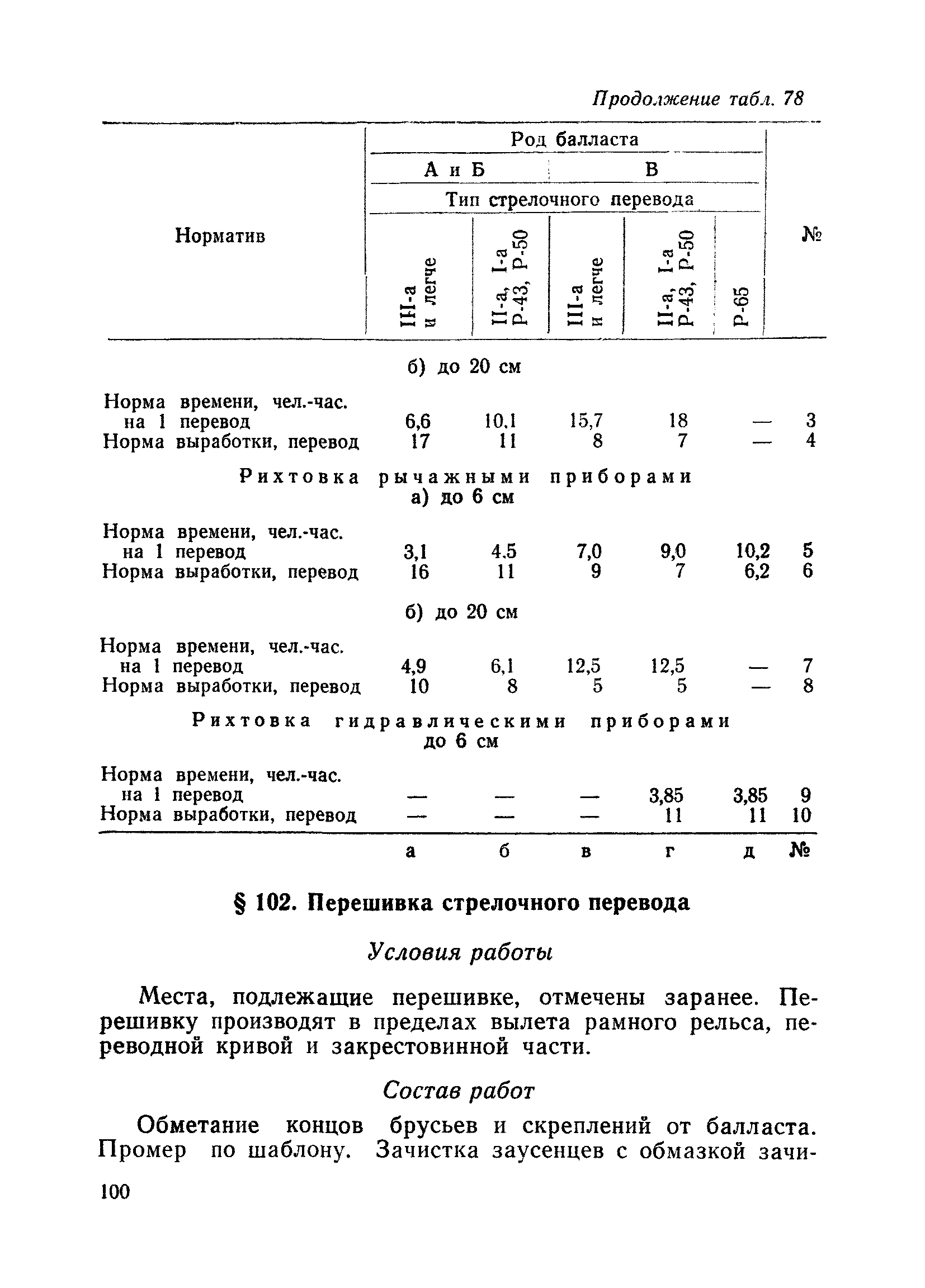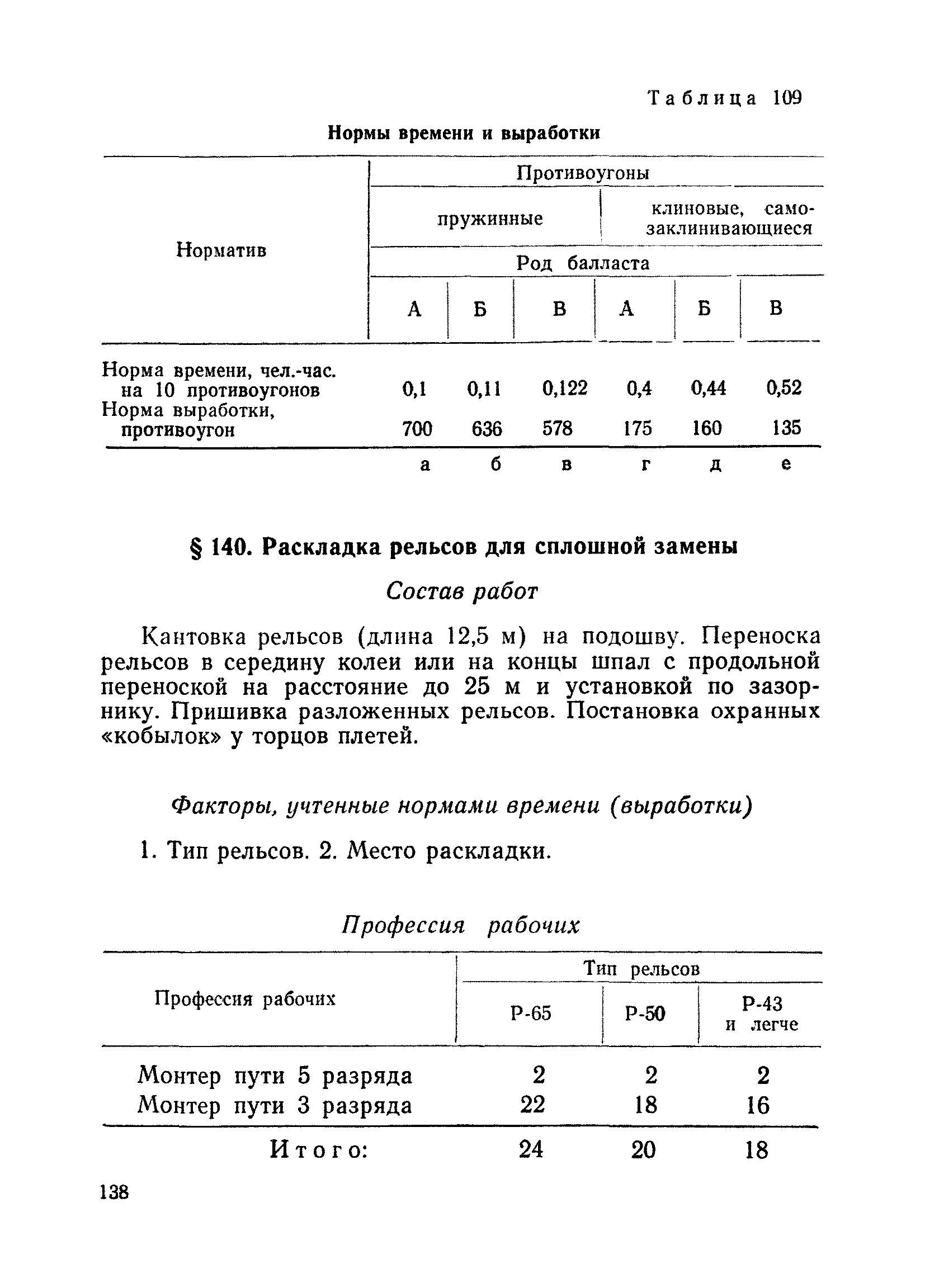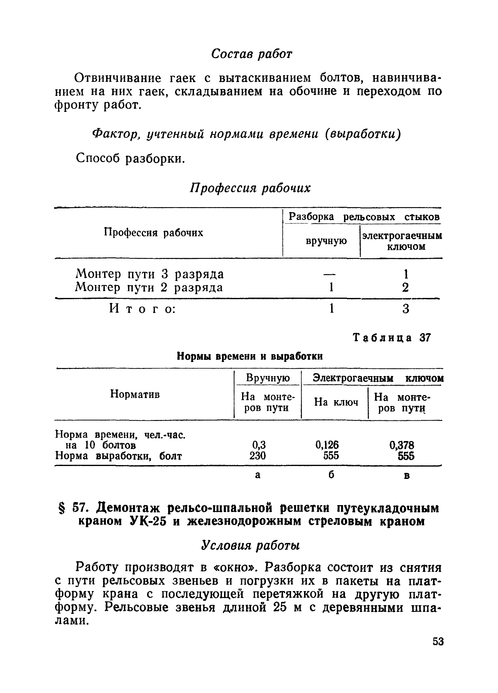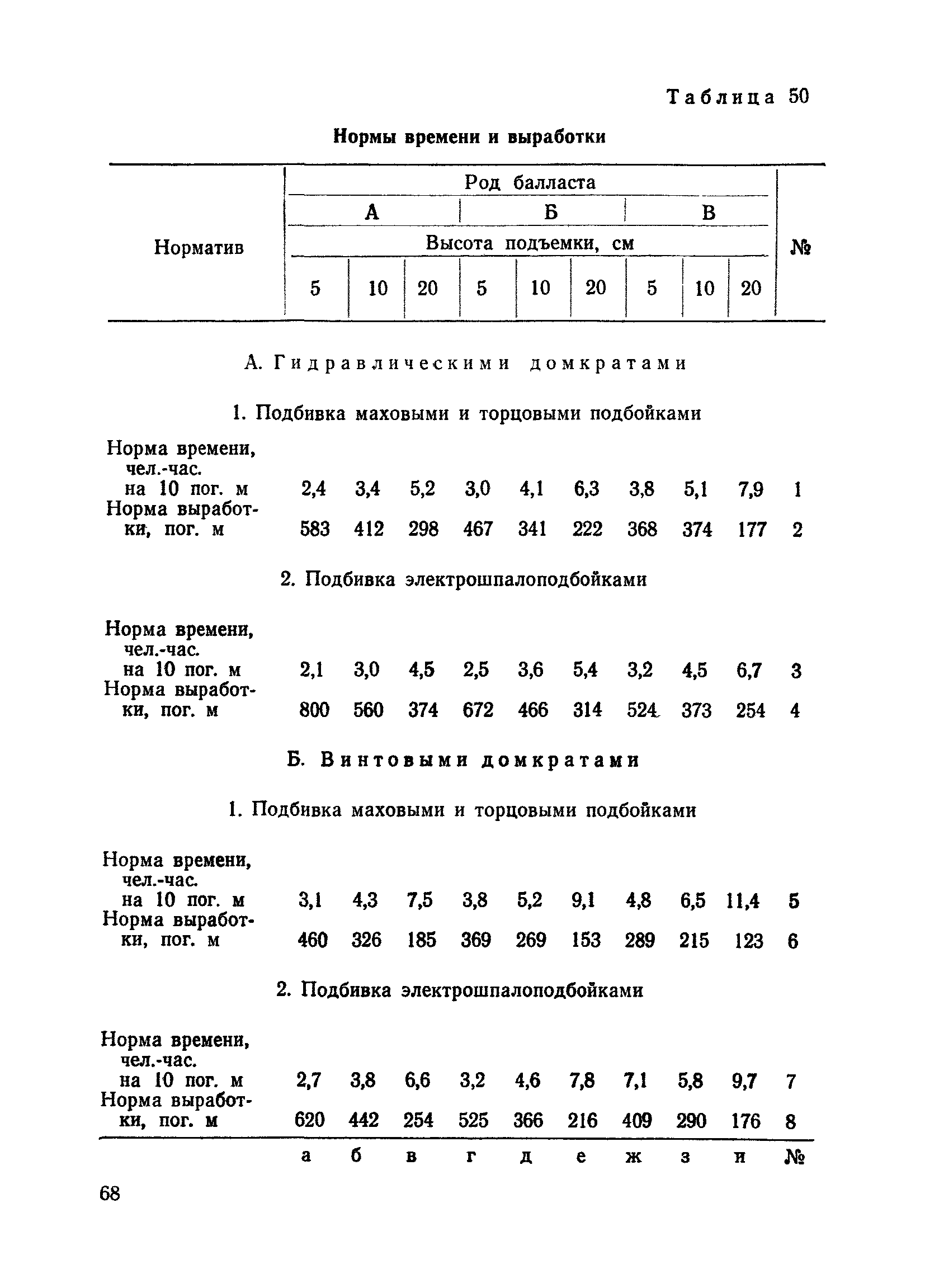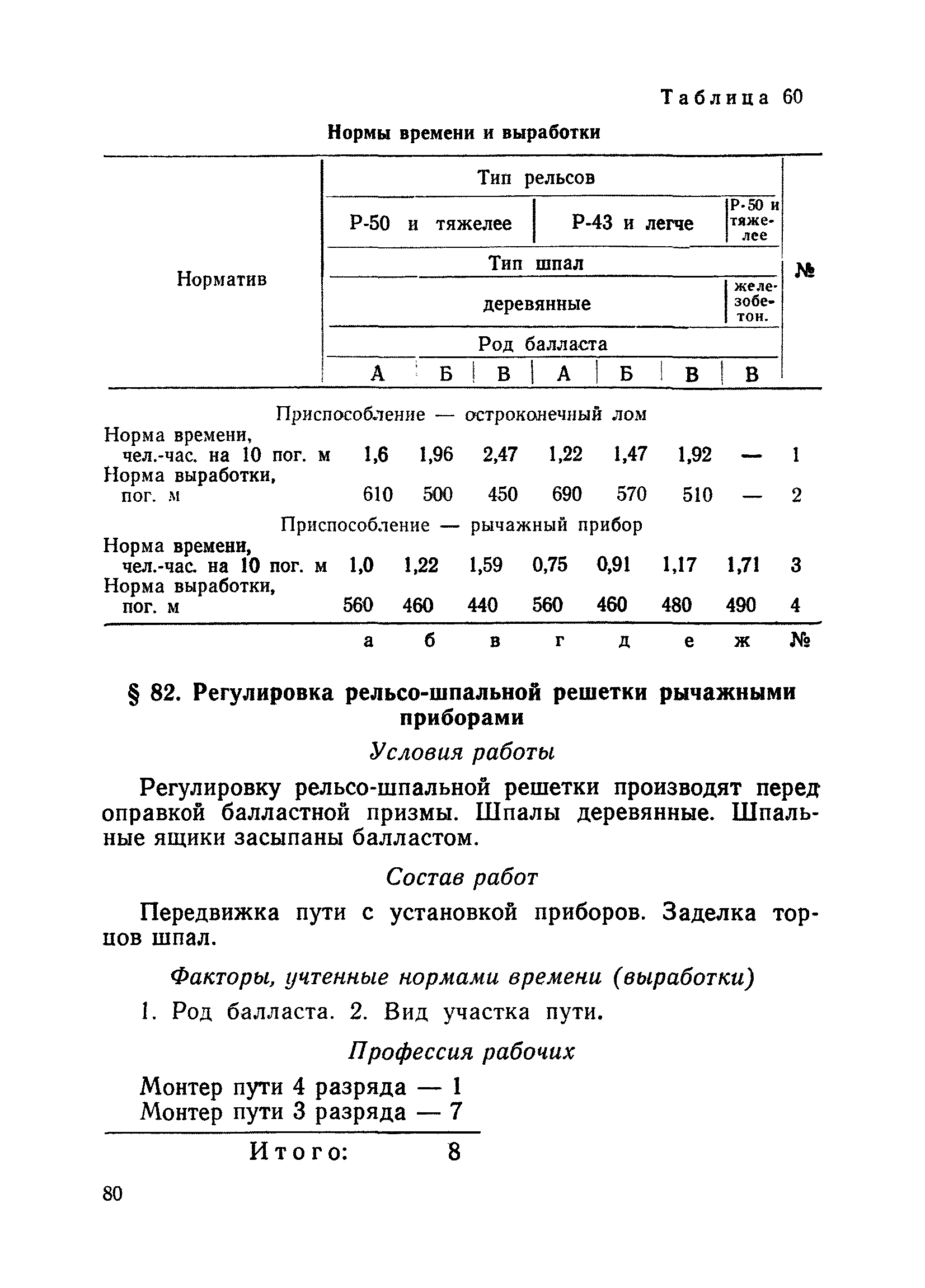 Единые нормы времени (выработки) на ремонт железнодорожного пути широкой колеи| Статус: | не действует | | Название рус.: | Единые нормы времени (выработки) на ремонт железнодорожного пути широкой колеи | | Дата добавления в базу: | 01.01.2018 | | Дата актуализации: | 01.01.2021 | | Область применения: | Единые нормы времени (выработки) были обязательны для применения во всех погрузочно-транспортных управлениях (объединениях) и других организациях Минуглепрома СССР, имеющих постоянные железнодорожные пути широкой колеи | | Оглавление: | Общая часть Техническая часть Нормативная часть Раздел I. Работы по земляному полотну § 1. Очистка кюветов вручную § 2. Уборка загрязненного балласта или грунта § 3. Работы, выполняемые путевым стругом § 4. Ручная срезка и планировка обочин § 5. Устройство и ремонт деревянного лотка § 6. Очистка нагорных канав Раздел II. Подготовительные работы на перегоне § 7. Срезка загрязненной корки балласта § 8. Вырезка балласта на глубину до нижней постели шпал § 9. Замена загрязненного балласта до нижней постели шпал § 10. Визирование пути § 11. Вырезка, прогрохотка и заброска в путь щебеночного балласта § 12. Выправка продольного профиля вручную с подрезкой загрязненного балласта ниже подошвы шпал § 13. Разборка вручную деревянного переездного настила § 14. Разборка вручную железобетонного переездного настила § 15. Разборка постоянного переездного настила кранами § 16. Снятие малых и больших путевых знаков § 17. Смазка стыковых болтов в пути Раздел III. Работы на звеносборочной базе § 18. Выгрузка деревянных шпал из полувагонов кранами § 19. Выгрузка деревянных шпал вручную § 20. Выгрузка железобетонных шпал из полувагонов кранами § 21. Погрузка деревянных шпал в полувагоны кранами § 22. Раскладка пакетов деревянных шпал на пути-шаблоне дрезиной АГМу § 23. Раскладка пакетов деревянных шпал на пути-шаблоне кранами § 24. Раскладка вручную шпал на пути-шаблоне при сборке рельсовых звеньев § 25. Забивка П-образных скоб § 26. Сверление костыльных отверстии в шпалах § 27. Комплектование закладных и клеммных болтов § 28. Раскладка прокладок § 29. Раскладка скреплений § 30. Раскладка рельсов длиной 25 м на подкладки погрузочными кранами § 31. Разметка мест положения осей шпал на шейке рельса § 32. Прикрепление рельсов к шпалам по шаблону на маячных шпалах § 33. Прикрепление рельсов к шпалам костылями (при помощи пневматического молотка типа ОМСП-5 или электропневматического костылезабивщика типа ЭПК-2 или ЭПК-3) § 34. Прикрепление подкладок к деревянным шпалам шурупами (вручную) § 35. Прикрепление подкладок к деревянным шпалам шурупами (при помощи шуруповерта типа ШВ-1) § 36. Прикрепление рельсов к подкладкам клеммными болтами при раздельном скреплении (при помощи шуруповерта типа ШВ-1) § 37. Прикрепление рельсов к шпалам при скреплении Типа КБ (при помощи шуруповерта типа ШВ-1) § 38. Прикрепление рельсов к шпалам при скреплении типа ЖБ (при помощи шурупно-гаечного ключа типа ШГК) § 39. Пришивка рельсов к шпалам вручную § 40. Прикрепление рельсов к шпалам при скреплении типа ЖБ (при помощи шуруповерта типа ШВ-1) § 41. Постановка противоугонов § 42. Укладка звеньев в штабель кранами § 43. Клеймение шпал § 44. Обрезка длинных шпал § 45. Постановка рельсовых стыков на графитовую мазь § 46. Обвязка концов шпал § 47. Погрузка рельсовых звеньев погрузочным краном ПКД (рельсовые звенья длиной 25 м 