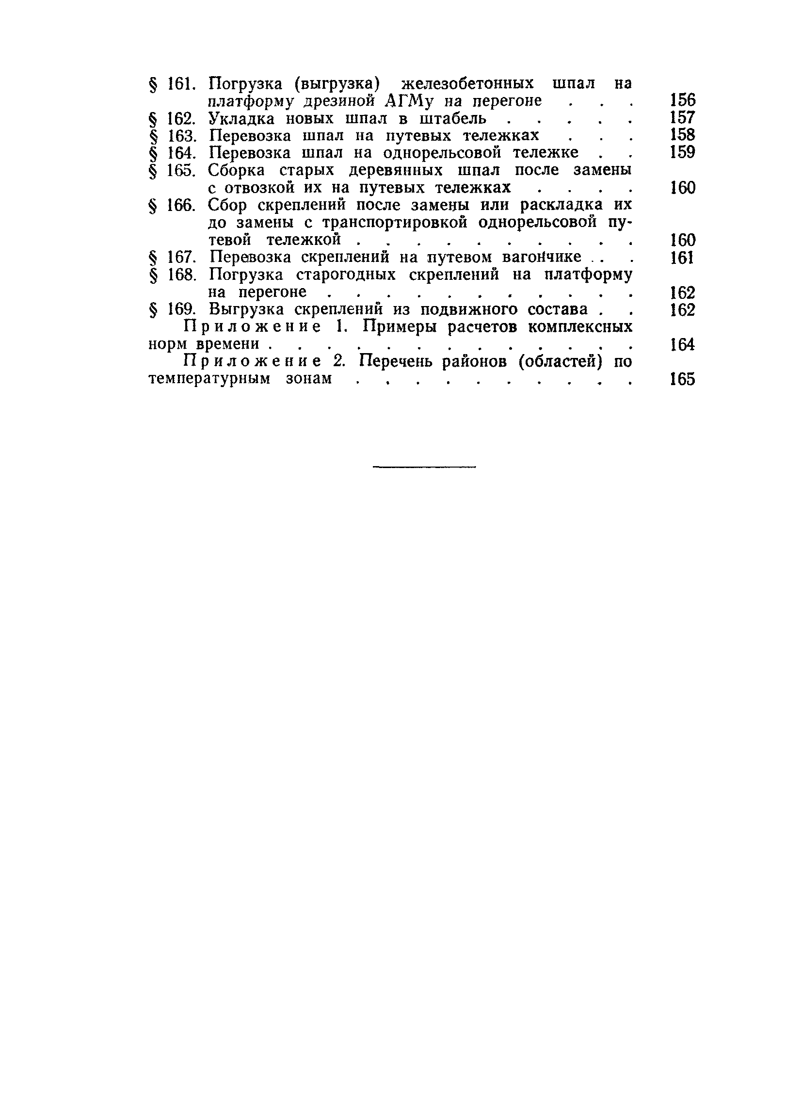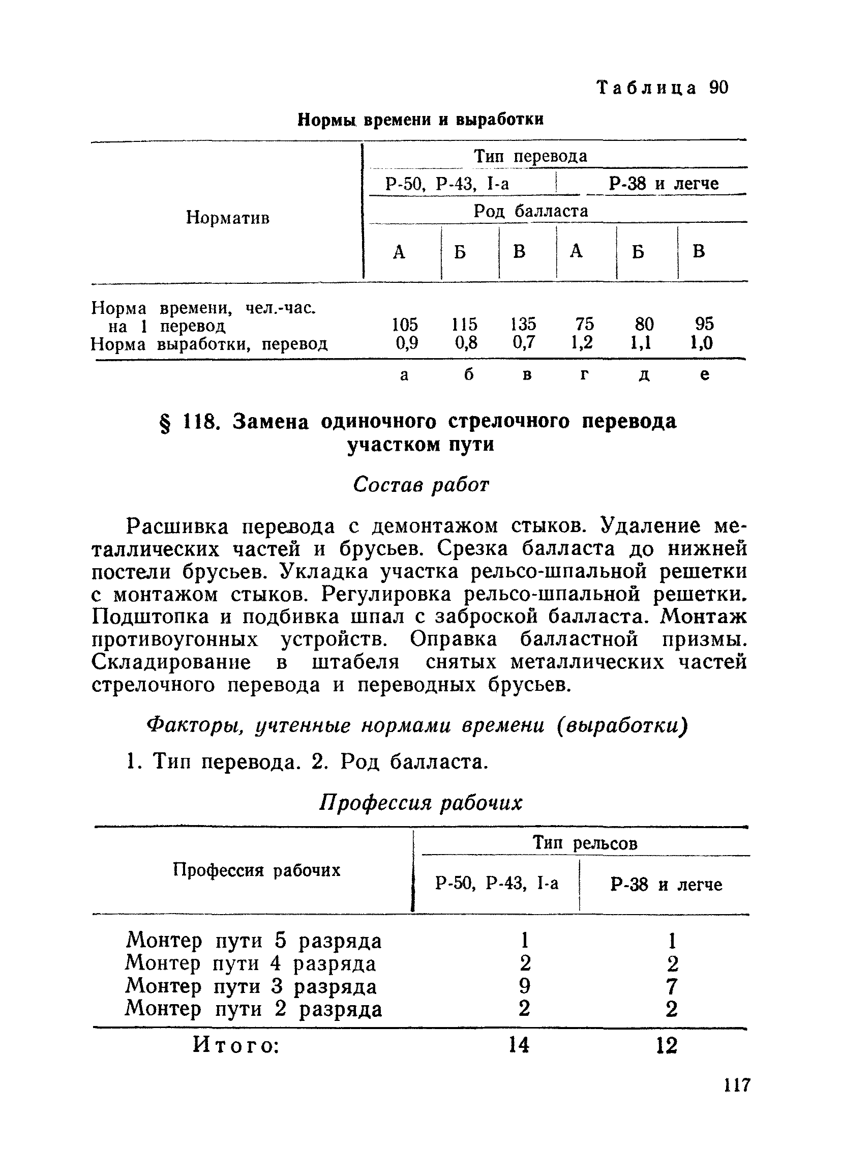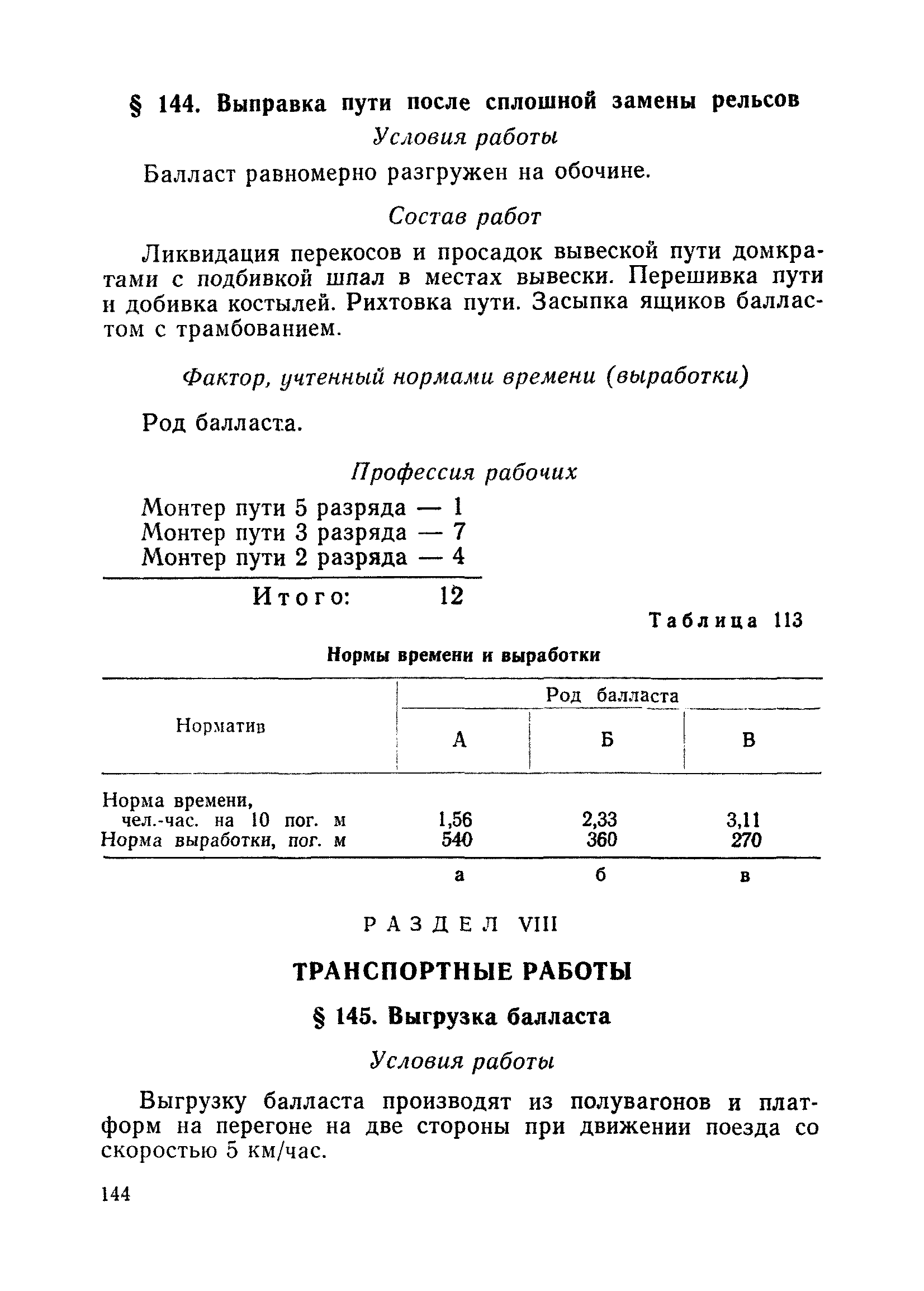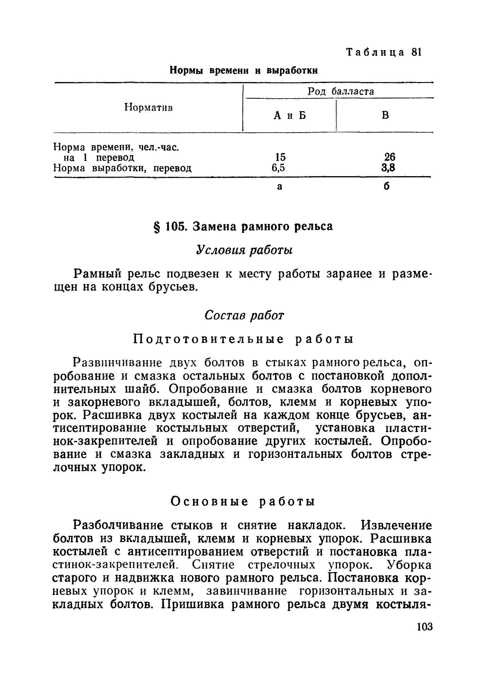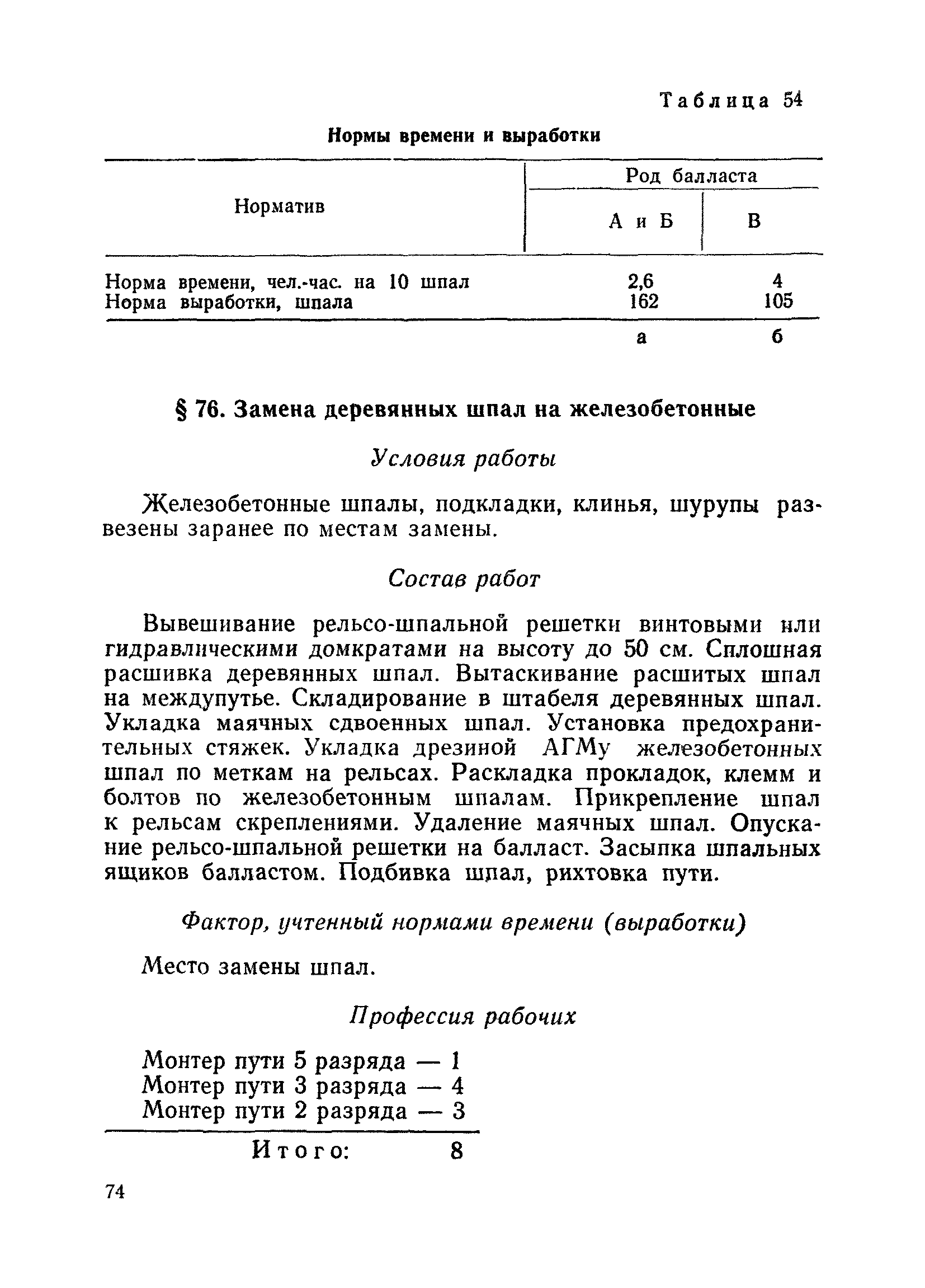 Единые нормы времени (выработки) на ремонт железнодорожного пути широкой колеи| Статус: | не действует | | Название рус.: | Единые нормы времени (выработки) на ремонт железнодорожного пути широкой колеи | | Дата добавления в базу: | 01.01.2018 | | Дата актуализации: | 01.01.2021 | | Область применения: | Единые нормы времени (выработки) были обязательны для применения во всех погрузочно-транспортных управлениях (объединениях) и других организациях Минуглепрома СССР, имеющих постоянные железнодорожные пути широкой колеи | | Оглавление: | Общая часть Техническая часть Нормативная часть Раздел I. Работы по земляному полотну § 1. Очистка кюветов вручную § 2. Уборка загрязненного балласта или грунта § 3. Работы, выполняемые путевым стругом § 4. Ручная срезка и планировка обочин § 5. Устройство и ремонт деревянного лотка § 6. Очистка нагорных канав Раздел II. Подготовительные работы на перегоне § 7. Срезка загрязненной корки балласта § 8. Вырезка балласта на глубину до нижней постели шпал § 9. Замена загрязненного балласта до нижней постели шпал § 10. Визирование пути § 11. Вырезка, прогрохотка и заброска в путь щебеночного балласта § 12. Выправка продольного профиля вручную с подрезкой загрязненного балласта ниже подошвы шпал § 13. Разборка вручную деревянного переездного настила § 14. Разборка вручную железобетонного переездного настила § 15. Разборка постоянного переездного настила кранами § 16. Снятие малых и больших путевых знаков § 17. Смазка стыковых болтов в пути Раздел III. Работы на звеносборочной базе § 18. Выгрузка деревянных шпал из полувагонов кранами § 19. Выгрузка деревянных шпал вручную § 20. Выгрузка железобетонных шпал из полувагонов кранами § 21. Погрузка деревянных шпал в полувагоны кранами § 22. Раскладка пакетов деревянных шпал на пути-шаблоне дрезиной АГМу § 23. Раскладка пакетов деревянных шпал на пути-шаблоне кранами § 24. Раскладка вручную шпал на пути-шаблоне при сборке рельсовых звеньев § 25. Забивка П-образных скоб § 26. Сверление костыльных отверстии в шпалах § 27. Комплектование закладных и клеммных болтов § 28. Раскладка прокладок § 29. Раскладка скреплений § 30. Раскладка рельсов длиной 25 м на подкладки погрузочными кранами § 31. Разметка мест положения осей шпал на шейке рельса § 32. Прикрепление рельсов к шпалам по шаблону на маячных шпалах § 33. Прикрепление рельсов к шпалам костылями (при помощи пневматического молотка типа ОМСП-5 или электропневматического костылезабивщика типа ЭПК-2 или ЭПК-3) § 34. Прикрепление подкладок к деревянным шпалам шурупами (вручную) § 35. Прикрепление подкладок к деревянным шпалам шурупами (при помощи шуруповерта типа ШВ-1) § 36. Прикрепление рельсов к подкладкам клеммными болтами при раздельном скреплении (при помощи шуруповерта типа ШВ-1) § 37. Прикрепление рельсов к шпалам при скреплении Типа КБ (при помощи шуруповерта типа ШВ-1) § 38. Прикрепление рельсов к шпалам при скреплении типа ЖБ (при помощи шурупно-гаечного ключа типа ШГК) § 39. Пришивка рельсов к шпалам вручную § 40. Прикрепление рельсов к шпалам при скреплении типа ЖБ (при помощи шуруповерта типа ШВ-1) § 41. Постановка противоугонов § 42. Укладка звеньев в штабель кранами § 43. Клеймение шпал § 44. Обрезка длинных шпал § 45. Постановка рельсовых стыков на графитовую мазь § 46. Обвязка концов шпал § 47. Погрузка рельсовых звеньев погрузочным краном ПКД (рельсовые звенья длиной 25 м 