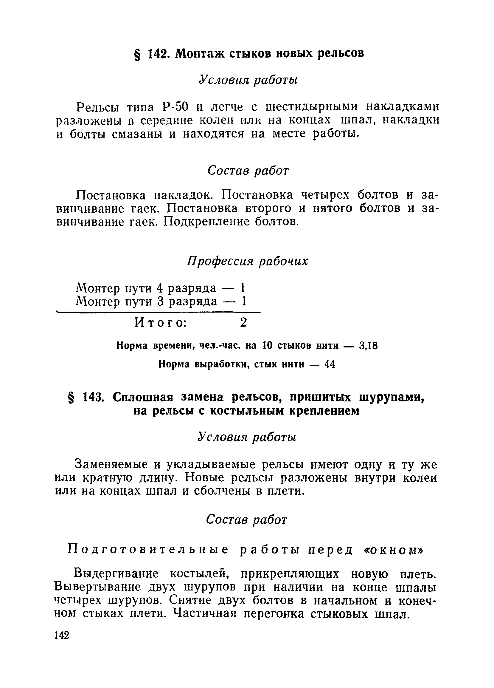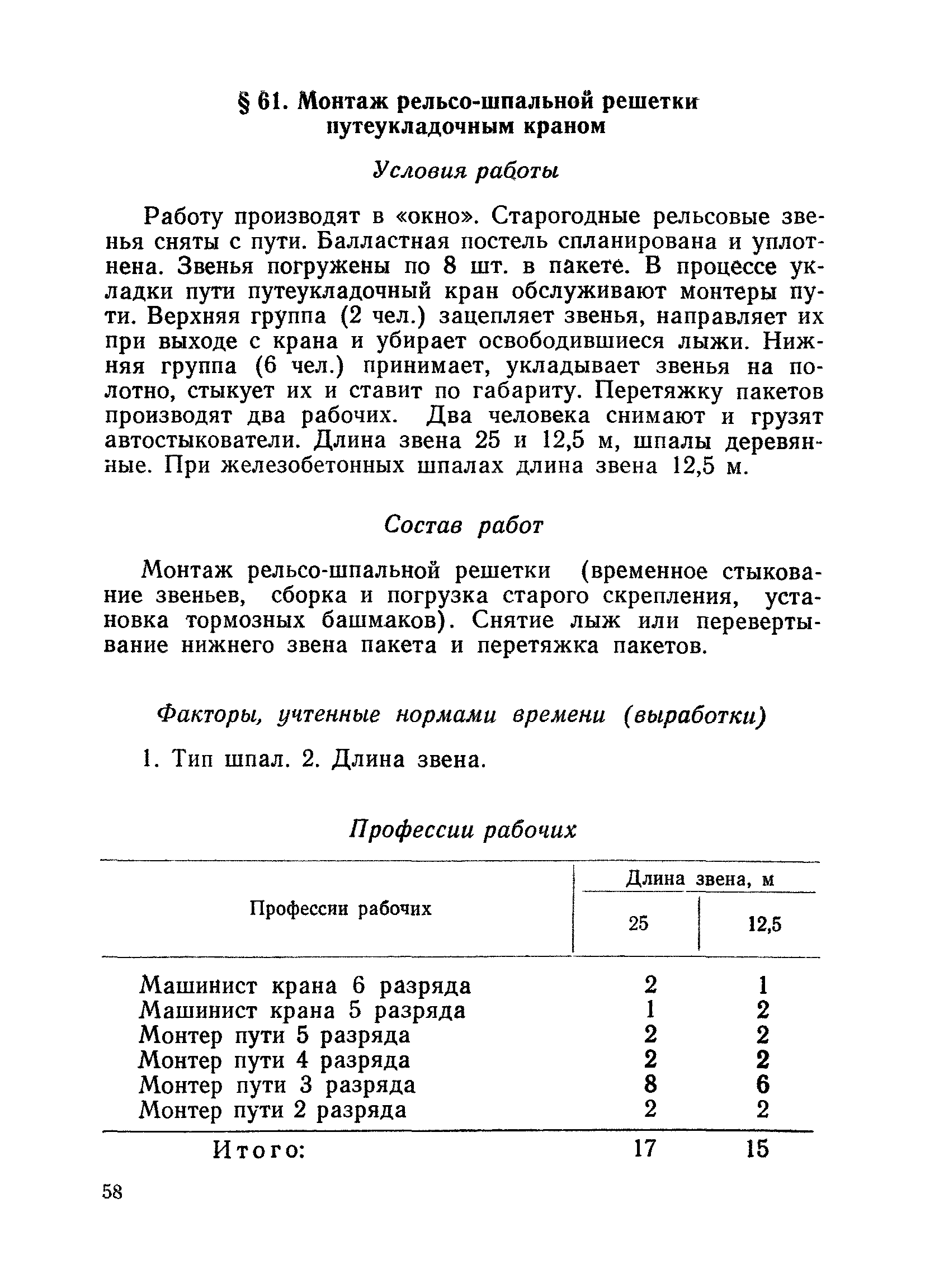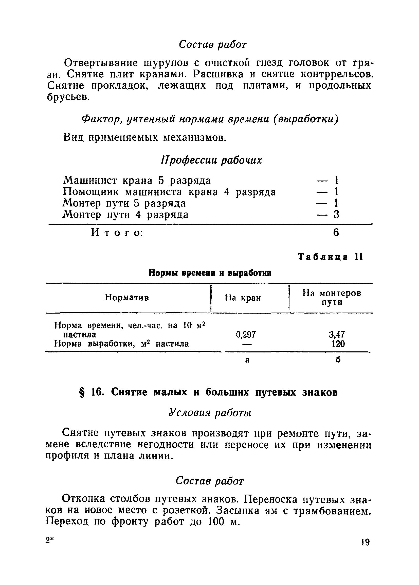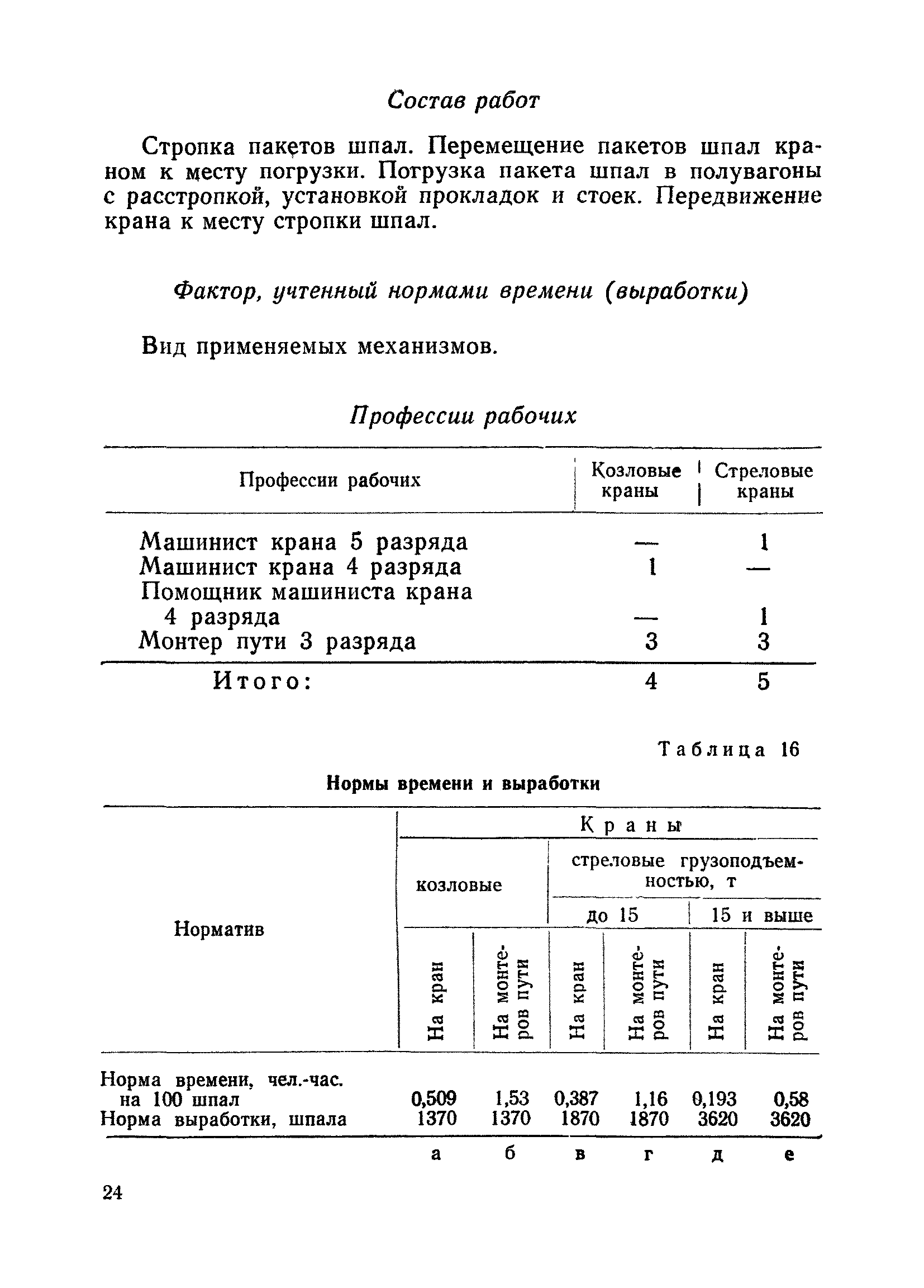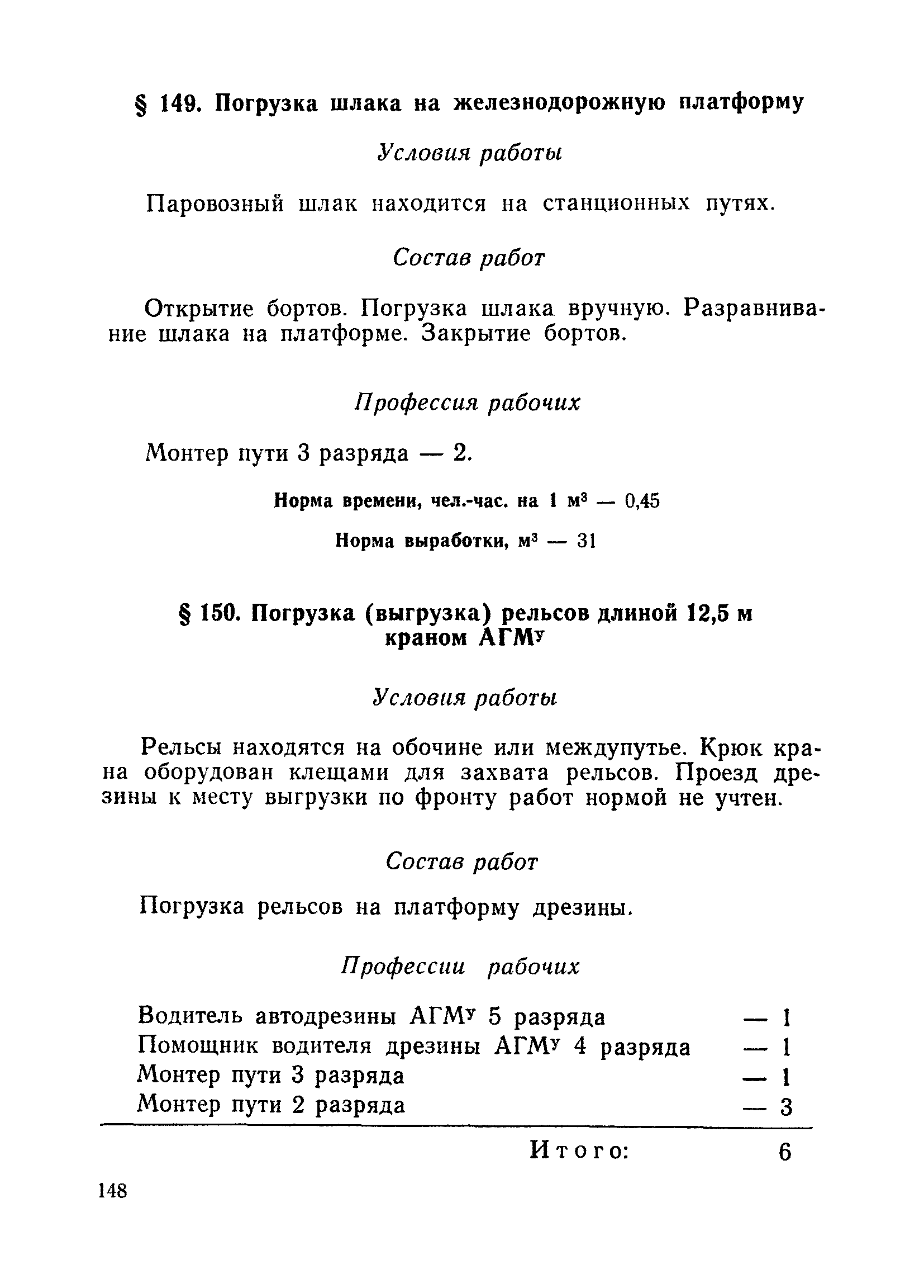 Единые нормы времени (выработки) на ремонт железнодорожного пути широкой колеи| Статус: | не действует | | Название рус.: | Единые нормы времени (выработки) на ремонт железнодорожного пути широкой колеи | | Дата добавления в базу: | 01.01.2018 | | Дата актуализации: | 01.01.2021 | | Область применения: | Единые нормы времени (выработки) были обязательны для применения во всех погрузочно-транспортных управлениях (объединениях) и других организациях Минуглепрома СССР, имеющих постоянные железнодорожные пути широкой колеи | | Оглавление: | Общая часть Техническая часть Нормативная часть Раздел I. Работы по земляному полотну § 1. Очистка кюветов вручную § 2. Уборка загрязненного балласта или грунта § 3. Работы, выполняемые путевым стругом § 4. Ручная срезка и планировка обочин § 5. Устройство и ремонт деревянного лотка § 6. Очистка нагорных канав Раздел II. Подготовительные работы на перегоне § 7. Срезка загрязненной корки балласта § 8. Вырезка балласта на глубину до нижней постели шпал § 9. Замена загрязненного балласта до нижней постели шпал § 10. Визирование пути § 11. Вырезка, прогрохотка и заброска в путь щебеночного балласта § 12. Выправка продольного профиля вручную с подрезкой загрязненного балласта ниже подошвы шпал § 13. Разборка вручную деревянного переездного настила § 14. Разборка вручную железобетонного переездного настила § 15. Разборка постоянного переездного настила кранами § 16. Снятие малых и больших путевых знаков § 17. Смазка стыковых болтов в пути Раздел III. Работы на звеносборочной базе § 18. Выгрузка деревянных шпал из полувагонов кранами § 19. Выгрузка деревянных шпал вручную § 20. Выгрузка железобетонных шпал из полувагонов кранами § 21. Погрузка деревянных шпал в полувагоны кранами § 22. Раскладка пакетов деревянных шпал на пути-шаблоне дрезиной АГМу § 23. Раскладка пакетов деревянных шпал на пути-шаблоне кранами § 24. Раскладка вручную шпал на пути-шаблоне при сборке рельсовых звеньев § 25. Забивка П-образных скоб § 26. Сверление костыльных отверстии в шпалах § 27. Комплектование закладных и клеммных болтов § 28. Раскладка прокладок § 29. Раскладка скреплений § 30. Раскладка рельсов длиной 25 м на подкладки погрузочными кранами § 31. Разметка мест положения осей шпал на шейке рельса § 32. Прикрепление рельсов к шпалам по шаблону на маячных шпалах § 33. Прикрепление рельсов к шпалам костылями (при помощи пневматического молотка типа ОМСП-5 или электропневматического костылезабивщика типа ЭПК-2 или ЭПК-3) § 34. Прикрепление подкладок к деревянным шпалам шурупами (вручную) § 35. Прикрепление подкладок к деревянным шпалам шурупами (при помощи шуруповерта типа ШВ-1) § 36. Прикрепление рельсов к подкладкам клеммными болтами при раздельном скреплении (при помощи шуруповерта типа ШВ-1) § 37. Прикрепление рельсов к шпалам при скреплении Типа КБ (при помощи шуруповерта типа ШВ-1) § 38. Прикрепление рельсов к шпалам при скреплении типа ЖБ (при помощи шурупно-гаечного ключа типа ШГК) § 39. Пришивка рельсов к шпалам вручную § 40. Прикрепление рельсов к шпалам при скреплении типа ЖБ (при помощи шуруповерта типа ШВ-1) § 41. Постановка противоугонов § 42. Укладка звеньев в штабель кранами § 43. Клеймение шпал § 44. Обрезка длинных шпал § 45. Постановка рельсовых стыков на графитовую мазь § 46. Обвязка концов шпал § 47. Погрузка рельсовых звеньев погрузочным краном ПКД (рельсовые звенья длиной 25 м 