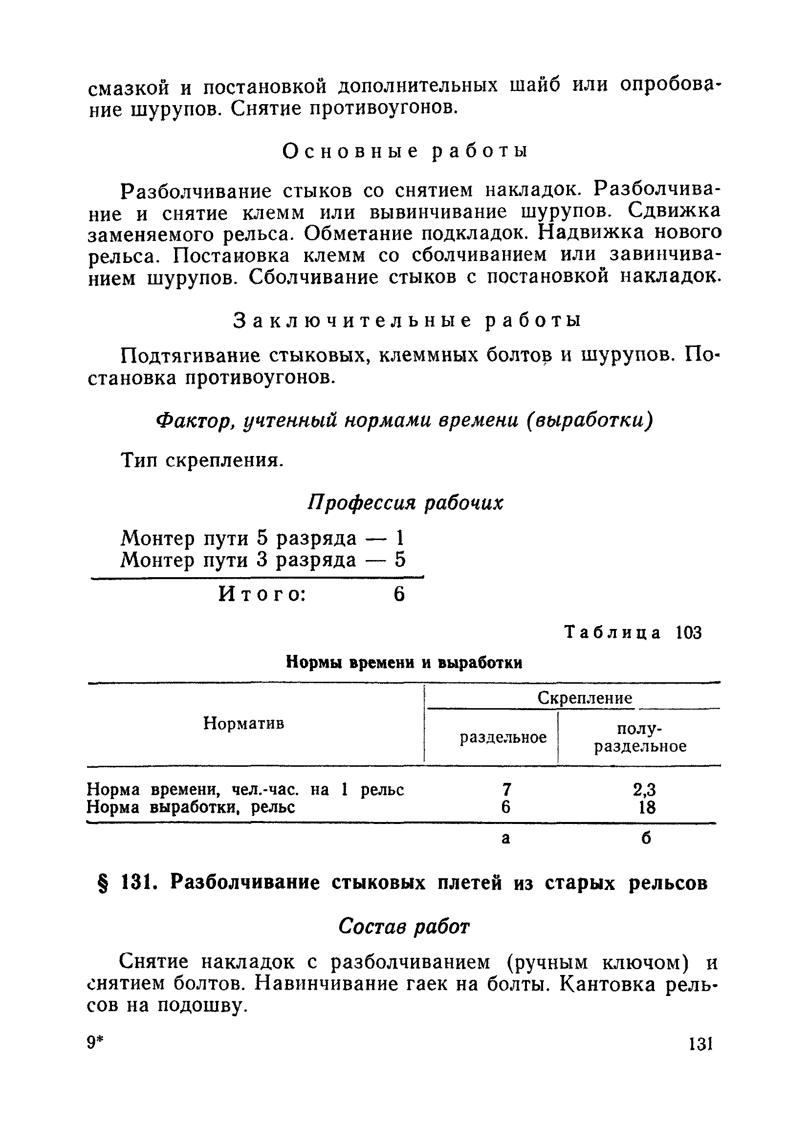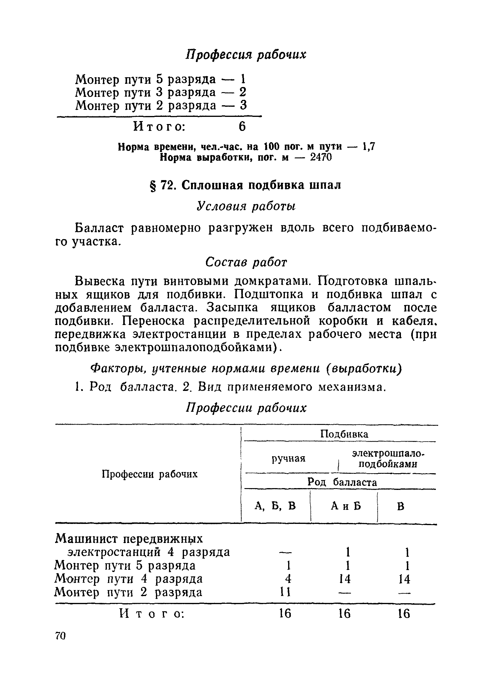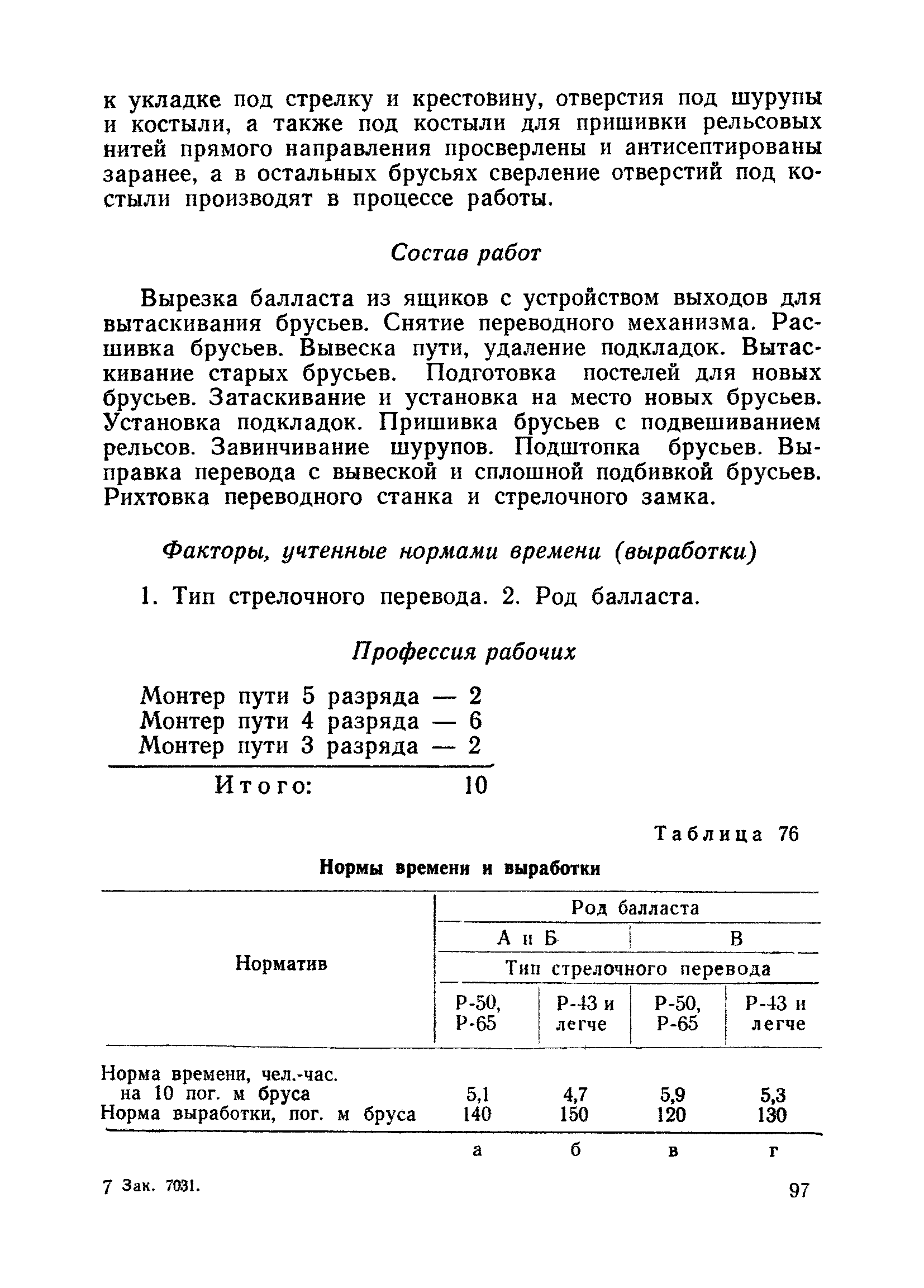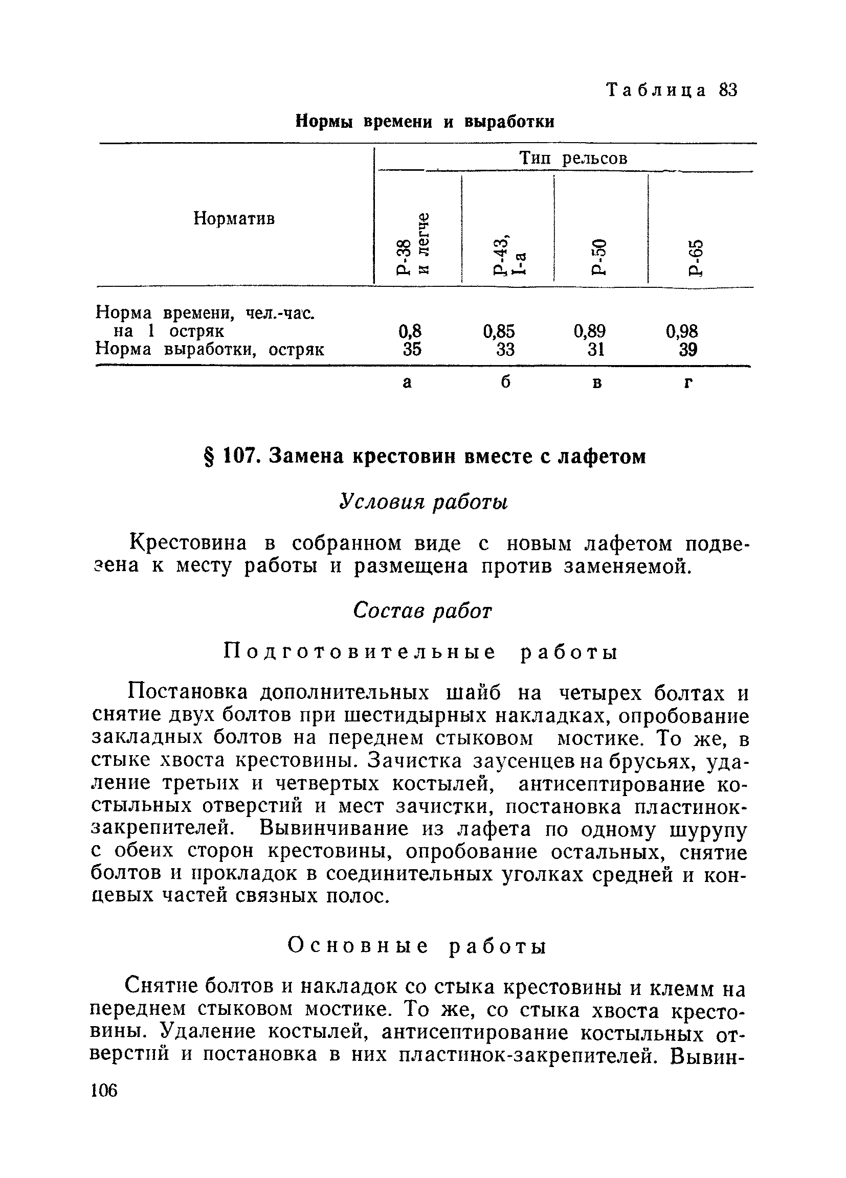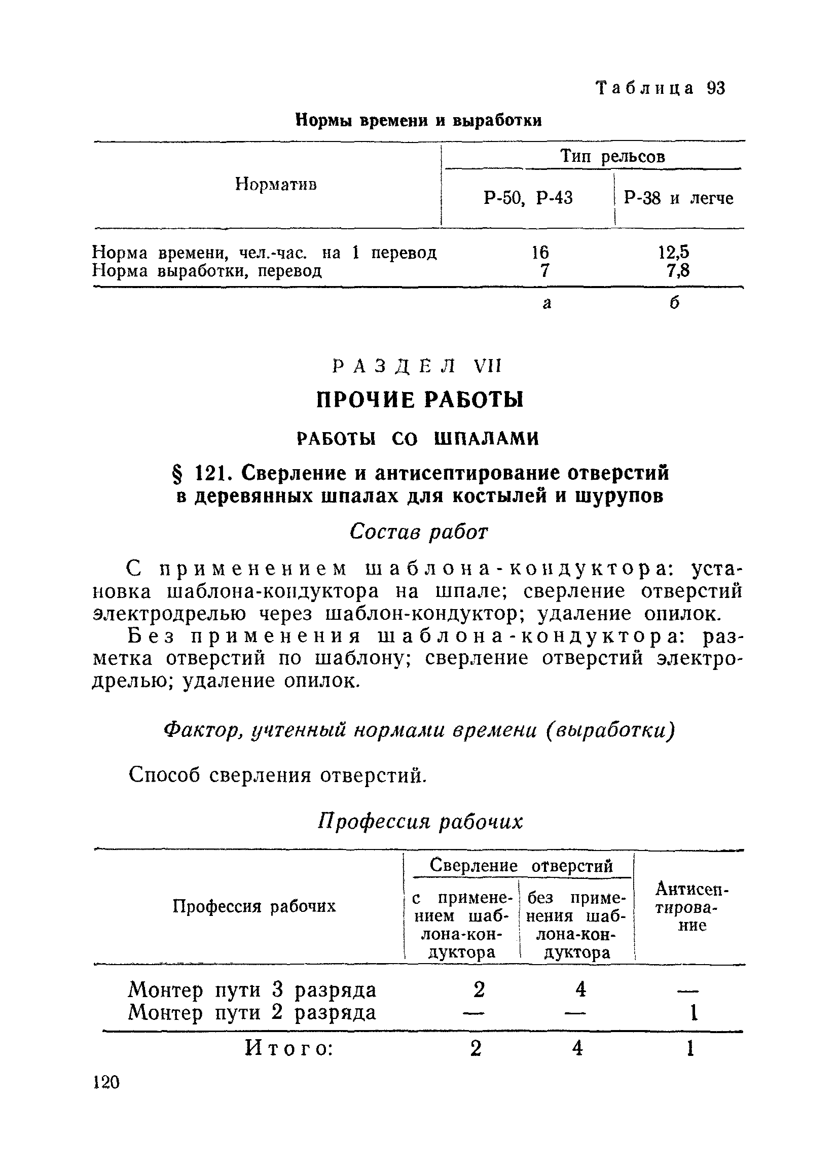 Единые нормы времени (выработки) на ремонт железнодорожного пути широкой колеи| Статус: | не действует | | Название рус.: | Единые нормы времени (выработки) на ремонт железнодорожного пути широкой колеи | | Дата добавления в базу: | 01.01.2018 | | Дата актуализации: | 01.01.2021 | | Область применения: | Единые нормы времени (выработки) были обязательны для применения во всех погрузочно-транспортных управлениях (объединениях) и других организациях Минуглепрома СССР, имеющих постоянные железнодорожные пути широкой колеи | | Оглавление: | Общая часть Техническая часть Нормативная часть Раздел I. Работы по земляному полотну § 1. Очистка кюветов вручную § 2. Уборка загрязненного балласта или грунта § 3. Работы, выполняемые путевым стругом § 4. Ручная срезка и планировка обочин § 5. Устройство и ремонт деревянного лотка § 6. Очистка нагорных канав Раздел II. Подготовительные работы на перегоне § 7. Срезка загрязненной корки балласта § 8. Вырезка балласта на глубину до нижней постели шпал § 9. Замена загрязненного балласта до нижней постели шпал § 10. Визирование пути § 11. Вырезка, прогрохотка и заброска в путь щебеночного балласта § 12. Выправка продольного профиля вручную с подрезкой загрязненного балласта ниже подошвы шпал § 13. Разборка вручную деревянного переездного настила § 14. Разборка вручную железобетонного переездного настила § 15. Разборка постоянного переездного настила кранами § 16. Снятие малых и больших путевых знаков § 17. Смазка стыковых болтов в пути Раздел III. Работы на звеносборочной базе § 18. Выгрузка деревянных шпал из полувагонов кранами § 19. Выгрузка деревянных шпал вручную § 20. Выгрузка железобетонных шпал из полувагонов кранами § 21. Погрузка деревянных шпал в полувагоны кранами § 22. Раскладка пакетов деревянных шпал на пути-шаблоне дрезиной АГМу § 23. Раскладка пакетов деревянных шпал на пути-шаблоне кранами § 24. Раскладка вручную шпал на пути-шаблоне при сборке рельсовых звеньев § 25. Забивка П-образных скоб § 26. Сверление костыльных отверстии в шпалах § 27. Комплектование закладных и клеммных болтов § 28. Раскладка прокладок § 29. Раскладка скреплений § 30. Раскладка рельсов длиной 25 м на подкладки погрузочными кранами § 31. Разметка мест положения осей шпал на шейке рельса § 32. Прикрепление рельсов к шпалам по шаблону на маячных шпалах § 33. Прикрепление рельсов к шпалам костылями (при помощи пневматического молотка типа ОМСП-5 или электропневматического костылезабивщика типа ЭПК-2 или ЭПК-3) § 34. Прикрепление подкладок к деревянным шпалам шурупами (вручную) § 35. Прикрепление подкладок к деревянным шпалам шурупами (при помощи шуруповерта типа ШВ-1) § 36. Прикрепление рельсов к подкладкам клеммными болтами при раздельном скреплении (при помощи шуруповерта типа ШВ-1) § 37. Прикрепление рельсов к шпалам при скреплении Типа КБ (при помощи шуруповерта типа ШВ-1) § 38. Прикрепление рельсов к шпалам при скреплении типа ЖБ (при помощи шурупно-гаечного ключа типа ШГК) § 39. Пришивка рельсов к шпалам вручную § 40. Прикрепление рельсов к шпалам при скреплении типа ЖБ (при помощи шуруповерта типа ШВ-1) § 41. Постановка противоугонов § 42. Укладка звеньев в штабель кранами § 43. Клеймение шпал § 44. Обрезка длинных шпал § 45. Постановка рельсовых стыков на графитовую мазь § 46. Обвязка концов шпал § 47. Погрузка рельсовых звеньев погрузочным краном ПКД (рельсовые звенья длиной 25 м 