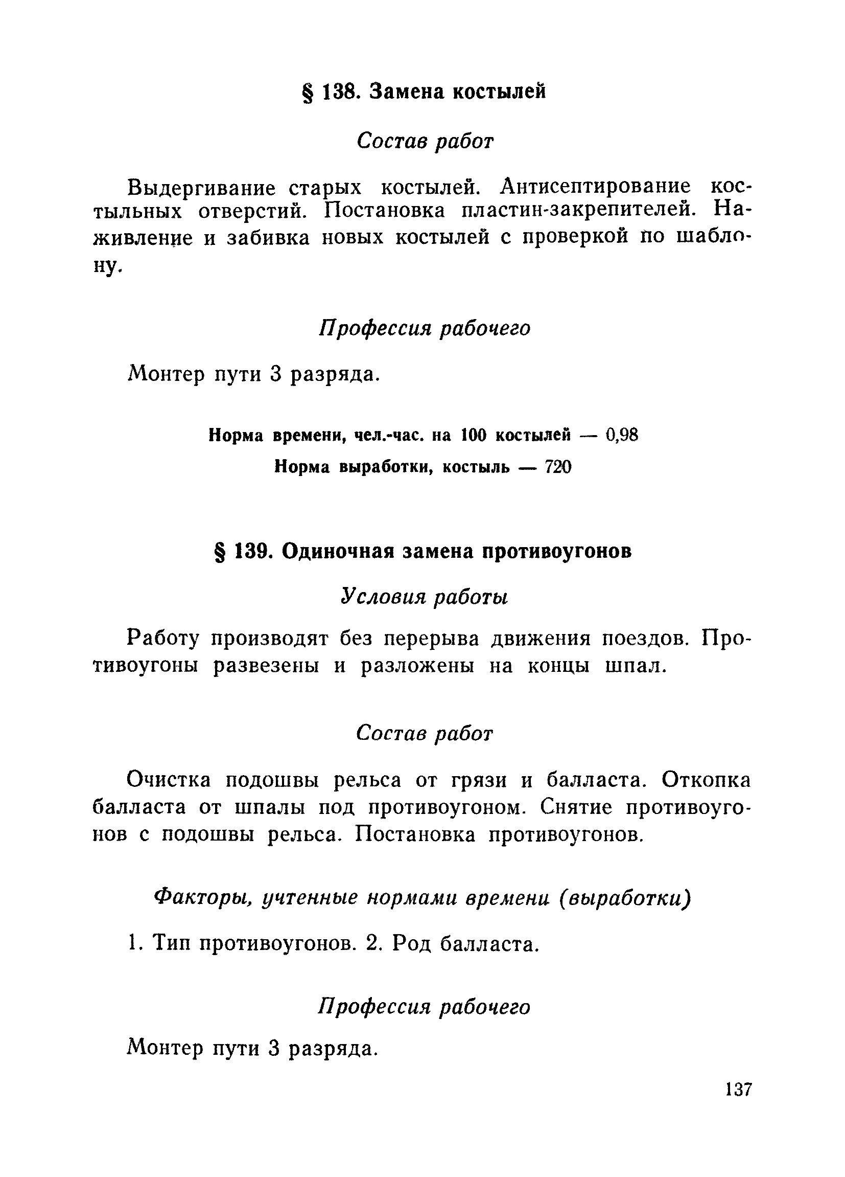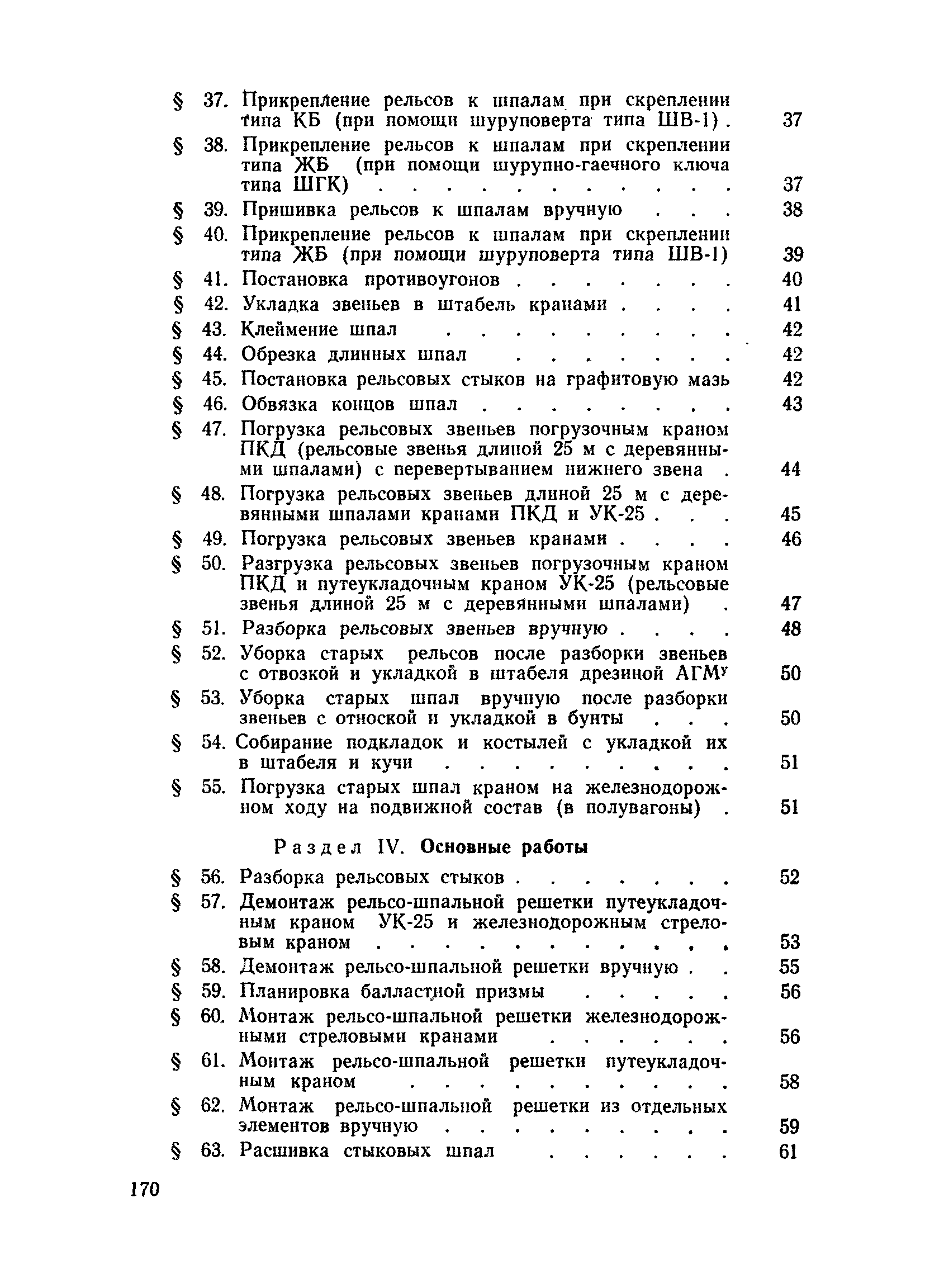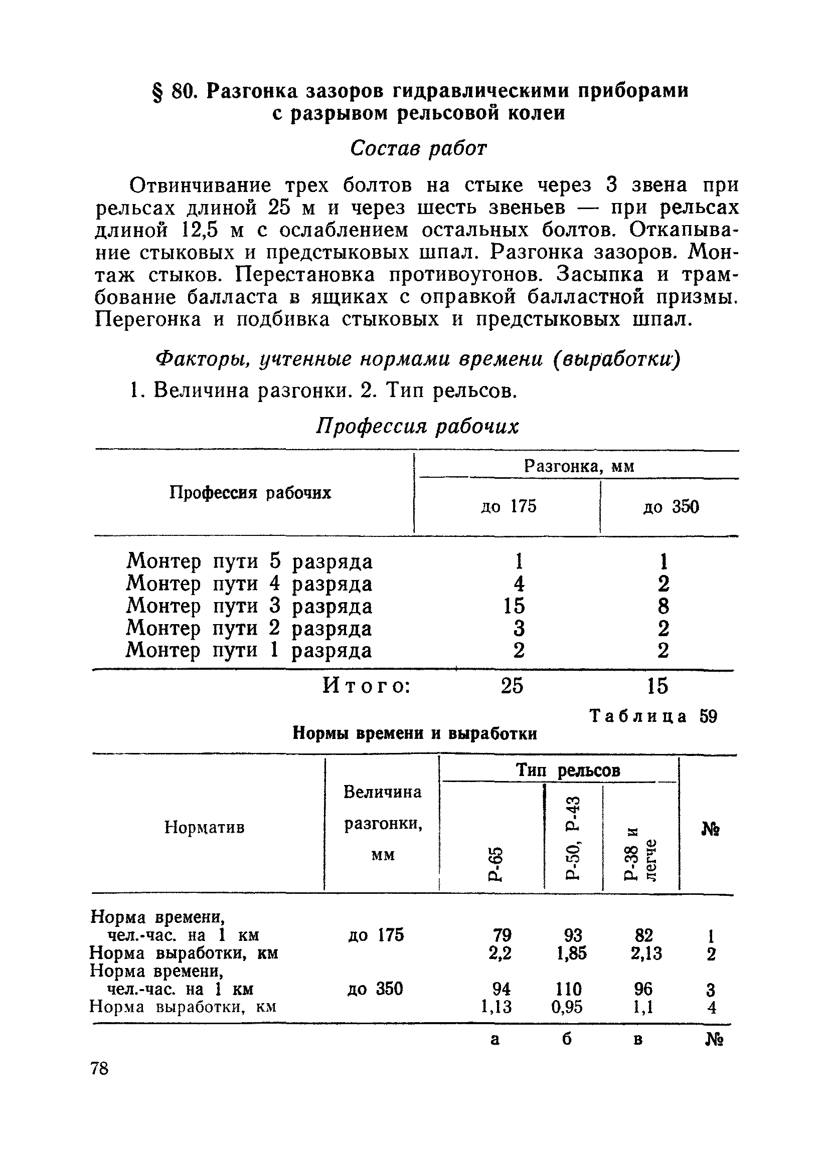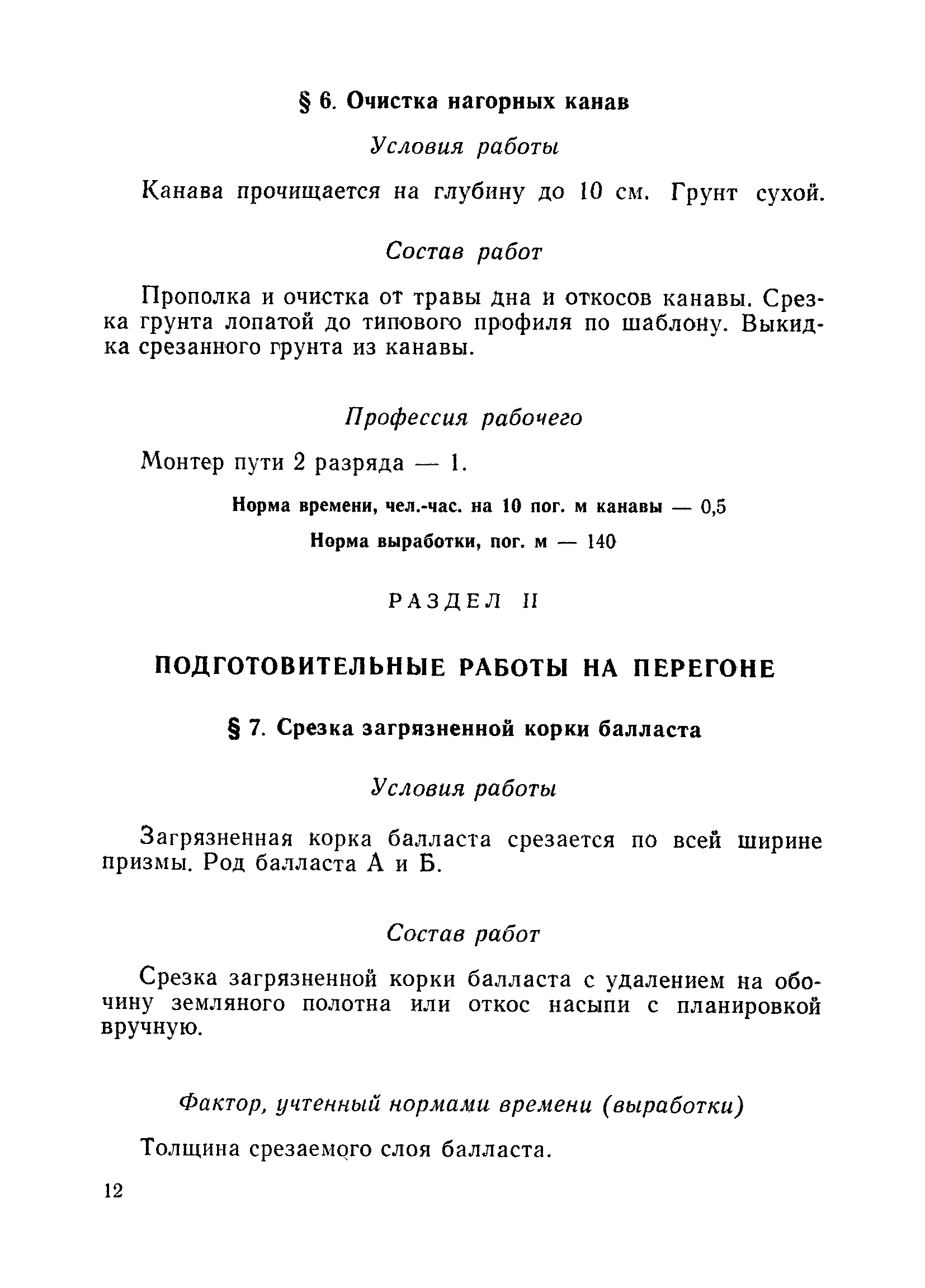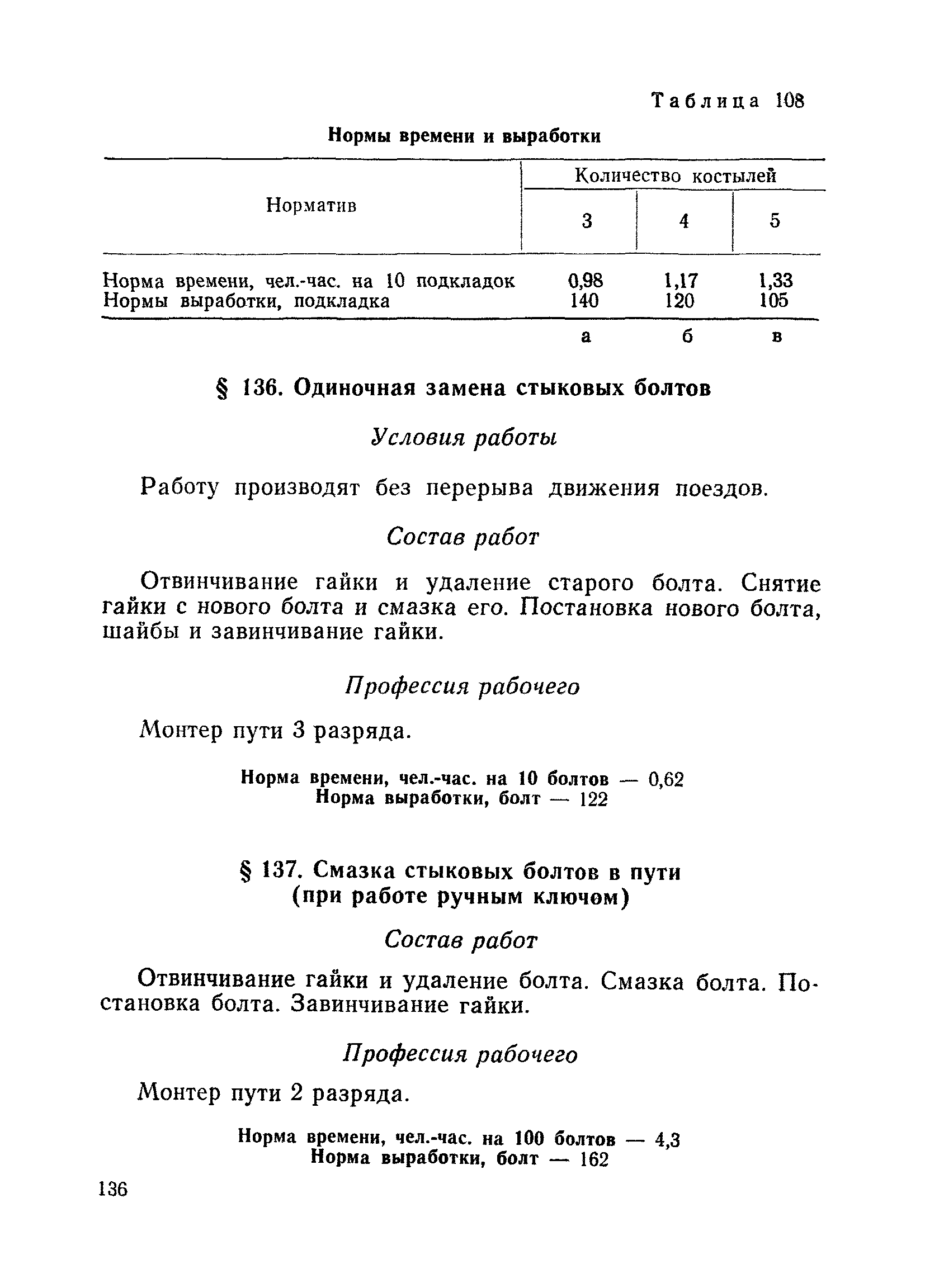 Единые нормы времени (выработки) на ремонт железнодорожного пути широкой колеи| Статус: | не действует | | Название рус.: | Единые нормы времени (выработки) на ремонт железнодорожного пути широкой колеи | | Дата добавления в базу: | 01.01.2018 | | Дата актуализации: | 01.01.2021 | | Область применения: | Единые нормы времени (выработки) были обязательны для применения во всех погрузочно-транспортных управлениях (объединениях) и других организациях Минуглепрома СССР, имеющих постоянные железнодорожные пути широкой колеи | | Оглавление: | Общая часть Техническая часть Нормативная часть Раздел I. Работы по земляному полотну § 1. Очистка кюветов вручную § 2. Уборка загрязненного балласта или грунта § 3. Работы, выполняемые путевым стругом § 4. Ручная срезка и планировка обочин § 5. Устройство и ремонт деревянного лотка § 6. Очистка нагорных канав Раздел II. Подготовительные работы на перегоне § 7. Срезка загрязненной корки балласта § 8. Вырезка балласта на глубину до нижней постели шпал § 9. Замена загрязненного балласта до нижней постели шпал § 10. Визирование пути § 11. Вырезка, прогрохотка и заброска в путь щебеночного балласта § 12. Выправка продольного профиля вручную с подрезкой загрязненного балласта ниже подошвы шпал § 13. Разборка вручную деревянного переездного настила § 14. Разборка вручную железобетонного переездного настила § 15. Разборка постоянного переездного настила кранами § 16. Снятие малых и больших путевых знаков § 17. Смазка стыковых болтов в пути Раздел III. Работы на звеносборочной базе § 18. Выгрузка деревянных шпал из полувагонов кранами § 19. Выгрузка деревянных шпал вручную § 20. Выгрузка железобетонных шпал из полувагонов кранами § 21. Погрузка деревянных шпал в полувагоны кранами § 22. Раскладка пакетов деревянных шпал на пути-шаблоне дрезиной АГМу § 23. Раскладка пакетов деревянных шпал на пути-шаблоне кранами § 24. Раскладка вручную шпал на пути-шаблоне при сборке рельсовых звеньев § 25. Забивка П-образных скоб § 26. Сверление костыльных отверстии в шпалах § 27. Комплектование закладных и клеммных болтов § 28. Раскладка прокладок § 29. Раскладка скреплений § 30. Раскладка рельсов длиной 25 м на подкладки погрузочными кранами § 31. Разметка мест положения осей шпал на шейке рельса § 32. Прикрепление рельсов к шпалам по шаблону на маячных шпалах § 33. Прикрепление рельсов к шпалам костылями (при помощи пневматического молотка типа ОМСП-5 или электропневматического костылезабивщика типа ЭПК-2 или ЭПК-3) § 34. Прикрепление подкладок к деревянным шпалам шурупами (вручную) § 35. Прикрепление подкладок к деревянным шпалам шурупами (при помощи шуруповерта типа ШВ-1) § 36. Прикрепление рельсов к подкладкам клеммными болтами при раздельном скреплении (при помощи шуруповерта типа ШВ-1) § 37. Прикрепление рельсов к шпалам при скреплении Типа КБ (при помощи шуруповерта типа ШВ-1) § 38. Прикрепление рельсов к шпалам при скреплении типа ЖБ (при помощи шурупно-гаечного ключа типа ШГК) § 39. Пришивка рельсов к шпалам вручную § 40. Прикрепление рельсов к шпалам при скреплении типа ЖБ (при помощи шуруповерта типа ШВ-1) § 41. Постановка противоугонов § 42. Укладка звеньев в штабель кранами § 43. Клеймение шпал § 44. Обрезка длинных шпал § 45. Постановка рельсовых стыков на графитовую мазь § 46. Обвязка концов шпал § 47. Погрузка рельсовых звеньев погрузочным краном ПКД (рельсовые звенья длиной 25 м 