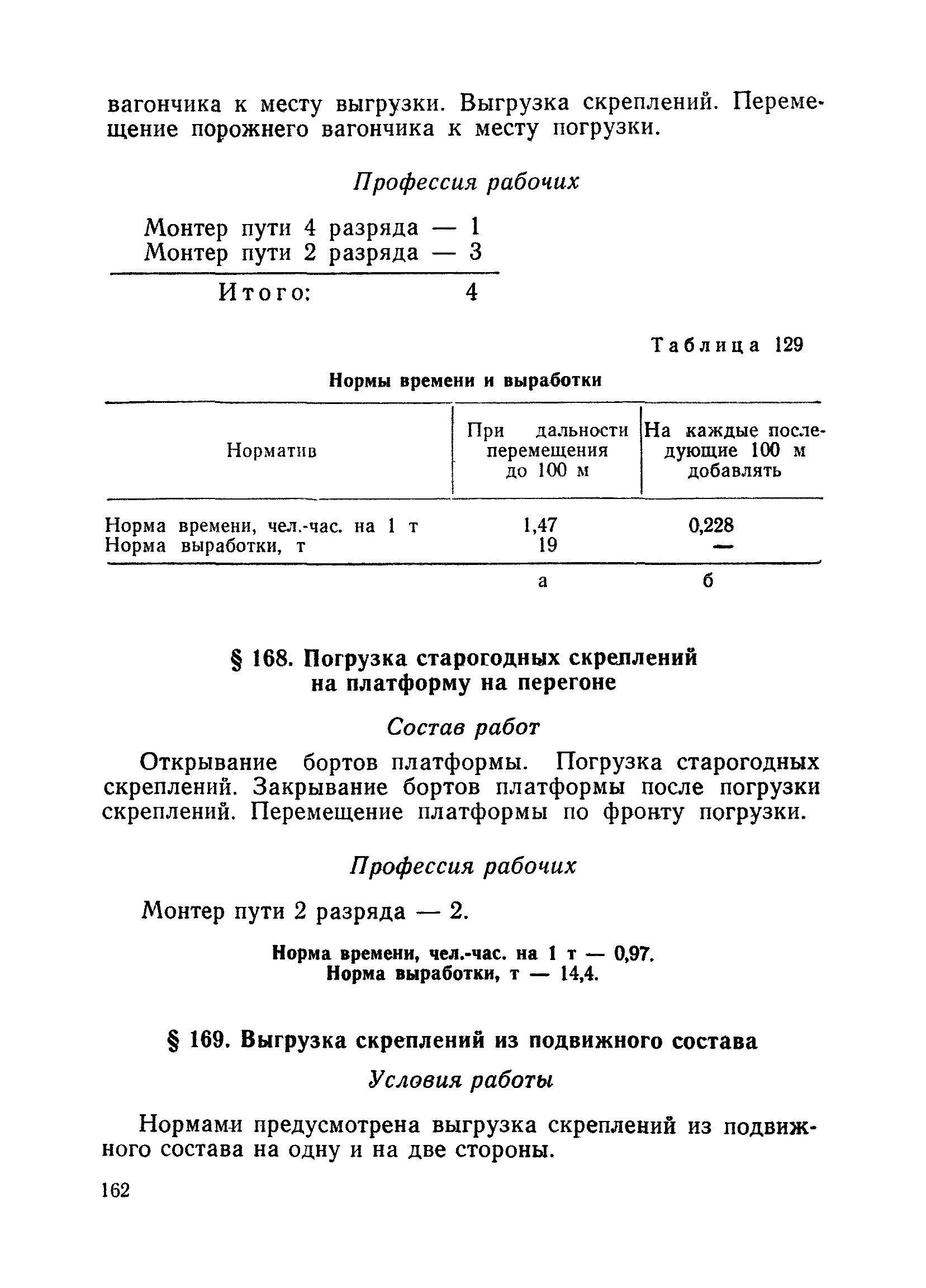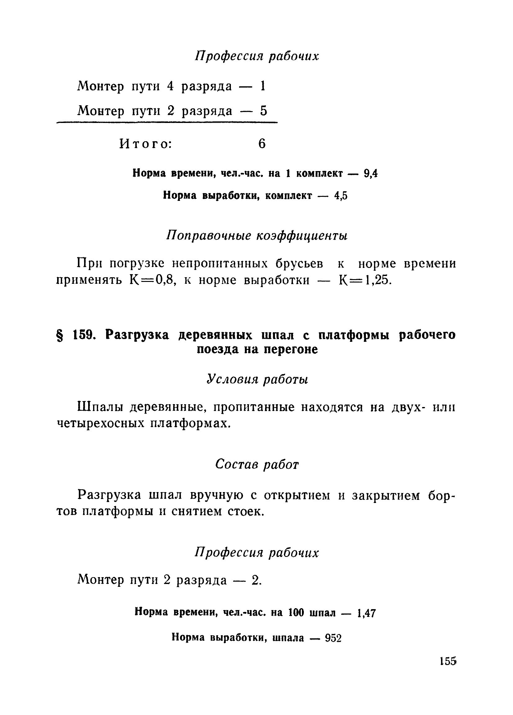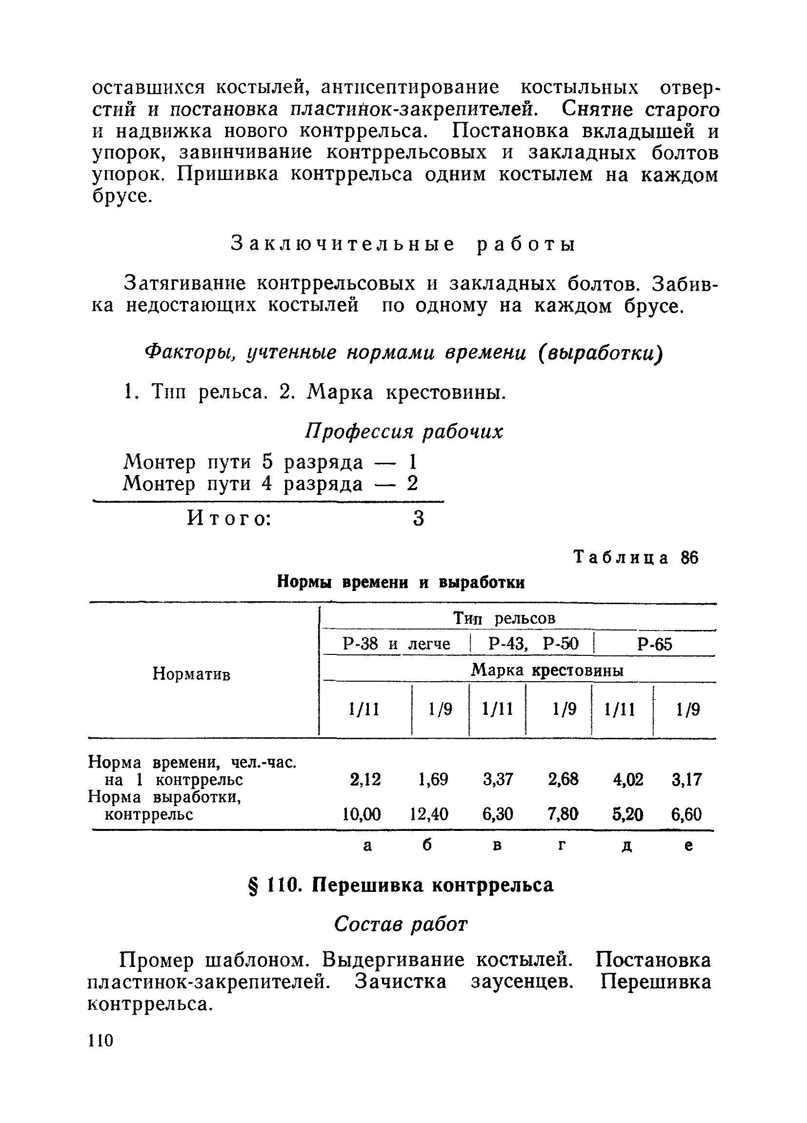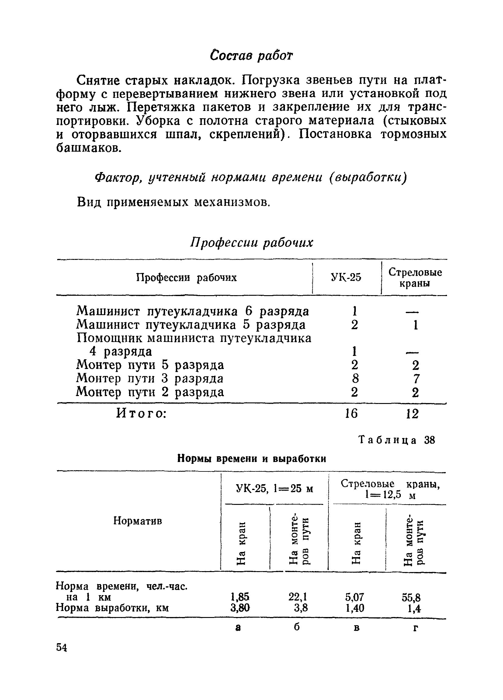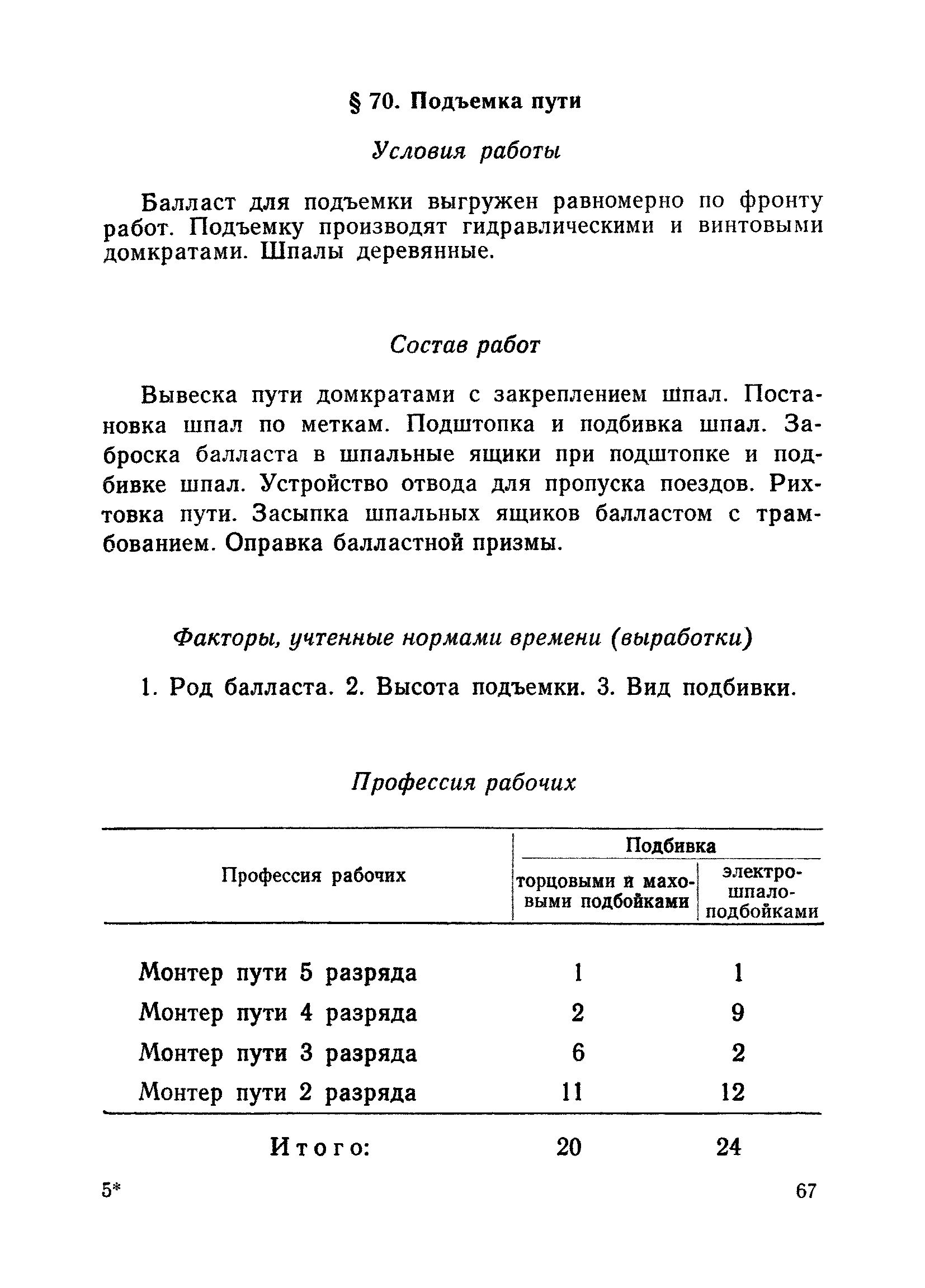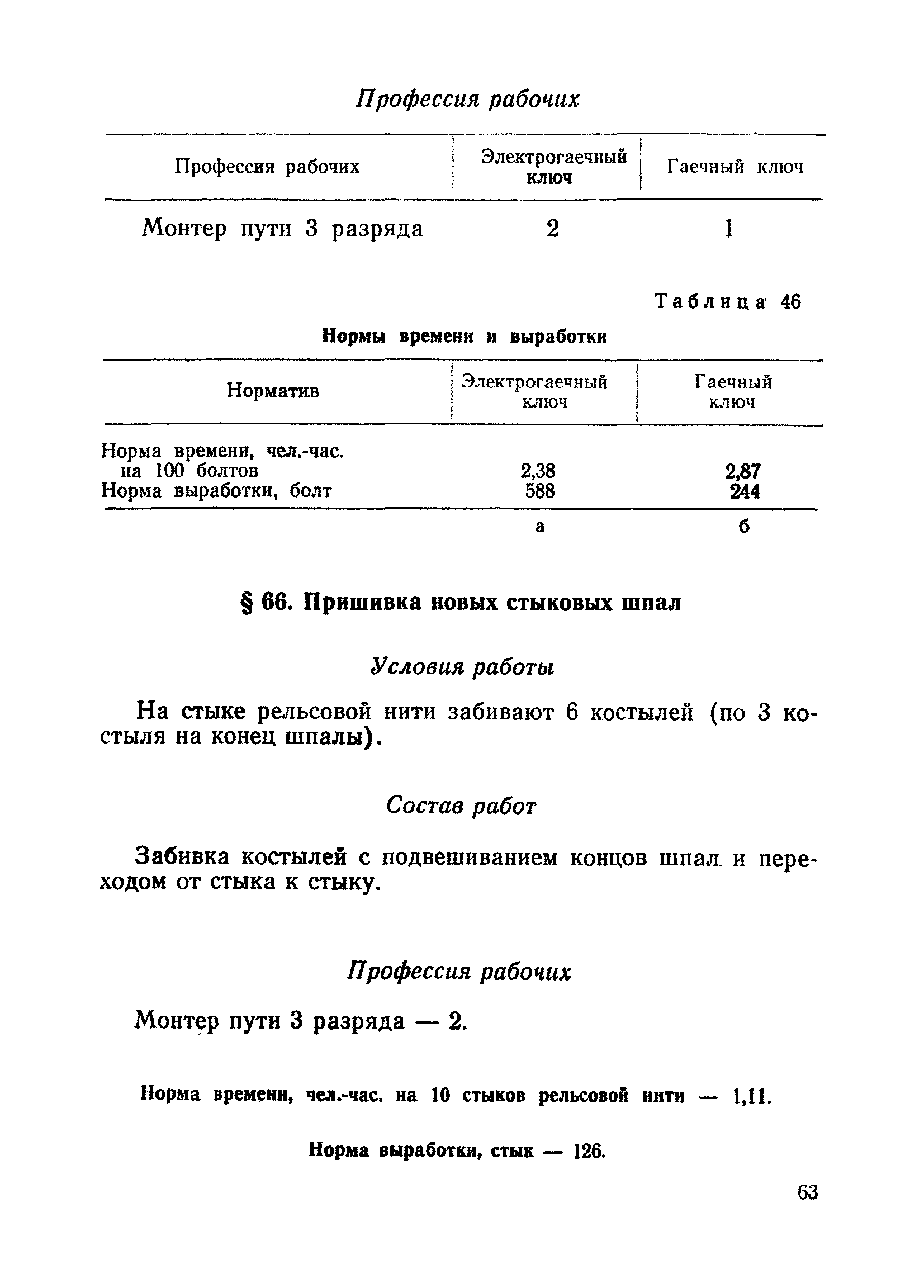 Единые нормы времени (выработки) на ремонт железнодорожного пути широкой колеи| Статус: | не действует | | Название рус.: | Единые нормы времени (выработки) на ремонт железнодорожного пути широкой колеи | | Дата добавления в базу: | 01.01.2018 | | Дата актуализации: | 01.01.2021 | | Область применения: | Единые нормы времени (выработки) были обязательны для применения во всех погрузочно-транспортных управлениях (объединениях) и других организациях Минуглепрома СССР, имеющих постоянные железнодорожные пути широкой колеи | | Оглавление: | Общая часть Техническая часть Нормативная часть Раздел I. Работы по земляному полотну § 1. Очистка кюветов вручную § 2. Уборка загрязненного балласта или грунта § 3. Работы, выполняемые путевым стругом § 4. Ручная срезка и планировка обочин § 5. Устройство и ремонт деревянного лотка § 6. Очистка нагорных канав Раздел II. Подготовительные работы на перегоне § 7. Срезка загрязненной корки балласта § 8. Вырезка балласта на глубину до нижней постели шпал § 9. Замена загрязненного балласта до нижней постели шпал § 10. Визирование пути § 11. Вырезка, прогрохотка и заброска в путь щебеночного балласта § 12. Выправка продольного профиля вручную с подрезкой загрязненного балласта ниже подошвы шпал § 13. Разборка вручную деревянного переездного настила § 14. Разборка вручную железобетонного переездного настила § 15. Разборка постоянного переездного настила кранами § 16. Снятие малых и больших путевых знаков § 17. Смазка стыковых болтов в пути Раздел III. Работы на звеносборочной базе § 18. Выгрузка деревянных шпал из полувагонов кранами § 19. Выгрузка деревянных шпал вручную § 20. Выгрузка железобетонных шпал из полувагонов кранами § 21. Погрузка деревянных шпал в полувагоны кранами § 22. Раскладка пакетов деревянных шпал на пути-шаблоне дрезиной АГМу § 23. Раскладка пакетов деревянных шпал на пути-шаблоне кранами § 24. Раскладка вручную шпал на пути-шаблоне при сборке рельсовых звеньев § 25. Забивка П-образных скоб § 26. Сверление костыльных отверстии в шпалах § 27. Комплектование закладных и клеммных болтов § 28. Раскладка прокладок § 29. Раскладка скреплений § 30. Раскладка рельсов длиной 25 м на подкладки погрузочными кранами § 31. Разметка мест положения осей шпал на шейке рельса § 32. Прикрепление рельсов к шпалам по шаблону на маячных шпалах § 33. Прикрепление рельсов к шпалам костылями (при помощи пневматического молотка типа ОМСП-5 или электропневматического костылезабивщика типа ЭПК-2 или ЭПК-3) § 34. Прикрепление подкладок к деревянным шпалам шурупами (вручную) § 35. Прикрепление подкладок к деревянным шпалам шурупами (при помощи шуруповерта типа ШВ-1) § 36. Прикрепление рельсов к подкладкам клеммными болтами при раздельном скреплении (при помощи шуруповерта типа ШВ-1) § 37. Прикрепление рельсов к шпалам при скреплении Типа КБ (при помощи шуруповерта типа ШВ-1) § 38. Прикрепление рельсов к шпалам при скреплении типа ЖБ (при помощи шурупно-гаечного ключа типа ШГК) § 39. Пришивка рельсов к шпалам вручную § 40. Прикрепление рельсов к шпалам при скреплении типа ЖБ (при помощи шуруповерта типа ШВ-1) § 41. Постановка противоугонов § 42. Укладка звеньев в штабель кранами § 43. Клеймение шпал § 44. Обрезка длинных шпал § 45. Постановка рельсовых стыков на графитовую мазь § 46. Обвязка концов шпал § 47. Погрузка рельсовых звеньев погрузочным краном ПКД (рельсовые звенья длиной 25 м 