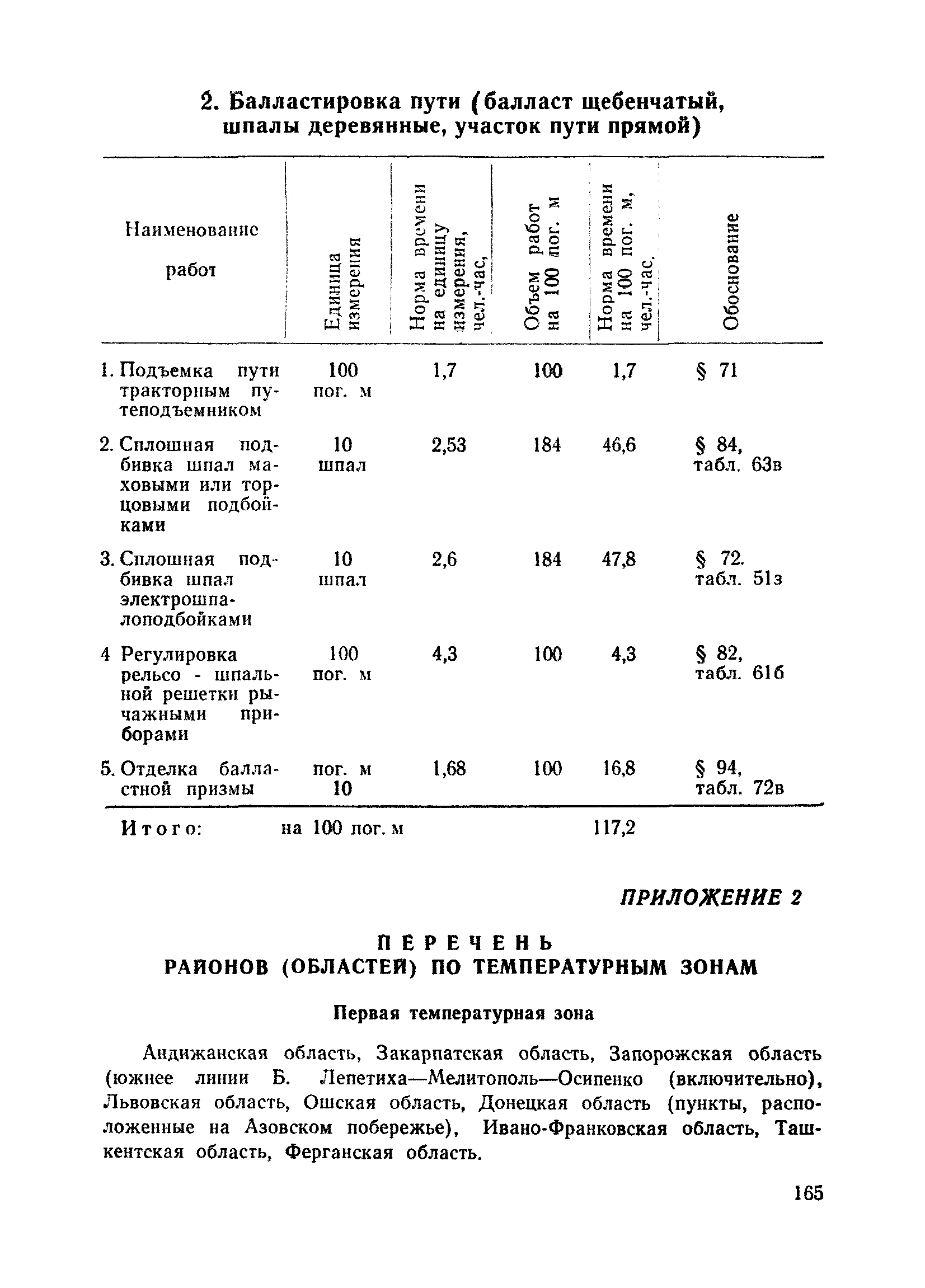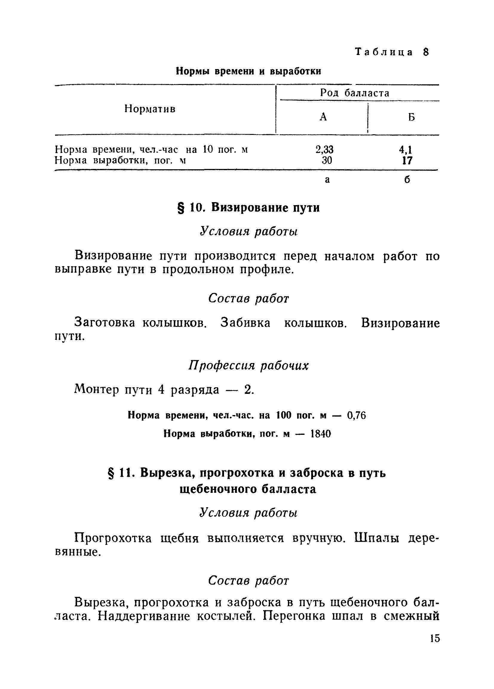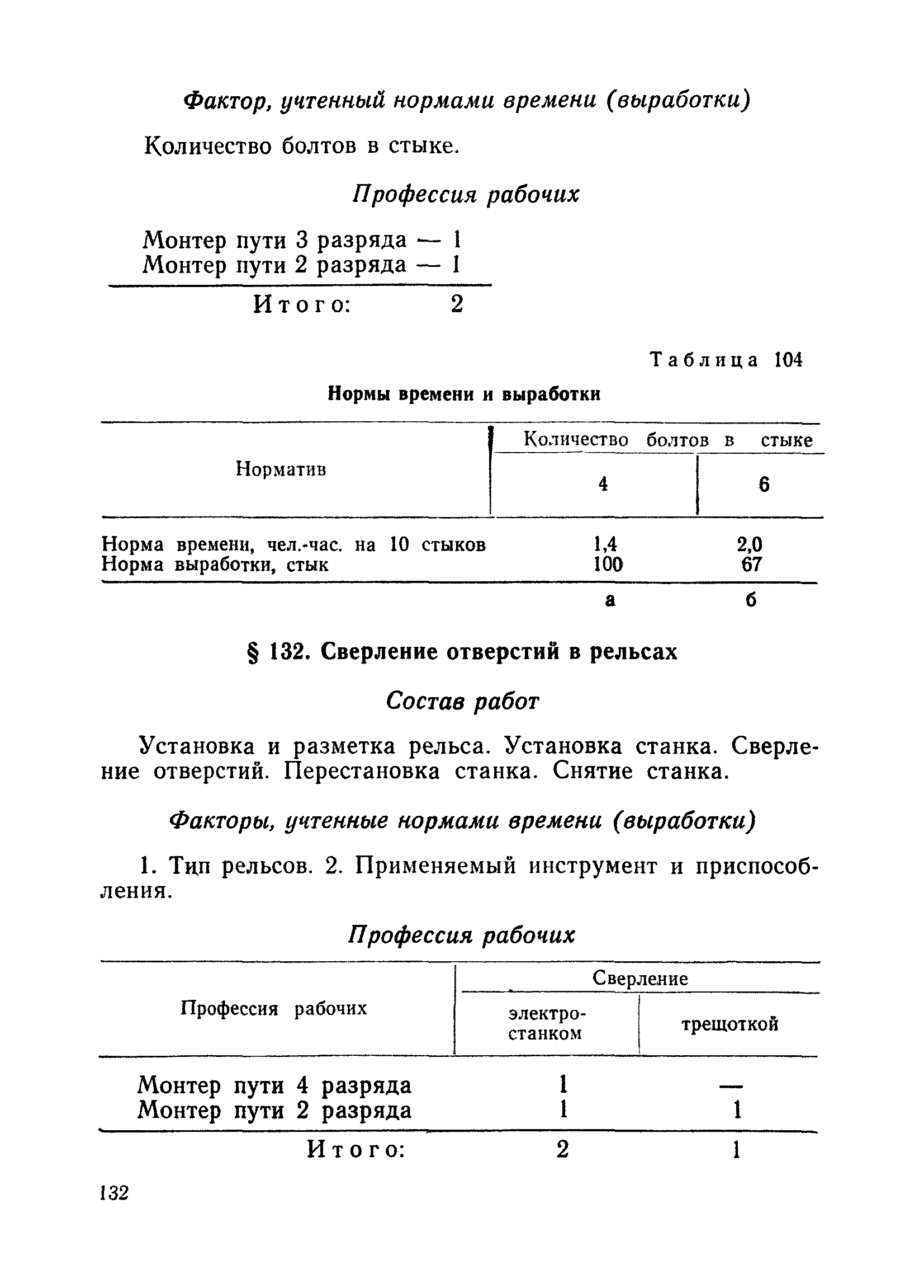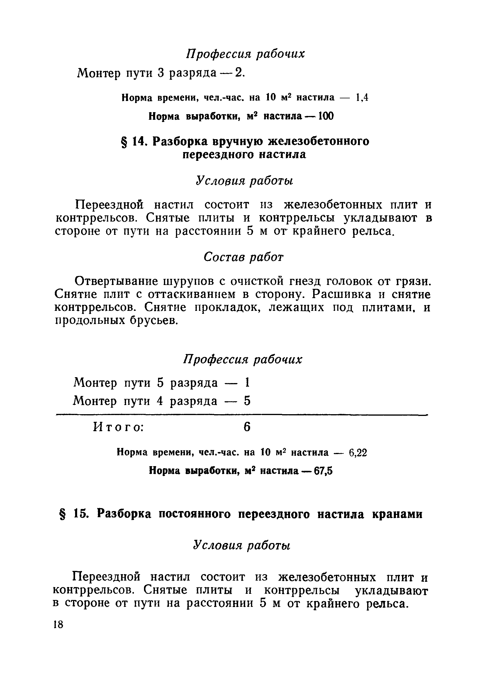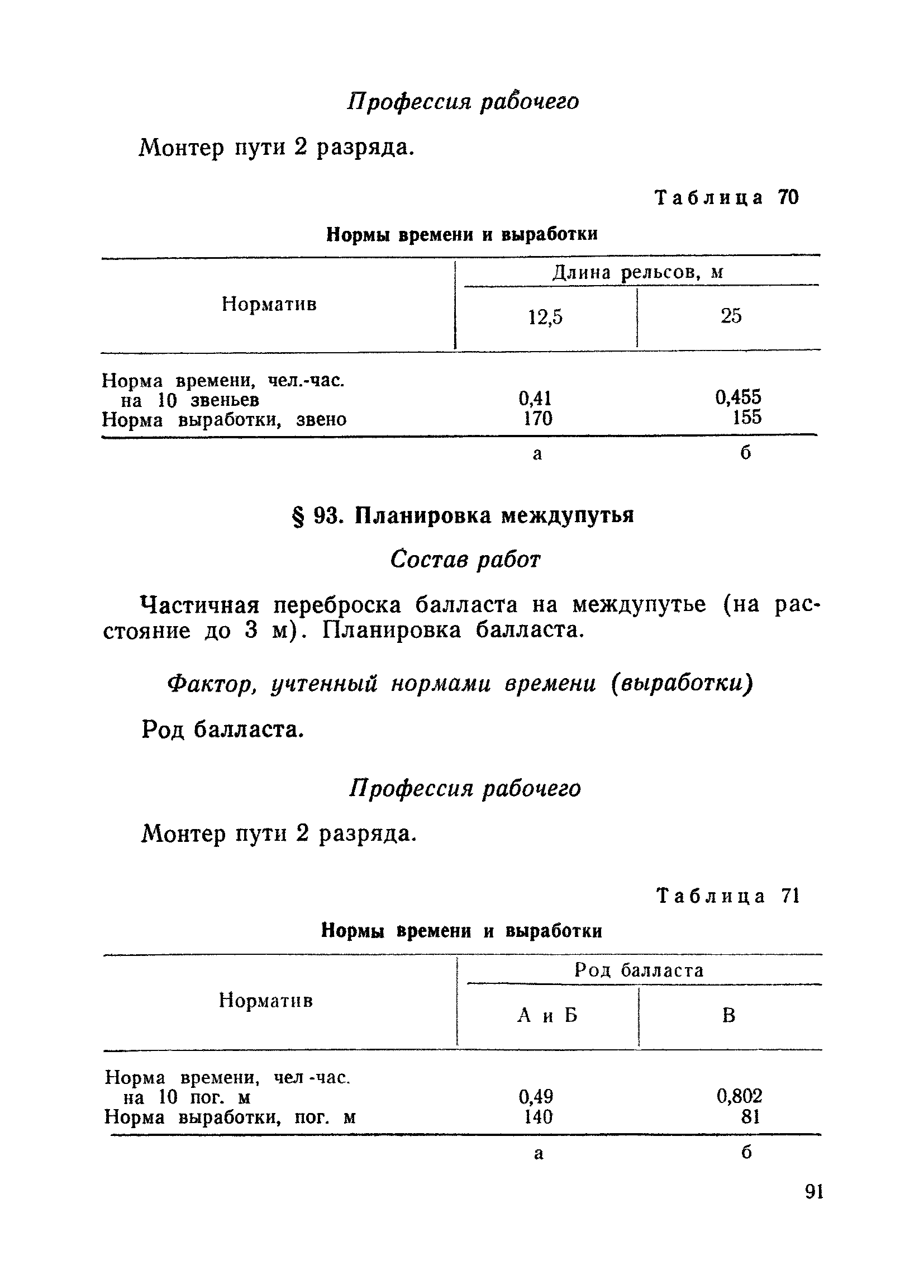 Единые нормы времени (выработки) на ремонт железнодорожного пути широкой колеи| Статус: | не действует | | Название рус.: | Единые нормы времени (выработки) на ремонт железнодорожного пути широкой колеи | | Дата добавления в базу: | 01.01.2018 | | Дата актуализации: | 01.01.2021 | | Область применения: | Единые нормы времени (выработки) были обязательны для применения во всех погрузочно-транспортных управлениях (объединениях) и других организациях Минуглепрома СССР, имеющих постоянные железнодорожные пути широкой колеи | | Оглавление: | Общая часть Техническая часть Нормативная часть Раздел I. Работы по земляному полотну § 1. Очистка кюветов вручную § 2. Уборка загрязненного балласта или грунта § 3. Работы, выполняемые путевым стругом § 4. Ручная срезка и планировка обочин § 5. Устройство и ремонт деревянного лотка § 6. Очистка нагорных канав Раздел II. Подготовительные работы на перегоне § 7. Срезка загрязненной корки балласта § 8. Вырезка балласта на глубину до нижней постели шпал § 9. Замена загрязненного балласта до нижней постели шпал § 10. Визирование пути § 11. Вырезка, прогрохотка и заброска в путь щебеночного балласта § 12. Выправка продольного профиля вручную с подрезкой загрязненного балласта ниже подошвы шпал § 13. Разборка вручную деревянного переездного настила § 14. Разборка вручную железобетонного переездного настила § 15. Разборка постоянного переездного настила кранами § 16. Снятие малых и больших путевых знаков § 17. Смазка стыковых болтов в пути Раздел III. Работы на звеносборочной базе § 18. Выгрузка деревянных шпал из полувагонов кранами § 19. Выгрузка деревянных шпал вручную § 20. Выгрузка железобетонных шпал из полувагонов кранами § 21. Погрузка деревянных шпал в полувагоны кранами § 22. Раскладка пакетов деревянных шпал на пути-шаблоне дрезиной АГМу § 23. Раскладка пакетов деревянных шпал на пути-шаблоне кранами § 24. Раскладка вручную шпал на пути-шаблоне при сборке рельсовых звеньев § 25. Забивка П-образных скоб § 26. Сверление костыльных отверстии в шпалах § 27. Комплектование закладных и клеммных болтов § 28. Раскладка прокладок § 29. Раскладка скреплений § 30. Раскладка рельсов длиной 25 м на подкладки погрузочными кранами § 31. Разметка мест положения осей шпал на шейке рельса § 32. Прикрепление рельсов к шпалам по шаблону на маячных шпалах § 33. Прикрепление рельсов к шпалам костылями (при помощи пневматического молотка типа ОМСП-5 или электропневматического костылезабивщика типа ЭПК-2 или ЭПК-3) § 34. Прикрепление подкладок к деревянным шпалам шурупами (вручную) § 35. Прикрепление подкладок к деревянным шпалам шурупами (при помощи шуруповерта типа ШВ-1) § 36. Прикрепление рельсов к подкладкам клеммными болтами при раздельном скреплении (при помощи шуруповерта типа ШВ-1) § 37. Прикрепление рельсов к шпалам при скреплении Типа КБ (при помощи шуруповерта типа ШВ-1) § 38. Прикрепление рельсов к шпалам при скреплении типа ЖБ (при помощи шурупно-гаечного ключа типа ШГК) § 39. Пришивка рельсов к шпалам вручную § 40. Прикрепление рельсов к шпалам при скреплении типа ЖБ (при помощи шуруповерта типа ШВ-1) § 41. Постановка противоугонов § 42. Укладка звеньев в штабель кранами § 43. Клеймение шпал § 44. Обрезка длинных шпал § 45. Постановка рельсовых стыков на графитовую мазь § 46. Обвязка концов шпал § 47. Погрузка рельсовых звеньев погрузочным краном ПКД (рельсовые звенья длиной 25 м 