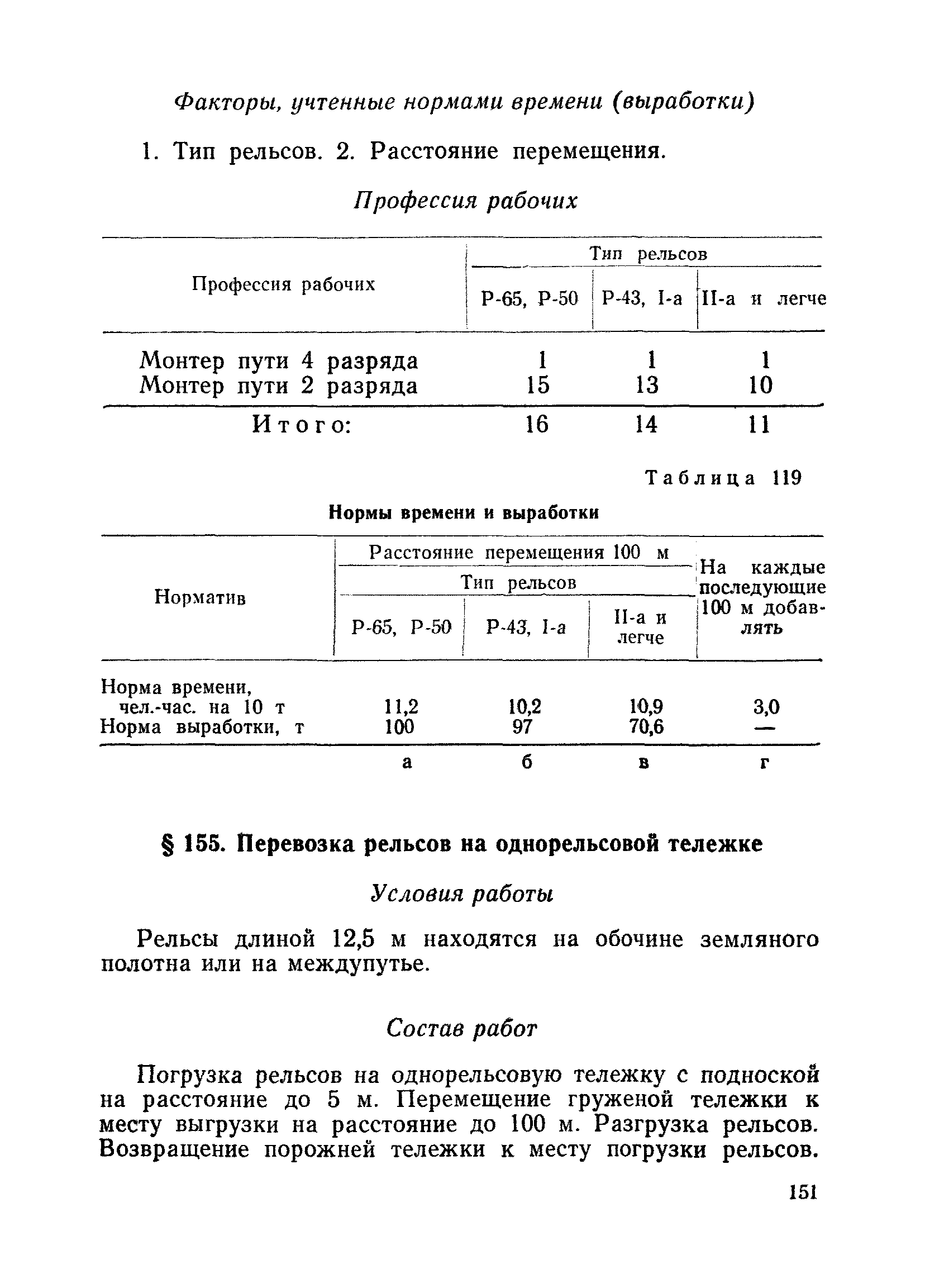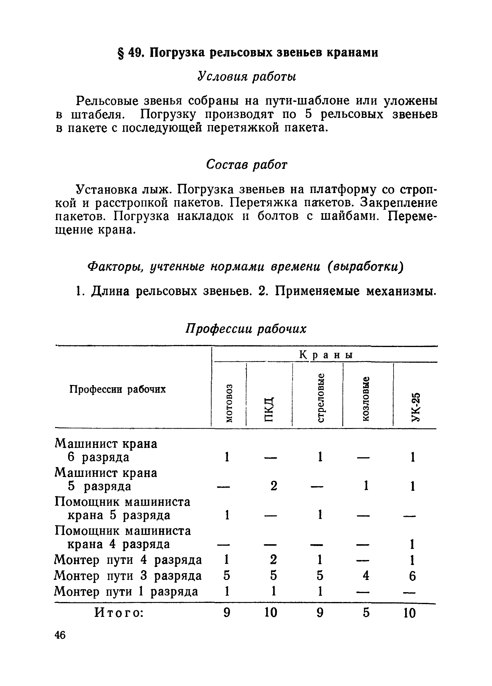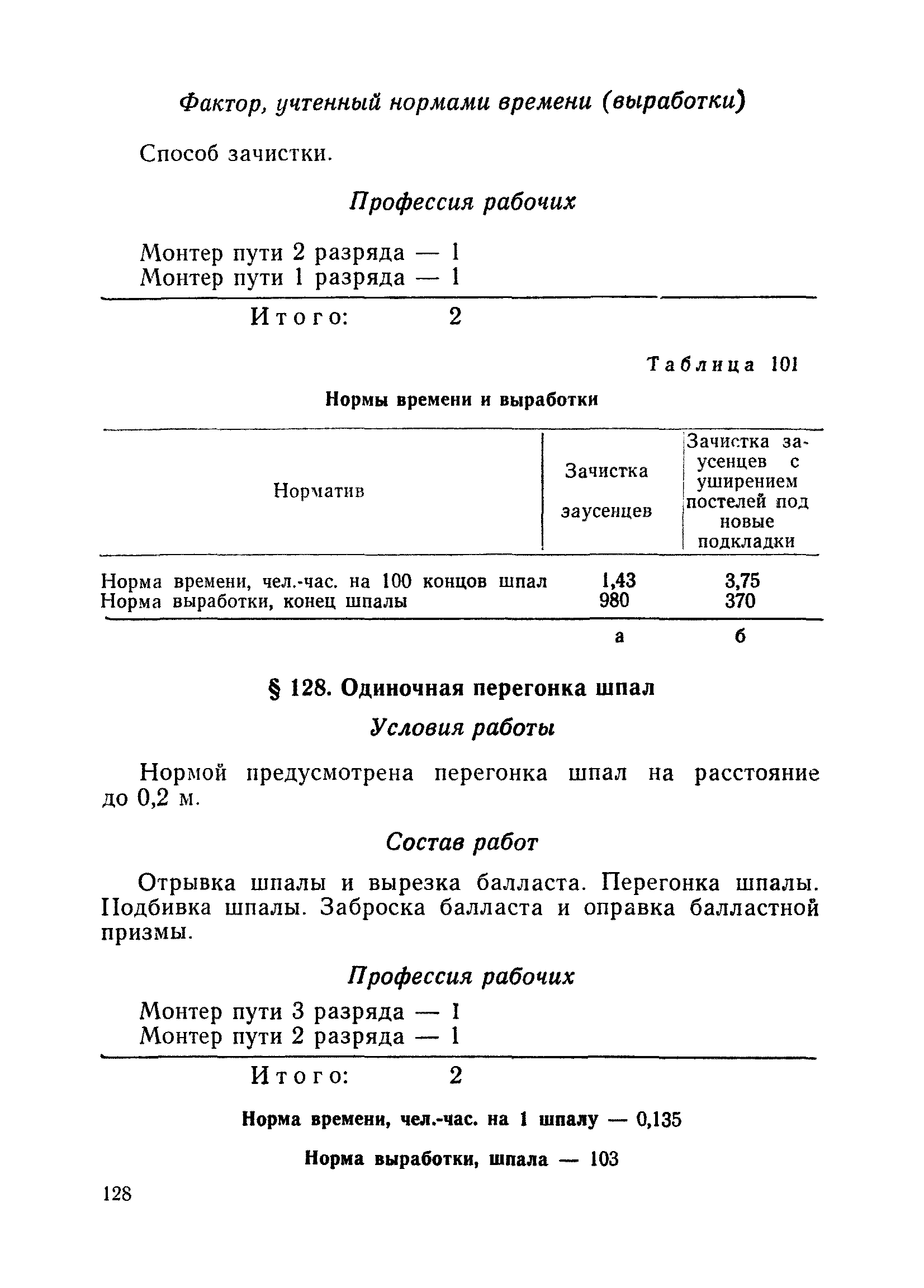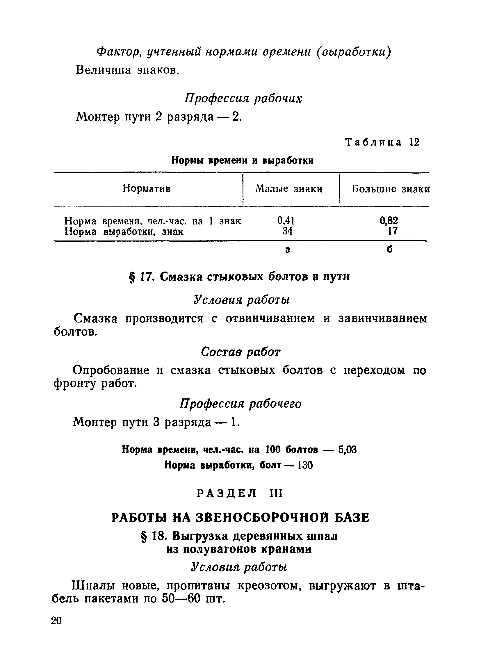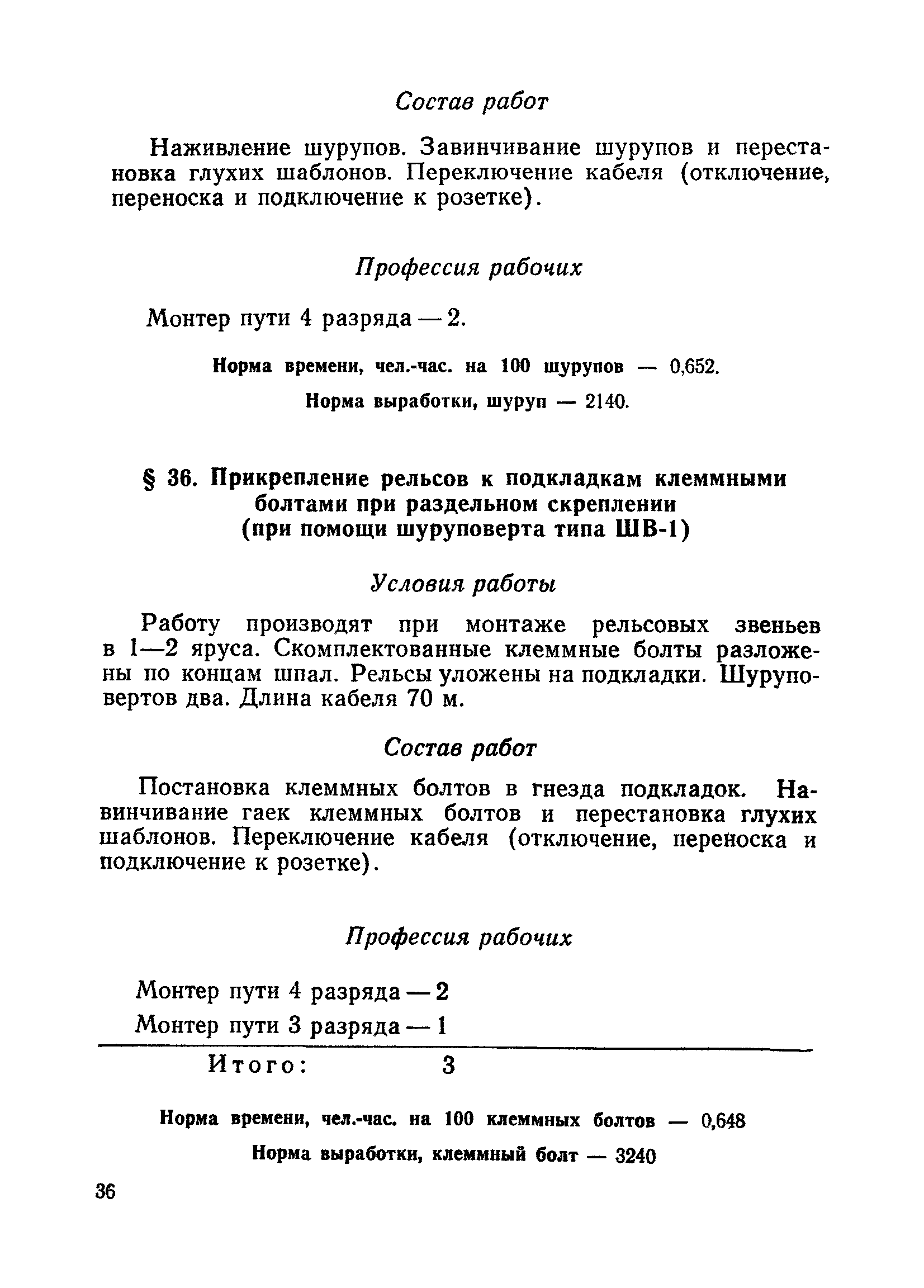 Единые нормы времени (выработки) на ремонт железнодорожного пути широкой колеи| Статус: | не действует | | Название рус.: | Единые нормы времени (выработки) на ремонт железнодорожного пути широкой колеи | | Дата добавления в базу: | 01.01.2018 | | Дата актуализации: | 01.01.2021 | | Область применения: | Единые нормы времени (выработки) были обязательны для применения во всех погрузочно-транспортных управлениях (объединениях) и других организациях Минуглепрома СССР, имеющих постоянные железнодорожные пути широкой колеи | | Оглавление: | Общая часть Техническая часть Нормативная часть Раздел I. Работы по земляному полотну § 1. Очистка кюветов вручную § 2. Уборка загрязненного балласта или грунта § 3. Работы, выполняемые путевым стругом § 4. Ручная срезка и планировка обочин § 5. Устройство и ремонт деревянного лотка § 6. Очистка нагорных канав Раздел II. Подготовительные работы на перегоне § 7. Срезка загрязненной корки балласта § 8. Вырезка балласта на глубину до нижней постели шпал § 9. Замена загрязненного балласта до нижней постели шпал § 10. Визирование пути § 11. Вырезка, прогрохотка и заброска в путь щебеночного балласта § 12. Выправка продольного профиля вручную с подрезкой загрязненного балласта ниже подошвы шпал § 13. Разборка вручную деревянного переездного настила § 14. Разборка вручную железобетонного переездного настила § 15. Разборка постоянного переездного настила кранами § 16. Снятие малых и больших путевых знаков § 17. Смазка стыковых болтов в пути Раздел III. Работы на звеносборочной базе § 18. Выгрузка деревянных шпал из полувагонов кранами § 19. Выгрузка деревянных шпал вручную § 20. Выгрузка железобетонных шпал из полувагонов кранами § 21. Погрузка деревянных шпал в полувагоны кранами § 22. Раскладка пакетов деревянных шпал на пути-шаблоне дрезиной АГМу § 23. Раскладка пакетов деревянных шпал на пути-шаблоне кранами § 24. Раскладка вручную шпал на пути-шаблоне при сборке рельсовых звеньев § 25. Забивка П-образных скоб § 26. Сверление костыльных отверстии в шпалах § 27. Комплектование закладных и клеммных болтов § 28. Раскладка прокладок § 29. Раскладка скреплений § 30. Раскладка рельсов длиной 25 м на подкладки погрузочными кранами § 31. Разметка мест положения осей шпал на шейке рельса § 32. Прикрепление рельсов к шпалам по шаблону на маячных шпалах § 33. Прикрепление рельсов к шпалам костылями (при помощи пневматического молотка типа ОМСП-5 или электропневматического костылезабивщика типа ЭПК-2 или ЭПК-3) § 34. Прикрепление подкладок к деревянным шпалам шурупами (вручную) § 35. Прикрепление подкладок к деревянным шпалам шурупами (при помощи шуруповерта типа ШВ-1) § 36. Прикрепление рельсов к подкладкам клеммными болтами при раздельном скреплении (при помощи шуруповерта типа ШВ-1) § 37. Прикрепление рельсов к шпалам при скреплении Типа КБ (при помощи шуруповерта типа ШВ-1) § 38. Прикрепление рельсов к шпалам при скреплении типа ЖБ (при помощи шурупно-гаечного ключа типа ШГК) § 39. Пришивка рельсов к шпалам вручную § 40. Прикрепление рельсов к шпалам при скреплении типа ЖБ (при помощи шуруповерта типа ШВ-1) § 41. Постановка противоугонов § 42. Укладка звеньев в штабель кранами § 43. Клеймение шпал § 44. Обрезка длинных шпал § 45. Постановка рельсовых стыков на графитовую мазь § 46. Обвязка концов шпал § 47. Погрузка рельсовых звеньев погрузочным краном ПКД (рельсовые звенья длиной 25 м 