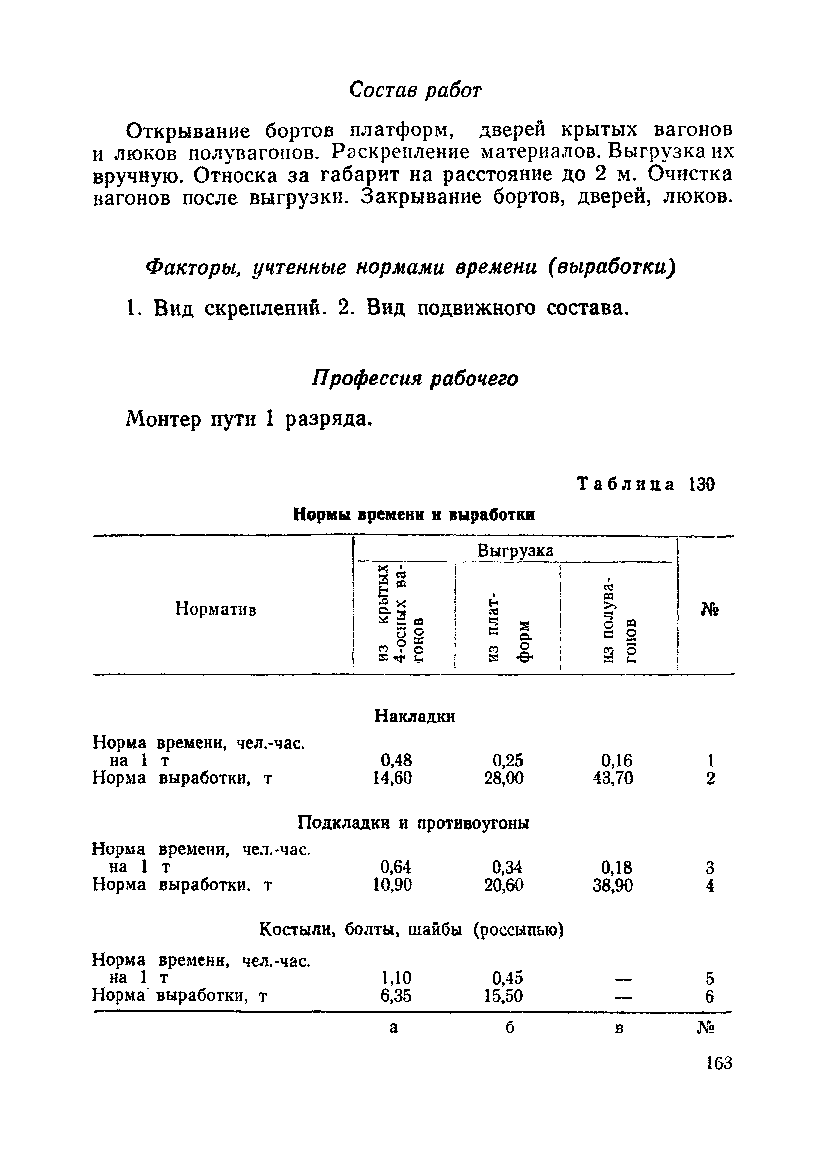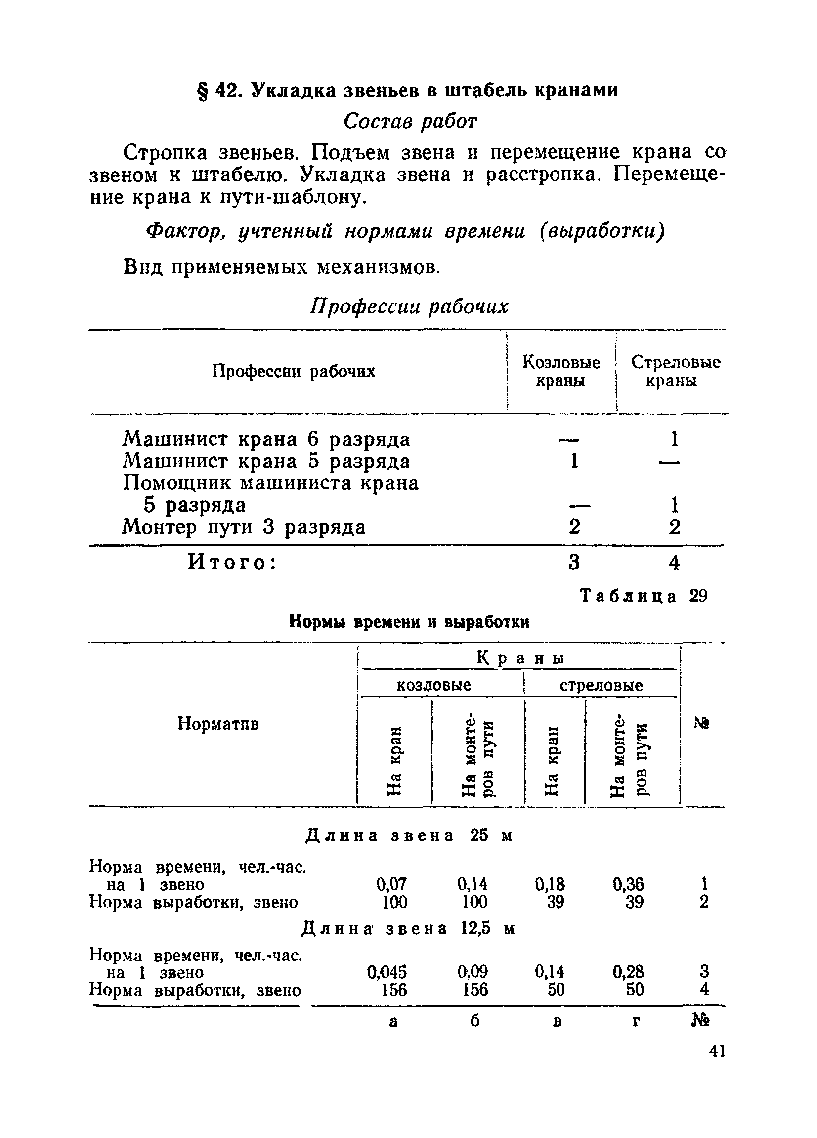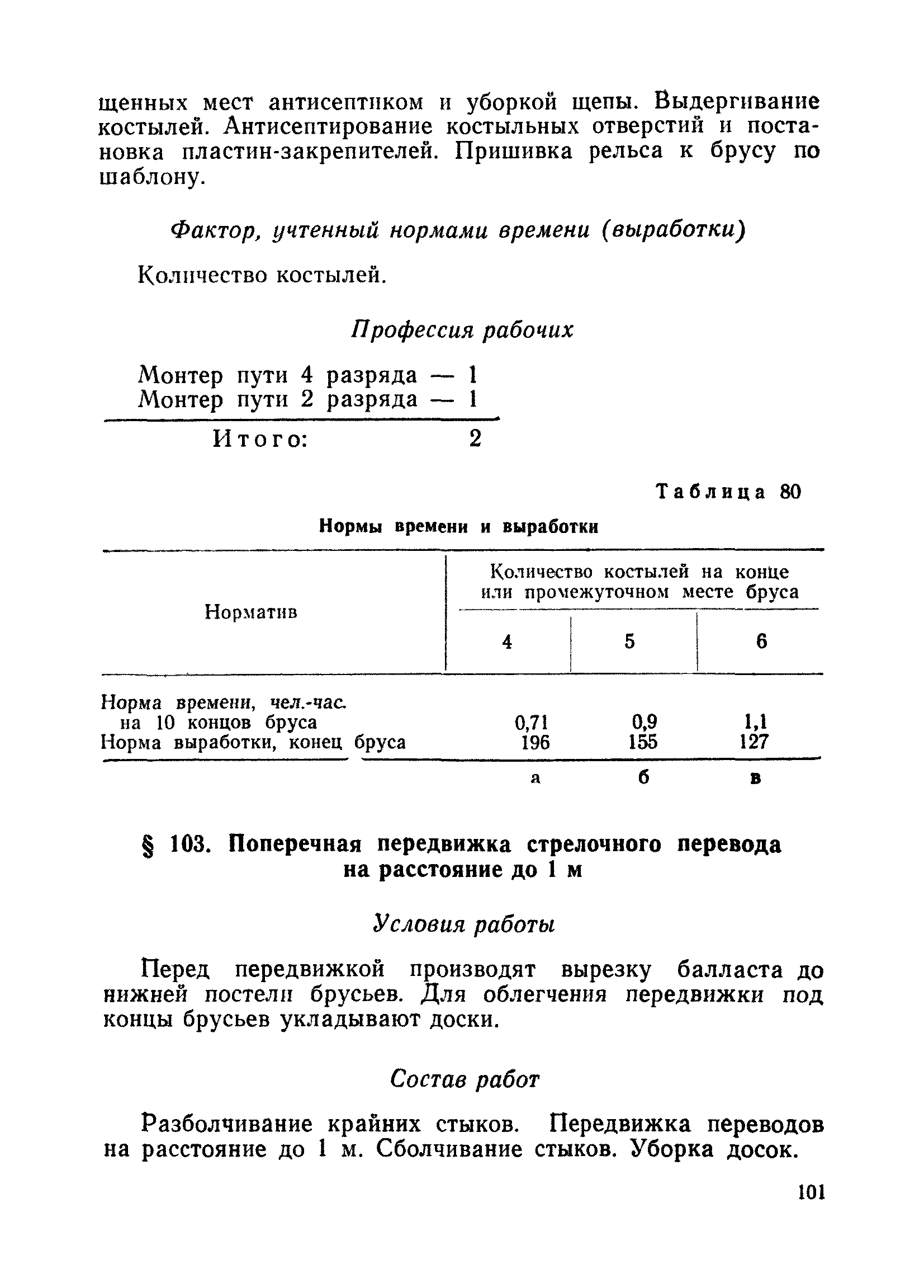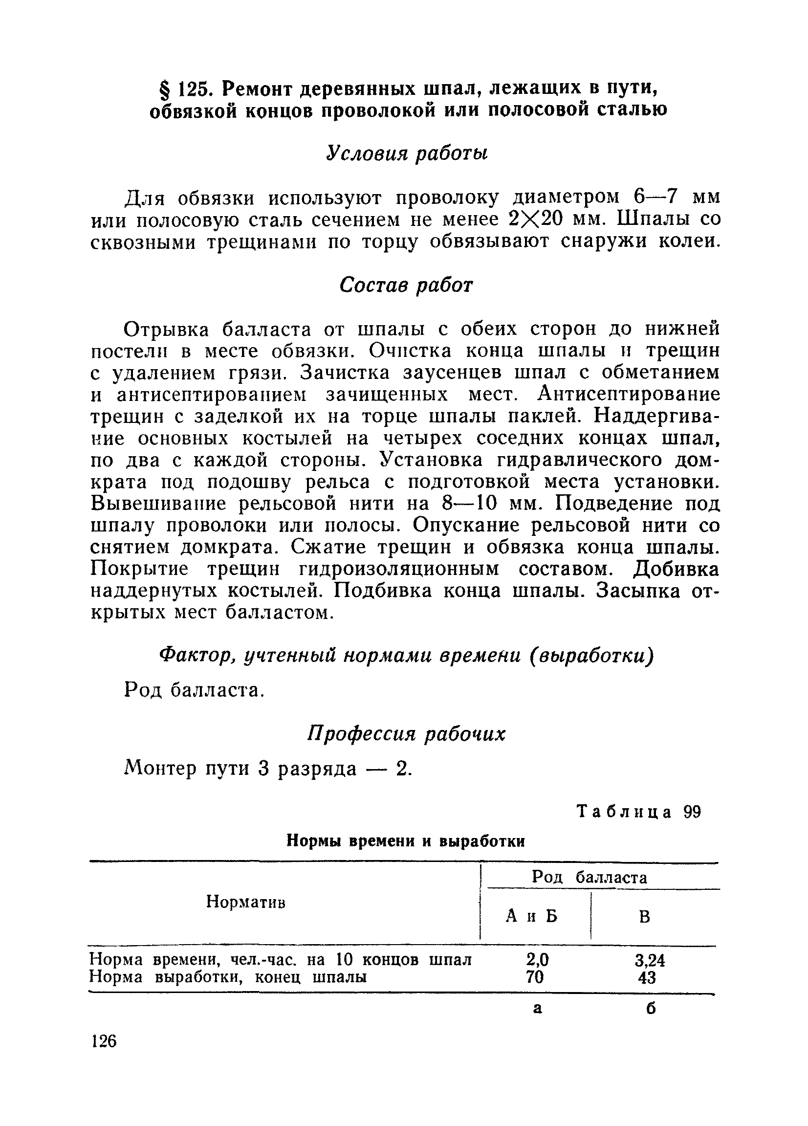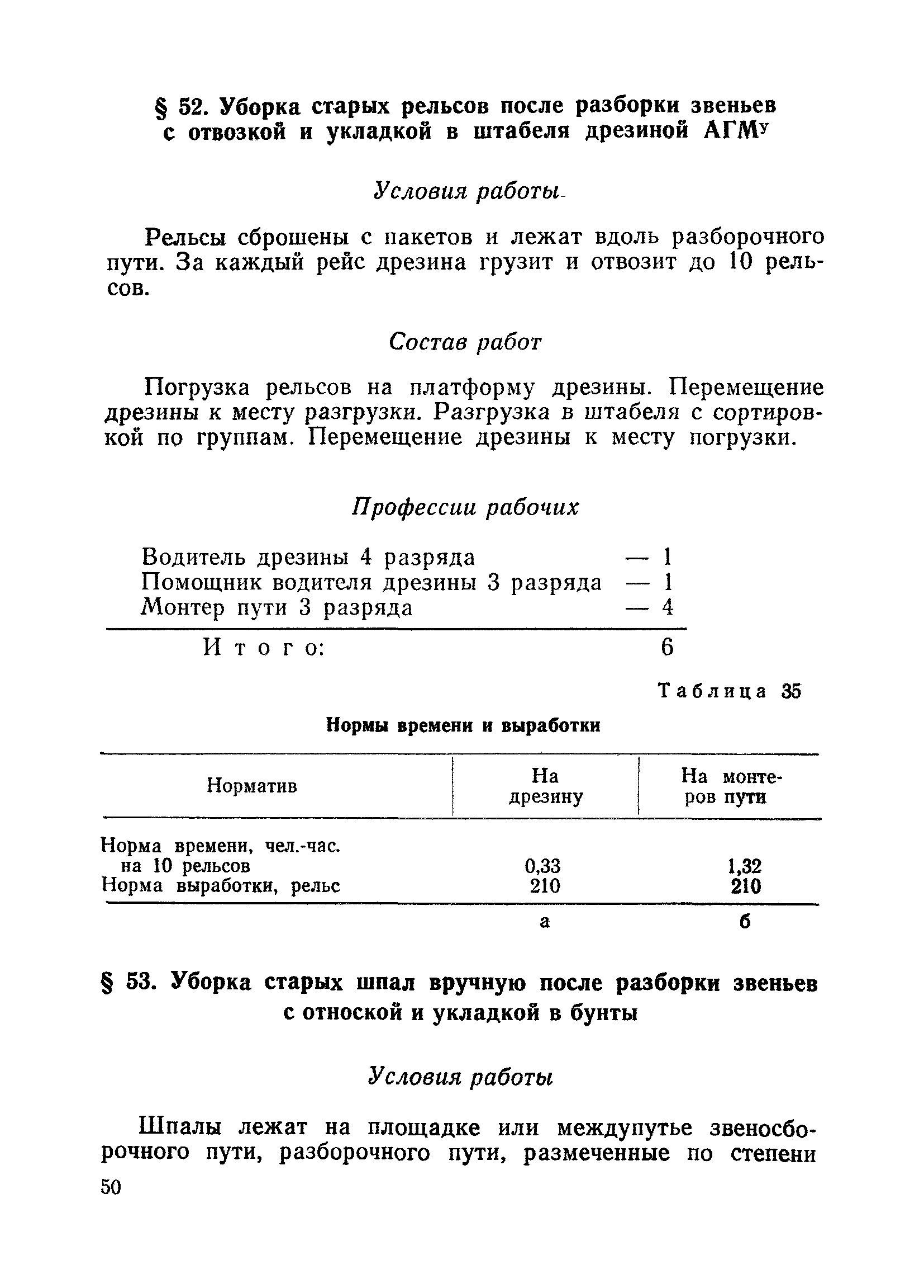 Единые нормы времени (выработки) на ремонт железнодорожного пути широкой колеи| Статус: | не действует | | Название рус.: | Единые нормы времени (выработки) на ремонт железнодорожного пути широкой колеи | | Дата добавления в базу: | 01.01.2018 | | Дата актуализации: | 01.01.2021 | | Область применения: | Единые нормы времени (выработки) были обязательны для применения во всех погрузочно-транспортных управлениях (объединениях) и других организациях Минуглепрома СССР, имеющих постоянные железнодорожные пути широкой колеи | | Оглавление: | Общая часть Техническая часть Нормативная часть Раздел I. Работы по земляному полотну § 1. Очистка кюветов вручную § 2. Уборка загрязненного балласта или грунта § 3. Работы, выполняемые путевым стругом § 4. Ручная срезка и планировка обочин § 5. Устройство и ремонт деревянного лотка § 6. Очистка нагорных канав Раздел II. Подготовительные работы на перегоне § 7. Срезка загрязненной корки балласта § 8. Вырезка балласта на глубину до нижней постели шпал § 9. Замена загрязненного балласта до нижней постели шпал § 10. Визирование пути § 11. Вырезка, прогрохотка и заброска в путь щебеночного балласта § 12. Выправка продольного профиля вручную с подрезкой загрязненного балласта ниже подошвы шпал § 13. Разборка вручную деревянного переездного настила § 14. Разборка вручную железобетонного переездного настила § 15. Разборка постоянного переездного настила кранами § 16. Снятие малых и больших путевых знаков § 17. Смазка стыковых болтов в пути Раздел III. Работы на звеносборочной базе § 18. Выгрузка деревянных шпал из полувагонов кранами § 19. Выгрузка деревянных шпал вручную § 20. Выгрузка железобетонных шпал из полувагонов кранами § 21. Погрузка деревянных шпал в полувагоны кранами § 22. Раскладка пакетов деревянных шпал на пути-шаблоне дрезиной АГМу § 23. Раскладка пакетов деревянных шпал на пути-шаблоне кранами § 24. Раскладка вручную шпал на пути-шаблоне при сборке рельсовых звеньев § 25. Забивка П-образных скоб § 26. Сверление костыльных отверстии в шпалах § 27. Комплектование закладных и клеммных болтов § 28. Раскладка прокладок § 29. Раскладка скреплений § 30. Раскладка рельсов длиной 25 м на подкладки погрузочными кранами § 31. Разметка мест положения осей шпал на шейке рельса § 32. Прикрепление рельсов к шпалам по шаблону на маячных шпалах § 33. Прикрепление рельсов к шпалам костылями (при помощи пневматического молотка типа ОМСП-5 или электропневматического костылезабивщика типа ЭПК-2 или ЭПК-3) § 34. Прикрепление подкладок к деревянным шпалам шурупами (вручную) § 35. Прикрепление подкладок к деревянным шпалам шурупами (при помощи шуруповерта типа ШВ-1) § 36. Прикрепление рельсов к подкладкам клеммными болтами при раздельном скреплении (при помощи шуруповерта типа ШВ-1) § 37. Прикрепление рельсов к шпалам при скреплении Типа КБ (при помощи шуруповерта типа ШВ-1) § 38. Прикрепление рельсов к шпалам при скреплении типа ЖБ (при помощи шурупно-гаечного ключа типа ШГК) § 39. Пришивка рельсов к шпалам вручную § 40. Прикрепление рельсов к шпалам при скреплении типа ЖБ (при помощи шуруповерта типа ШВ-1) § 41. Постановка противоугонов § 42. Укладка звеньев в штабель кранами § 43. Клеймение шпал § 44. Обрезка длинных шпал § 45. Постановка рельсовых стыков на графитовую мазь § 46. Обвязка концов шпал § 47. Погрузка рельсовых звеньев погрузочным краном ПКД (рельсовые звенья длиной 25 м 