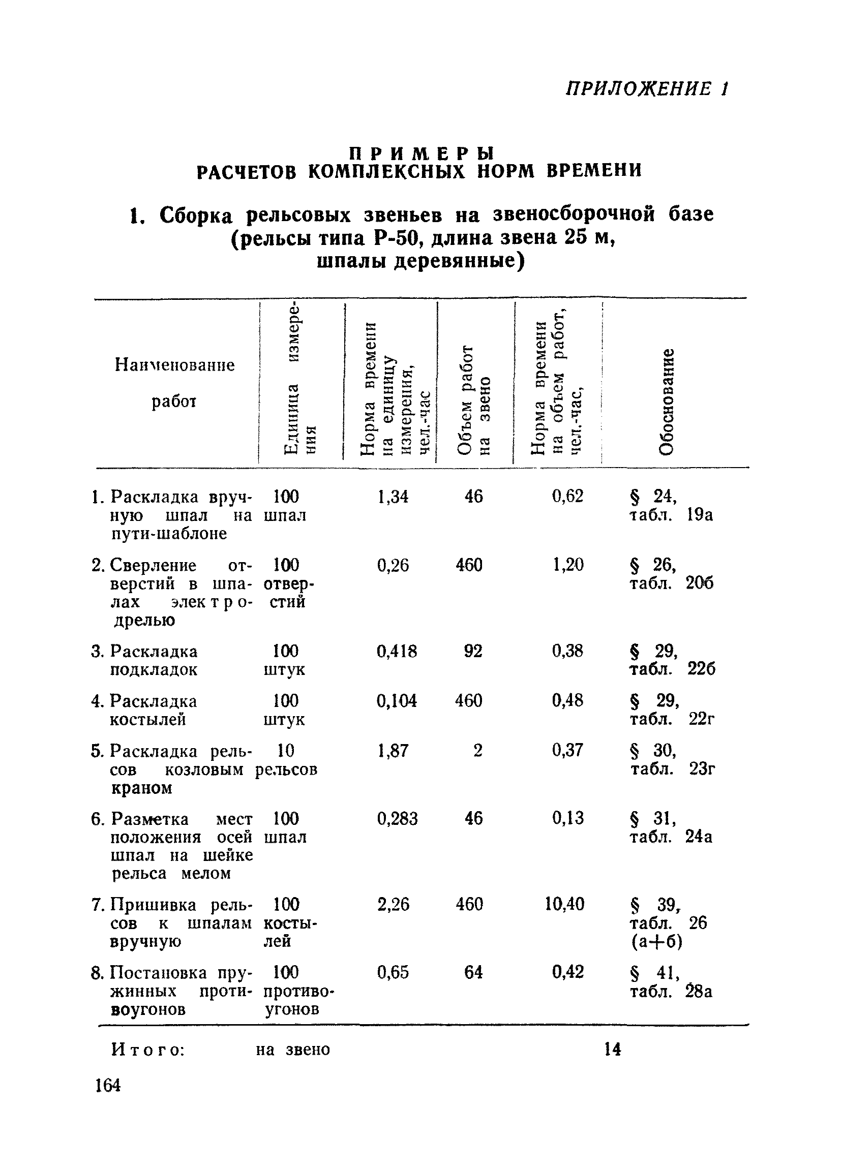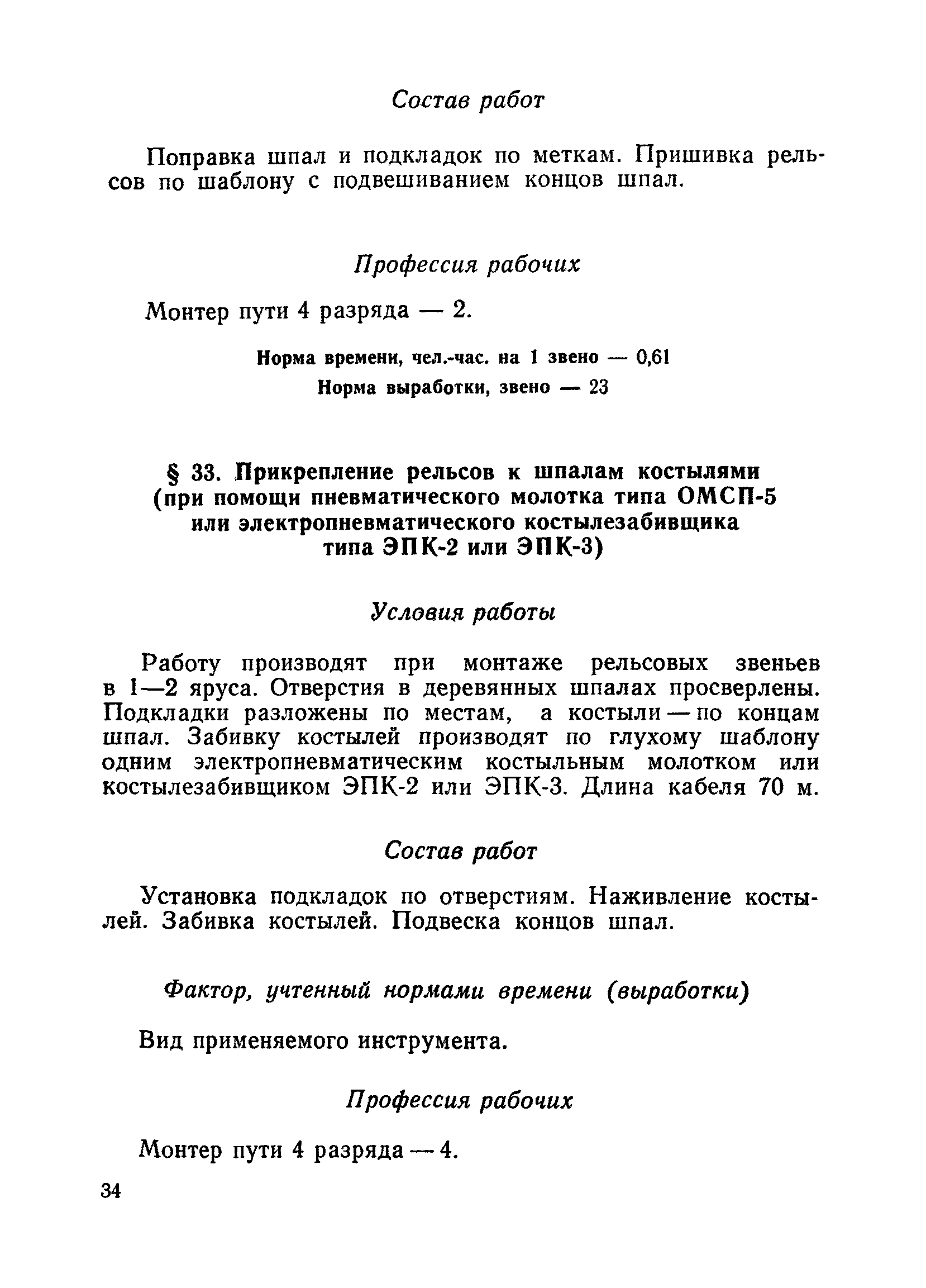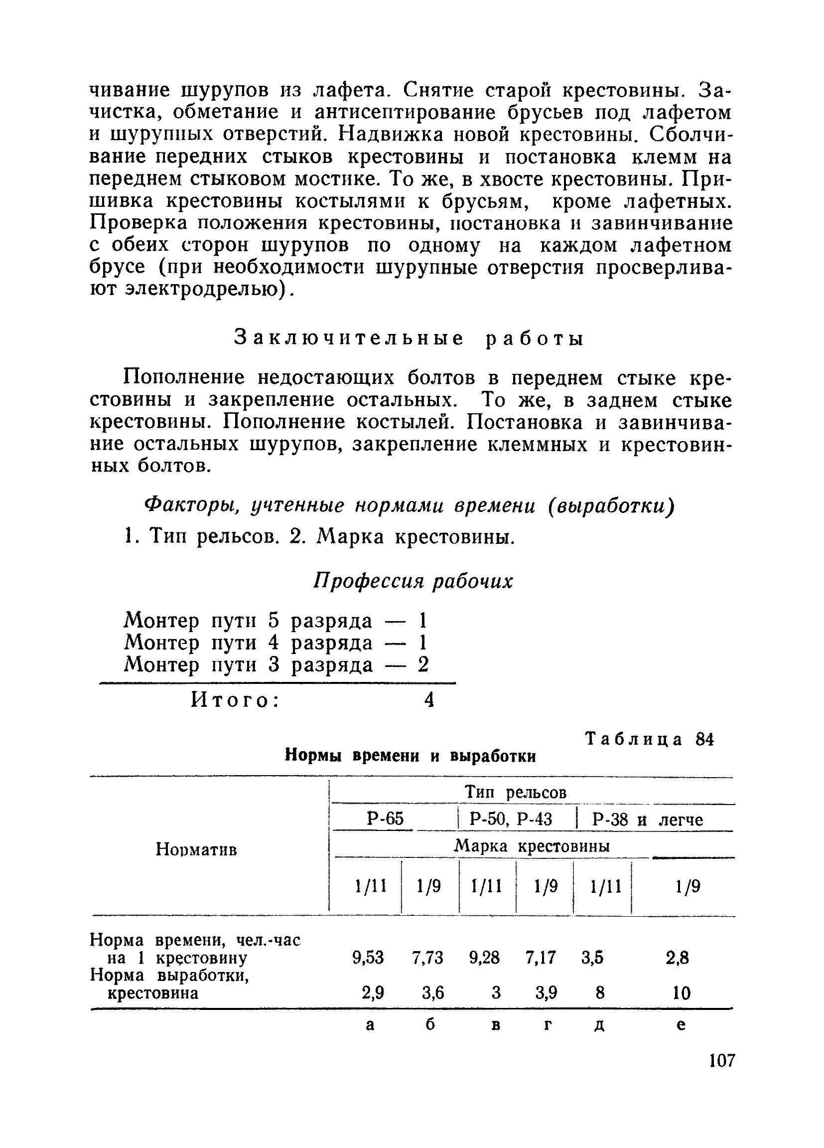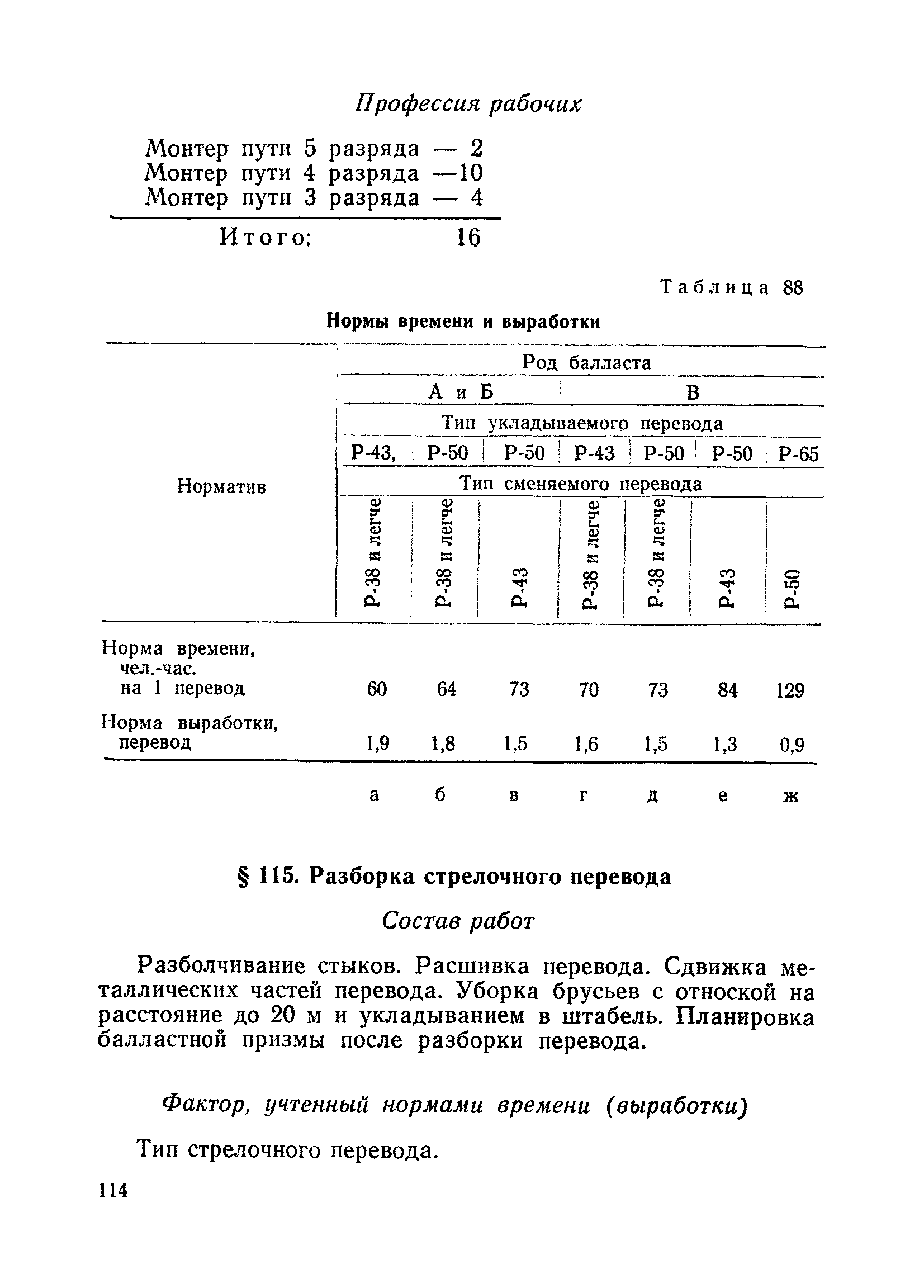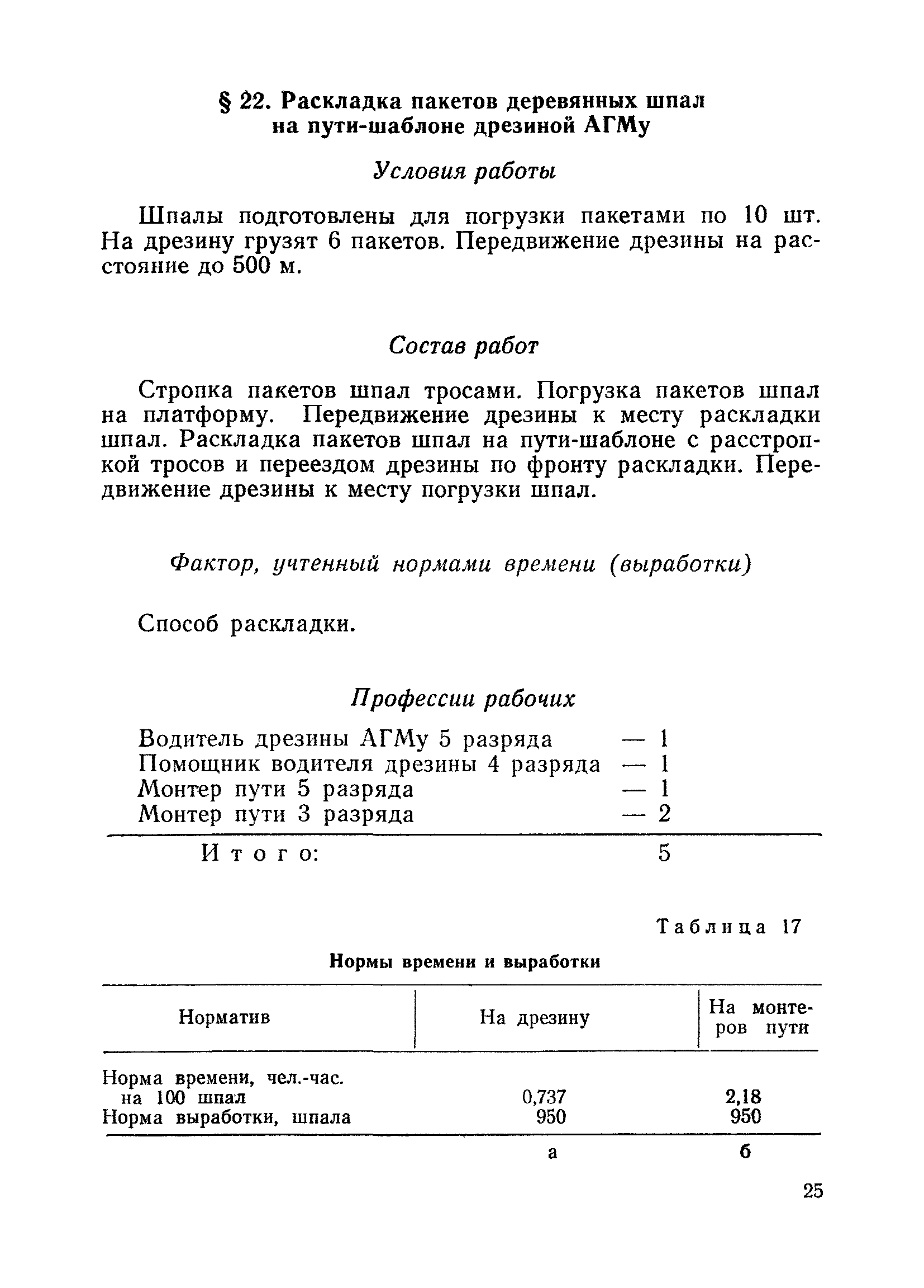 Единые нормы времени (выработки) на ремонт железнодорожного пути широкой колеи| Статус: | не действует | | Название рус.: | Единые нормы времени (выработки) на ремонт железнодорожного пути широкой колеи | | Дата добавления в базу: | 01.01.2018 | | Дата актуализации: | 01.01.2021 | | Область применения: | Единые нормы времени (выработки) были обязательны для применения во всех погрузочно-транспортных управлениях (объединениях) и других организациях Минуглепрома СССР, имеющих постоянные железнодорожные пути широкой колеи | | Оглавление: | Общая часть Техническая часть Нормативная часть Раздел I. Работы по земляному полотну § 1. Очистка кюветов вручную § 2. Уборка загрязненного балласта или грунта § 3. Работы, выполняемые путевым стругом § 4. Ручная срезка и планировка обочин § 5. Устройство и ремонт деревянного лотка § 6. Очистка нагорных канав Раздел II. Подготовительные работы на перегоне § 7. Срезка загрязненной корки балласта § 8. Вырезка балласта на глубину до нижней постели шпал § 9. Замена загрязненного балласта до нижней постели шпал § 10. Визирование пути § 11. Вырезка, прогрохотка и заброска в путь щебеночного балласта § 12. Выправка продольного профиля вручную с подрезкой загрязненного балласта ниже подошвы шпал § 13. Разборка вручную деревянного переездного настила § 14. Разборка вручную железобетонного переездного настила § 15. Разборка постоянного переездного настила кранами § 16. Снятие малых и больших путевых знаков § 17. Смазка стыковых болтов в пути Раздел III. Работы на звеносборочной базе § 18. Выгрузка деревянных шпал из полувагонов кранами § 19. Выгрузка деревянных шпал вручную § 20. Выгрузка железобетонных шпал из полувагонов кранами § 21. Погрузка деревянных шпал в полувагоны кранами § 22. Раскладка пакетов деревянных шпал на пути-шаблоне дрезиной АГМу § 23. Раскладка пакетов деревянных шпал на пути-шаблоне кранами § 24. Раскладка вручную шпал на пути-шаблоне при сборке рельсовых звеньев § 25. Забивка П-образных скоб § 26. Сверление костыльных отверстии в шпалах § 27. Комплектование закладных и клеммных болтов § 28. Раскладка прокладок § 29. Раскладка скреплений § 30. Раскладка рельсов длиной 25 м на подкладки погрузочными кранами § 31. Разметка мест положения осей шпал на шейке рельса § 32. Прикрепление рельсов к шпалам по шаблону на маячных шпалах § 33. Прикрепление рельсов к шпалам костылями (при помощи пневматического молотка типа ОМСП-5 или электропневматического костылезабивщика типа ЭПК-2 или ЭПК-3) § 34. Прикрепление подкладок к деревянным шпалам шурупами (вручную) § 35. Прикрепление подкладок к деревянным шпалам шурупами (при помощи шуруповерта типа ШВ-1) § 36. Прикрепление рельсов к подкладкам клеммными болтами при раздельном скреплении (при помощи шуруповерта типа ШВ-1) § 37. Прикрепление рельсов к шпалам при скреплении Типа КБ (при помощи шуруповерта типа ШВ-1) § 38. Прикрепление рельсов к шпалам при скреплении типа ЖБ (при помощи шурупно-гаечного ключа типа ШГК) § 39. Пришивка рельсов к шпалам вручную § 40. Прикрепление рельсов к шпалам при скреплении типа ЖБ (при помощи шуруповерта типа ШВ-1) § 41. Постановка противоугонов § 42. Укладка звеньев в штабель кранами § 43. Клеймение шпал § 44. Обрезка длинных шпал § 45. Постановка рельсовых стыков на графитовую мазь § 46. Обвязка концов шпал § 47. Погрузка рельсовых звеньев погрузочным краном ПКД (рельсовые звенья длиной 25 м 