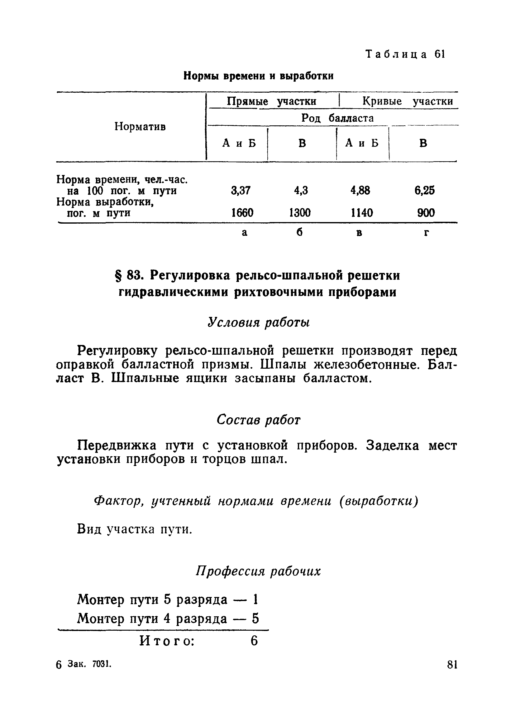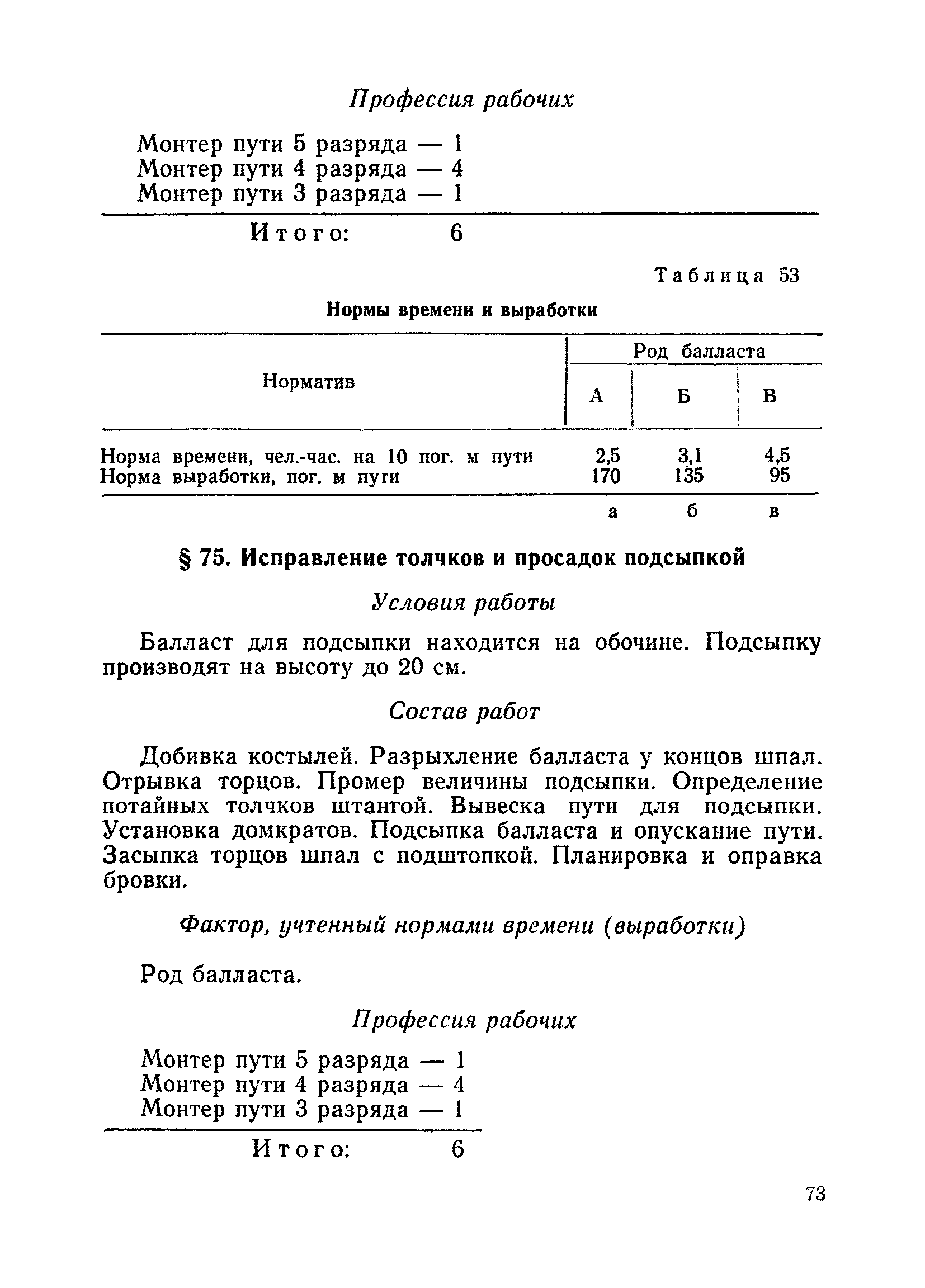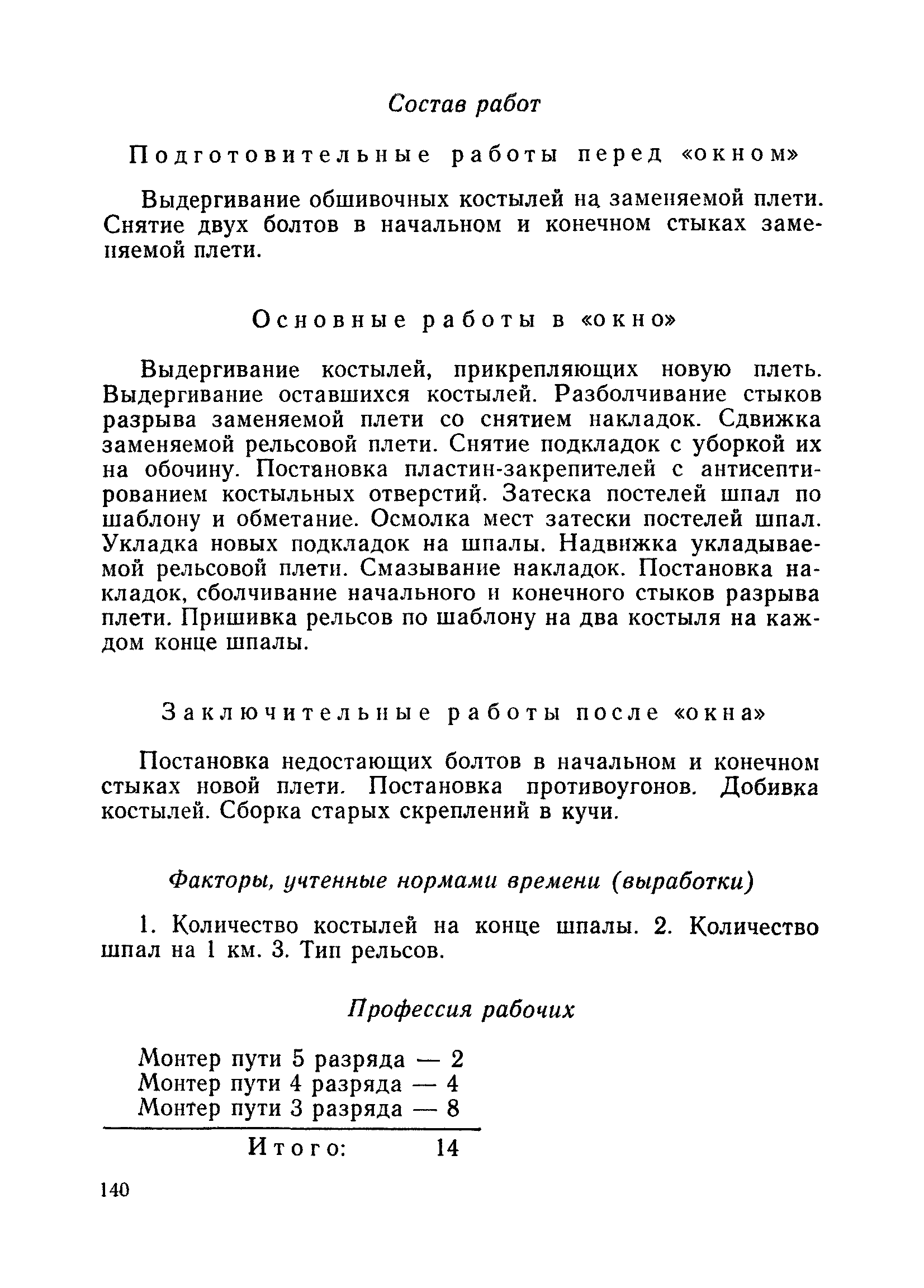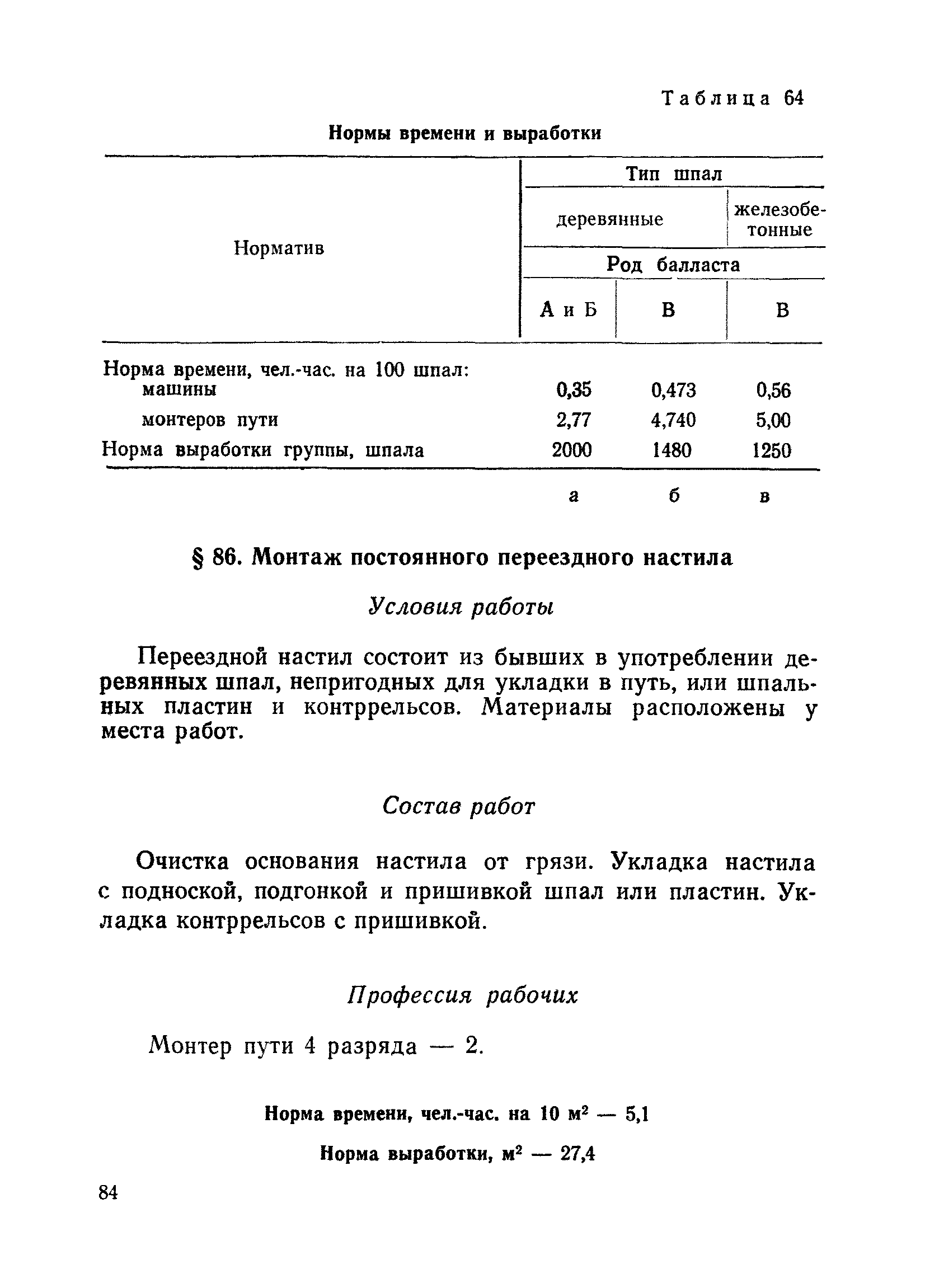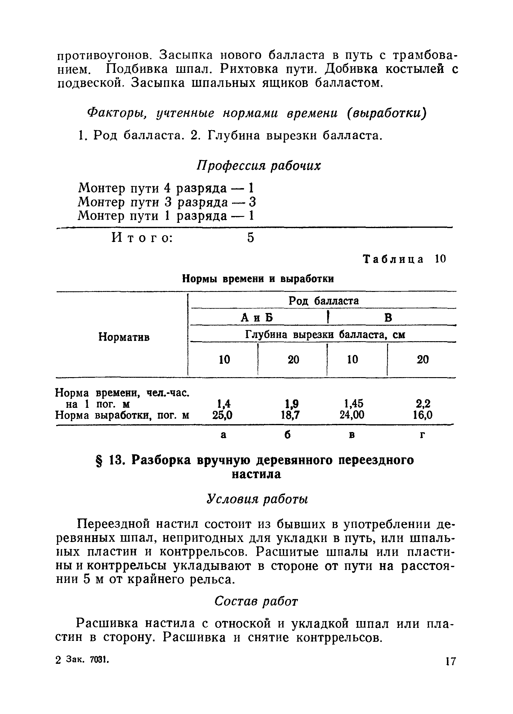 Единые нормы времени (выработки) на ремонт железнодорожного пути широкой колеи| Статус: | не действует | | Название рус.: | Единые нормы времени (выработки) на ремонт железнодорожного пути широкой колеи | | Дата добавления в базу: | 01.01.2018 | | Дата актуализации: | 01.01.2021 | | Область применения: | Единые нормы времени (выработки) были обязательны для применения во всех погрузочно-транспортных управлениях (объединениях) и других организациях Минуглепрома СССР, имеющих постоянные железнодорожные пути широкой колеи | | Оглавление: | Общая часть Техническая часть Нормативная часть Раздел I. Работы по земляному полотну § 1. Очистка кюветов вручную § 2. Уборка загрязненного балласта или грунта § 3. Работы, выполняемые путевым стругом § 4. Ручная срезка и планировка обочин § 5. Устройство и ремонт деревянного лотка § 6. Очистка нагорных канав Раздел II. Подготовительные работы на перегоне § 7. Срезка загрязненной корки балласта § 8. Вырезка балласта на глубину до нижней постели шпал § 9. Замена загрязненного балласта до нижней постели шпал § 10. Визирование пути § 11. Вырезка, прогрохотка и заброска в путь щебеночного балласта § 12. Выправка продольного профиля вручную с подрезкой загрязненного балласта ниже подошвы шпал § 13. Разборка вручную деревянного переездного настила § 14. Разборка вручную железобетонного переездного настила § 15. Разборка постоянного переездного настила кранами § 16. Снятие малых и больших путевых знаков § 17. Смазка стыковых болтов в пути Раздел III. Работы на звеносборочной базе § 18. Выгрузка деревянных шпал из полувагонов кранами § 19. Выгрузка деревянных шпал вручную § 20. Выгрузка железобетонных шпал из полувагонов кранами § 21. Погрузка деревянных шпал в полувагоны кранами § 22. Раскладка пакетов деревянных шпал на пути-шаблоне дрезиной АГМу § 23. Раскладка пакетов деревянных шпал на пути-шаблоне кранами § 24. Раскладка вручную шпал на пути-шаблоне при сборке рельсовых звеньев § 25. Забивка П-образных скоб § 26. Сверление костыльных отверстии в шпалах § 27. Комплектование закладных и клеммных болтов § 28. Раскладка прокладок § 29. Раскладка скреплений § 30. Раскладка рельсов длиной 25 м на подкладки погрузочными кранами § 31. Разметка мест положения осей шпал на шейке рельса § 32. Прикрепление рельсов к шпалам по шаблону на маячных шпалах § 33. Прикрепление рельсов к шпалам костылями (при помощи пневматического молотка типа ОМСП-5 или электропневматического костылезабивщика типа ЭПК-2 или ЭПК-3) § 34. Прикрепление подкладок к деревянным шпалам шурупами (вручную) § 35. Прикрепление подкладок к деревянным шпалам шурупами (при помощи шуруповерта типа ШВ-1) § 36. Прикрепление рельсов к подкладкам клеммными болтами при раздельном скреплении (при помощи шуруповерта типа ШВ-1) § 37. Прикрепление рельсов к шпалам при скреплении Типа КБ (при помощи шуруповерта типа ШВ-1) § 38. Прикрепление рельсов к шпалам при скреплении типа ЖБ (при помощи шурупно-гаечного ключа типа ШГК) § 39. Пришивка рельсов к шпалам вручную § 40. Прикрепление рельсов к шпалам при скреплении типа ЖБ (при помощи шуруповерта типа ШВ-1) § 41. Постановка противоугонов § 42. Укладка звеньев в штабель кранами § 43. Клеймение шпал § 44. Обрезка длинных шпал § 45. Постановка рельсовых стыков на графитовую мазь § 46. Обвязка концов шпал § 47. Погрузка рельсовых звеньев погрузочным краном ПКД (рельсовые звенья длиной 25 м 