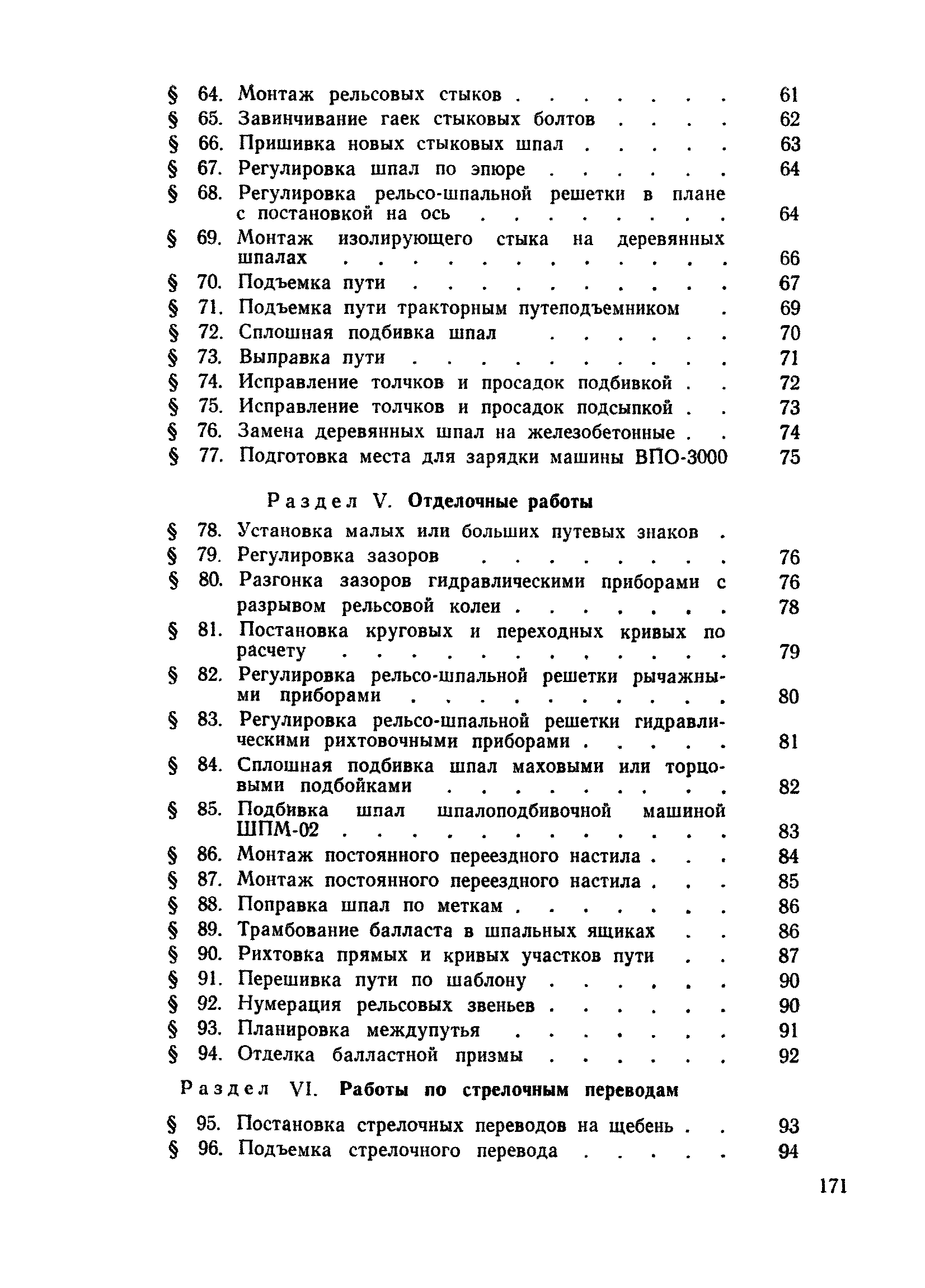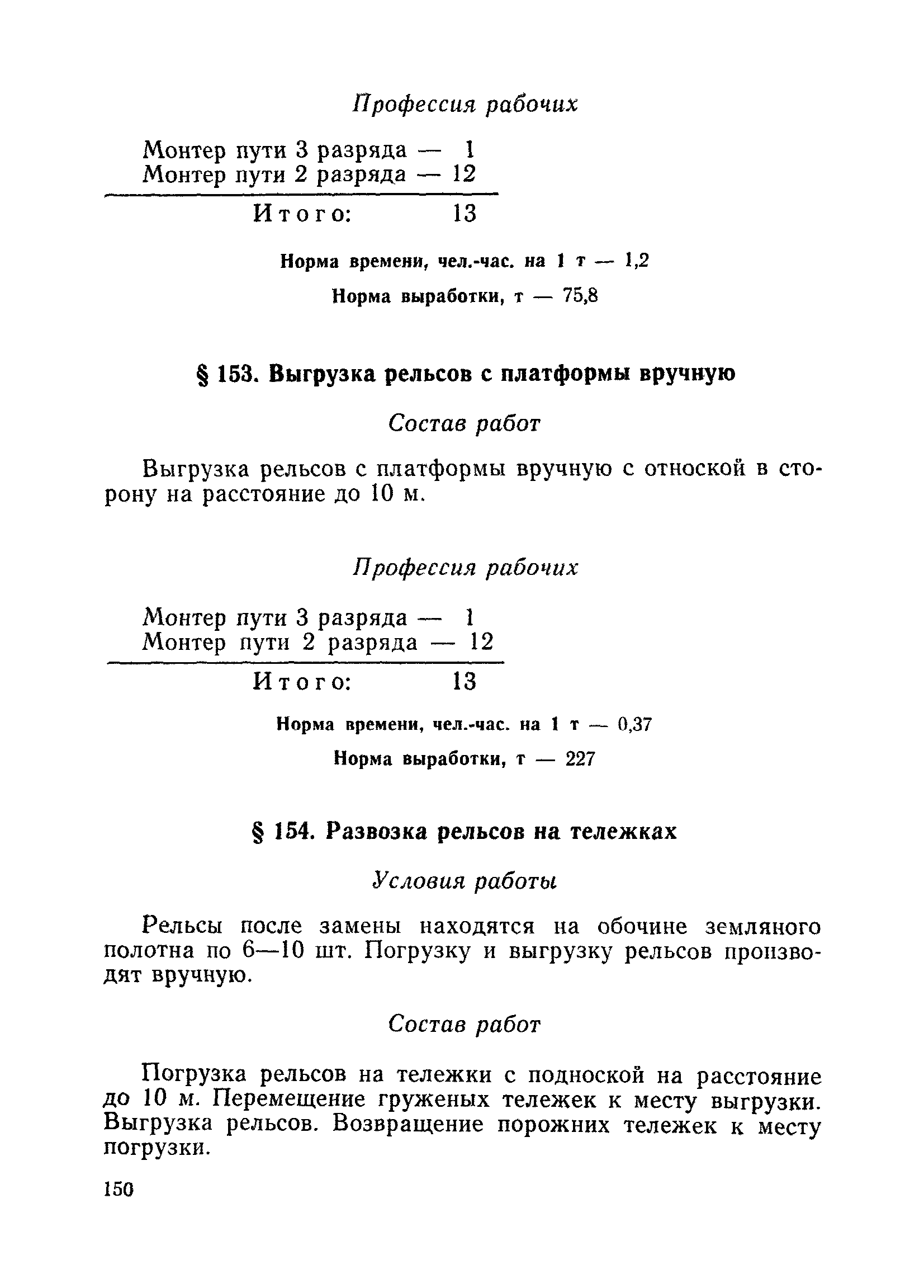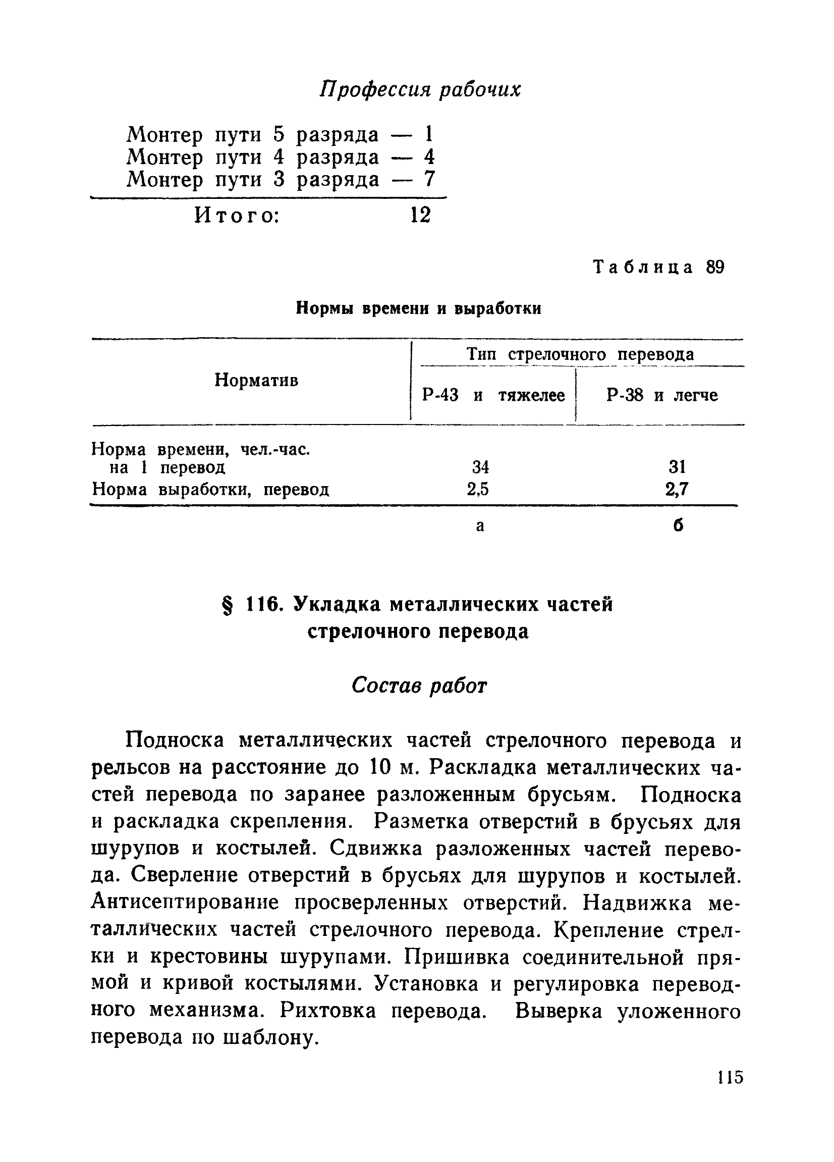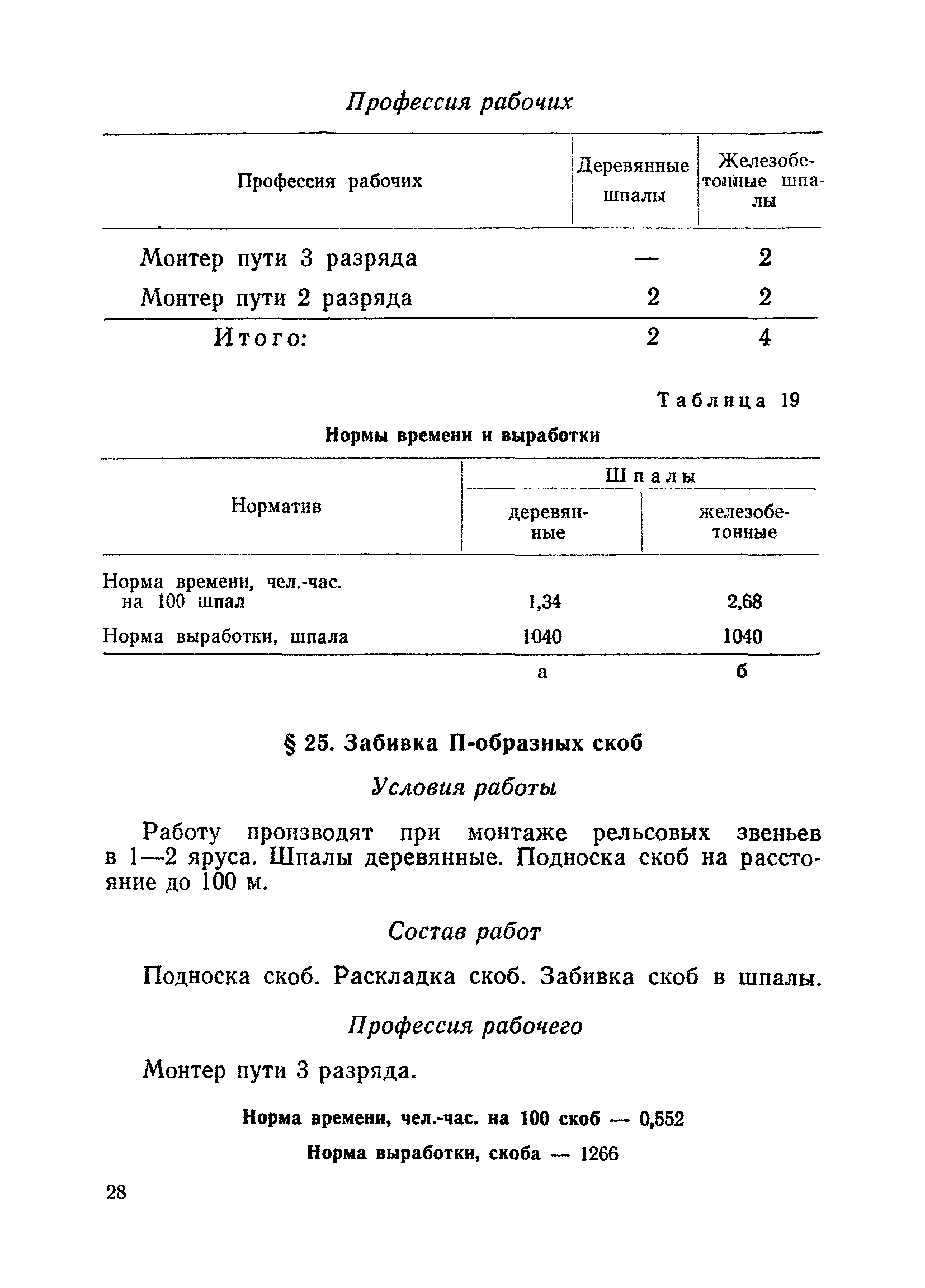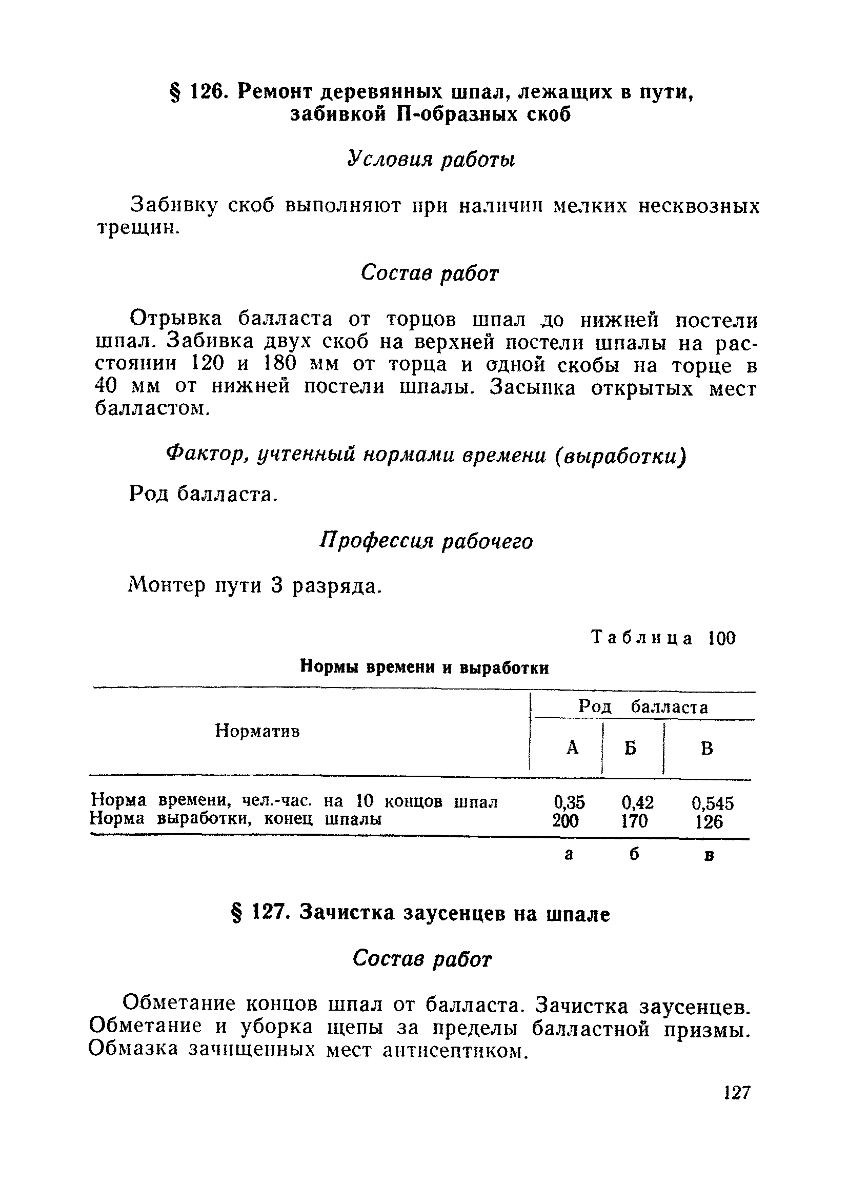 Единые нормы времени (выработки) на ремонт железнодорожного пути широкой колеи| Статус: | не действует | | Название рус.: | Единые нормы времени (выработки) на ремонт железнодорожного пути широкой колеи | | Дата добавления в базу: | 01.01.2018 | | Дата актуализации: | 01.01.2021 | | Область применения: | Единые нормы времени (выработки) были обязательны для применения во всех погрузочно-транспортных управлениях (объединениях) и других организациях Минуглепрома СССР, имеющих постоянные железнодорожные пути широкой колеи | | Оглавление: | Общая часть Техническая часть Нормативная часть Раздел I. Работы по земляному полотну § 1. Очистка кюветов вручную § 2. Уборка загрязненного балласта или грунта § 3. Работы, выполняемые путевым стругом § 4. Ручная срезка и планировка обочин § 5. Устройство и ремонт деревянного лотка § 6. Очистка нагорных канав Раздел II. Подготовительные работы на перегоне § 7. Срезка загрязненной корки балласта § 8. Вырезка балласта на глубину до нижней постели шпал § 9. Замена загрязненного балласта до нижней постели шпал § 10. Визирование пути § 11. Вырезка, прогрохотка и заброска в путь щебеночного балласта § 12. Выправка продольного профиля вручную с подрезкой загрязненного балласта ниже подошвы шпал § 13. Разборка вручную деревянного переездного настила § 14. Разборка вручную железобетонного переездного настила § 15. Разборка постоянного переездного настила кранами § 16. Снятие малых и больших путевых знаков § 17. Смазка стыковых болтов в пути Раздел III. Работы на звеносборочной базе § 18. Выгрузка деревянных шпал из полувагонов кранами § 19. Выгрузка деревянных шпал вручную § 20. Выгрузка железобетонных шпал из полувагонов кранами § 21. Погрузка деревянных шпал в полувагоны кранами § 22. Раскладка пакетов деревянных шпал на пути-шаблоне дрезиной АГМу § 23. Раскладка пакетов деревянных шпал на пути-шаблоне кранами § 24. Раскладка вручную шпал на пути-шаблоне при сборке рельсовых звеньев § 25. Забивка П-образных скоб § 26. Сверление костыльных отверстии в шпалах § 27. Комплектование закладных и клеммных болтов § 28. Раскладка прокладок § 29. Раскладка скреплений § 30. Раскладка рельсов длиной 25 м на подкладки погрузочными кранами § 31. Разметка мест положения осей шпал на шейке рельса § 32. Прикрепление рельсов к шпалам по шаблону на маячных шпалах § 33. Прикрепление рельсов к шпалам костылями (при помощи пневматического молотка типа ОМСП-5 или электропневматического костылезабивщика типа ЭПК-2 или ЭПК-3) § 34. Прикрепление подкладок к деревянным шпалам шурупами (вручную) § 35. Прикрепление подкладок к деревянным шпалам шурупами (при помощи шуруповерта типа ШВ-1) § 36. Прикрепление рельсов к подкладкам клеммными болтами при раздельном скреплении (при помощи шуруповерта типа ШВ-1) § 37. Прикрепление рельсов к шпалам при скреплении Типа КБ (при помощи шуруповерта типа ШВ-1) § 38. Прикрепление рельсов к шпалам при скреплении типа ЖБ (при помощи шурупно-гаечного ключа типа ШГК) § 39. Пришивка рельсов к шпалам вручную § 40. Прикрепление рельсов к шпалам при скреплении типа ЖБ (при помощи шуруповерта типа ШВ-1) § 41. Постановка противоугонов § 42. Укладка звеньев в штабель кранами § 43. Клеймение шпал § 44. Обрезка длинных шпал § 45. Постановка рельсовых стыков на графитовую мазь § 46. Обвязка концов шпал § 47. Погрузка рельсовых звеньев погрузочным краном ПКД (рельсовые звенья длиной 25 м 