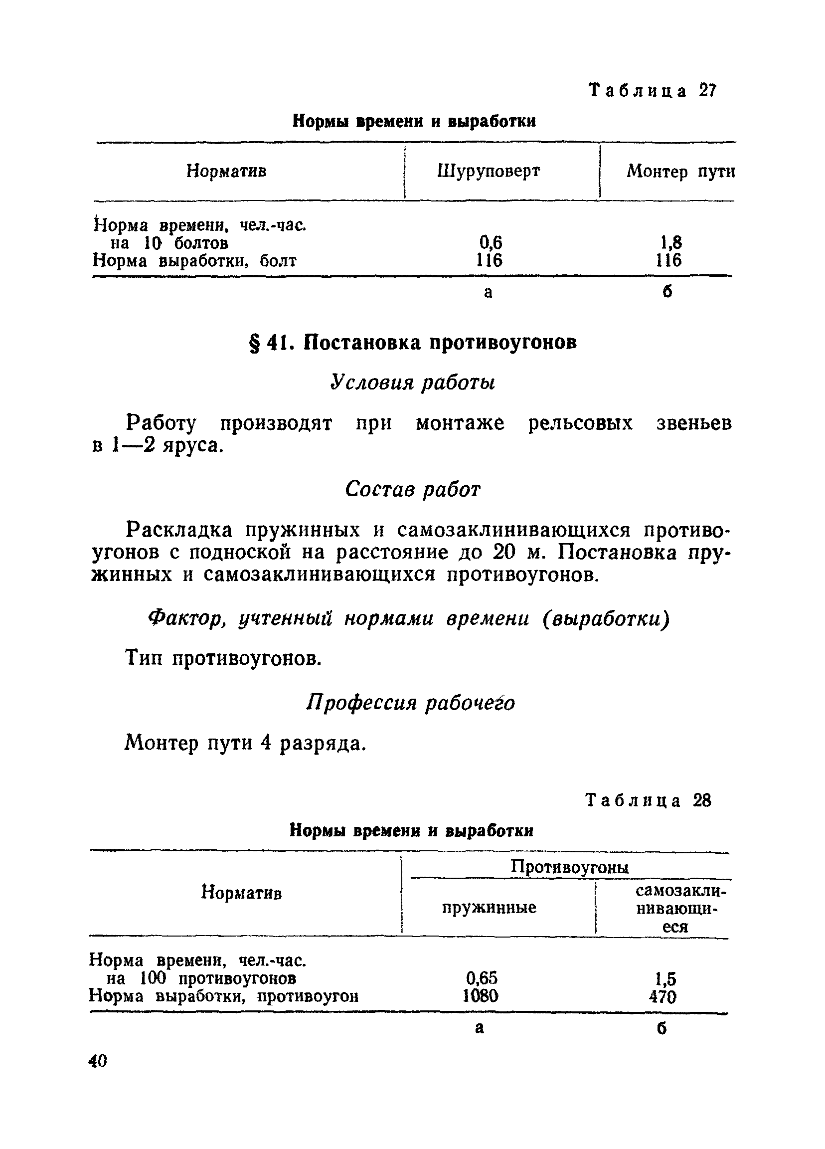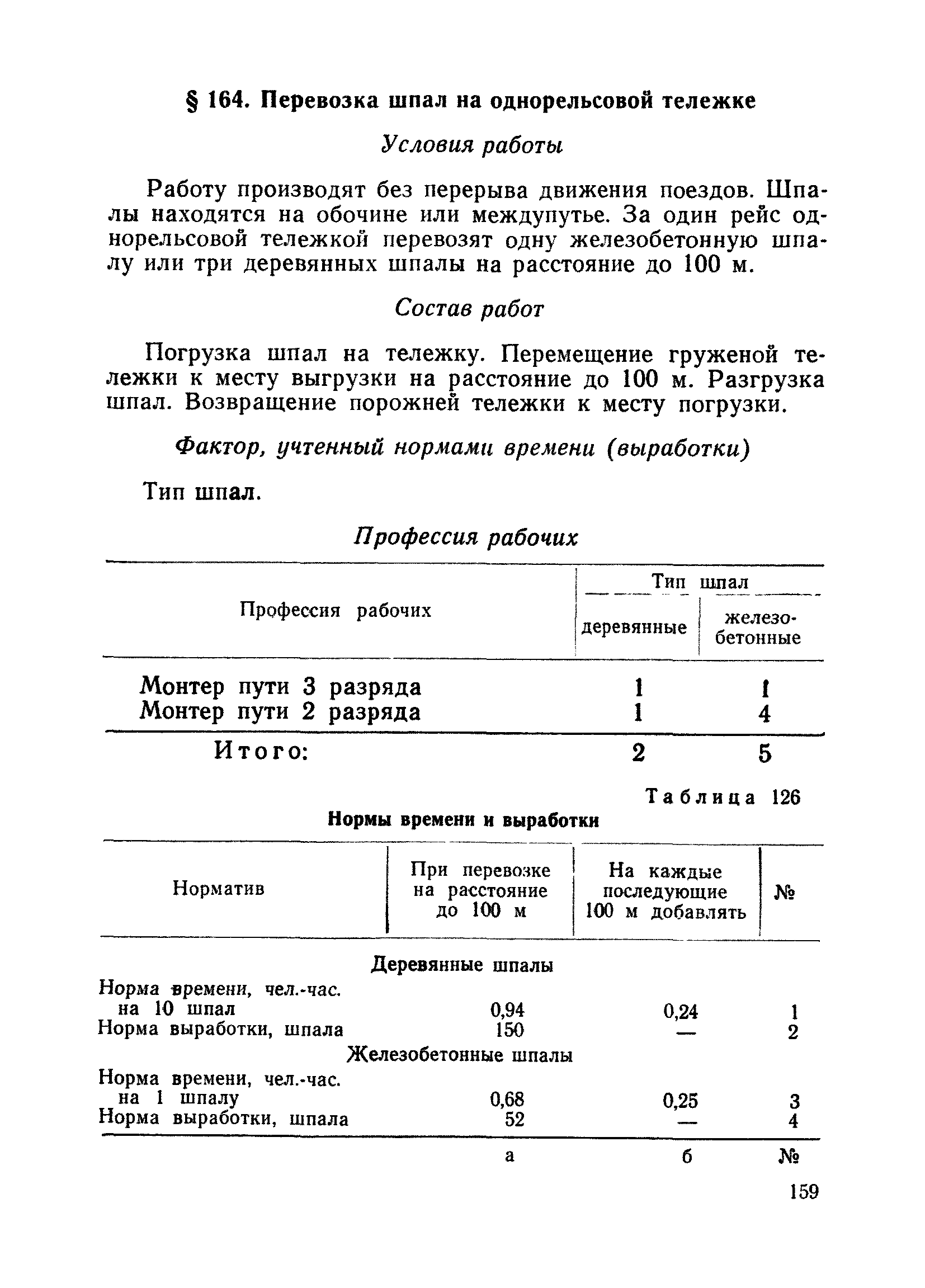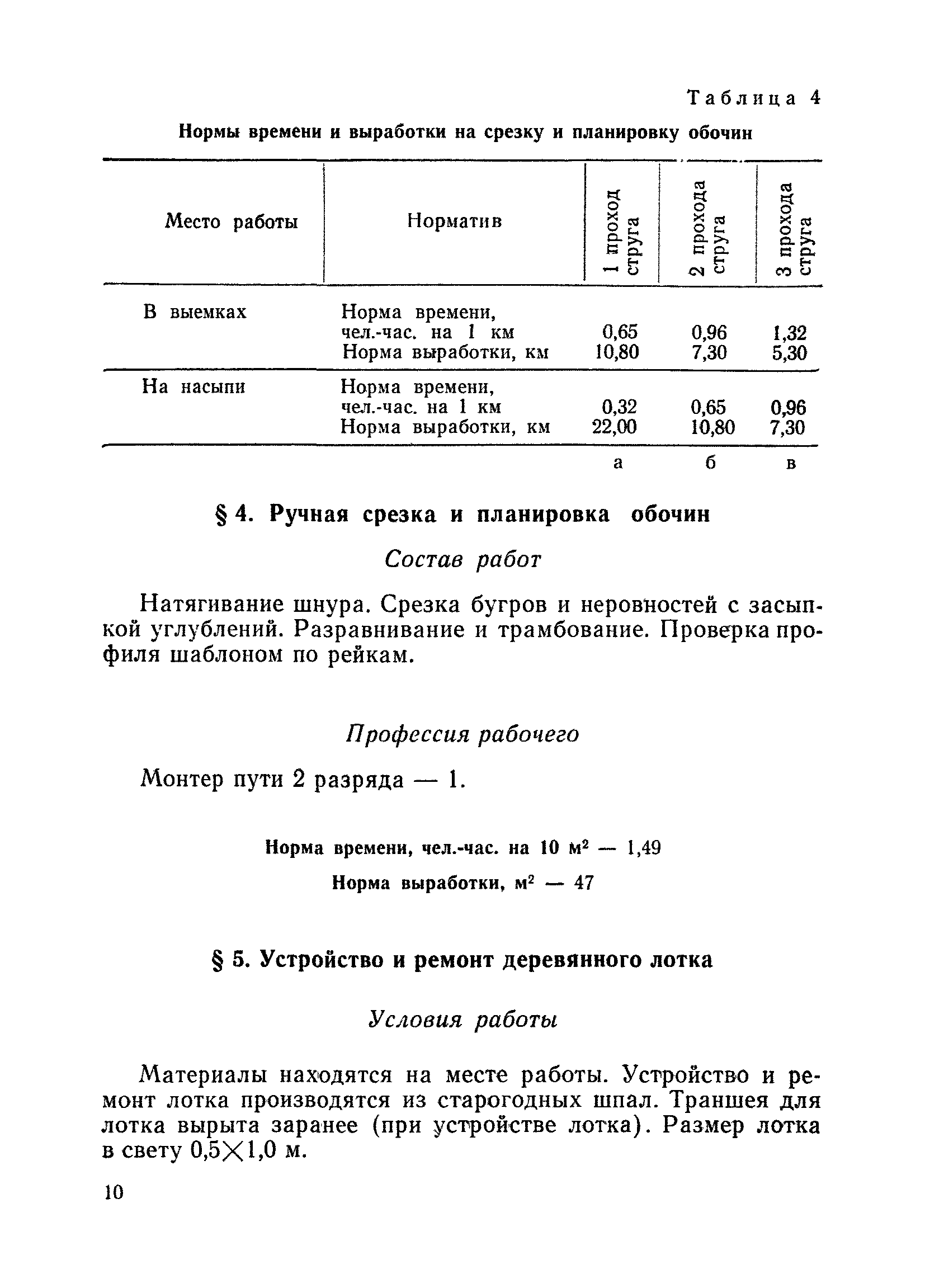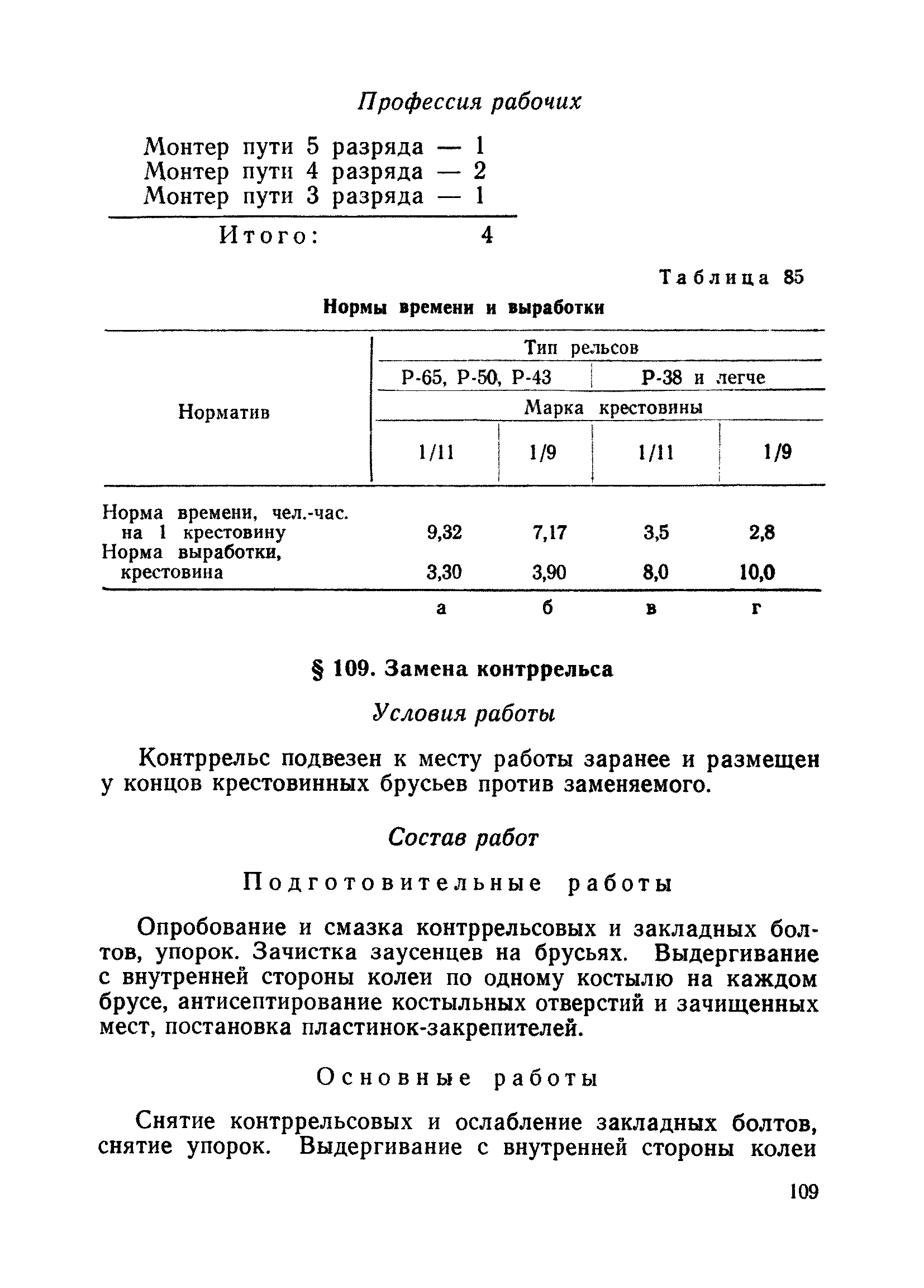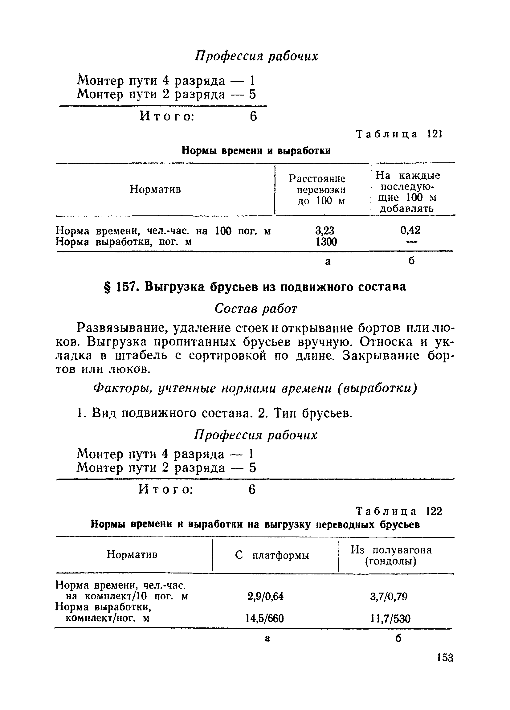 Единые нормы времени (выработки) на ремонт железнодорожного пути широкой колеи| Статус: | не действует | | Название рус.: | Единые нормы времени (выработки) на ремонт железнодорожного пути широкой колеи | | Дата добавления в базу: | 01.01.2018 | | Дата актуализации: | 01.01.2021 | | Область применения: | Единые нормы времени (выработки) были обязательны для применения во всех погрузочно-транспортных управлениях (объединениях) и других организациях Минуглепрома СССР, имеющих постоянные железнодорожные пути широкой колеи | | Оглавление: | Общая часть Техническая часть Нормативная часть Раздел I. Работы по земляному полотну § 1. Очистка кюветов вручную § 2. Уборка загрязненного балласта или грунта § 3. Работы, выполняемые путевым стругом § 4. Ручная срезка и планировка обочин § 5. Устройство и ремонт деревянного лотка § 6. Очистка нагорных канав Раздел II. Подготовительные работы на перегоне § 7. Срезка загрязненной корки балласта § 8. Вырезка балласта на глубину до нижней постели шпал § 9. Замена загрязненного балласта до нижней постели шпал § 10. Визирование пути § 11. Вырезка, прогрохотка и заброска в путь щебеночного балласта § 12. Выправка продольного профиля вручную с подрезкой загрязненного балласта ниже подошвы шпал § 13. Разборка вручную деревянного переездного настила § 14. Разборка вручную железобетонного переездного настила § 15. Разборка постоянного переездного настила кранами § 16. Снятие малых и больших путевых знаков § 17. Смазка стыковых болтов в пути Раздел III. Работы на звеносборочной базе § 18. Выгрузка деревянных шпал из полувагонов кранами § 19. Выгрузка деревянных шпал вручную § 20. Выгрузка железобетонных шпал из полувагонов кранами § 21. Погрузка деревянных шпал в полувагоны кранами § 22. Раскладка пакетов деревянных шпал на пути-шаблоне дрезиной АГМу § 23. Раскладка пакетов деревянных шпал на пути-шаблоне кранами § 24. Раскладка вручную шпал на пути-шаблоне при сборке рельсовых звеньев § 25. Забивка П-образных скоб § 26. Сверление костыльных отверстии в шпалах § 27. Комплектование закладных и клеммных болтов § 28. Раскладка прокладок § 29. Раскладка скреплений § 30. Раскладка рельсов длиной 25 м на подкладки погрузочными кранами § 31. Разметка мест положения осей шпал на шейке рельса § 32. Прикрепление рельсов к шпалам по шаблону на маячных шпалах § 33. Прикрепление рельсов к шпалам костылями (при помощи пневматического молотка типа ОМСП-5 или электропневматического костылезабивщика типа ЭПК-2 или ЭПК-3) § 34. Прикрепление подкладок к деревянным шпалам шурупами (вручную) § 35. Прикрепление подкладок к деревянным шпалам шурупами (при помощи шуруповерта типа ШВ-1) § 36. Прикрепление рельсов к подкладкам клеммными болтами при раздельном скреплении (при помощи шуруповерта типа ШВ-1) § 37. Прикрепление рельсов к шпалам при скреплении Типа КБ (при помощи шуруповерта типа ШВ-1) § 38. Прикрепление рельсов к шпалам при скреплении типа ЖБ (при помощи шурупно-гаечного ключа типа ШГК) § 39. Пришивка рельсов к шпалам вручную § 40. Прикрепление рельсов к шпалам при скреплении типа ЖБ (при помощи шуруповерта типа ШВ-1) § 41. Постановка противоугонов § 42. Укладка звеньев в штабель кранами § 43. Клеймение шпал § 44. Обрезка длинных шпал § 45. Постановка рельсовых стыков на графитовую мазь § 46. Обвязка концов шпал § 47. Погрузка рельсовых звеньев погрузочным краном ПКД (рельсовые звенья длиной 25 м 