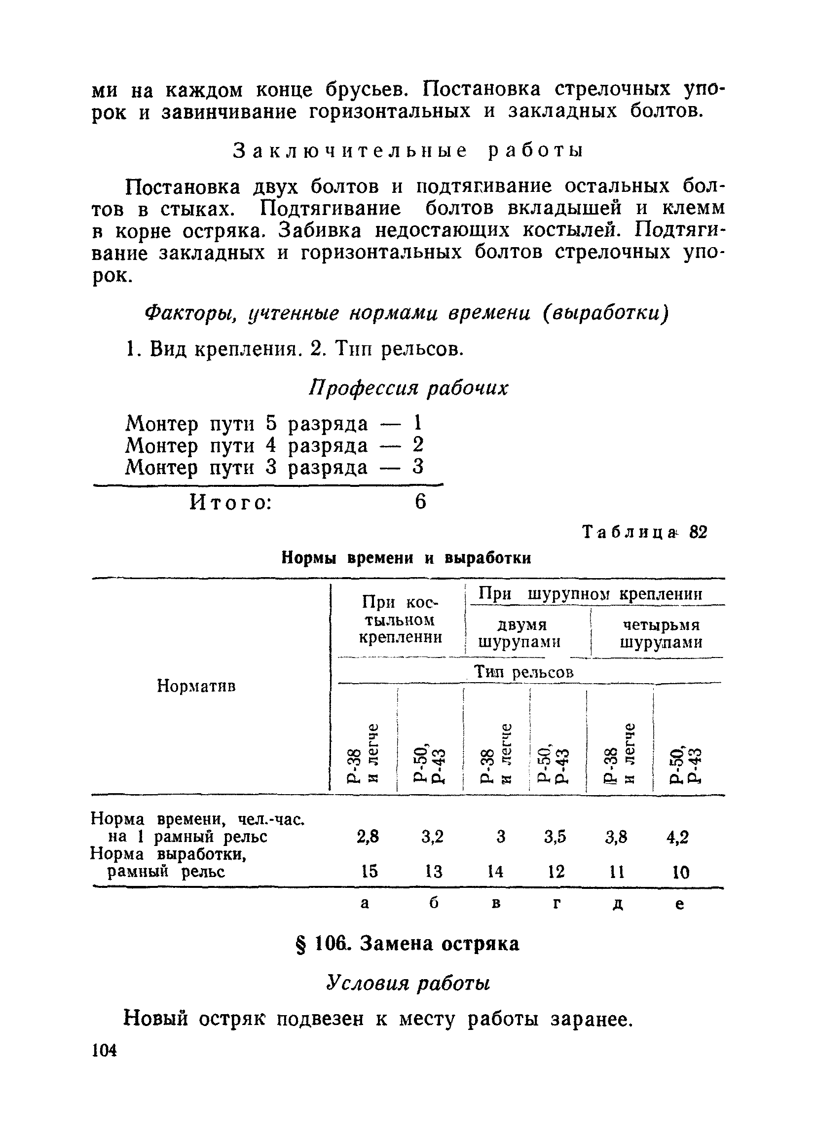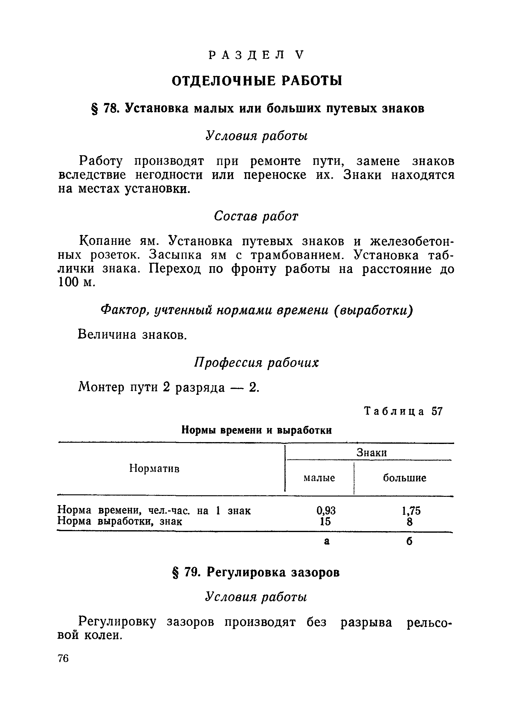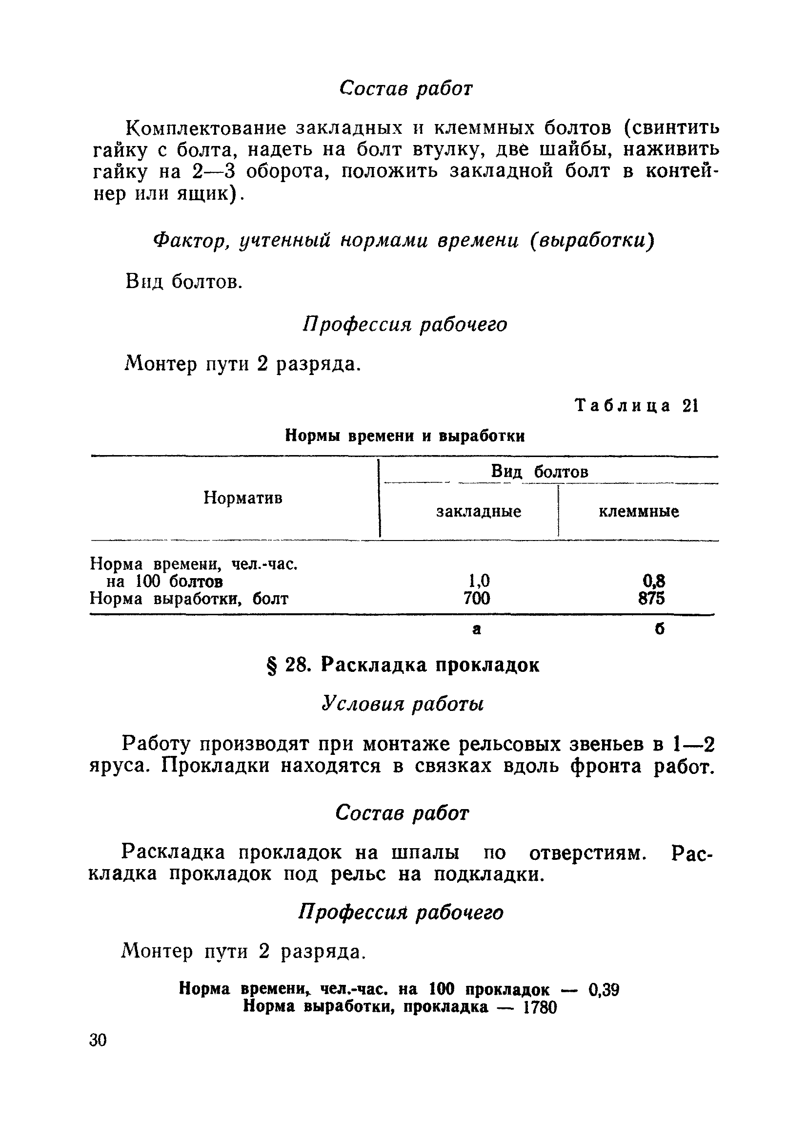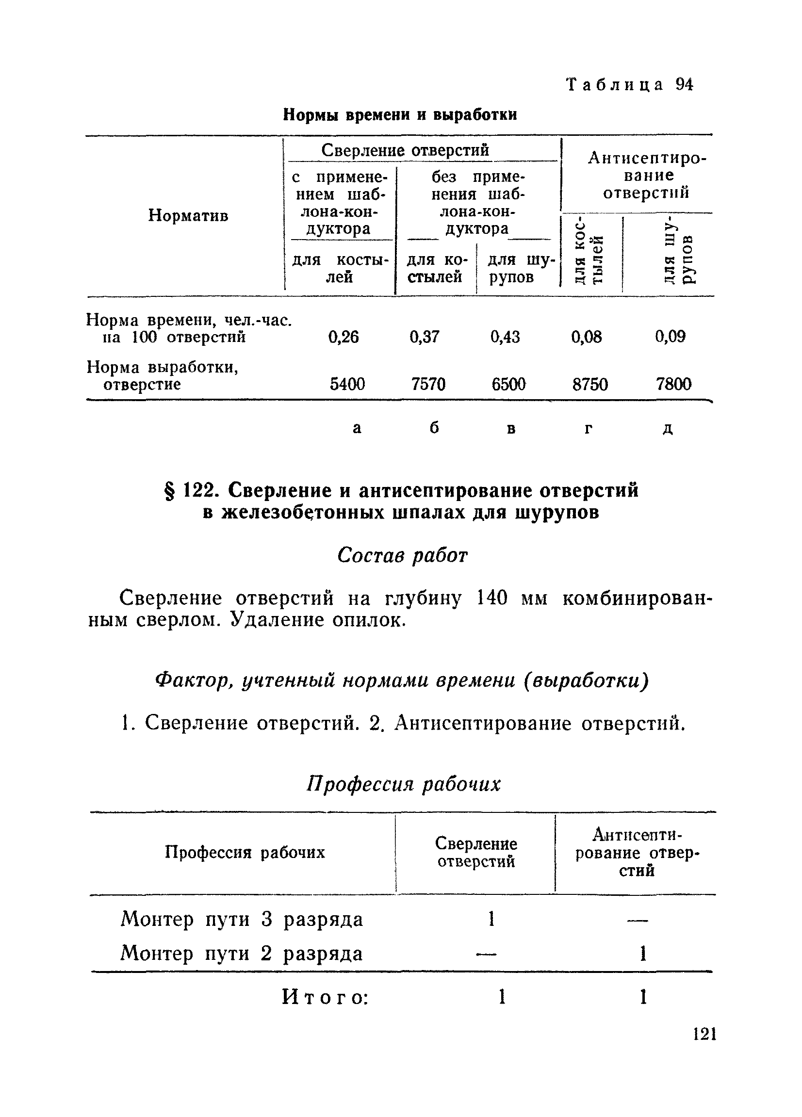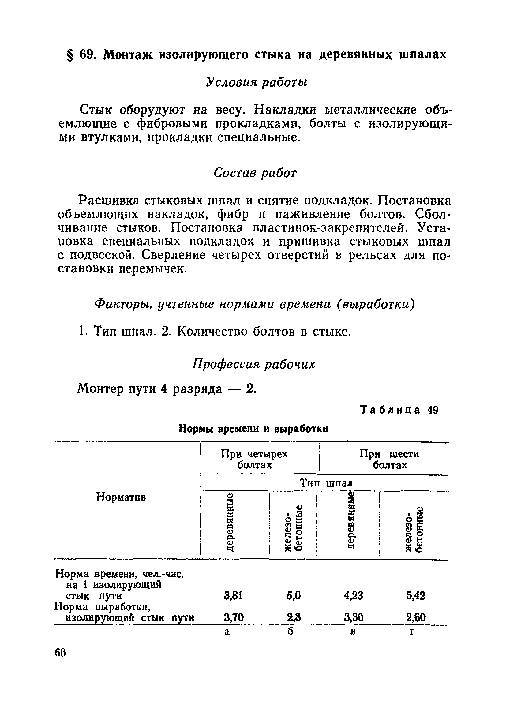 Единые нормы времени (выработки) на ремонт железнодорожного пути широкой колеи| Статус: | не действует | | Название рус.: | Единые нормы времени (выработки) на ремонт железнодорожного пути широкой колеи | | Дата добавления в базу: | 01.01.2018 | | Дата актуализации: | 01.01.2021 | | Область применения: | Единые нормы времени (выработки) были обязательны для применения во всех погрузочно-транспортных управлениях (объединениях) и других организациях Минуглепрома СССР, имеющих постоянные железнодорожные пути широкой колеи | | Оглавление: | Общая часть Техническая часть Нормативная часть Раздел I. Работы по земляному полотну § 1. Очистка кюветов вручную § 2. Уборка загрязненного балласта или грунта § 3. Работы, выполняемые путевым стругом § 4. Ручная срезка и планировка обочин § 5. Устройство и ремонт деревянного лотка § 6. Очистка нагорных канав Раздел II. Подготовительные работы на перегоне § 7. Срезка загрязненной корки балласта § 8. Вырезка балласта на глубину до нижней постели шпал § 9. Замена загрязненного балласта до нижней постели шпал § 10. Визирование пути § 11. Вырезка, прогрохотка и заброска в путь щебеночного балласта § 12. Выправка продольного профиля вручную с подрезкой загрязненного балласта ниже подошвы шпал § 13. Разборка вручную деревянного переездного настила § 14. Разборка вручную железобетонного переездного настила § 15. Разборка постоянного переездного настила кранами § 16. Снятие малых и больших путевых знаков § 17. Смазка стыковых болтов в пути Раздел III. Работы на звеносборочной базе § 18. Выгрузка деревянных шпал из полувагонов кранами § 19. Выгрузка деревянных шпал вручную § 20. Выгрузка железобетонных шпал из полувагонов кранами § 21. Погрузка деревянных шпал в полувагоны кранами § 22. Раскладка пакетов деревянных шпал на пути-шаблоне дрезиной АГМу § 23. Раскладка пакетов деревянных шпал на пути-шаблоне кранами § 24. Раскладка вручную шпал на пути-шаблоне при сборке рельсовых звеньев § 25. Забивка П-образных скоб § 26. Сверление костыльных отверстии в шпалах § 27. Комплектование закладных и клеммных болтов § 28. Раскладка прокладок § 29. Раскладка скреплений § 30. Раскладка рельсов длиной 25 м на подкладки погрузочными кранами § 31. Разметка мест положения осей шпал на шейке рельса § 32. Прикрепление рельсов к шпалам по шаблону на маячных шпалах § 33. Прикрепление рельсов к шпалам костылями (при помощи пневматического молотка типа ОМСП-5 или электропневматического костылезабивщика типа ЭПК-2 или ЭПК-3) § 34. Прикрепление подкладок к деревянным шпалам шурупами (вручную) § 35. Прикрепление подкладок к деревянным шпалам шурупами (при помощи шуруповерта типа ШВ-1) § 36. Прикрепление рельсов к подкладкам клеммными болтами при раздельном скреплении (при помощи шуруповерта типа ШВ-1) § 37. Прикрепление рельсов к шпалам при скреплении Типа КБ (при помощи шуруповерта типа ШВ-1) § 38. Прикрепление рельсов к шпалам при скреплении типа ЖБ (при помощи шурупно-гаечного ключа типа ШГК) § 39. Пришивка рельсов к шпалам вручную § 40. Прикрепление рельсов к шпалам при скреплении типа ЖБ (при помощи шуруповерта типа ШВ-1) § 41. Постановка противоугонов § 42. Укладка звеньев в штабель кранами § 43. Клеймение шпал § 44. Обрезка длинных шпал § 45. Постановка рельсовых стыков на графитовую мазь § 46. Обвязка концов шпал § 47. Погрузка рельсовых звеньев погрузочным краном ПКД (рельсовые звенья длиной 25 м 