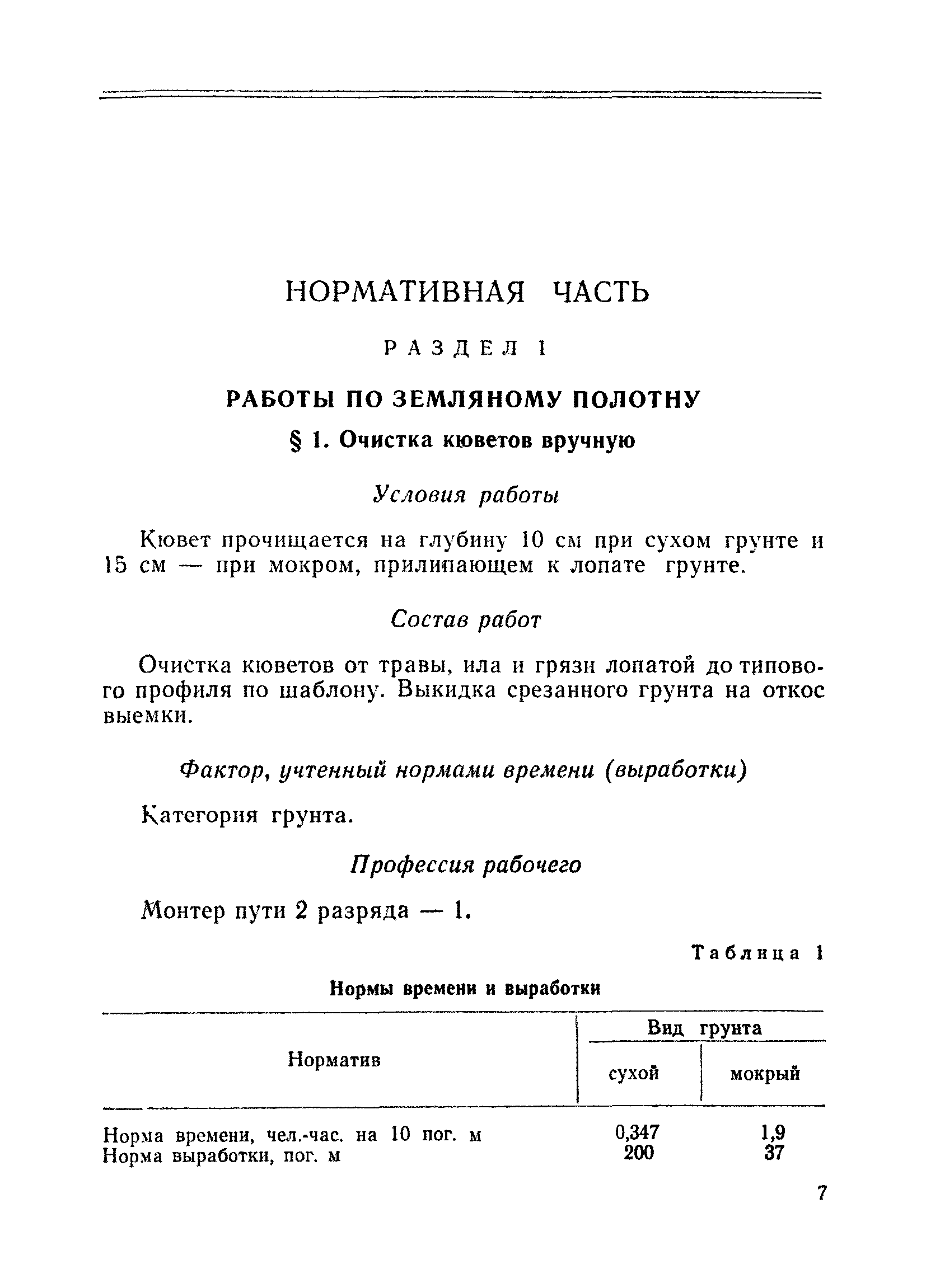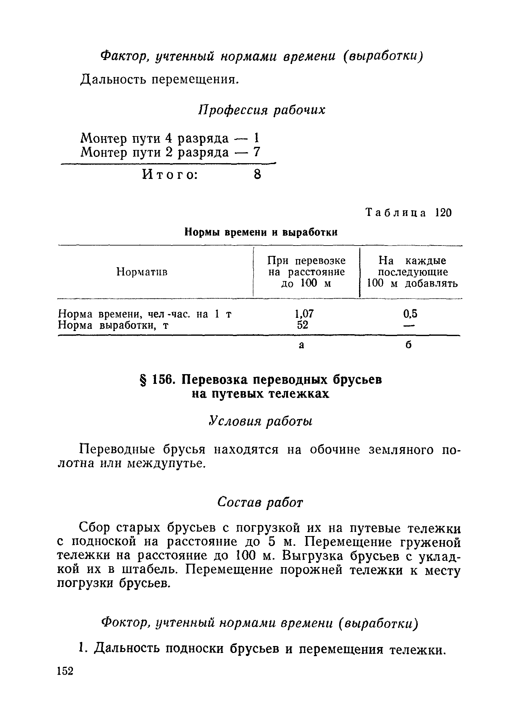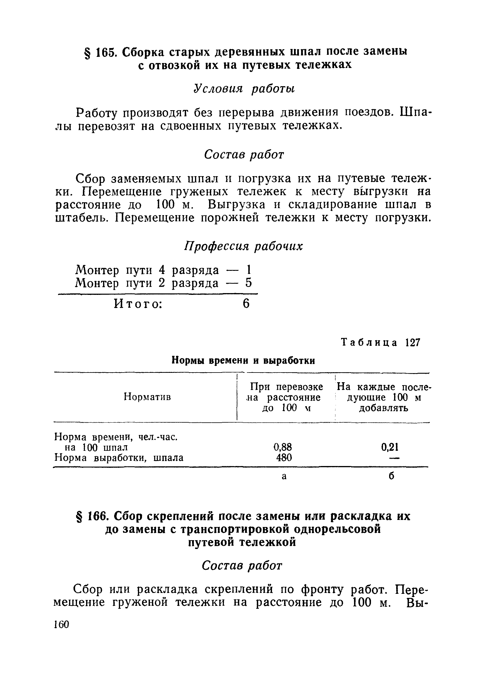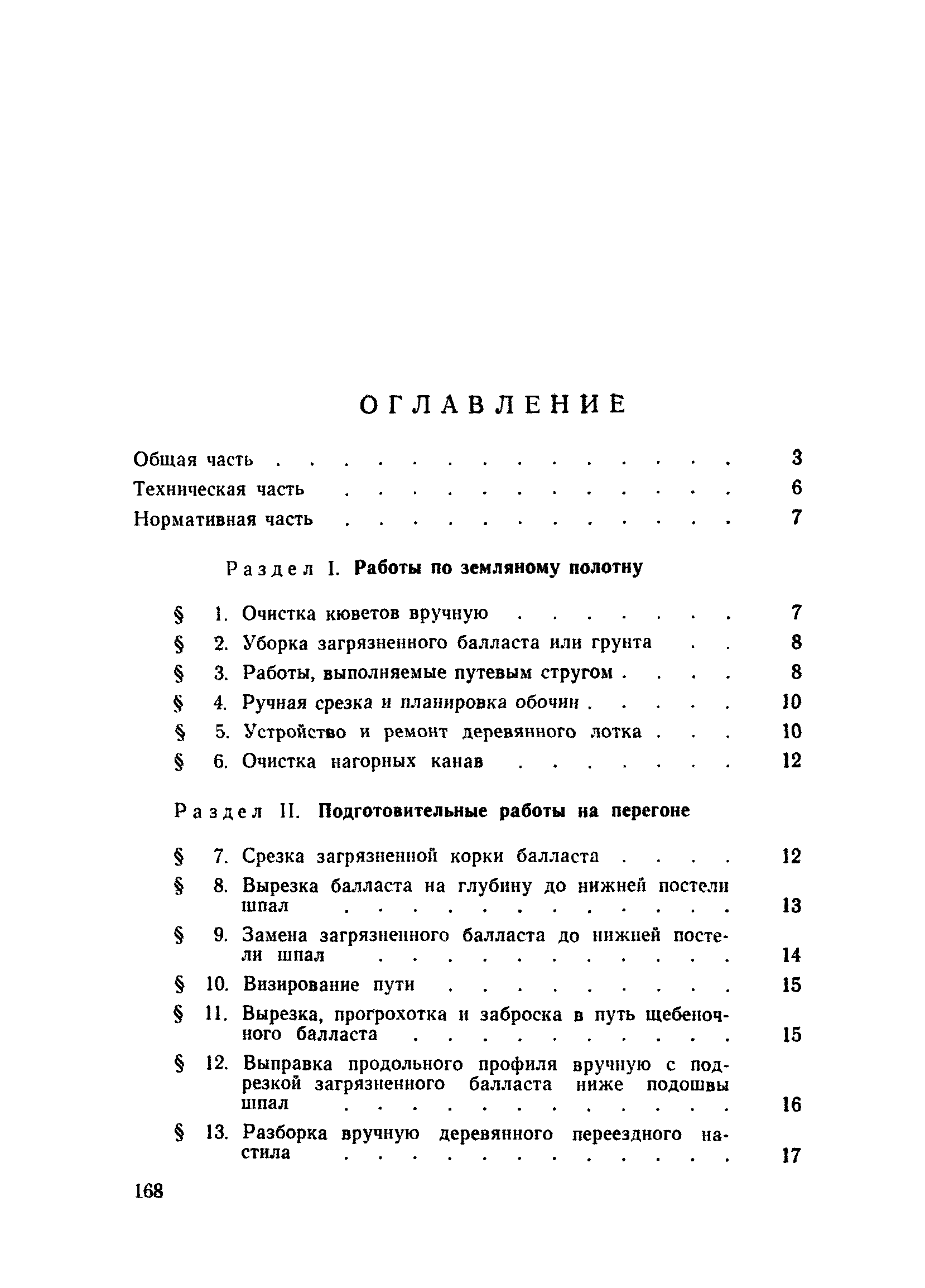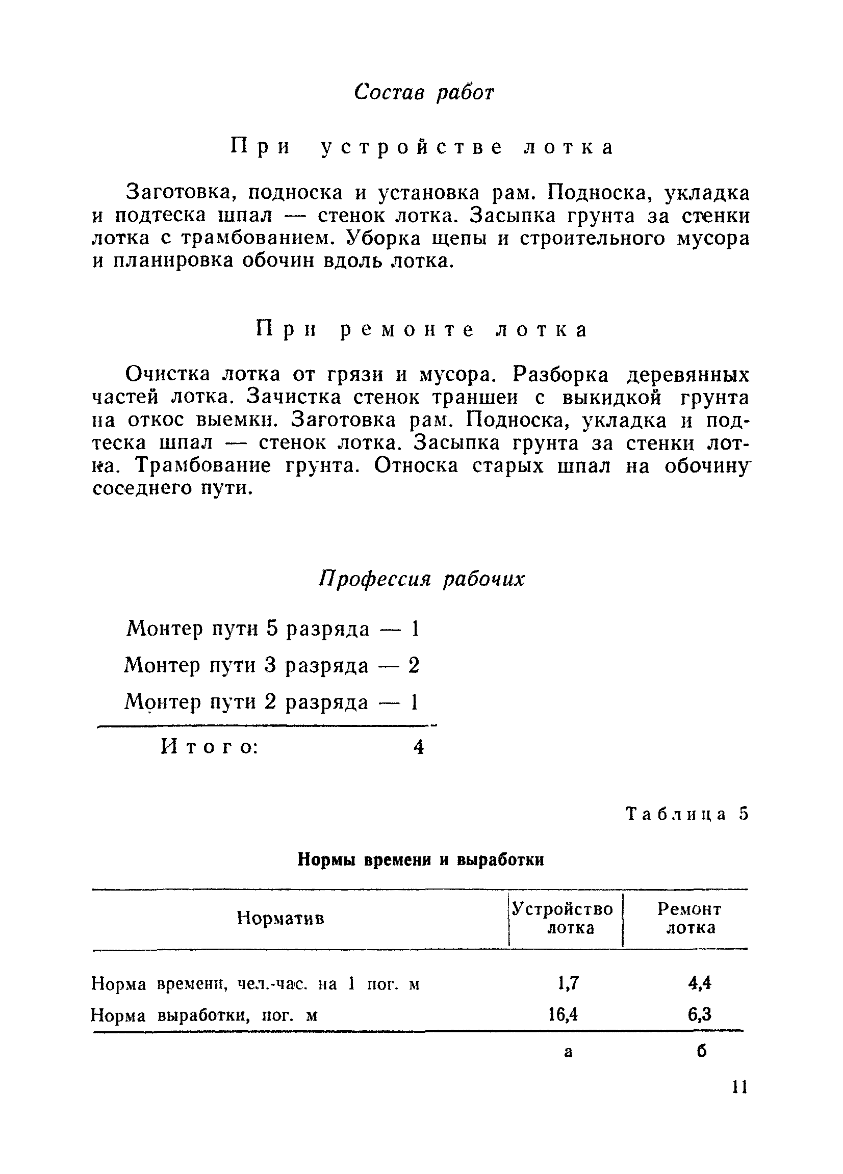 Единые нормы времени (выработки) на ремонт железнодорожного пути широкой колеи| Статус: | не действует | | Название рус.: | Единые нормы времени (выработки) на ремонт железнодорожного пути широкой колеи | | Дата добавления в базу: | 01.01.2018 | | Дата актуализации: | 01.01.2021 | | Область применения: | Единые нормы времени (выработки) были обязательны для применения во всех погрузочно-транспортных управлениях (объединениях) и других организациях Минуглепрома СССР, имеющих постоянные железнодорожные пути широкой колеи | | Оглавление: | Общая часть Техническая часть Нормативная часть Раздел I. Работы по земляному полотну § 1. Очистка кюветов вручную § 2. Уборка загрязненного балласта или грунта § 3. Работы, выполняемые путевым стругом § 4. Ручная срезка и планировка обочин § 5. Устройство и ремонт деревянного лотка § 6. Очистка нагорных канав Раздел II. Подготовительные работы на перегоне § 7. Срезка загрязненной корки балласта § 8. Вырезка балласта на глубину до нижней постели шпал § 9. Замена загрязненного балласта до нижней постели шпал § 10. Визирование пути § 11. Вырезка, прогрохотка и заброска в путь щебеночного балласта § 12. Выправка продольного профиля вручную с подрезкой загрязненного балласта ниже подошвы шпал § 13. Разборка вручную деревянного переездного настила § 14. Разборка вручную железобетонного переездного настила § 15. Разборка постоянного переездного настила кранами § 16. Снятие малых и больших путевых знаков § 17. Смазка стыковых болтов в пути Раздел III. Работы на звеносборочной базе § 18. Выгрузка деревянных шпал из полувагонов кранами § 19. Выгрузка деревянных шпал вручную § 20. Выгрузка железобетонных шпал из полувагонов кранами § 21. Погрузка деревянных шпал в полувагоны кранами § 22. Раскладка пакетов деревянных шпал на пути-шаблоне дрезиной АГМу § 23. Раскладка пакетов деревянных шпал на пути-шаблоне кранами § 24. Раскладка вручную шпал на пути-шаблоне при сборке рельсовых звеньев § 25. Забивка П-образных скоб § 26. Сверление костыльных отверстии в шпалах § 27. Комплектование закладных и клеммных болтов § 28. Раскладка прокладок § 29. Раскладка скреплений § 30. Раскладка рельсов длиной 25 м на подкладки погрузочными кранами § 31. Разметка мест положения осей шпал на шейке рельса § 32. Прикрепление рельсов к шпалам по шаблону на маячных шпалах § 33. Прикрепление рельсов к шпалам костылями (при помощи пневматического молотка типа ОМСП-5 или электропневматического костылезабивщика типа ЭПК-2 или ЭПК-3) § 34. Прикрепление подкладок к деревянным шпалам шурупами (вручную) § 35. Прикрепление подкладок к деревянным шпалам шурупами (при помощи шуруповерта типа ШВ-1) § 36. Прикрепление рельсов к подкладкам клеммными болтами при раздельном скреплении (при помощи шуруповерта типа ШВ-1) § 37. Прикрепление рельсов к шпалам при скреплении Типа КБ (при помощи шуруповерта типа ШВ-1) § 38. Прикрепление рельсов к шпалам при скреплении типа ЖБ (при помощи шурупно-гаечного ключа типа ШГК) § 39. Пришивка рельсов к шпалам вручную § 40. Прикрепление рельсов к шпалам при скреплении типа ЖБ (при помощи шуруповерта типа ШВ-1) § 41. Постановка противоугонов § 42. Укладка звеньев в штабель кранами § 43. Клеймение шпал § 44. Обрезка длинных шпал § 45. Постановка рельсовых стыков на графитовую мазь § 46. Обвязка концов шпал § 47. Погрузка рельсовых звеньев погрузочным краном ПКД (рельсовые звенья длиной 25 м 