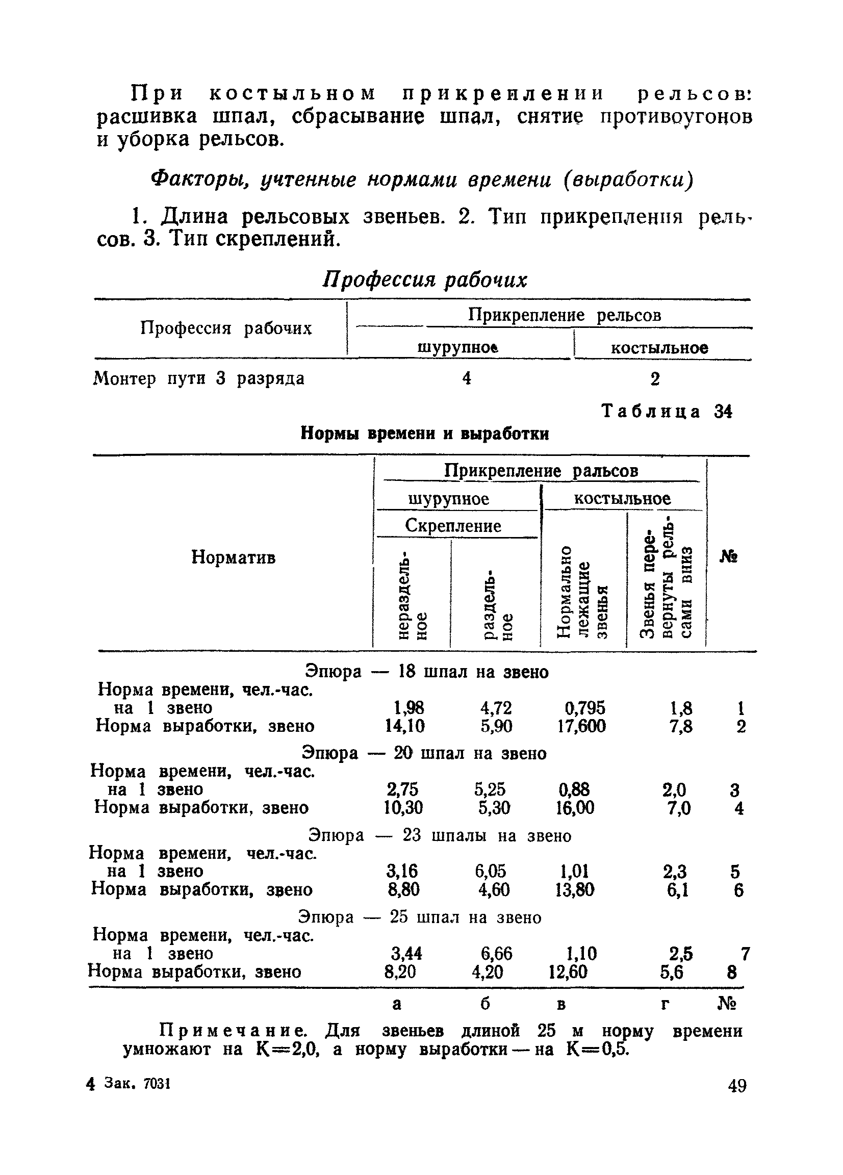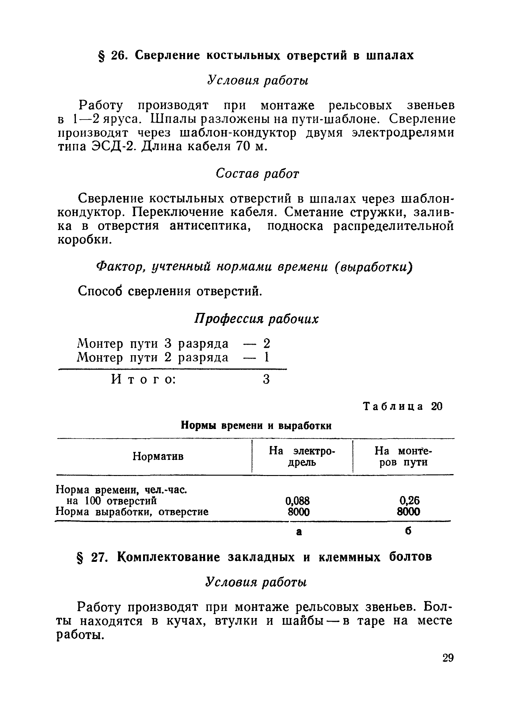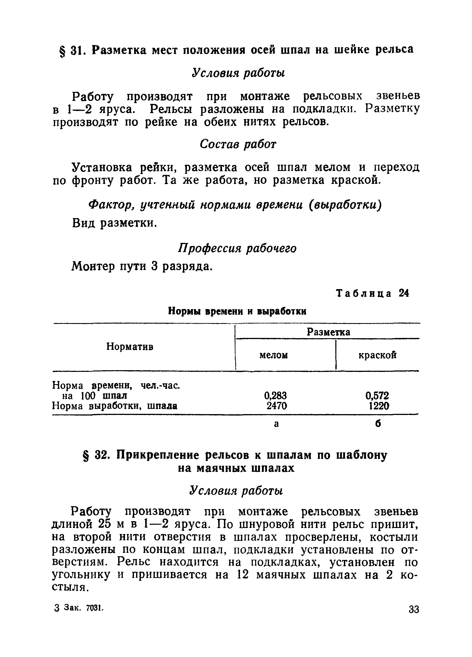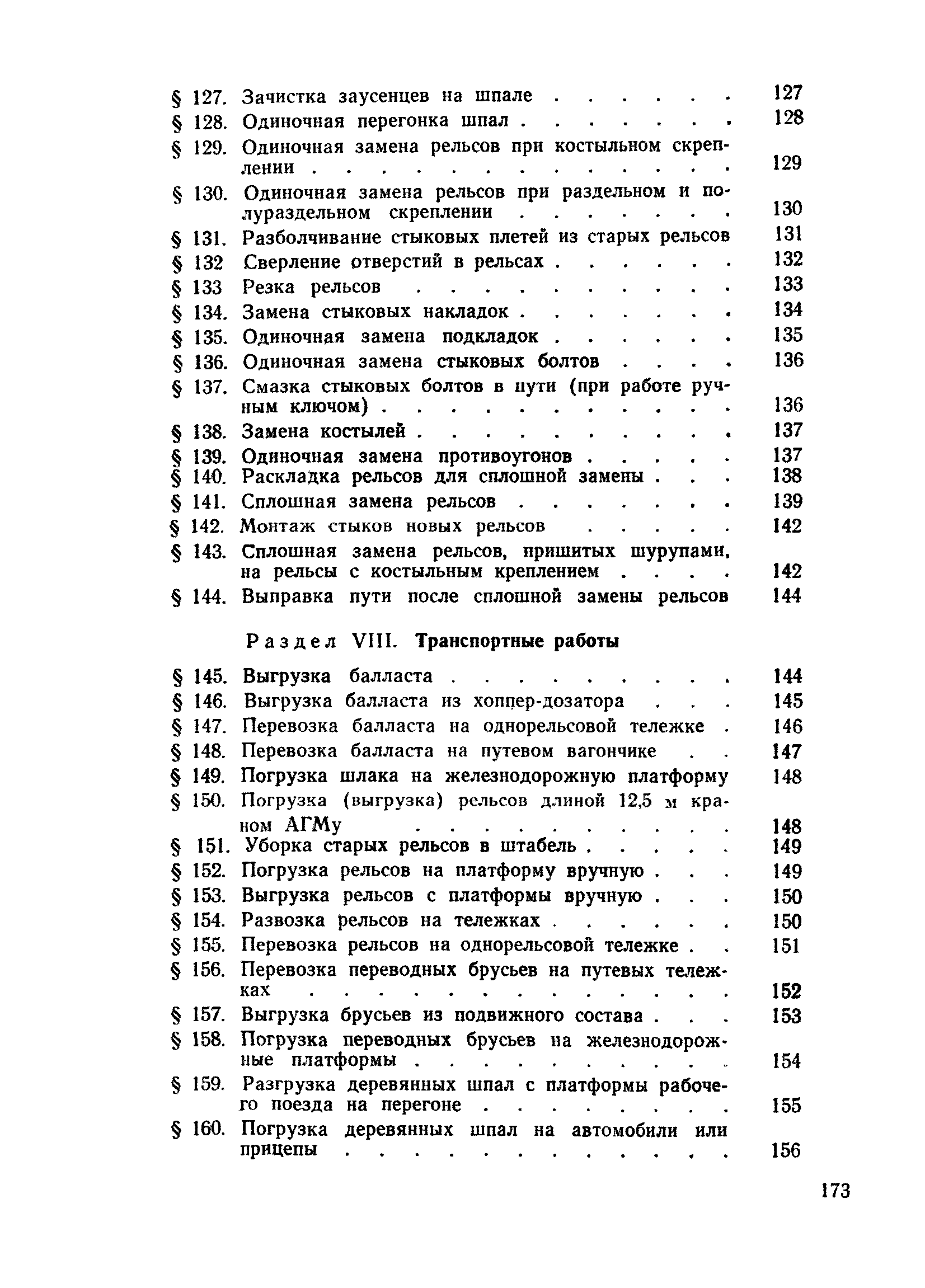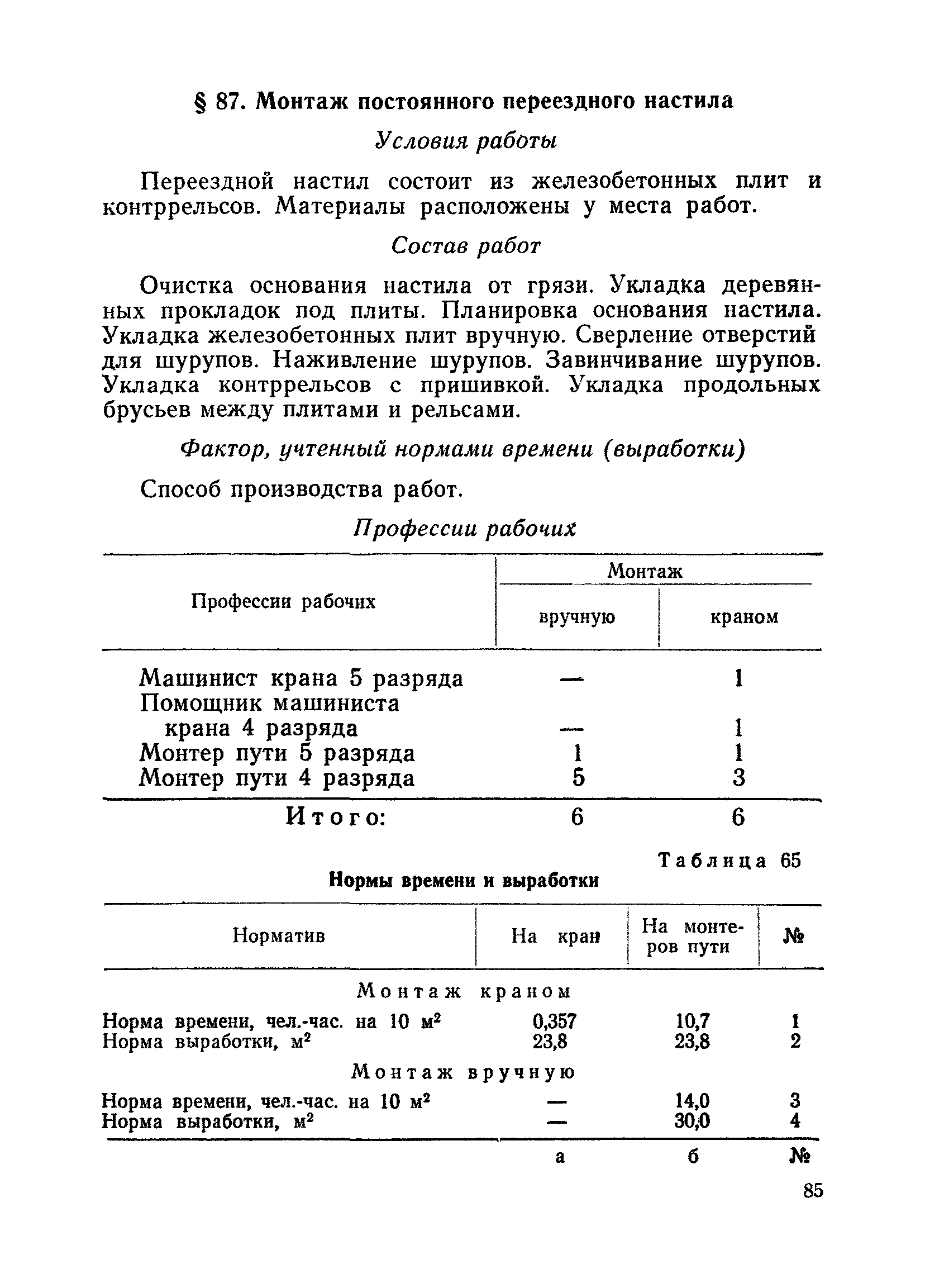 Единые нормы времени (выработки) на ремонт железнодорожного пути широкой колеи| Статус: | не действует | | Название рус.: | Единые нормы времени (выработки) на ремонт железнодорожного пути широкой колеи | | Дата добавления в базу: | 01.01.2018 | | Дата актуализации: | 01.01.2021 | | Область применения: | Единые нормы времени (выработки) были обязательны для применения во всех погрузочно-транспортных управлениях (объединениях) и других организациях Минуглепрома СССР, имеющих постоянные железнодорожные пути широкой колеи | | Оглавление: | Общая часть Техническая часть Нормативная часть Раздел I. Работы по земляному полотну § 1. Очистка кюветов вручную § 2. Уборка загрязненного балласта или грунта § 3. Работы, выполняемые путевым стругом § 4. Ручная срезка и планировка обочин § 5. Устройство и ремонт деревянного лотка § 6. Очистка нагорных канав Раздел II. Подготовительные работы на перегоне § 7. Срезка загрязненной корки балласта § 8. Вырезка балласта на глубину до нижней постели шпал § 9. Замена загрязненного балласта до нижней постели шпал § 10. Визирование пути § 11. Вырезка, прогрохотка и заброска в путь щебеночного балласта § 12. Выправка продольного профиля вручную с подрезкой загрязненного балласта ниже подошвы шпал § 13. Разборка вручную деревянного переездного настила § 14. Разборка вручную железобетонного переездного настила § 15. Разборка постоянного переездного настила кранами § 16. Снятие малых и больших путевых знаков § 17. Смазка стыковых болтов в пути Раздел III. Работы на звеносборочной базе § 18. Выгрузка деревянных шпал из полувагонов кранами § 19. Выгрузка деревянных шпал вручную § 20. Выгрузка железобетонных шпал из полувагонов кранами § 21. Погрузка деревянных шпал в полувагоны кранами § 22. Раскладка пакетов деревянных шпал на пути-шаблоне дрезиной АГМу § 23. Раскладка пакетов деревянных шпал на пути-шаблоне кранами § 24. Раскладка вручную шпал на пути-шаблоне при сборке рельсовых звеньев § 25. Забивка П-образных скоб § 26. Сверление костыльных отверстии в шпалах § 27. Комплектование закладных и клеммных болтов § 28. Раскладка прокладок § 29. Раскладка скреплений § 30. Раскладка рельсов длиной 25 м на подкладки погрузочными кранами § 31. Разметка мест положения осей шпал на шейке рельса § 32. Прикрепление рельсов к шпалам по шаблону на маячных шпалах § 33. Прикрепление рельсов к шпалам костылями (при помощи пневматического молотка типа ОМСП-5 или электропневматического костылезабивщика типа ЭПК-2 или ЭПК-3) § 34. Прикрепление подкладок к деревянным шпалам шурупами (вручную) § 35. Прикрепление подкладок к деревянным шпалам шурупами (при помощи шуруповерта типа ШВ-1) § 36. Прикрепление рельсов к подкладкам клеммными болтами при раздельном скреплении (при помощи шуруповерта типа ШВ-1) § 37. Прикрепление рельсов к шпалам при скреплении Типа КБ (при помощи шуруповерта типа ШВ-1) § 38. Прикрепление рельсов к шпалам при скреплении типа ЖБ (при помощи шурупно-гаечного ключа типа ШГК) § 39. Пришивка рельсов к шпалам вручную § 40. Прикрепление рельсов к шпалам при скреплении типа ЖБ (при помощи шуруповерта типа ШВ-1) § 41. Постановка противоугонов § 42. Укладка звеньев в штабель кранами § 43. Клеймение шпал § 44. Обрезка длинных шпал § 45. Постановка рельсовых стыков на графитовую мазь § 46. Обвязка концов шпал § 47. Погрузка рельсовых звеньев погрузочным краном ПКД (рельсовые звенья длиной 25 м 