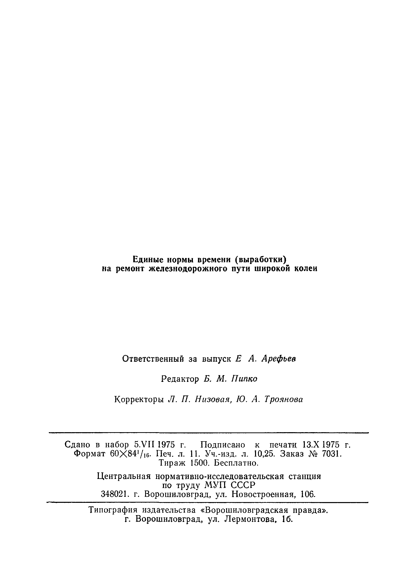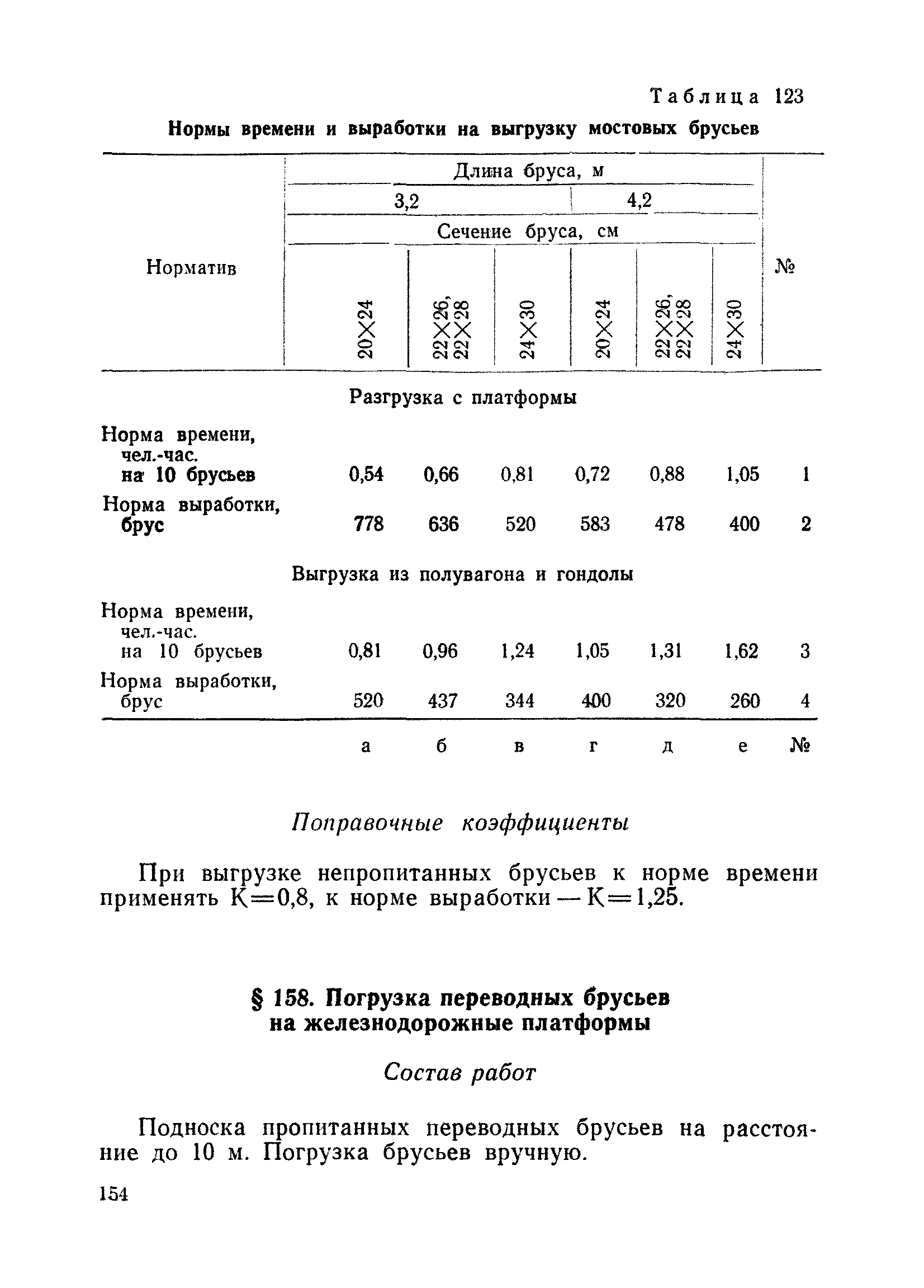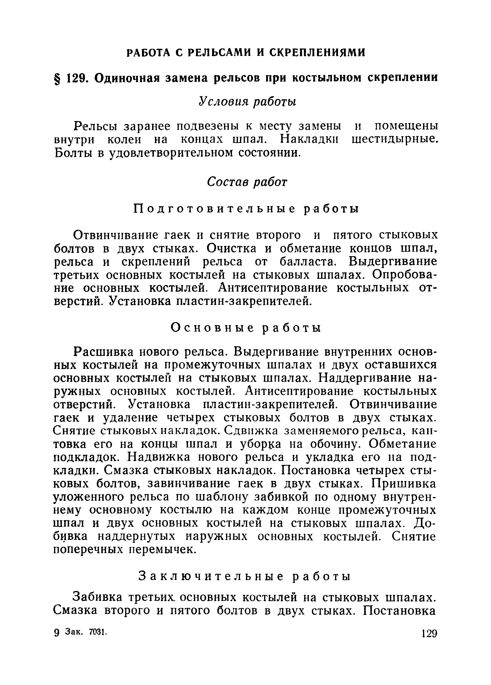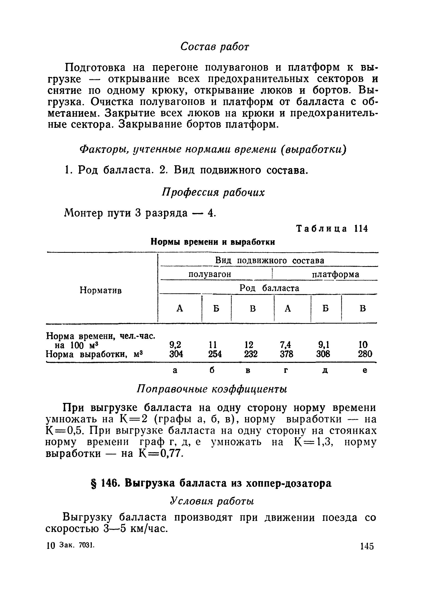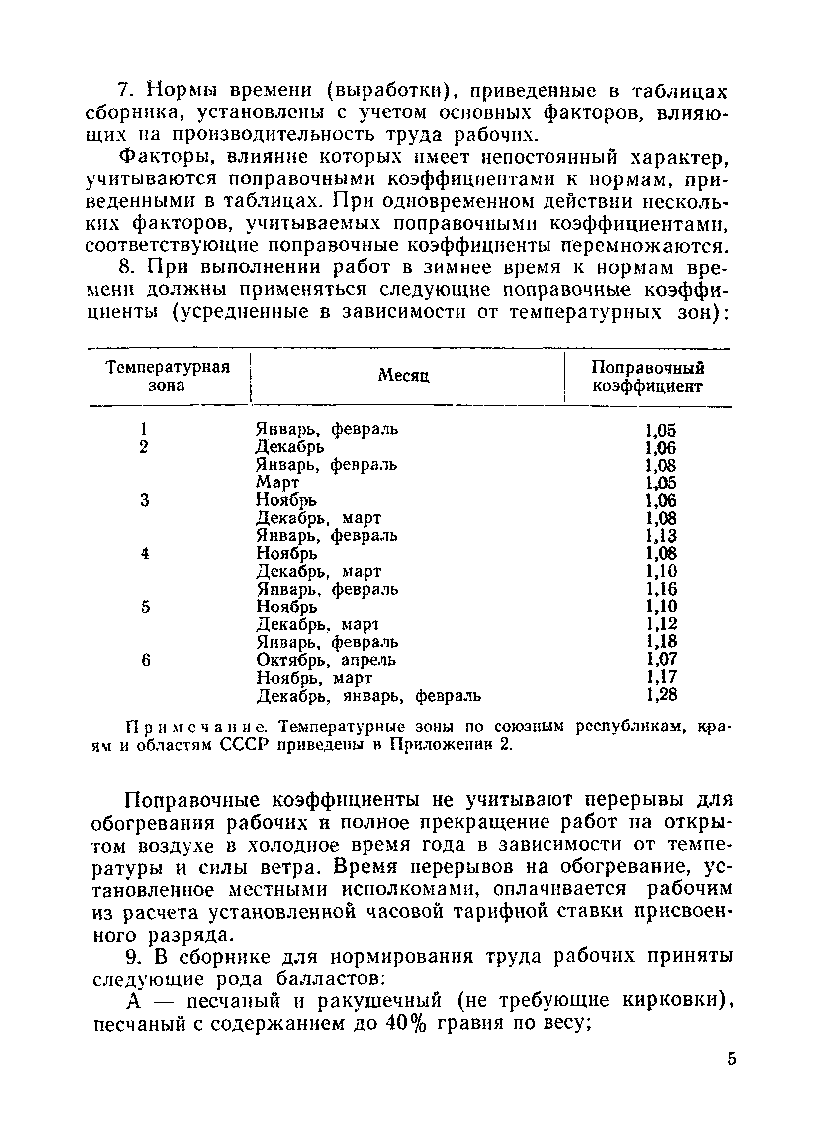 Единые нормы времени (выработки) на ремонт железнодорожного пути широкой колеи| Статус: | не действует | | Название рус.: | Единые нормы времени (выработки) на ремонт железнодорожного пути широкой колеи | | Дата добавления в базу: | 01.01.2018 | | Дата актуализации: | 01.01.2021 | | Область применения: | Единые нормы времени (выработки) были обязательны для применения во всех погрузочно-транспортных управлениях (объединениях) и других организациях Минуглепрома СССР, имеющих постоянные железнодорожные пути широкой колеи | | Оглавление: | Общая часть Техническая часть Нормативная часть Раздел I. Работы по земляному полотну § 1. Очистка кюветов вручную § 2. Уборка загрязненного балласта или грунта § 3. Работы, выполняемые путевым стругом § 4. Ручная срезка и планировка обочин § 5. Устройство и ремонт деревянного лотка § 6. Очистка нагорных канав Раздел II. Подготовительные работы на перегоне § 7. Срезка загрязненной корки балласта § 8. Вырезка балласта на глубину до нижней постели шпал § 9. Замена загрязненного балласта до нижней постели шпал § 10. Визирование пути § 11. Вырезка, прогрохотка и заброска в путь щебеночного балласта § 12. Выправка продольного профиля вручную с подрезкой загрязненного балласта ниже подошвы шпал § 13. Разборка вручную деревянного переездного настила § 14. Разборка вручную железобетонного переездного настила § 15. Разборка постоянного переездного настила кранами § 16. Снятие малых и больших путевых знаков § 17. Смазка стыковых болтов в пути Раздел III. Работы на звеносборочной базе § 18. Выгрузка деревянных шпал из полувагонов кранами § 19. Выгрузка деревянных шпал вручную § 20. Выгрузка железобетонных шпал из полувагонов кранами § 21. Погрузка деревянных шпал в полувагоны кранами § 22. Раскладка пакетов деревянных шпал на пути-шаблоне дрезиной АГМу § 23. Раскладка пакетов деревянных шпал на пути-шаблоне кранами § 24. Раскладка вручную шпал на пути-шаблоне при сборке рельсовых звеньев § 25. Забивка П-образных скоб § 26. Сверление костыльных отверстии в шпалах § 27. Комплектование закладных и клеммных болтов § 28. Раскладка прокладок § 29. Раскладка скреплений § 30. Раскладка рельсов длиной 25 м на подкладки погрузочными кранами § 31. Разметка мест положения осей шпал на шейке рельса § 32. Прикрепление рельсов к шпалам по шаблону на маячных шпалах § 33. Прикрепление рельсов к шпалам костылями (при помощи пневматического молотка типа ОМСП-5 или электропневматического костылезабивщика типа ЭПК-2 или ЭПК-3) § 34. Прикрепление подкладок к деревянным шпалам шурупами (вручную) § 35. Прикрепление подкладок к деревянным шпалам шурупами (при помощи шуруповерта типа ШВ-1) § 36. Прикрепление рельсов к подкладкам клеммными болтами при раздельном скреплении (при помощи шуруповерта типа ШВ-1) § 37. Прикрепление рельсов к шпалам при скреплении Типа КБ (при помощи шуруповерта типа ШВ-1) § 38. Прикрепление рельсов к шпалам при скреплении типа ЖБ (при помощи шурупно-гаечного ключа типа ШГК) § 39. Пришивка рельсов к шпалам вручную § 40. Прикрепление рельсов к шпалам при скреплении типа ЖБ (при помощи шуруповерта типа ШВ-1) § 41. Постановка противоугонов § 42. Укладка звеньев в штабель кранами § 43. Клеймение шпал § 44. Обрезка длинных шпал § 45. Постановка рельсовых стыков на графитовую мазь § 46. Обвязка концов шпал § 47. Погрузка рельсовых звеньев погрузочным краном ПКД (рельсовые звенья длиной 25 м 