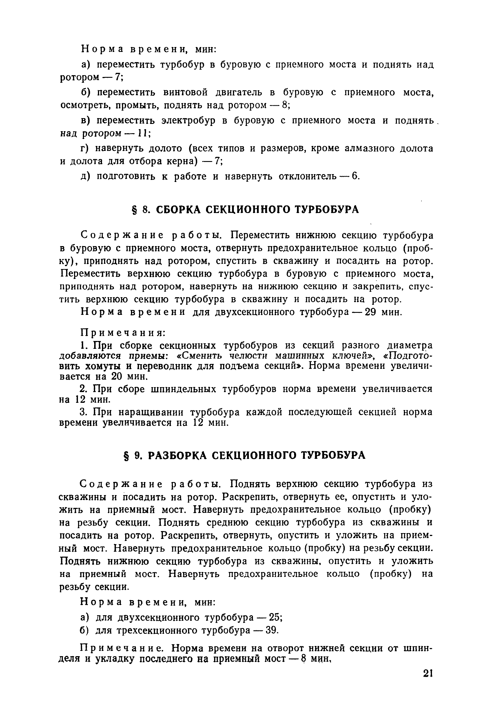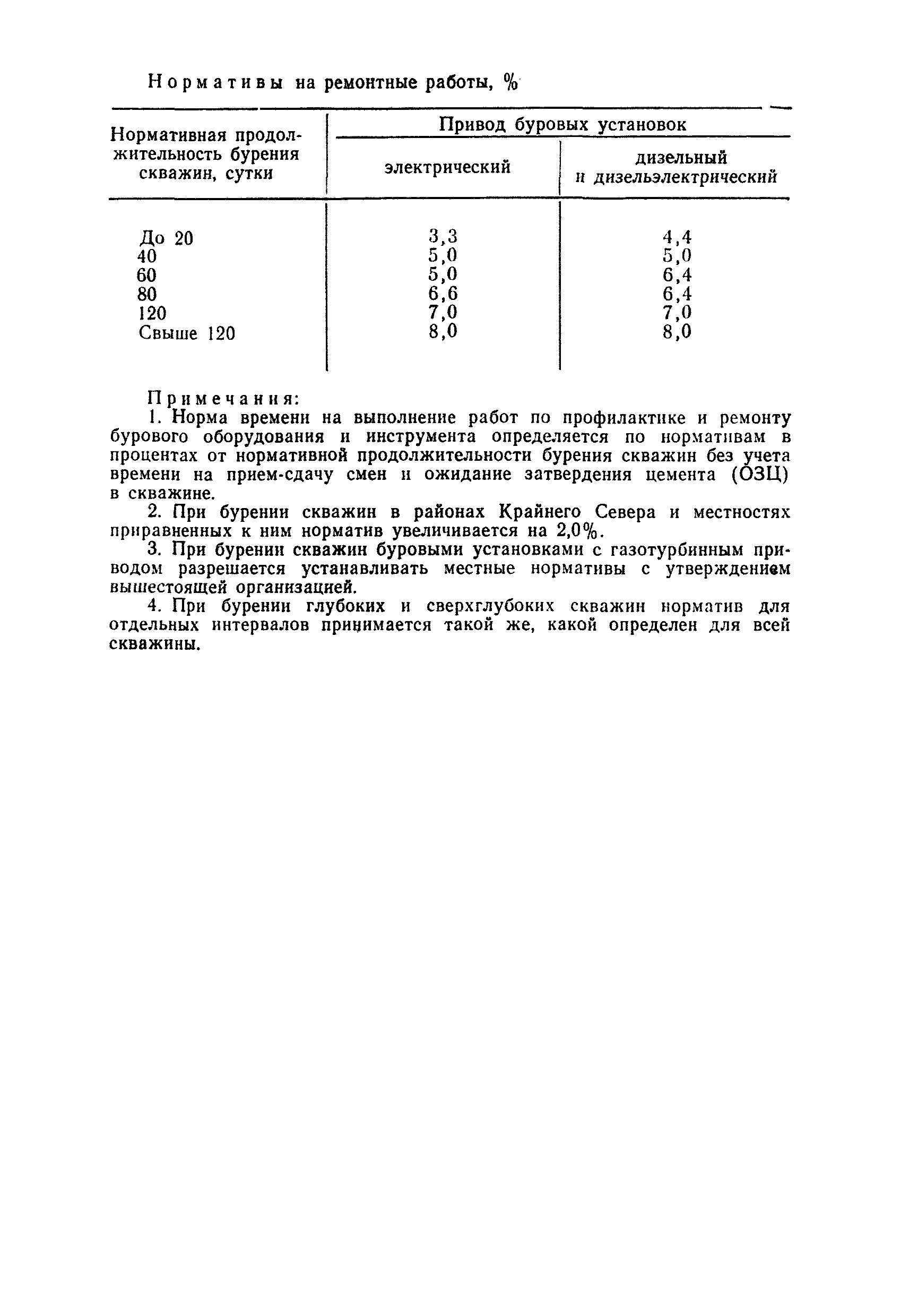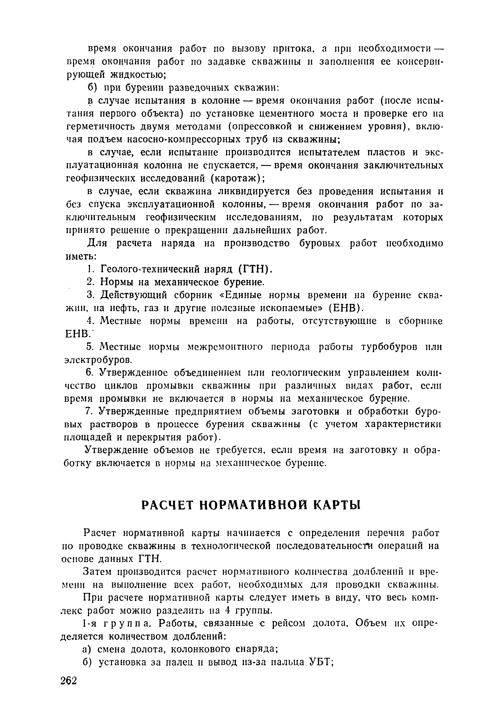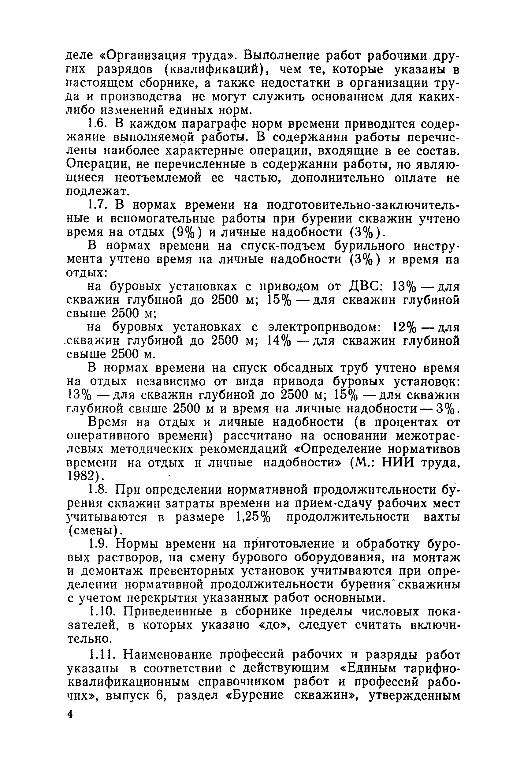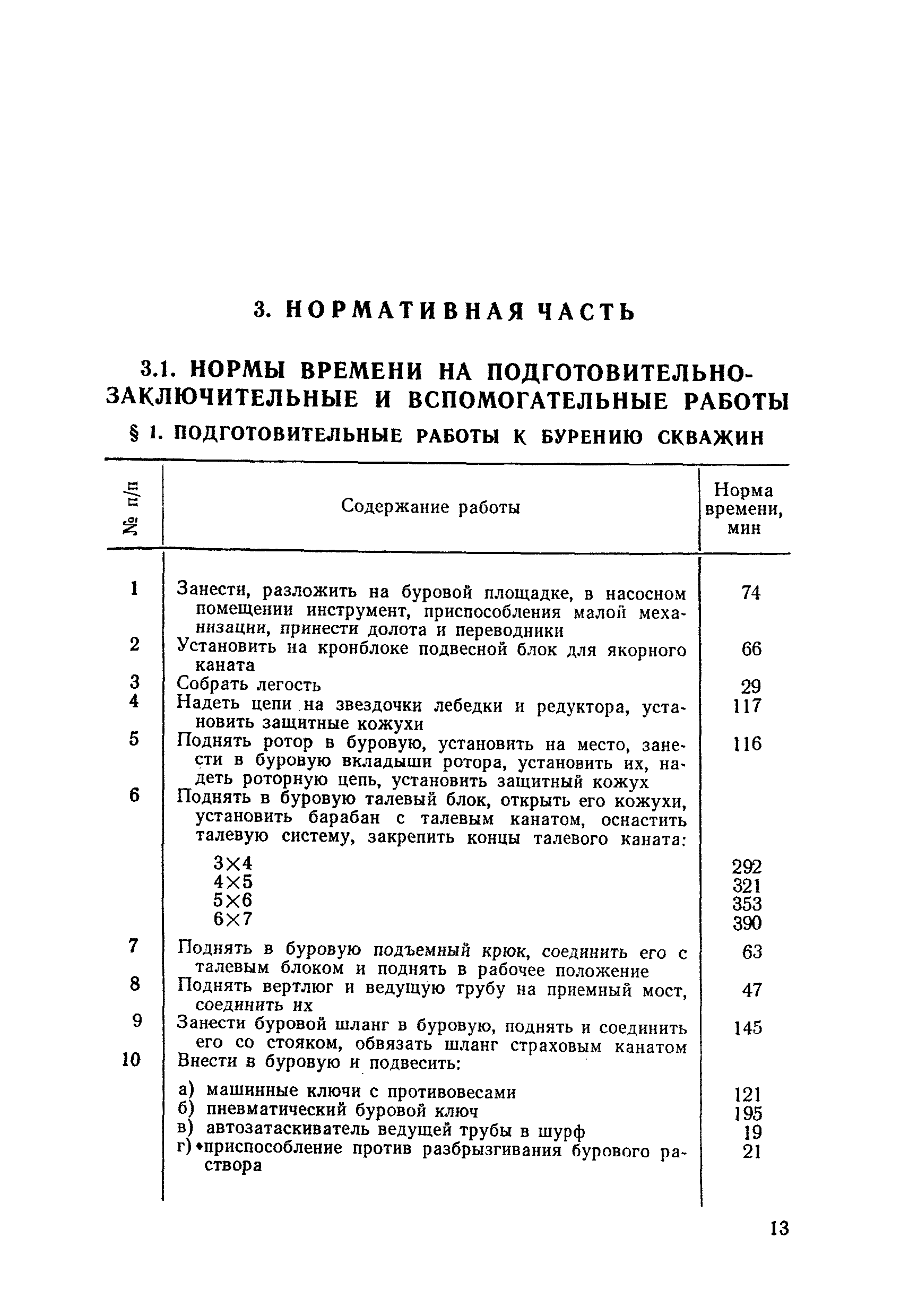 Единые нормы времени на бурение скважин на нефть, газ и другие полезные ископаемые| Статус: | не действует | | Название рус.: | Единые нормы времени на бурение скважин на нефть, газ и другие полезные ископаемые | | Дата добавления в базу: | 01.01.2018 | | Дата актуализации: | 01.01.2021 | | Область применения: | Единые нормы времени на основные виды работ, выполняемые при бурении разведочных, эксплуатационных, опорных, параметрических скважин с применением как роторного способа бурения, так и забойных двигателей, являются обязательными для применения на предприятиях и в организациях, выполняющих указанные работы, независимо от их ведомственной подчиненности и служат для нормирования труда рабочих, находящихся на сдельной оплате труда, а также для разработки нормированных заданий при по- временной оплате труда. Нормы настоящего сборника могут быть использованы для расчета комплексных норм времени. | | Оглавление: | 1. Общая часть 2. Организация труда 3. Нормативная часть 3.1. Нормы времени на подготовительно-заключительные и вспомогательные работы § 1. Подготовительные работы к бурению скважин § 2. Подготовительные работы перед спуском инструмента § 3. Заключительные работы после спуска инструмента § 4. Подготовительные работы перед подъемом инструмента § 5. Наращивание инструмента § 6. Отвертывание долота. Проверка забойного двигателя и укладка на приемный мост § 7. Подъем забойного двигателя в буровую с приемного моста, навертывание долота § 8. Сборка секционного турбобура § 9. Разборка секционного турбобура § 10. Сборка электробура для наклонно-направленного бурения § 11. Разборка электробура для наклонно-направленного бурения § 12. Проверка забойных двигателей § 13. Смена шпинделя турбобура § 14. Сборка колонкового снаряда при роторном бурении и бурении турбобуром с колонковой трубой § 15. Разборка колонкового снаряда при бурении ротором или турбобуром с колонковой трубой (надставкой) § 16. Сборка колонкового турбодолота § 17. Разборка колонкового турбодолота § 18. Подъем и спуск съемной грунтоноски § 19. Сборка колонковых снарядов типа «Недра» и «СКУ» § 20. Разборка колонковых снарядов типа «Недра» и «СКУ» § 21. Сборка утяжеленных бурильных труб § 22. Разборка утяжеленных бурильных труб § 23. Установка утяжеленных бурильных труб за палец § 24. Вывод утяжеленных бурильных труб из-за пальца и спуск в скважину § 25. Спуск утяжеленных бурильных труб в дополнительный шурф (длина свечи 25 м) § 26. Подъем утяжеленных бурильных труб из дополнительного шурфа (длина свечи 25 м) § 27. Подготовительно-заключительные работы при сборке и разборке колонны бурильных труб в скважине или в шурфе при смене диаметра бурильных труб § 28. Сборка колонны бурильных труб § 29. Разборка колонны бурильных труб § 30. Проверка резьбовых соединений бурильных труб ультразвуковой дефектоскопией при спуско-подъемных операциях на скважине § 31. Проверка легкосплавных бурильных труб ультразвуковой дефектоскопией при спуско-подъемных операциях на скважине § 32. Опрессовка свечей бурильных труб на буровой § 33. Сборка элементов компоновки бурильной колонны (расширителей, стабилизаторов, калибраторов, удлинителей, центраторов) § 34. Разборка элементов компоновки бурильной колонны (расширителей, стабилизаторов, калибраторов, удлинителей, центраторов) § 35. Навертывание, отвертывание переводников или вс