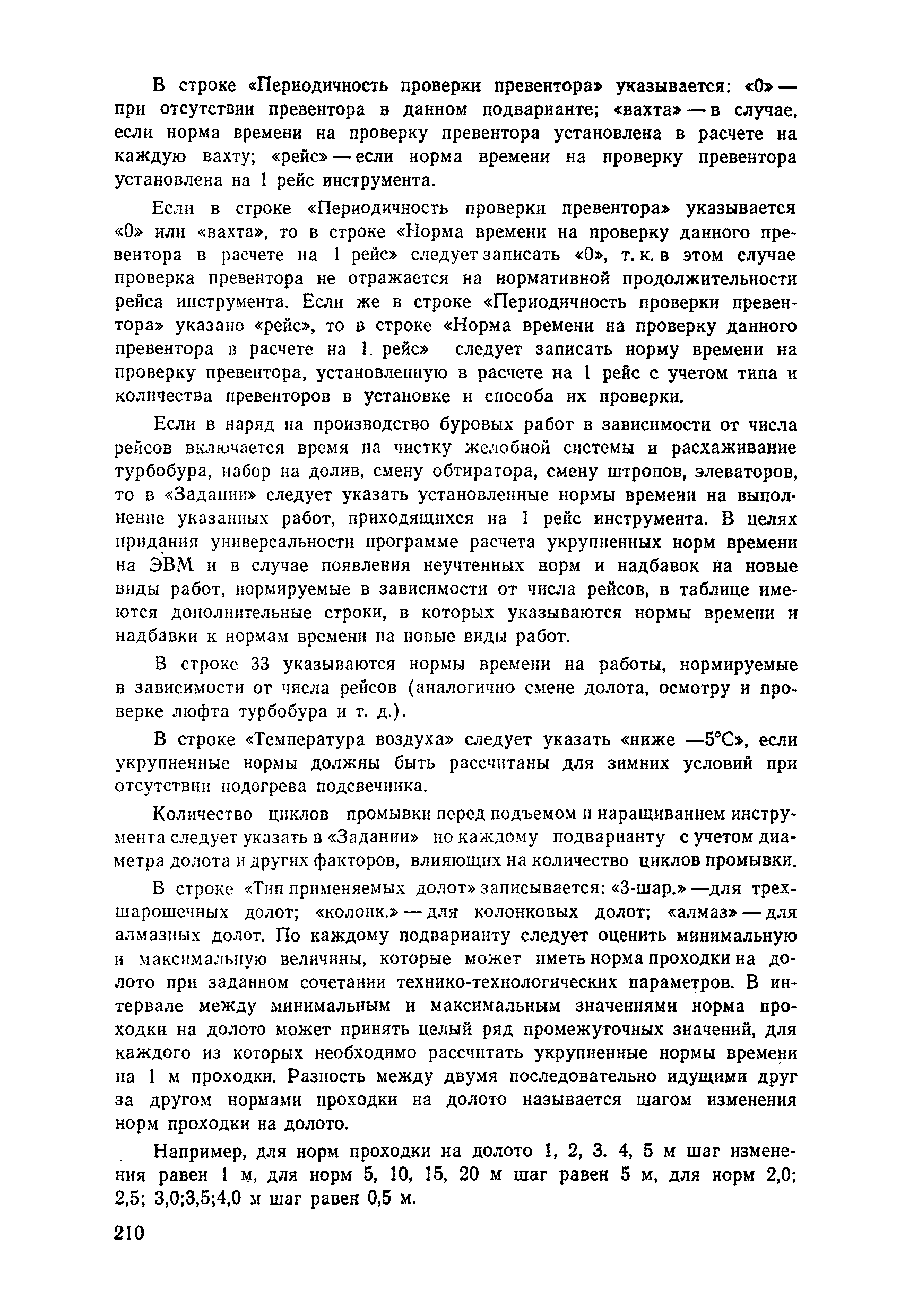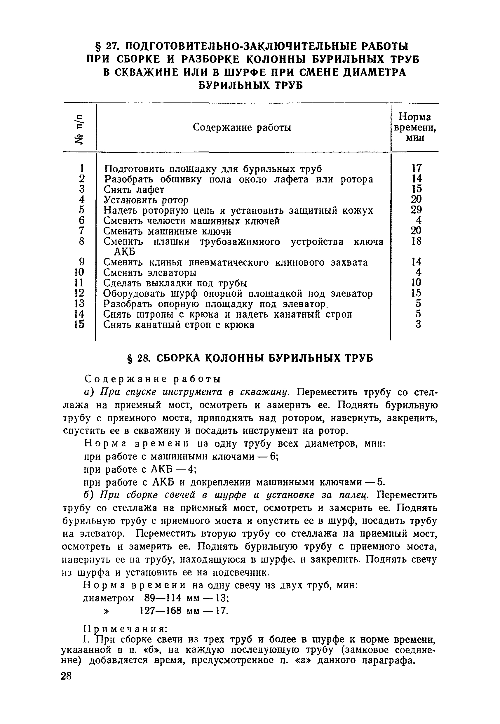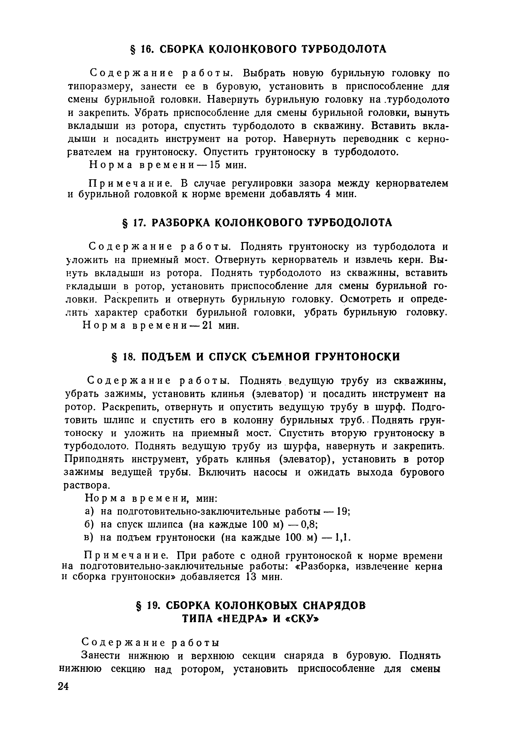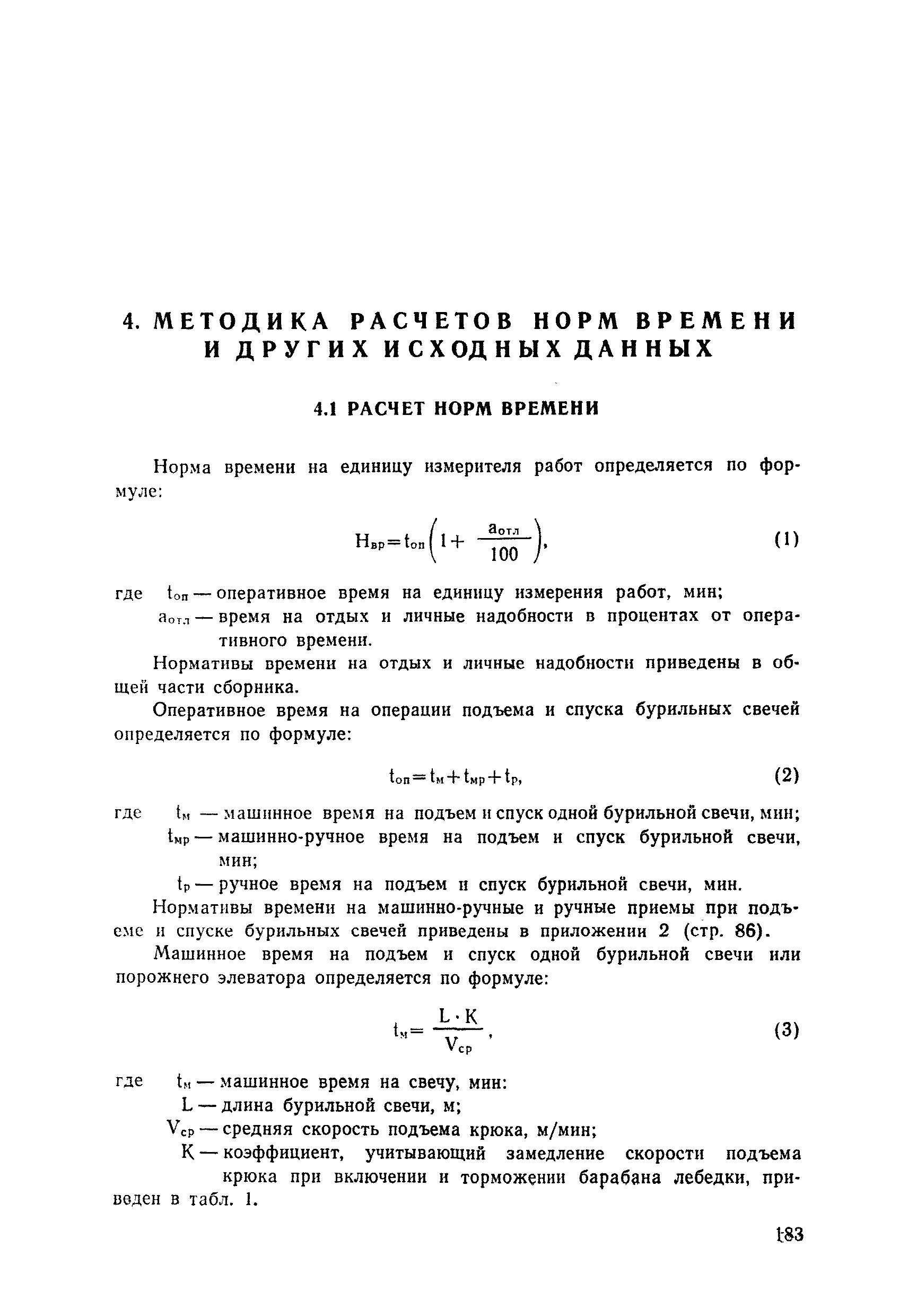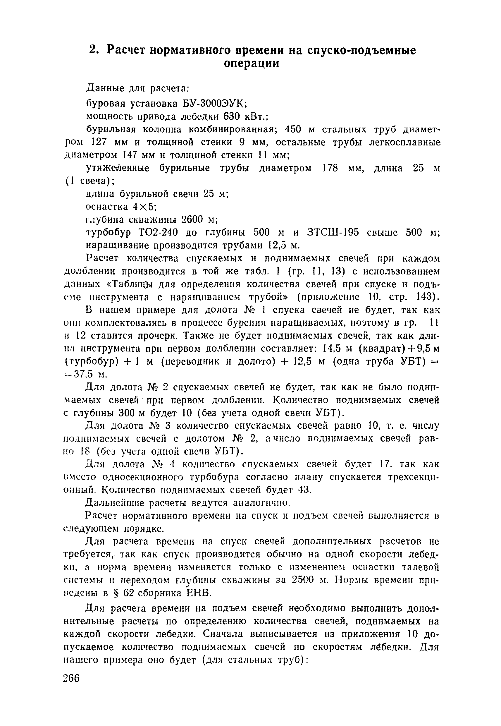 Единые нормы времени на бурение скважин на нефть, газ и другие полезные ископаемые| Статус: | не действует | | Название рус.: | Единые нормы времени на бурение скважин на нефть, газ и другие полезные ископаемые | | Дата добавления в базу: | 01.01.2018 | | Дата актуализации: | 01.01.2021 | | Область применения: | Единые нормы времени на основные виды работ, выполняемые при бурении разведочных, эксплуатационных, опорных, параметрических скважин с применением как роторного способа бурения, так и забойных двигателей, являются обязательными для применения на предприятиях и в организациях, выполняющих указанные работы, независимо от их ведомственной подчиненности и служат для нормирования труда рабочих, находящихся на сдельной оплате труда, а также для разработки нормированных заданий при по- временной оплате труда. Нормы настоящего сборника могут быть использованы для расчета комплексных норм времени. | | Оглавление: | 1. Общая часть 2. Организация труда 3. Нормативная часть 3.1. Нормы времени на подготовительно-заключительные и вспомогательные работы § 1. Подготовительные работы к бурению скважин § 2. Подготовительные работы перед спуском инструмента § 3. Заключительные работы после спуска инструмента § 4. Подготовительные работы перед подъемом инструмента § 5. Наращивание инструмента § 6. Отвертывание долота. Проверка забойного двигателя и укладка на приемный мост § 7. Подъем забойного двигателя в буровую с приемного моста, навертывание долота § 8. Сборка секционного турбобура § 9. Разборка секционного турбобура § 10. Сборка электробура для наклонно-направленного бурения § 11. Разборка электробура для наклонно-направленного бурения § 12. Проверка забойных двигателей § 13. Смена шпинделя турбобура § 14. Сборка колонкового снаряда при роторном бурении и бурении турбобуром с колонковой трубой § 15. Разборка колонкового снаряда при бурении ротором или турбобуром с колонковой трубой (надставкой) § 16. Сборка колонкового турбодолота § 17. Разборка колонкового турбодолота § 18. Подъем и спуск съемной грунтоноски § 19. Сборка колонковых снарядов типа «Недра» и «СКУ» § 20. Разборка колонковых снарядов типа «Недра» и «СКУ» § 21. Сборка утяжеленных бурильных труб § 22. Разборка утяжеленных бурильных труб § 23. Установка утяжеленных бурильных труб за палец § 24. Вывод утяжеленных бурильных труб из-за пальца и спуск в скважину § 25. Спуск утяжеленных бурильных труб в дополнительный шурф (длина свечи 25 м) § 26. Подъем утяжеленных бурильных труб из дополнительного шурфа (длина свечи 25 м) § 27. Подготовительно-заключительные работы при сборке и разборке колонны бурильных труб в скважине или в шурфе при смене диаметра бурильных труб § 28. Сборка колонны бурильных труб § 29. Разборка колонны бурильных труб § 30. Проверка резьбовых соединений бурильных труб ультразвуковой дефектоскопией при спуско-подъемных операциях на скважине § 31. Проверка легкосплавных бурильных труб ультразвуковой дефектоскопией при спуско-подъемных операциях на скважине § 32. Опрессовка свечей бурильных труб на буровой § 33. Сборка элементов компоновки бурильной колонны (расширителей, стабилизаторов, калибраторов, удлинителей, центраторов) § 34. Разборка элементов компоновки бурильной колонны (расширителей, стабилизаторов, калибраторов, удлинителей, центраторов) § 35. Навертывание, отвертывание переводников или вс