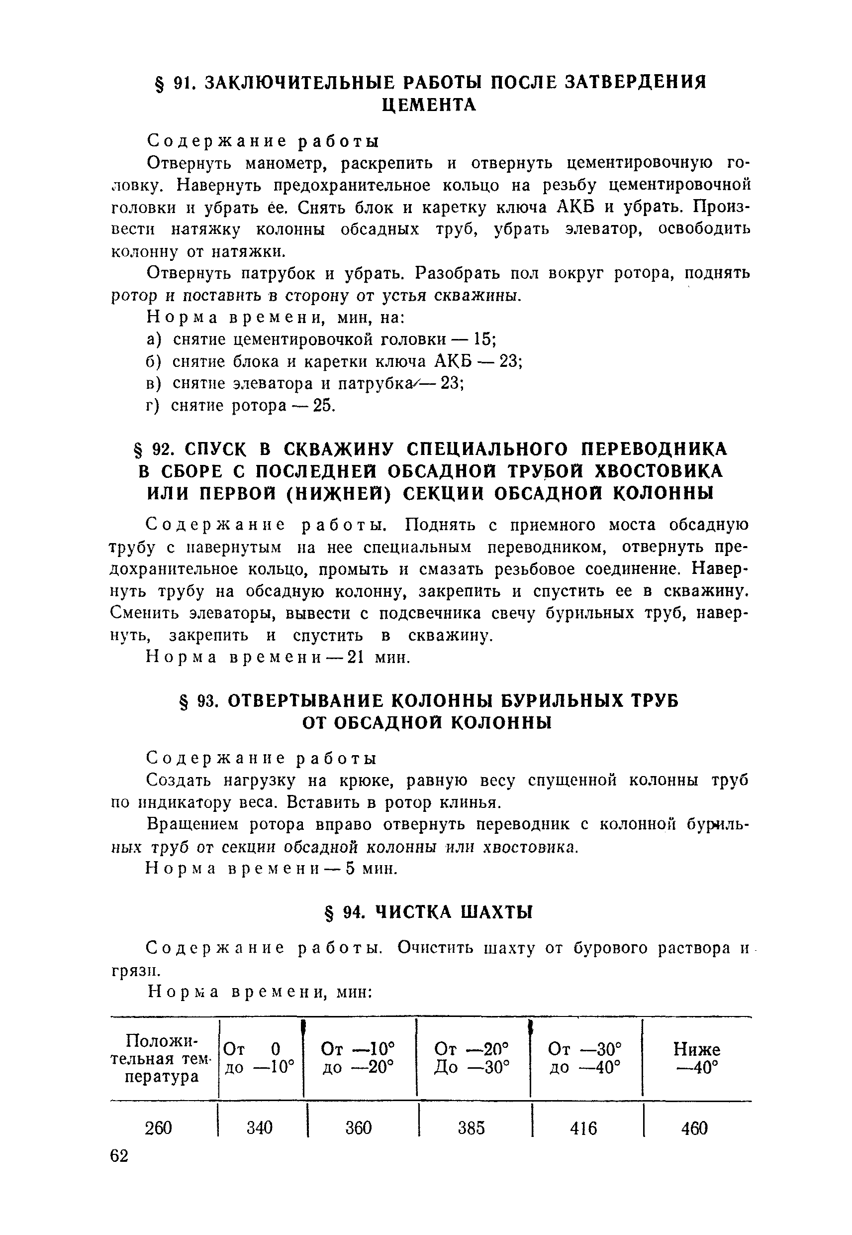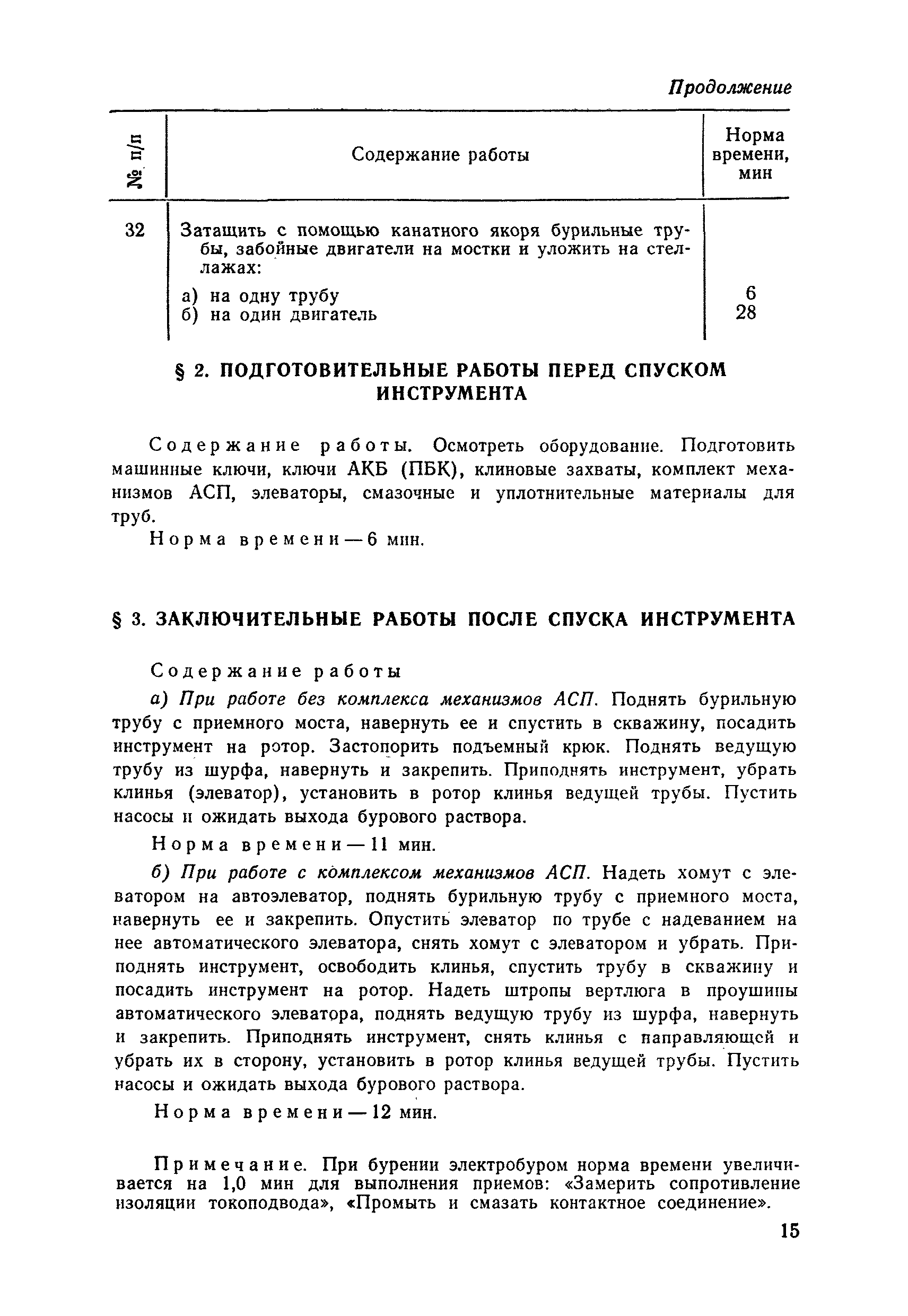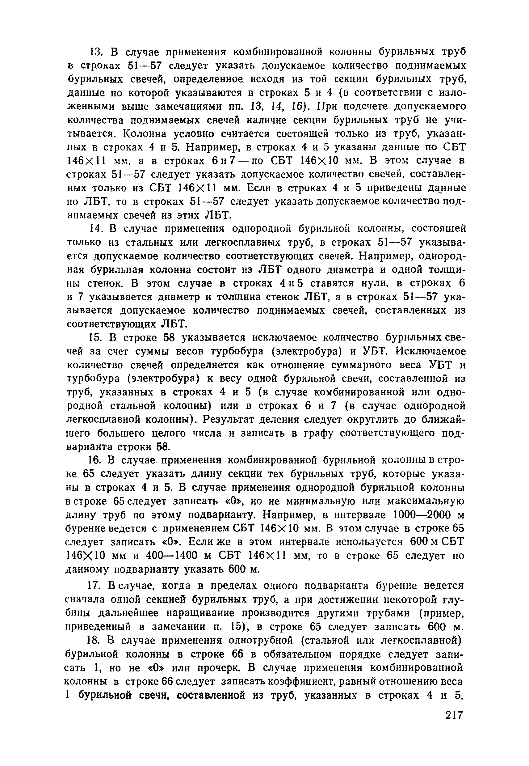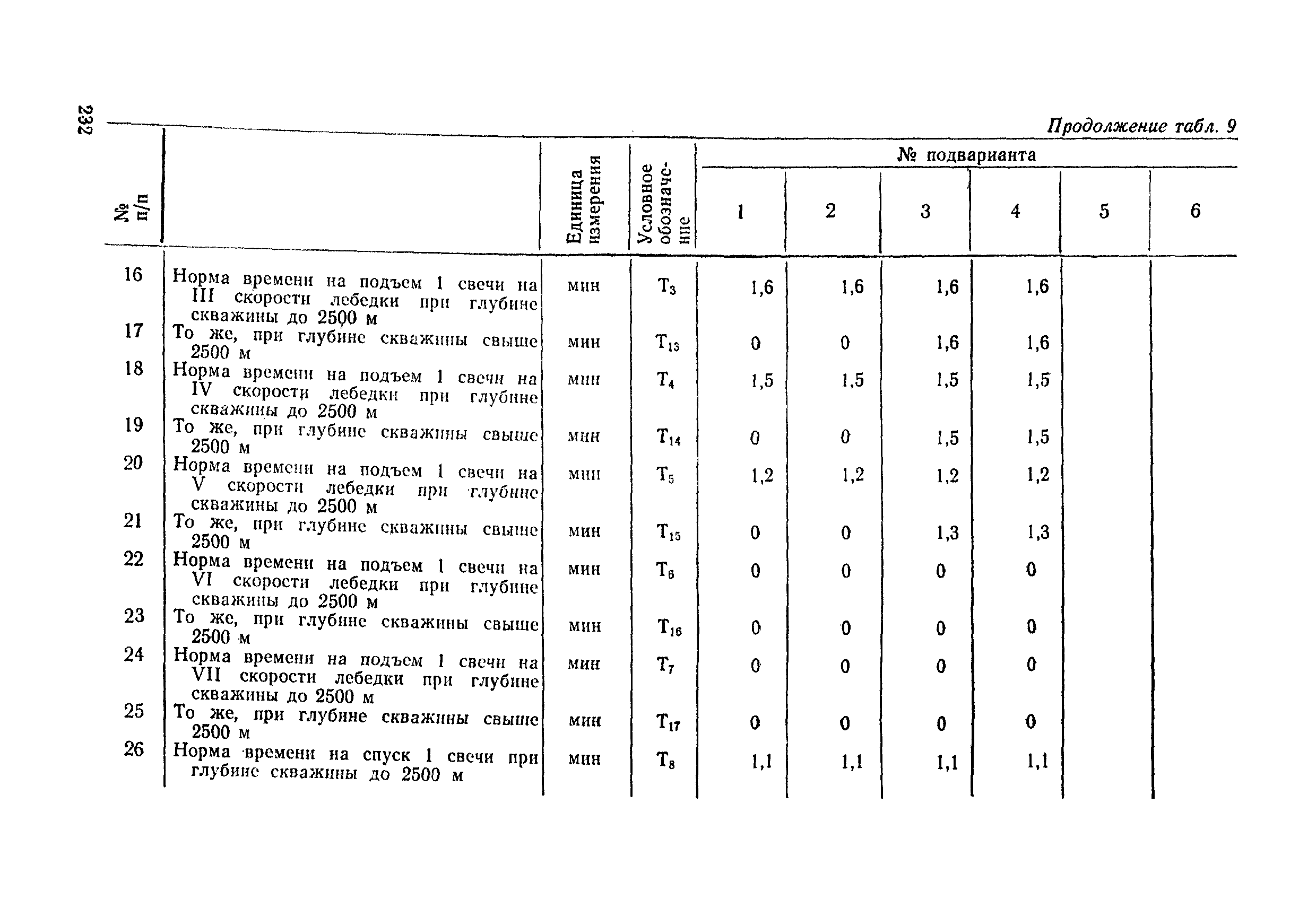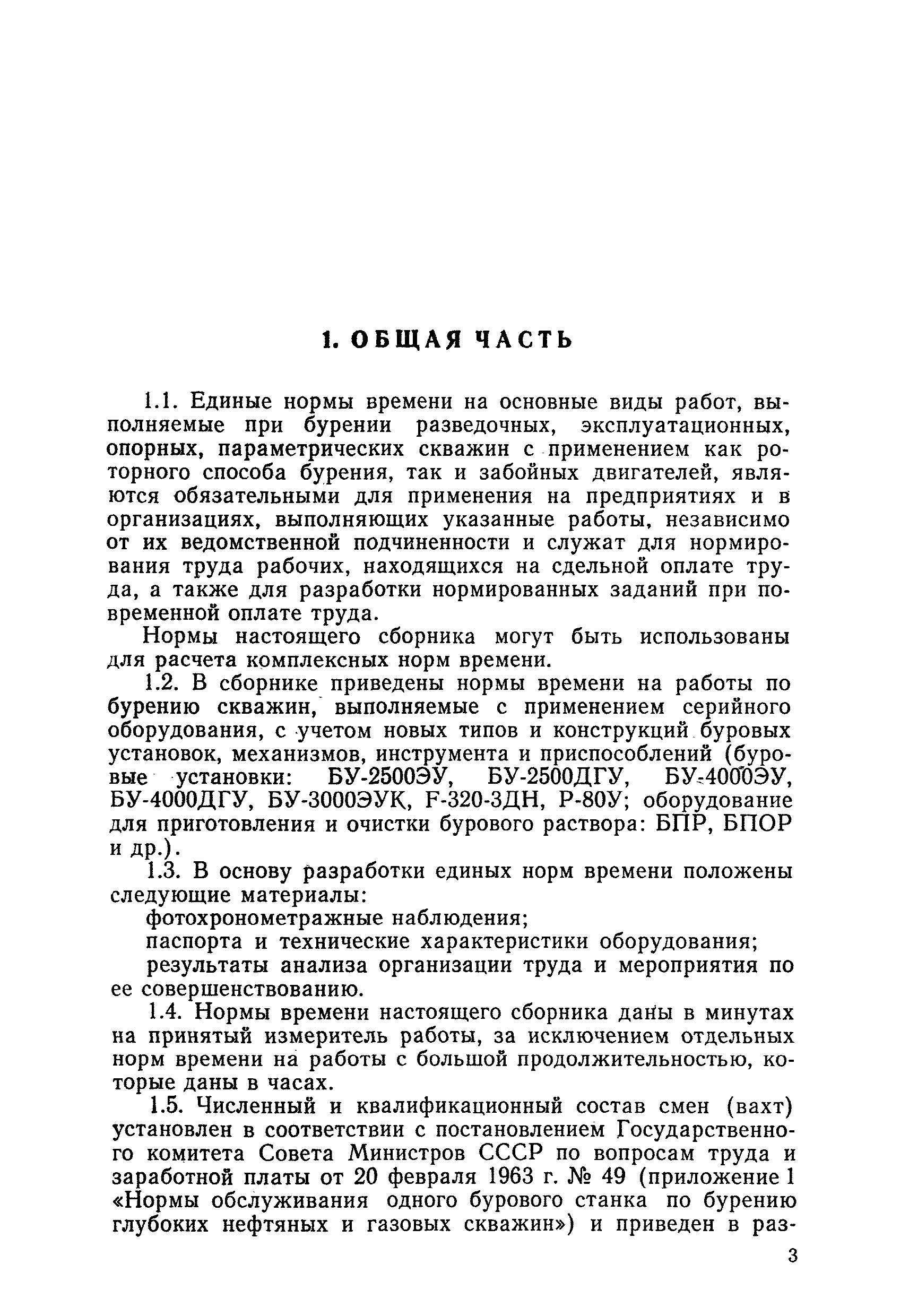 Единые нормы времени на бурение скважин на нефть, газ и другие полезные ископаемые| Статус: | не действует | | Название рус.: | Единые нормы времени на бурение скважин на нефть, газ и другие полезные ископаемые | | Дата добавления в базу: | 01.01.2018 | | Дата актуализации: | 01.01.2021 | | Область применения: | Единые нормы времени на основные виды работ, выполняемые при бурении разведочных, эксплуатационных, опорных, параметрических скважин с применением как роторного способа бурения, так и забойных двигателей, являются обязательными для применения на предприятиях и в организациях, выполняющих указанные работы, независимо от их ведомственной подчиненности и служат для нормирования труда рабочих, находящихся на сдельной оплате труда, а также для разработки нормированных заданий при по- временной оплате труда. Нормы настоящего сборника могут быть использованы для расчета комплексных норм времени. | | Оглавление: | 1. Общая часть 2. Организация труда 3. Нормативная часть 3.1. Нормы времени на подготовительно-заключительные и вспомогательные работы § 1. Подготовительные работы к бурению скважин § 2. Подготовительные работы перед спуском инструмента § 3. Заключительные работы после спуска инструмента § 4. Подготовительные работы перед подъемом инструмента § 5. Наращивание инструмента § 6. Отвертывание долота. Проверка забойного двигателя и укладка на приемный мост § 7. Подъем забойного двигателя в буровую с приемного моста, навертывание долота § 8. Сборка секционного турбобура § 9. Разборка секционного турбобура § 10. Сборка электробура для наклонно-направленного бурения § 11. Разборка электробура для наклонно-направленного бурения § 12. Проверка забойных двигателей § 13. Смена шпинделя турбобура § 14. Сборка колонкового снаряда при роторном бурении и бурении турбобуром с колонковой трубой § 15. Разборка колонкового снаряда при бурении ротором или турбобуром с колонковой трубой (надставкой) § 16. Сборка колонкового турбодолота § 17. Разборка колонкового турбодолота § 18. Подъем и спуск съемной грунтоноски § 19. Сборка колонковых снарядов типа «Недра» и «СКУ» § 20. Разборка колонковых снарядов типа «Недра» и «СКУ» § 21. Сборка утяжеленных бурильных труб § 22. Разборка утяжеленных бурильных труб § 23. Установка утяжеленных бурильных труб за палец § 24. Вывод утяжеленных бурильных труб из-за пальца и спуск в скважину § 25. Спуск утяжеленных бурильных труб в дополнительный шурф (длина свечи 25 м) § 26. Подъем утяжеленных бурильных труб из дополнительного шурфа (длина свечи 25 м) § 27. Подготовительно-заключительные работы при сборке и разборке колонны бурильных труб в скважине или в шурфе при смене диаметра бурильных труб § 28. Сборка колонны бурильных труб § 29. Разборка колонны бурильных труб § 30. Проверка резьбовых соединений бурильных труб ультразвуковой дефектоскопией при спуско-подъемных операциях на скважине § 31. Проверка легкосплавных бурильных труб ультразвуковой дефектоскопией при спуско-подъемных операциях на скважине § 32. Опрессовка свечей бурильных труб на буровой § 33. Сборка элементов компоновки бурильной колонны (расширителей, стабилизаторов, калибраторов, удлинителей, центраторов) § 34. Разборка элементов компоновки бурильной колонны (расширителей, стабилизаторов, калибраторов, удлинителей, центраторов) § 35. Навертывание, отвертывание переводников или вс